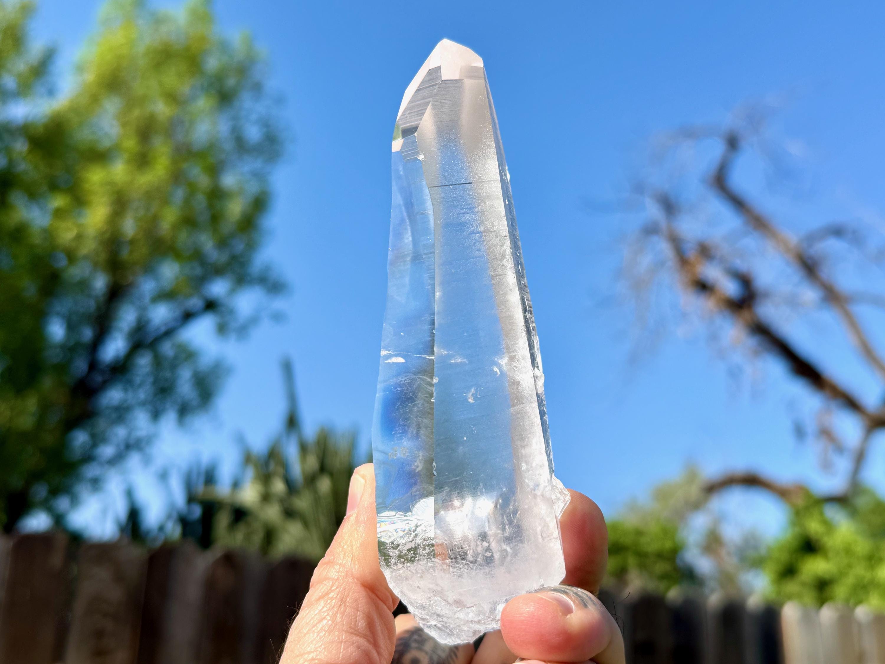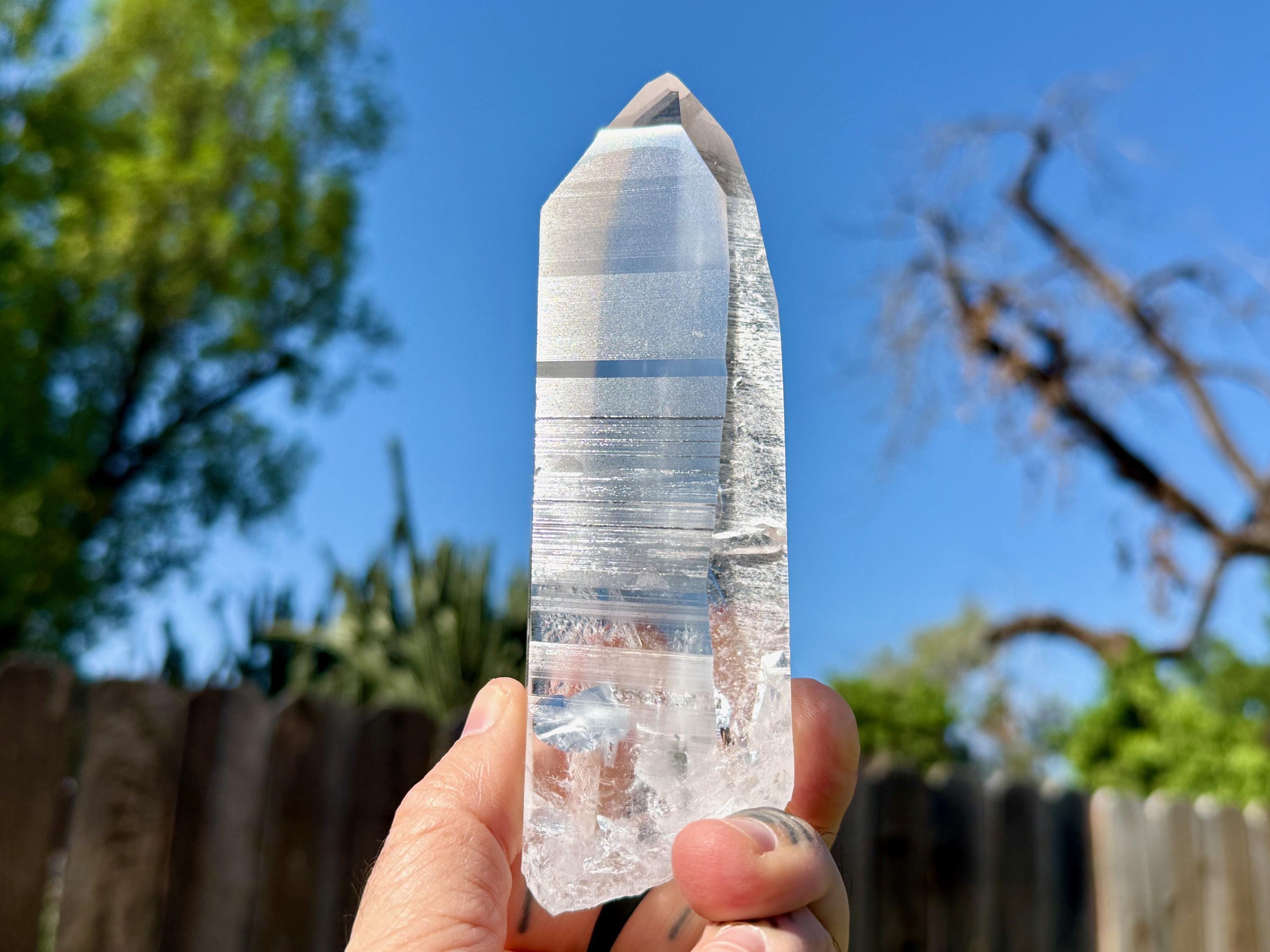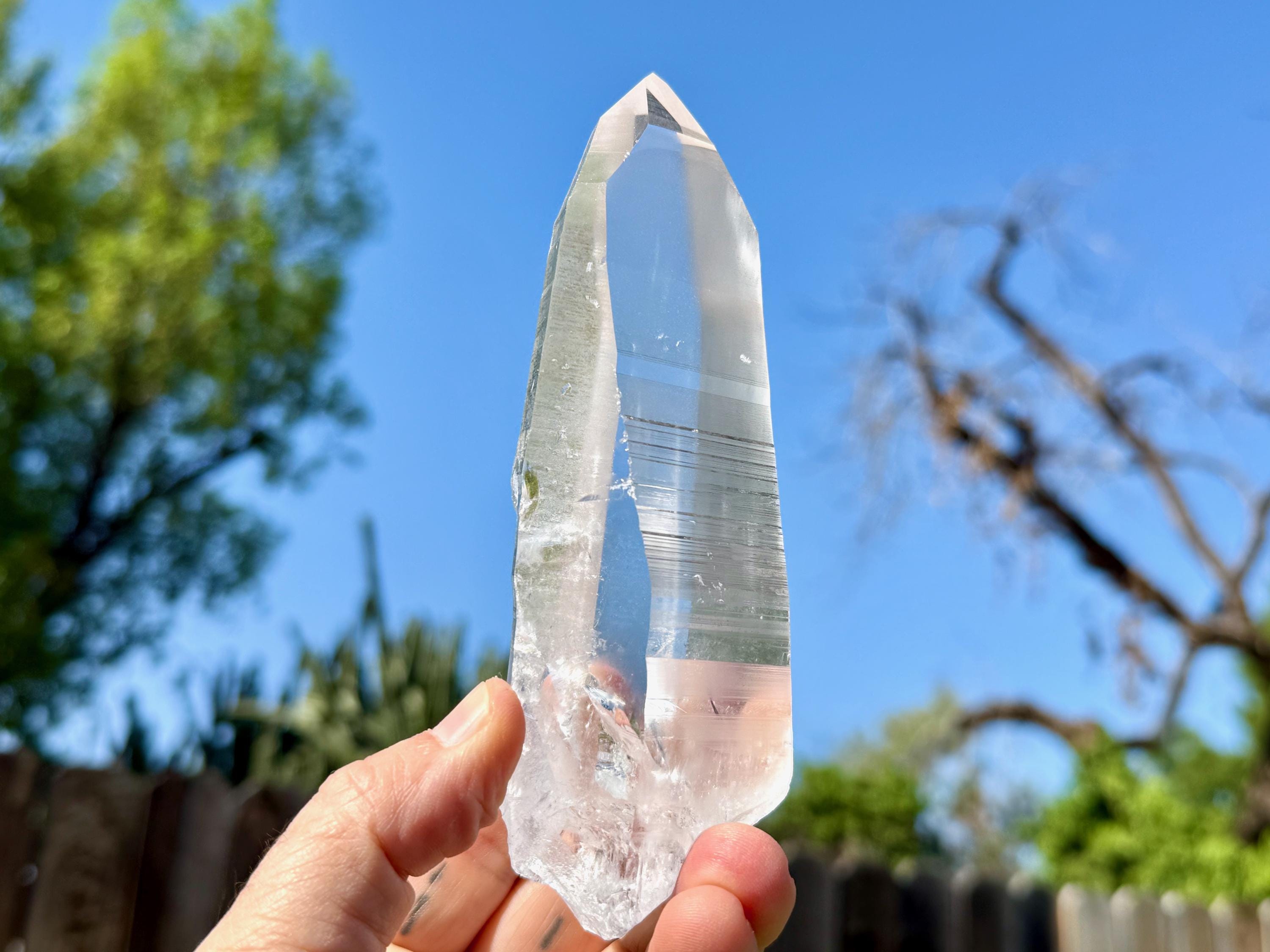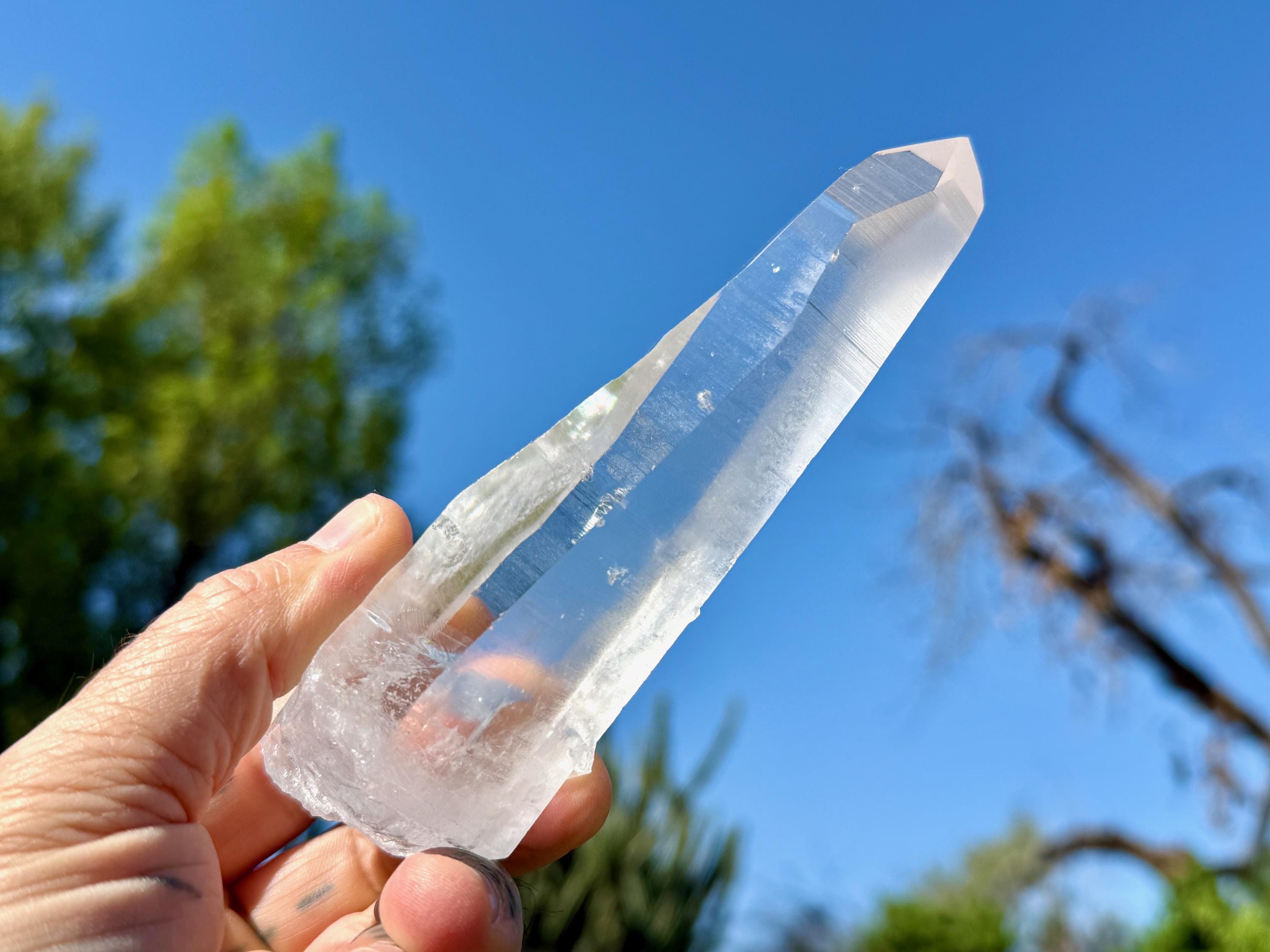 Lemurian Quartz resonates with all chakras, but primarily the Crown Chakra. It has one of the highest vibrations of any crystal and is a beautiful companion for meditation and to realign energies in the body. It can assist in clearing blockages in one's energy field and/or chakras, dispelling heavy energies from the body. If there is stagnant energy in the body, it can help to increase Prana (life force) energy to get things moving properly again. Meditating with Lemurian Crystals can allow us to connect with higher-dimensional spirit guides and connect to Divine realms, as well as to decode the information they contain within.