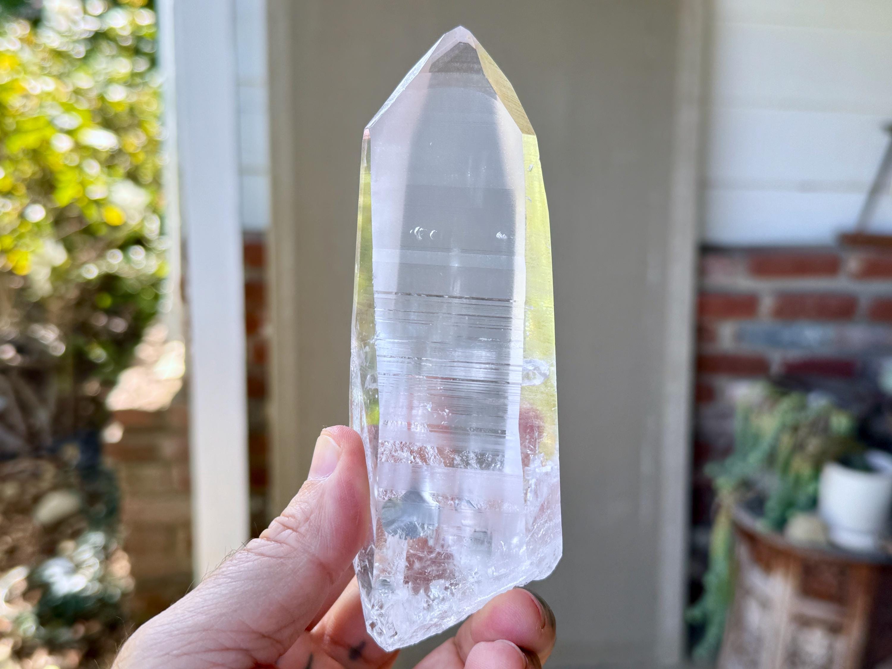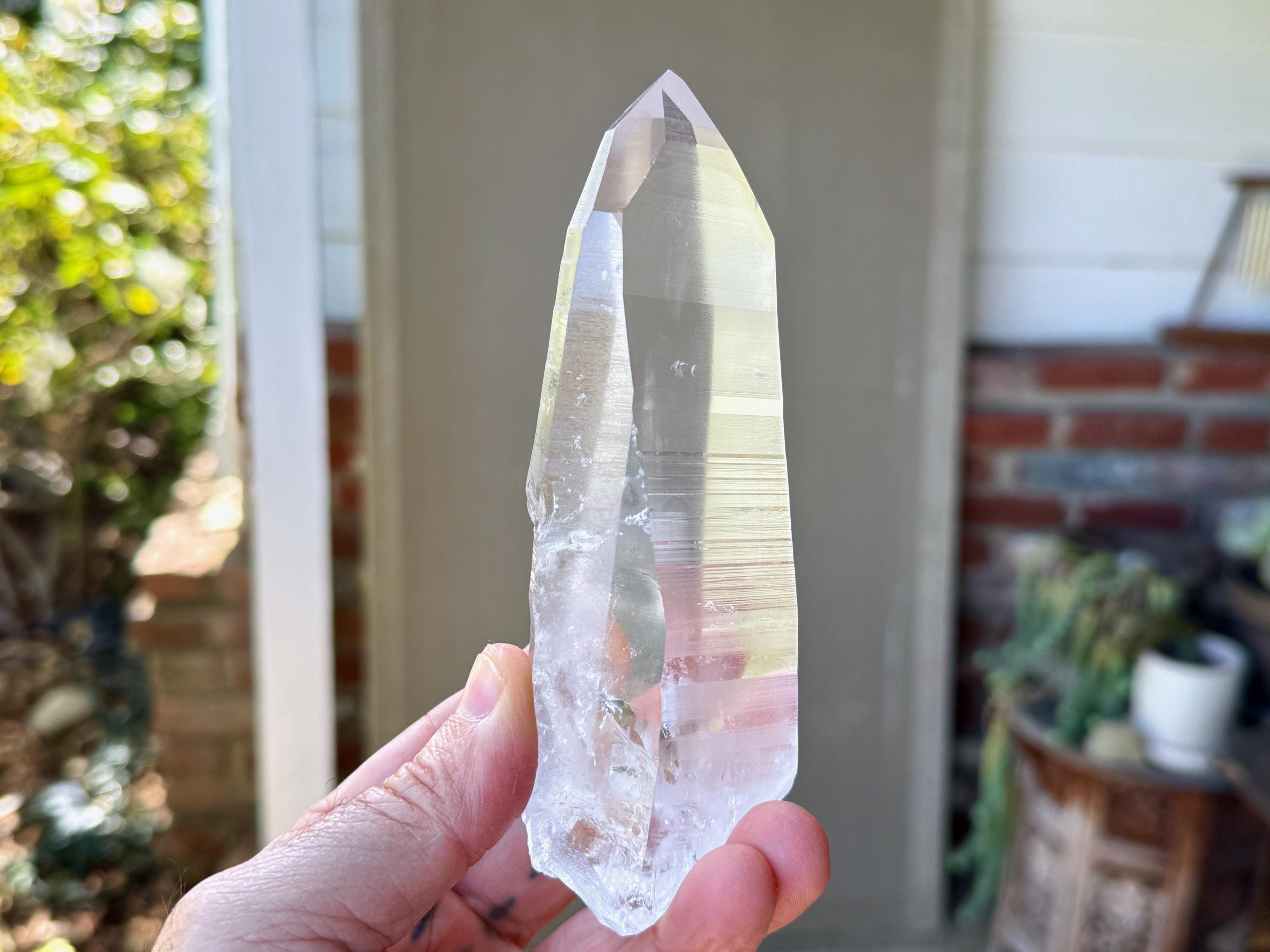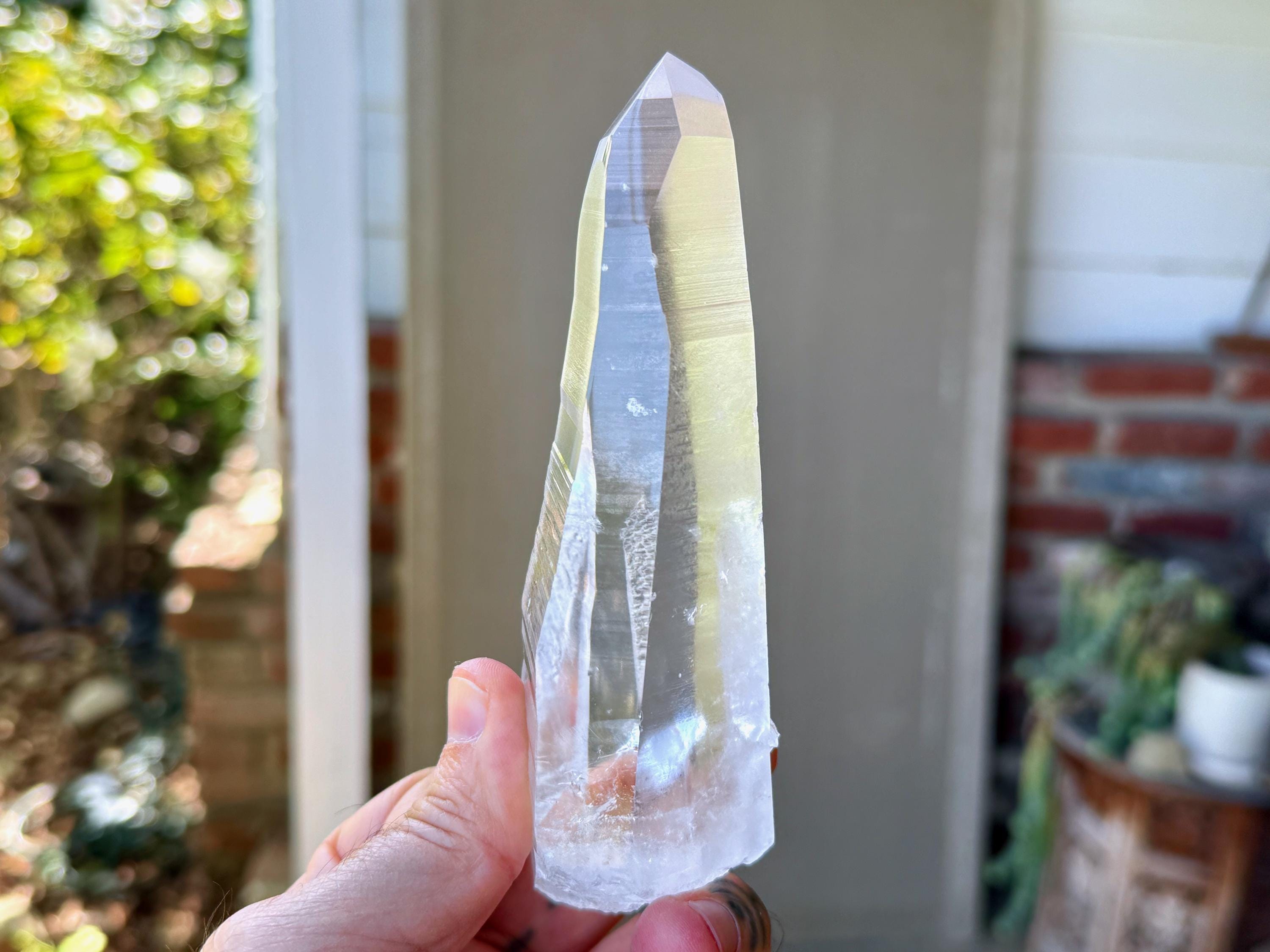 This crystal exhibits a classic Lemurian formation, and features a narrow, 5-sided main facet making this an "Isis" crystal (see more on this formation below).