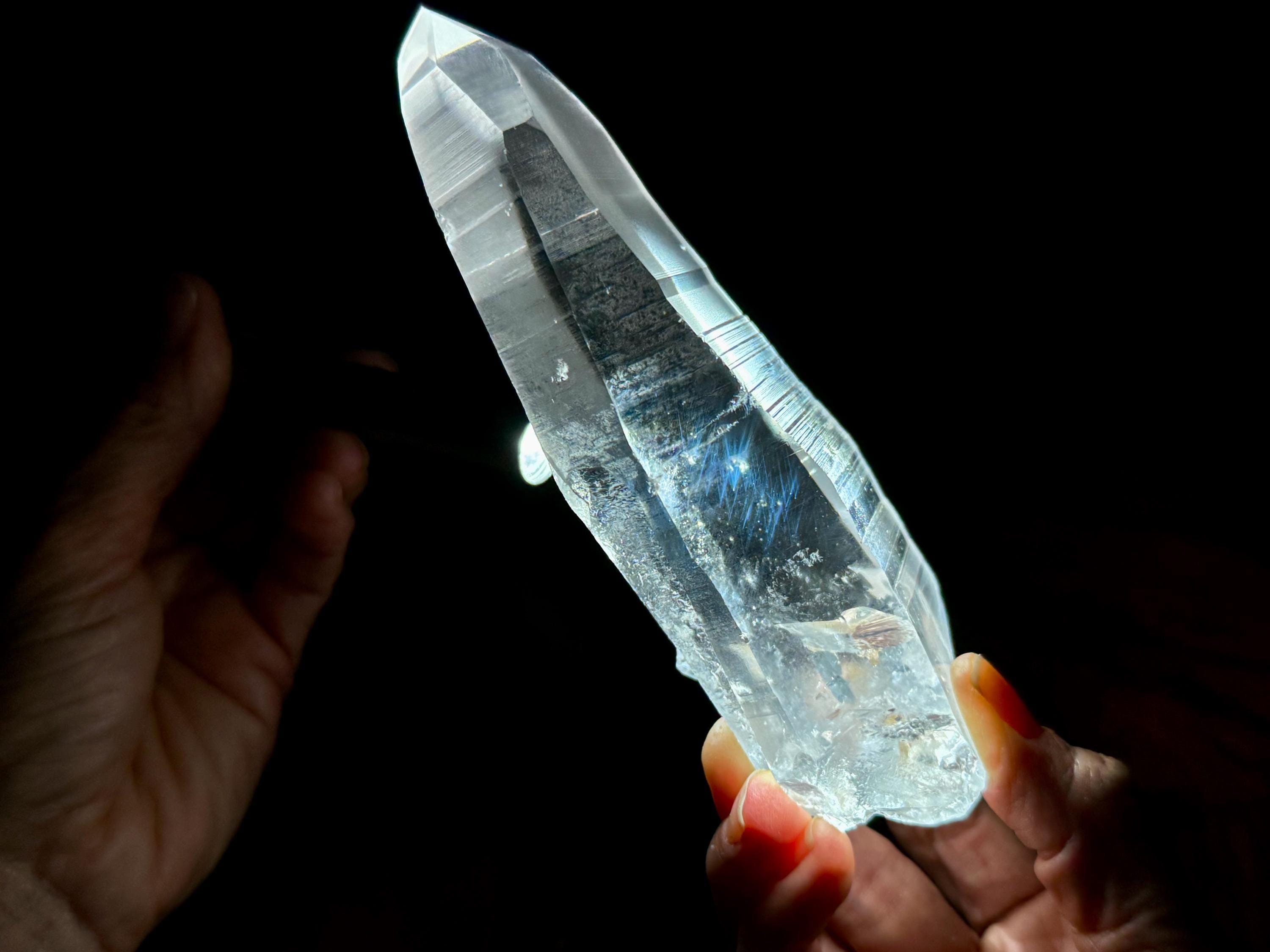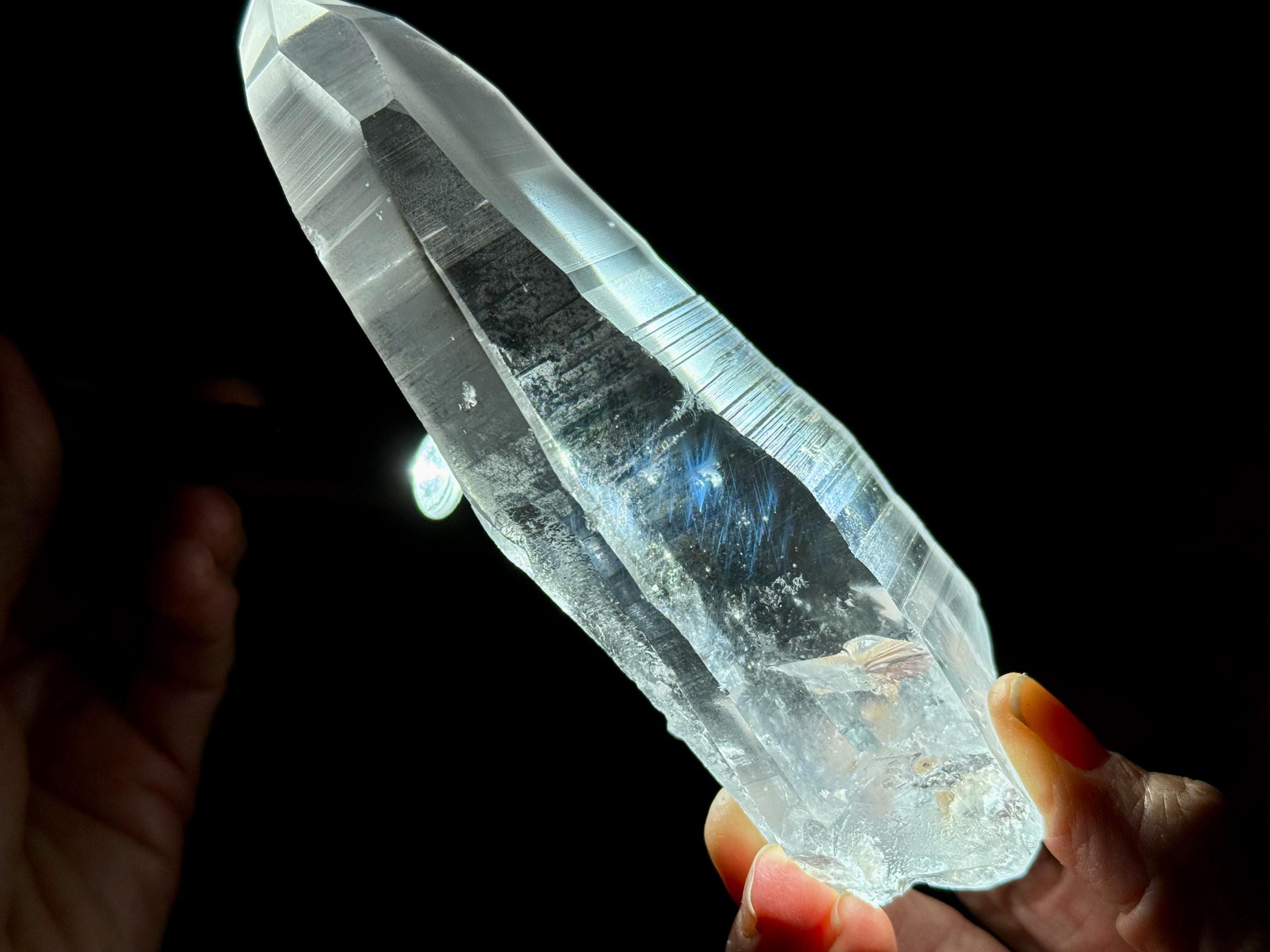 Exceptional quality to this magnificent Blue Needle Lemurian Quartz crystal with water-clear clarity, brilliant luster and deeply defined Lemurian striations on its broad sides.