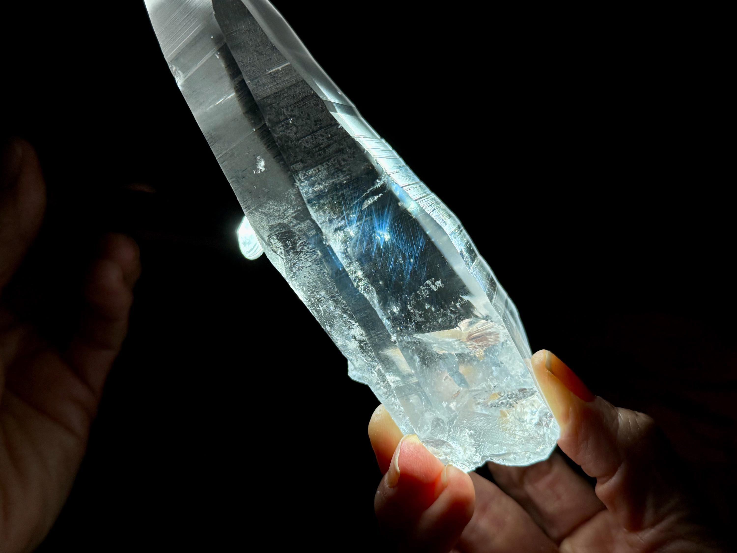 The crystals from this find exhibit a unique phenomenon that causes the appearance of blue needle-like inclusions within. In actuality, these are not physical inclusions, but instead thin tubes of gas suspended within, formed naturally inside the crystal over hundreds of millions of years during the crystal's formation. When light is shone on them from the exact right angle, they glow a ghostly blue color (some say due to the Tyndall Effect).