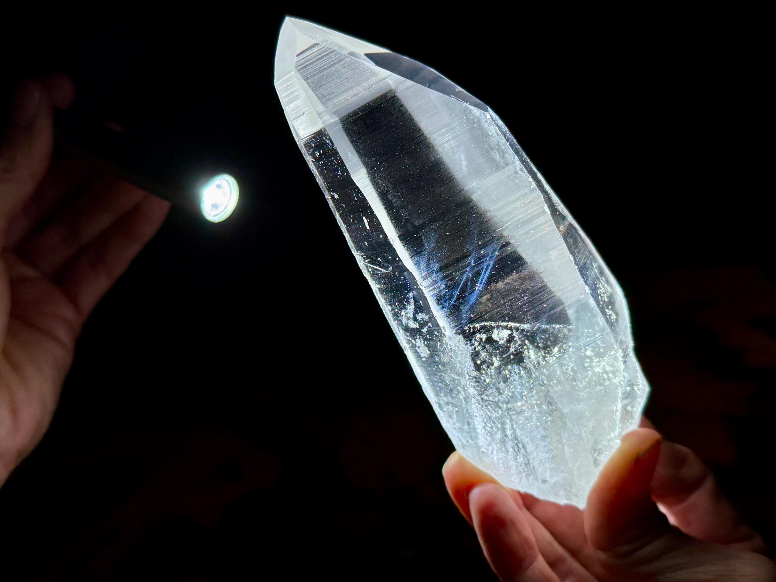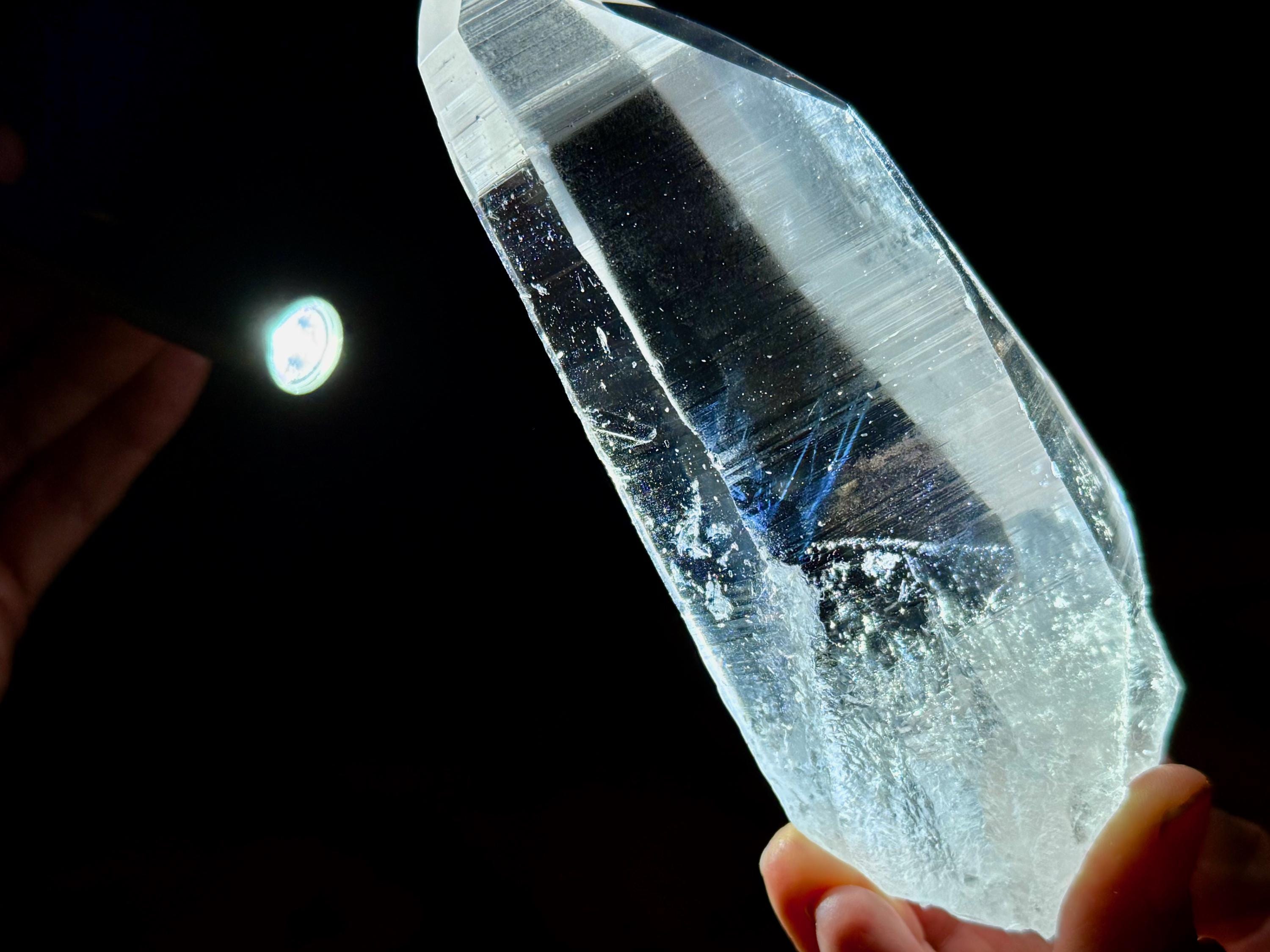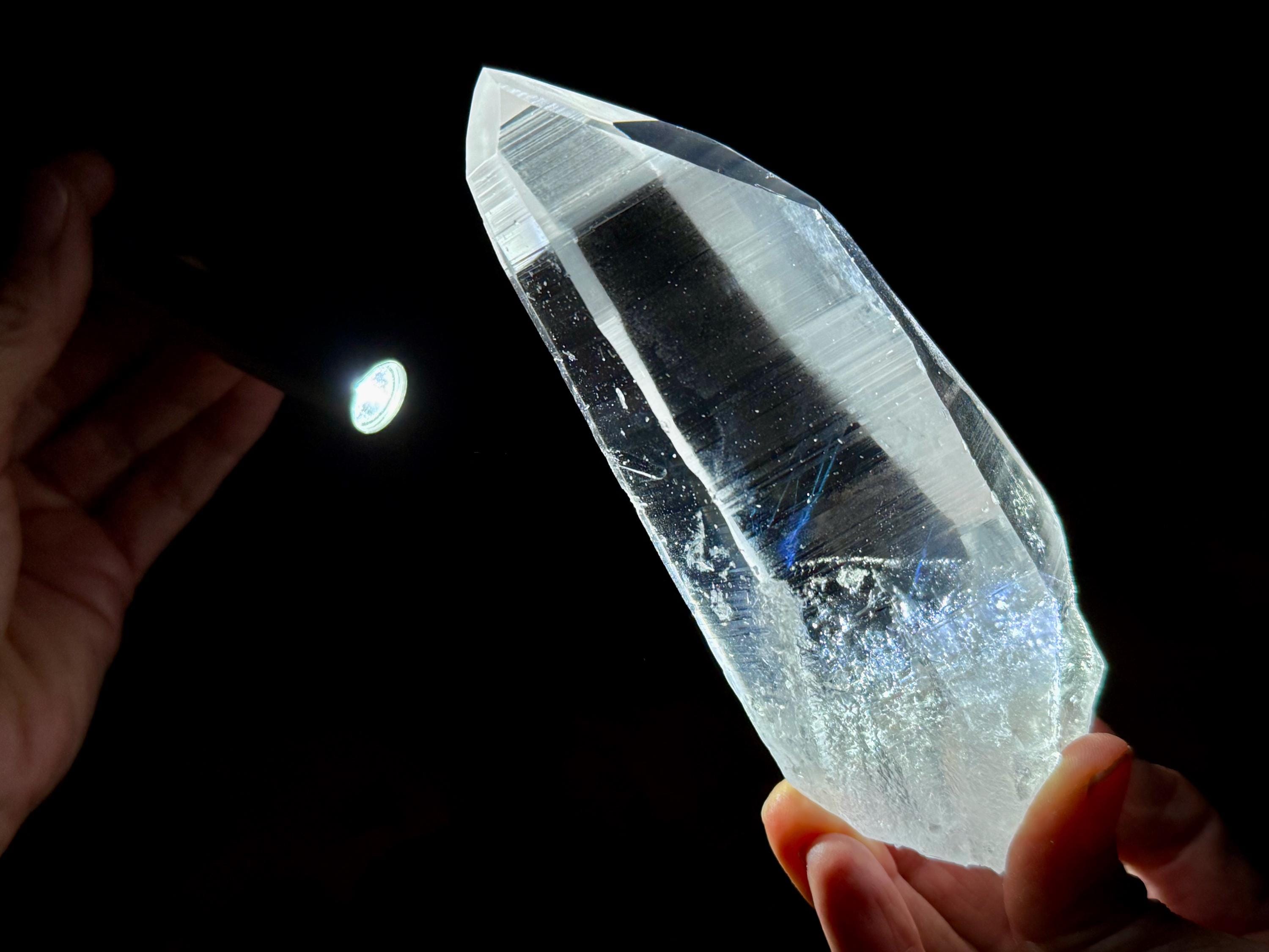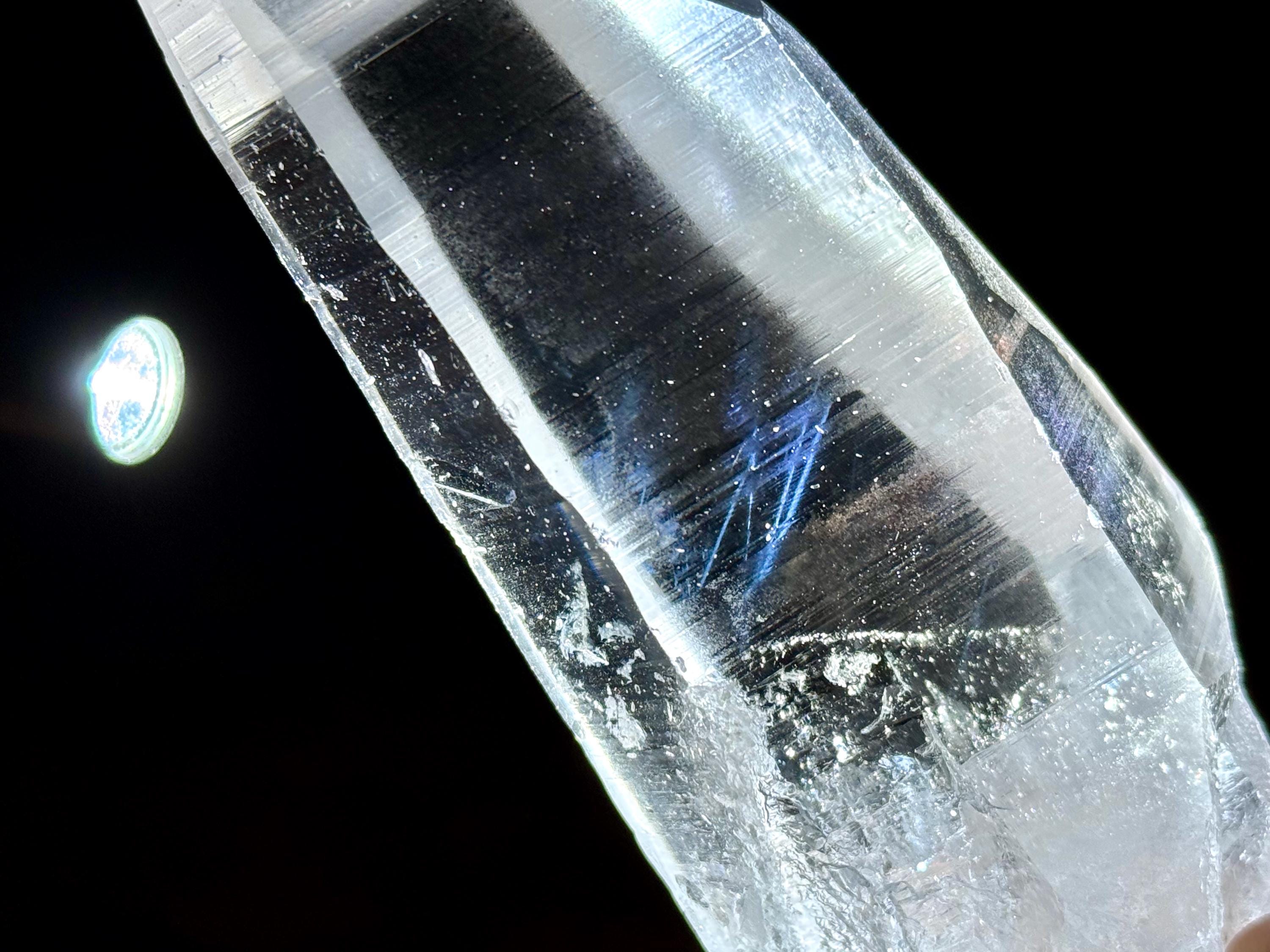 Blue Needle Lemurians exhibit a unique phenomenon that causes the appearance of blue needle-like inclusions within. In actuality, these are not physical inclusions, but instead thin tubes of gas suspended within, formed naturally inside the crystal over hundreds of millions of years during the crystal's formation. When light is shone on them from the exact right angle, they glow a ghostly blue color (some say due to the Tyndall Effect).