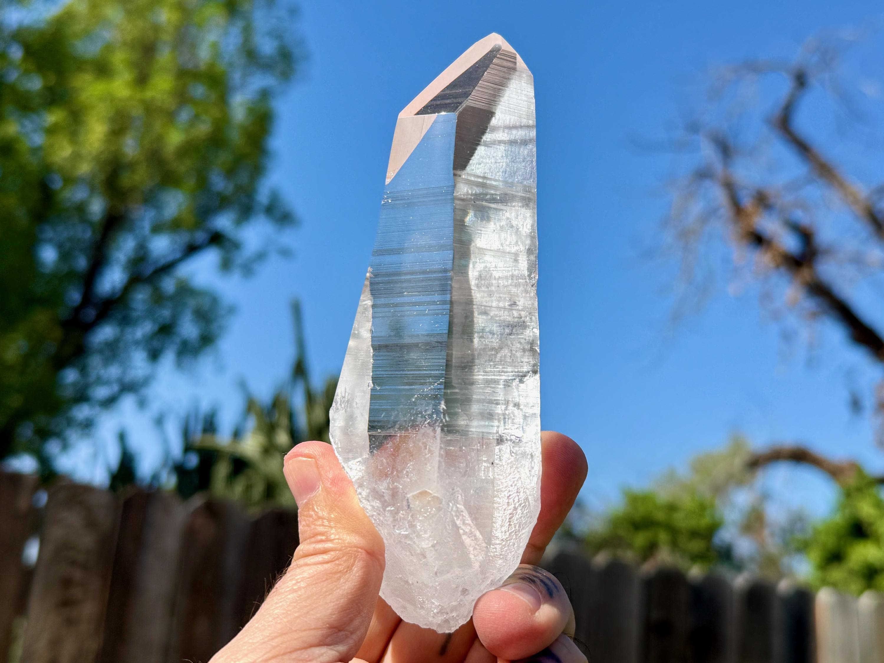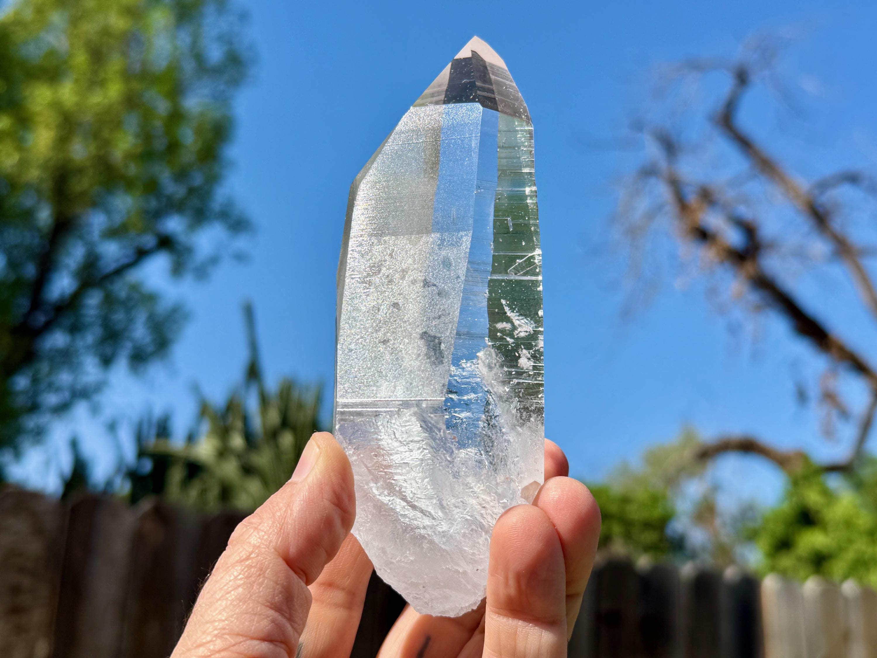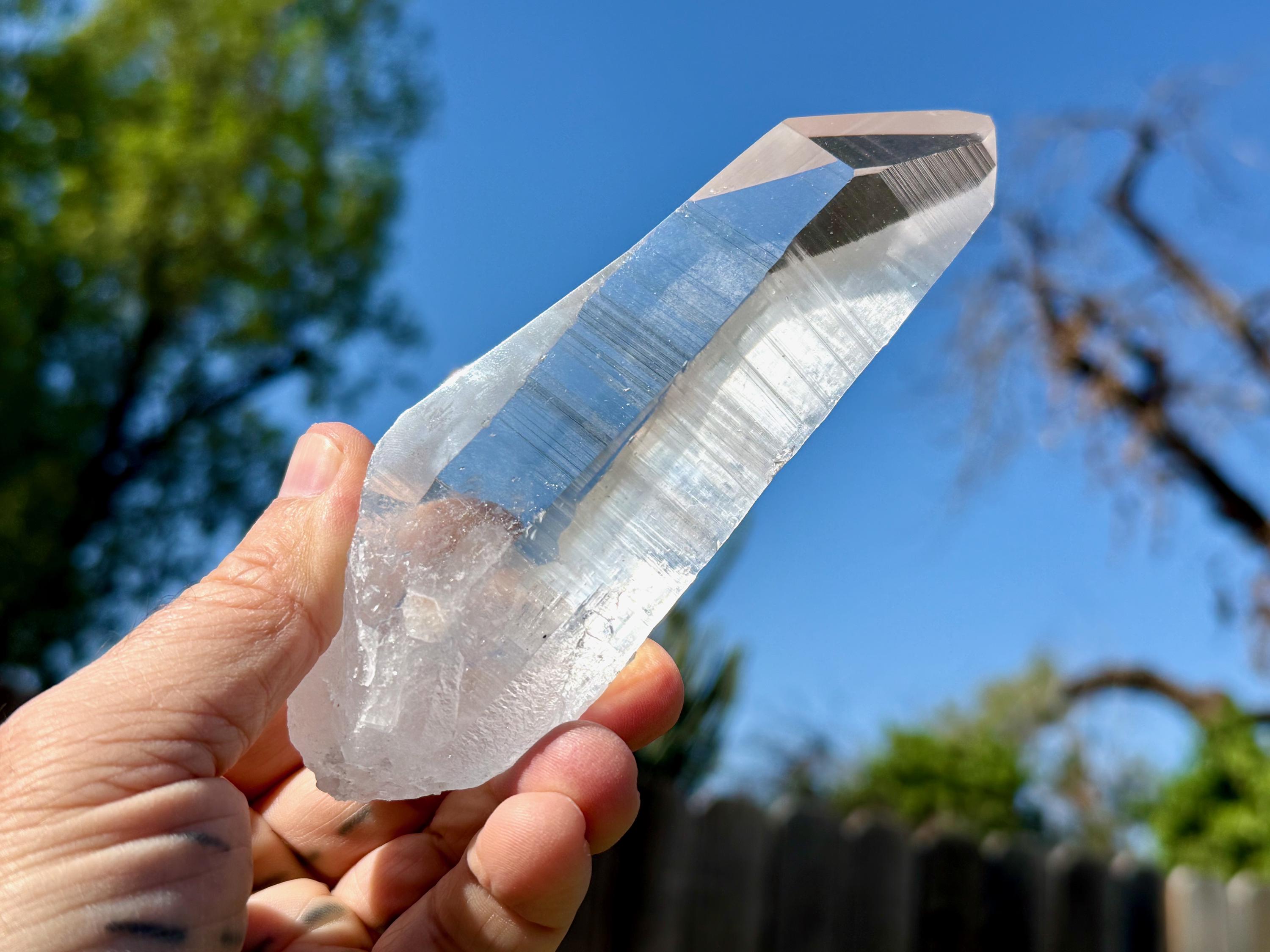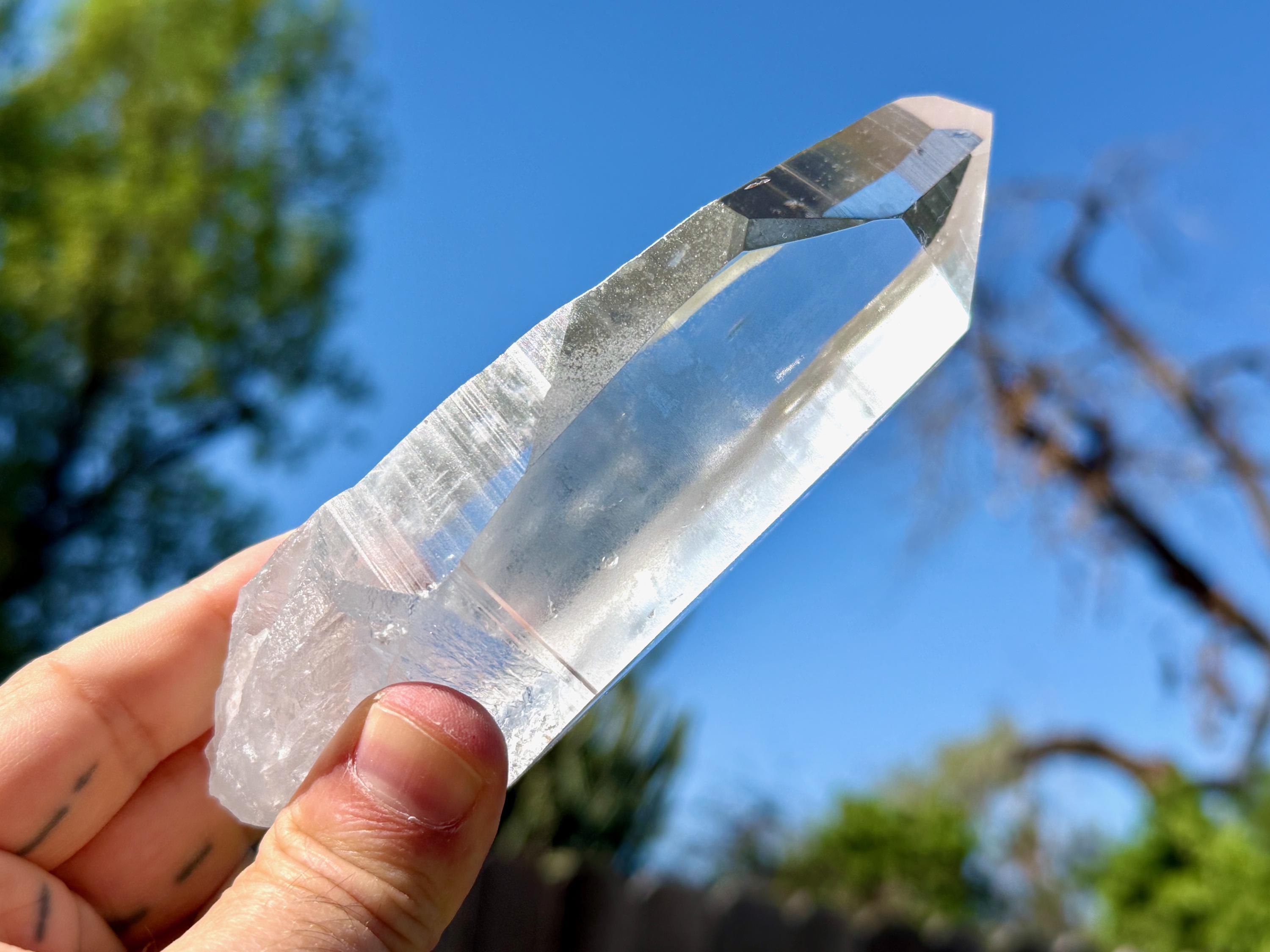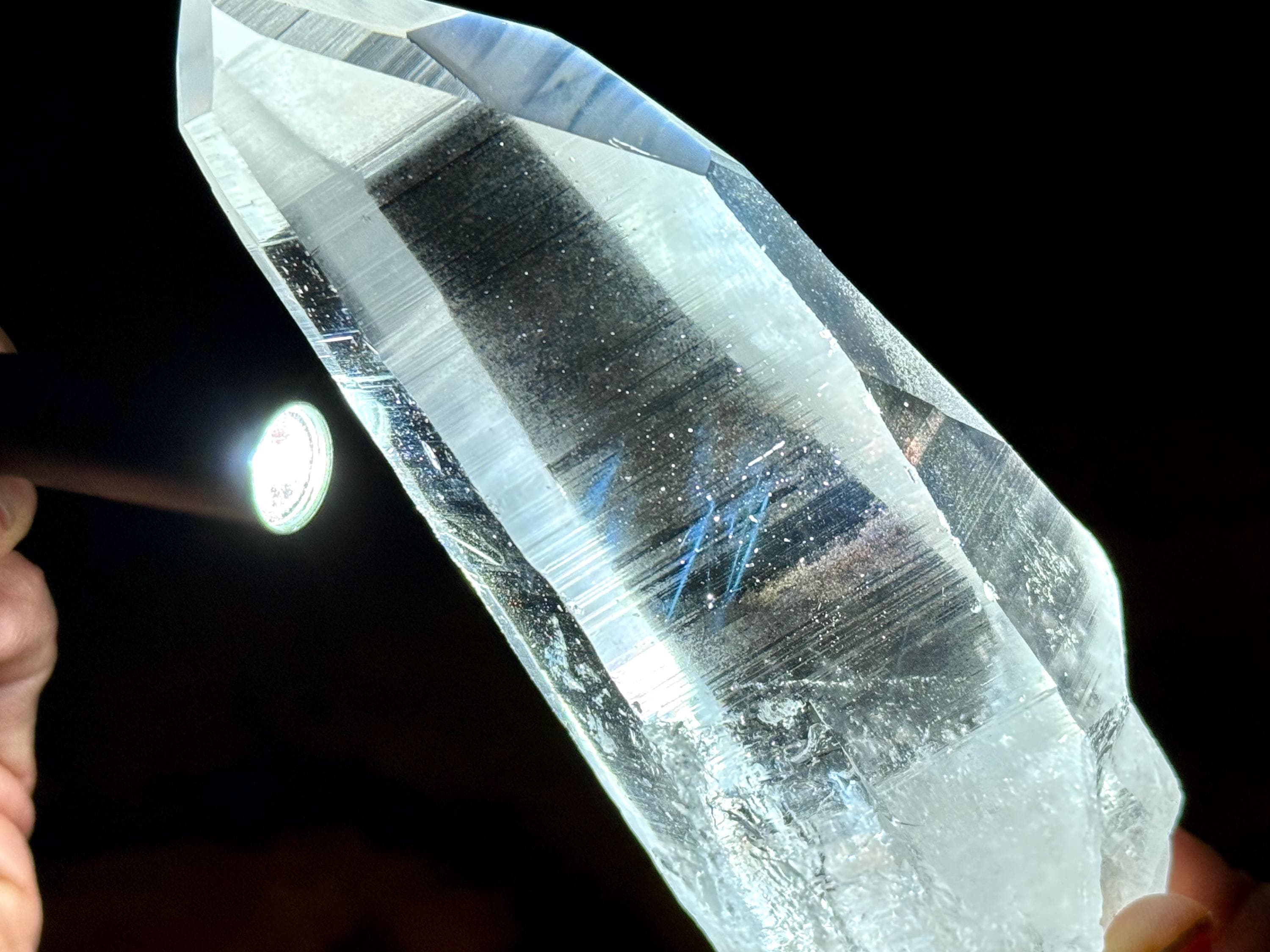 Blue Needle Lemurians exhibit a unique phenomenon that causes the appearance of blue needle-like inclusions within. In actuality, these are not physical inclusions, but instead thin tubes of gas suspended within, formed naturally inside the crystal over hundreds of millions of years during the crystal's formation. When light is shone on them from the exact right angle, they glow a ghostly blue color (some say due to the Tyndall Effect).