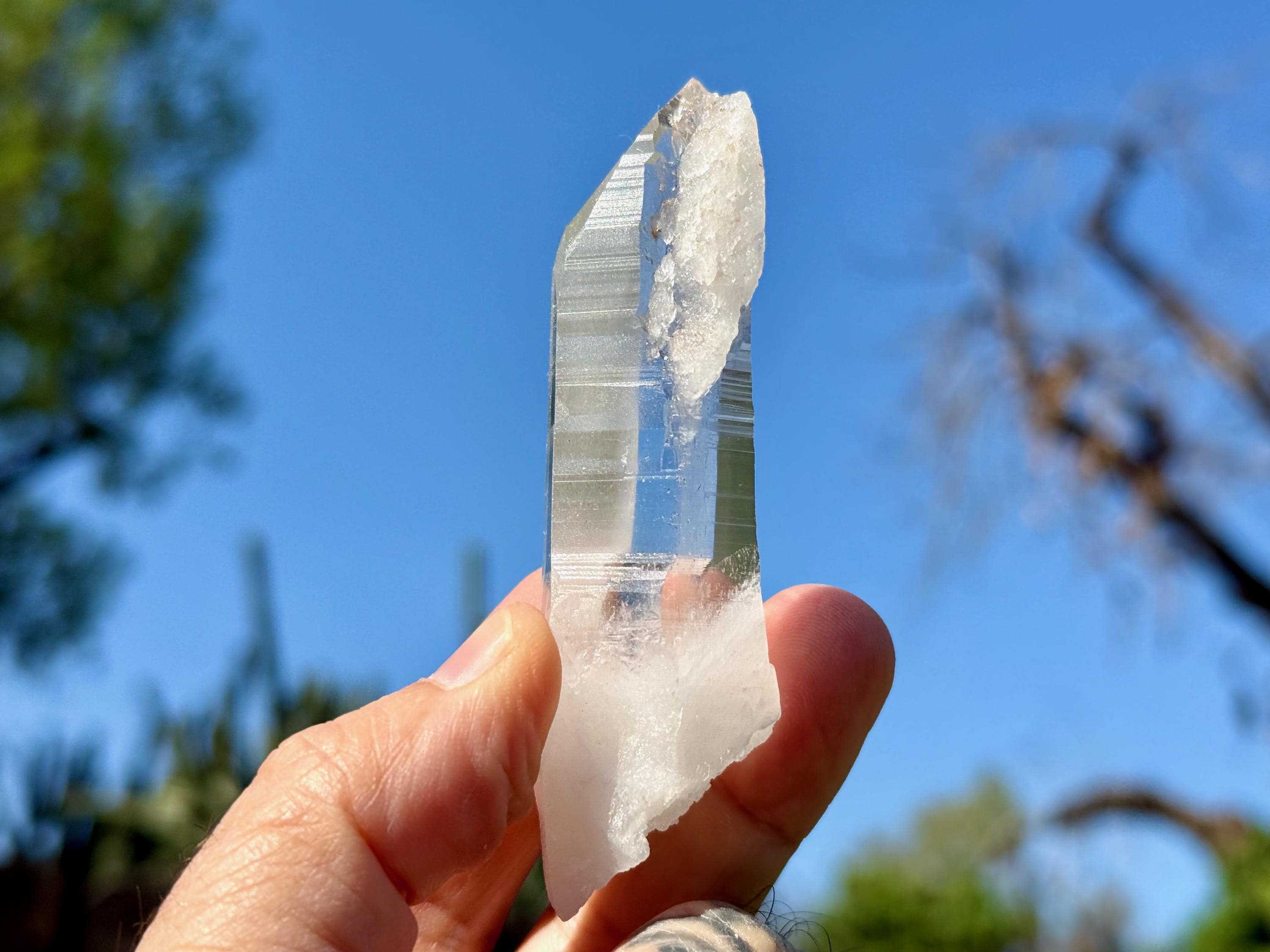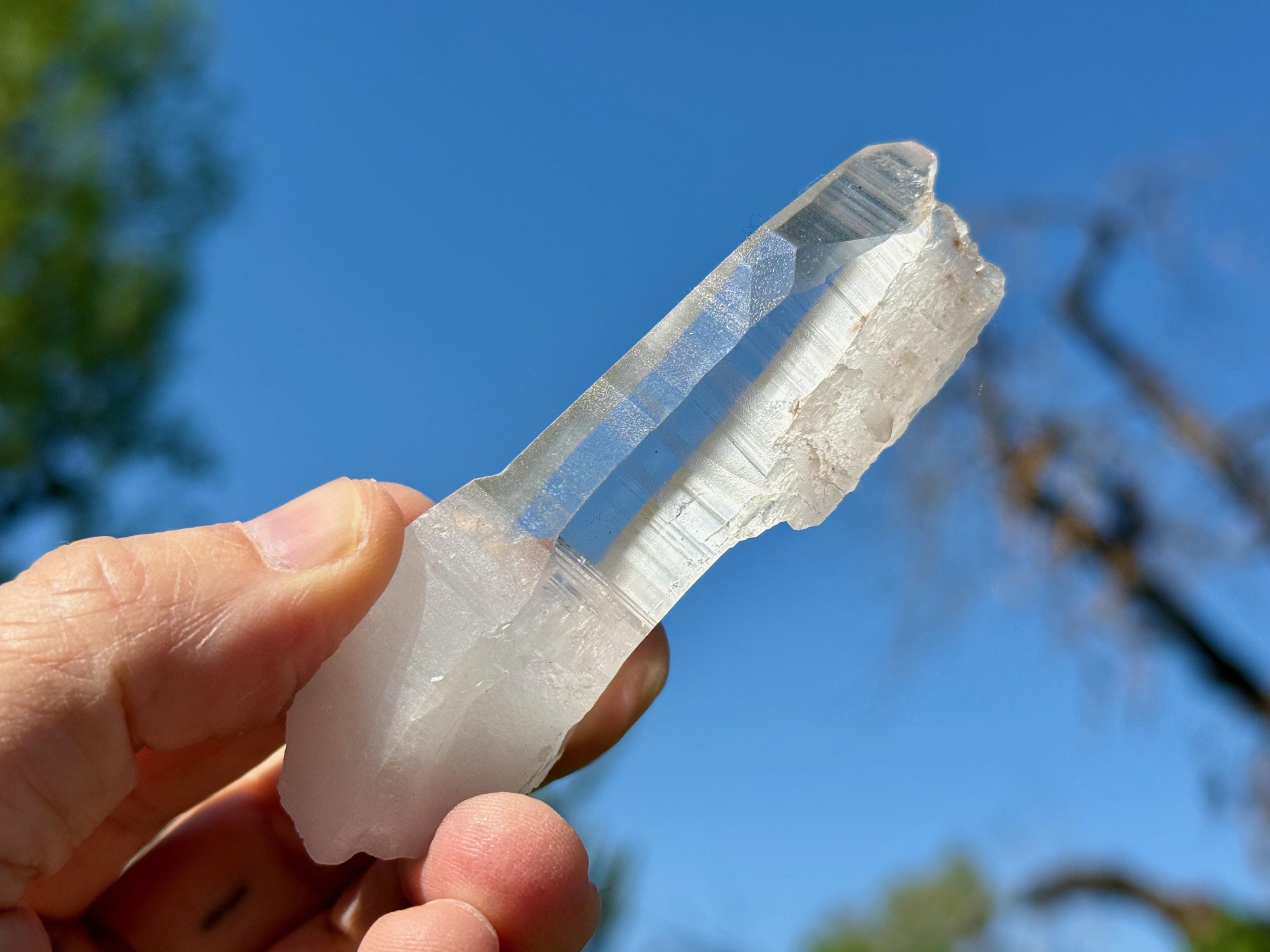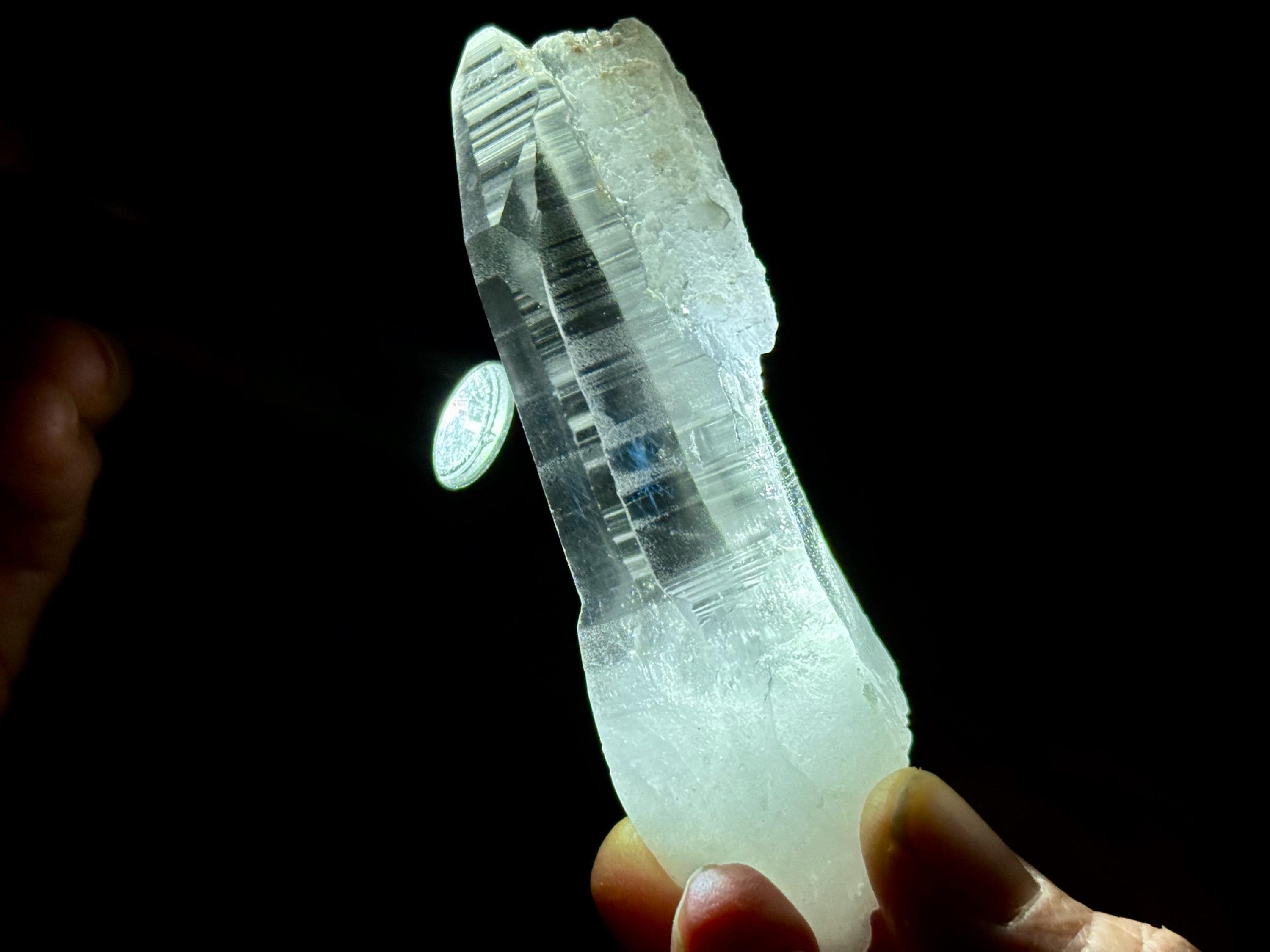 Blue Needle Lemurians exhibit a unique phenomenon that causes the appearance of blue needle-like inclusions within. In actuality, these are not physical inclusions, but instead thin tubes of gas suspended within, formed naturally inside the crystal over hundreds of millions of years during the crystal's formation. When light is shone on them from the exact right angle, they glow a ghostly blue color (some say due to the Tyndall Effect).
