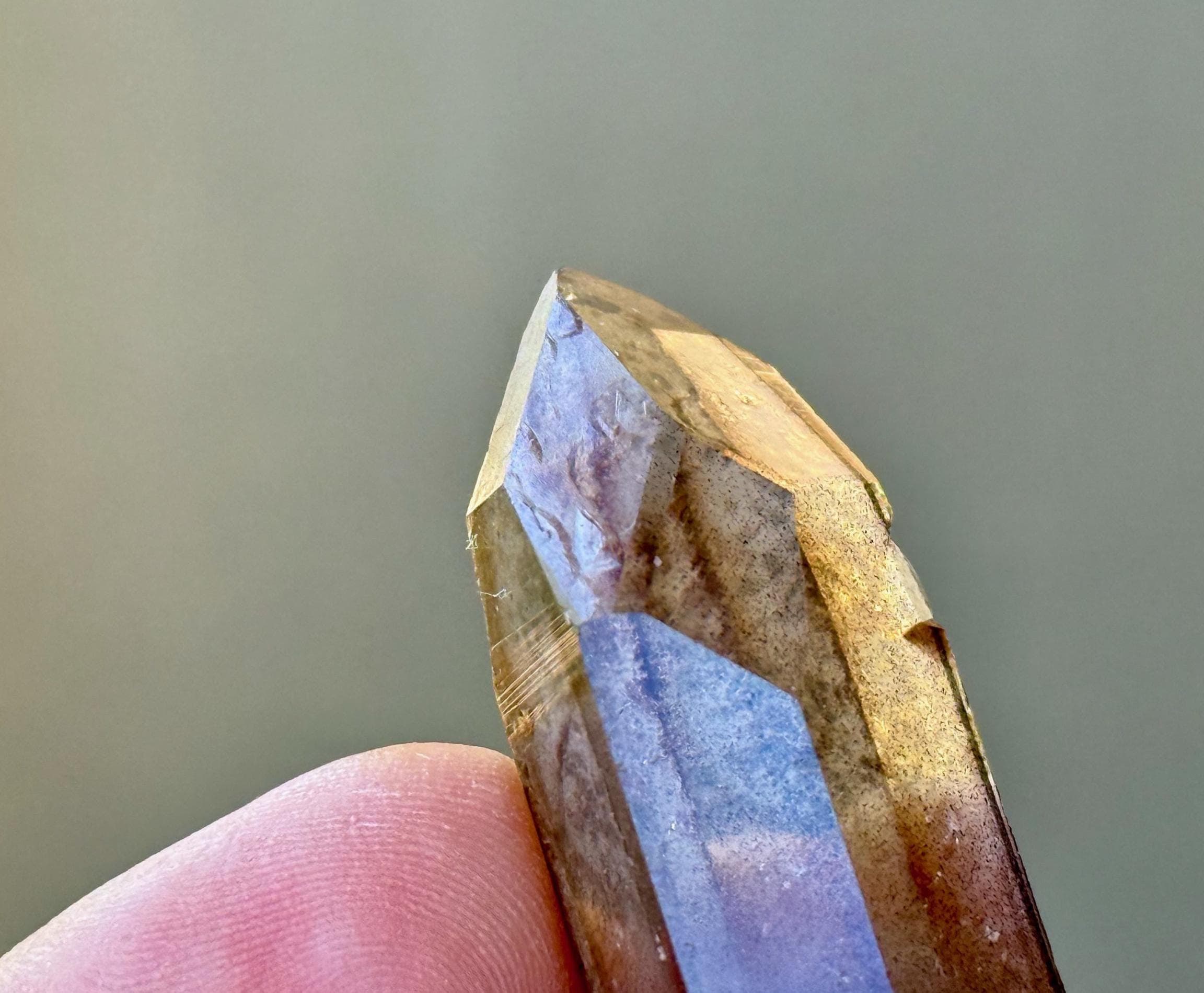 This crystal also possesses a GIANT "time link" facet to the left of the main face. And on the left facet, we can see several mildly imprinted "Record Keeper" triangles (see more on these formations below).