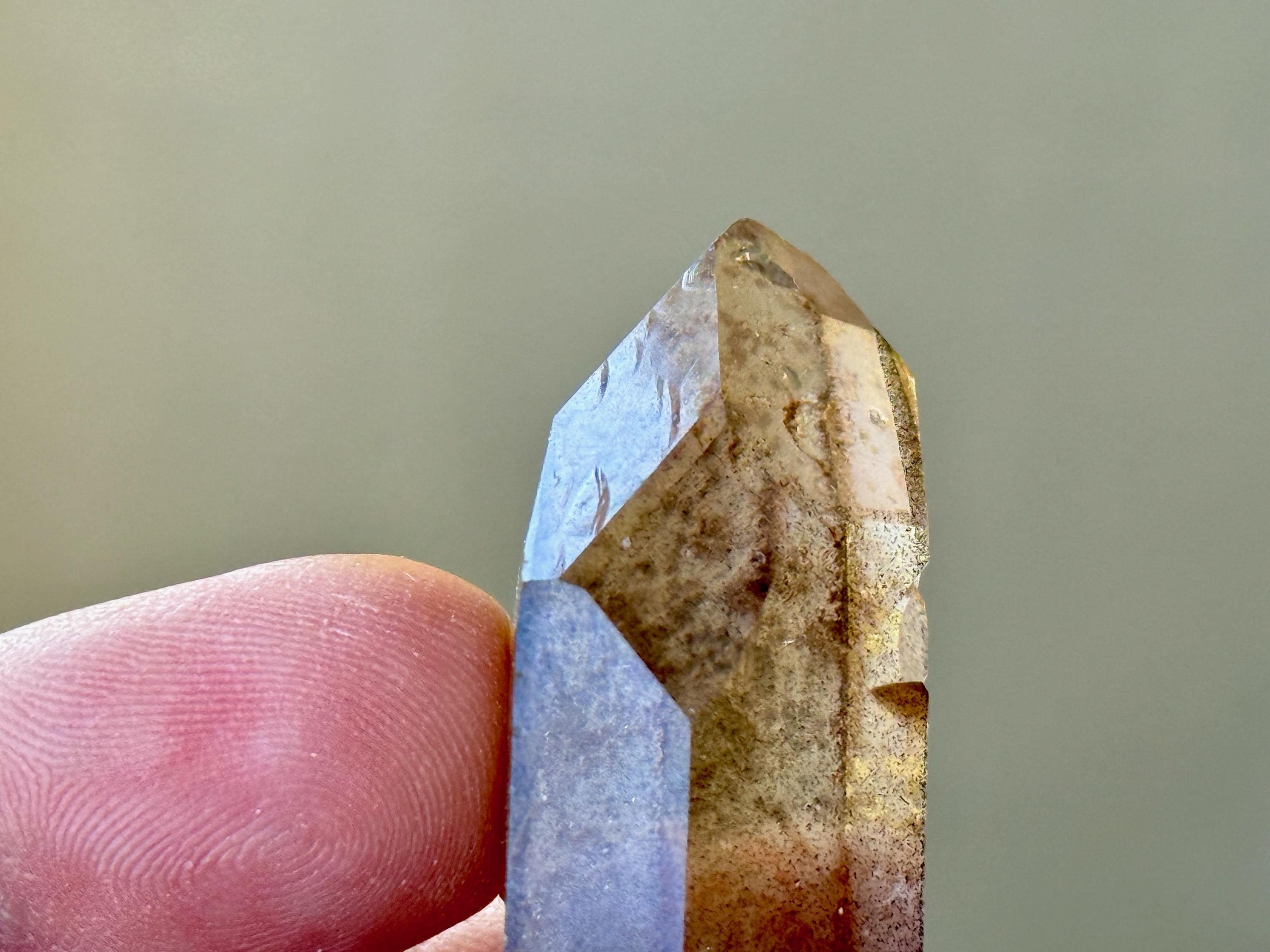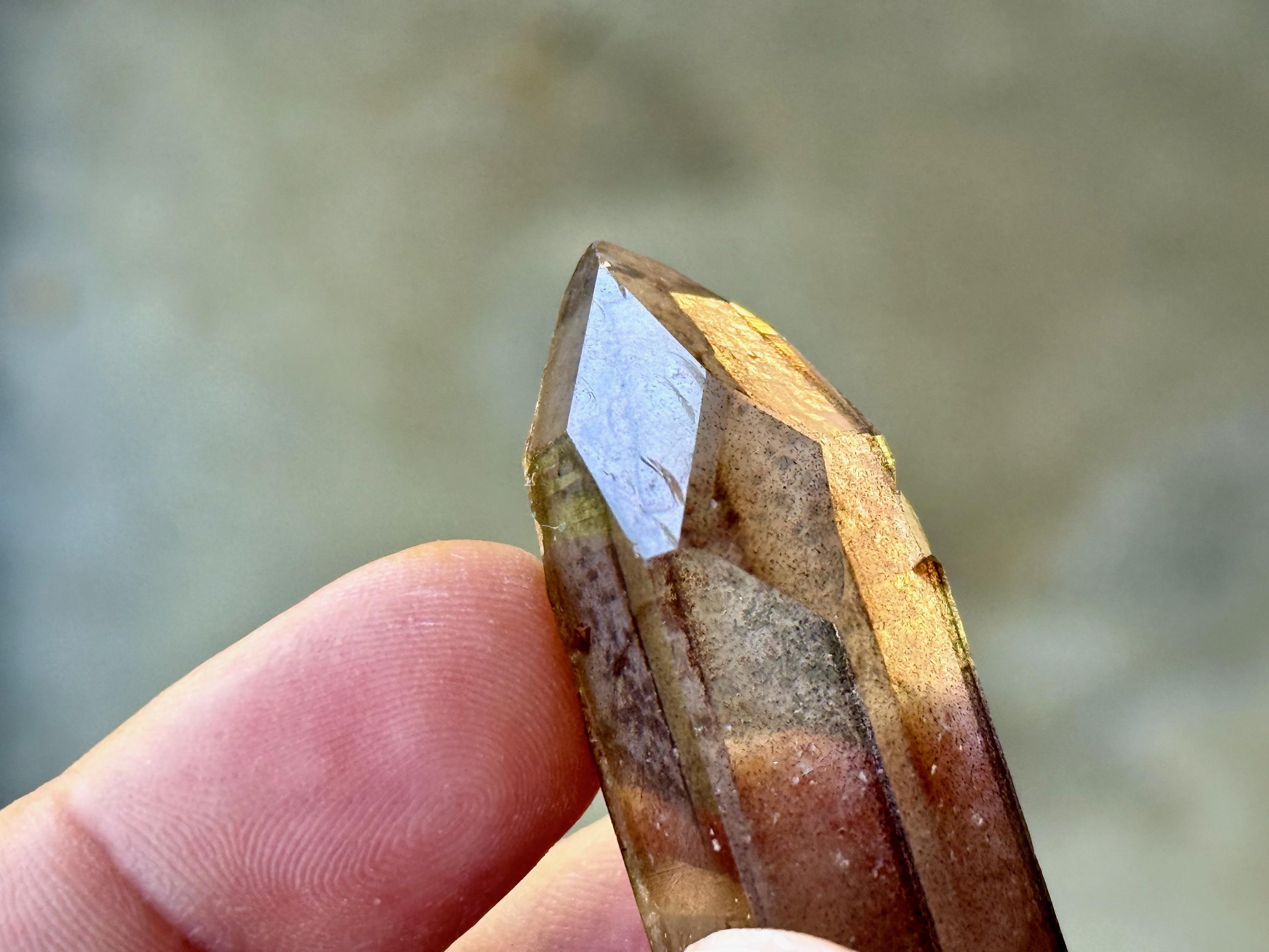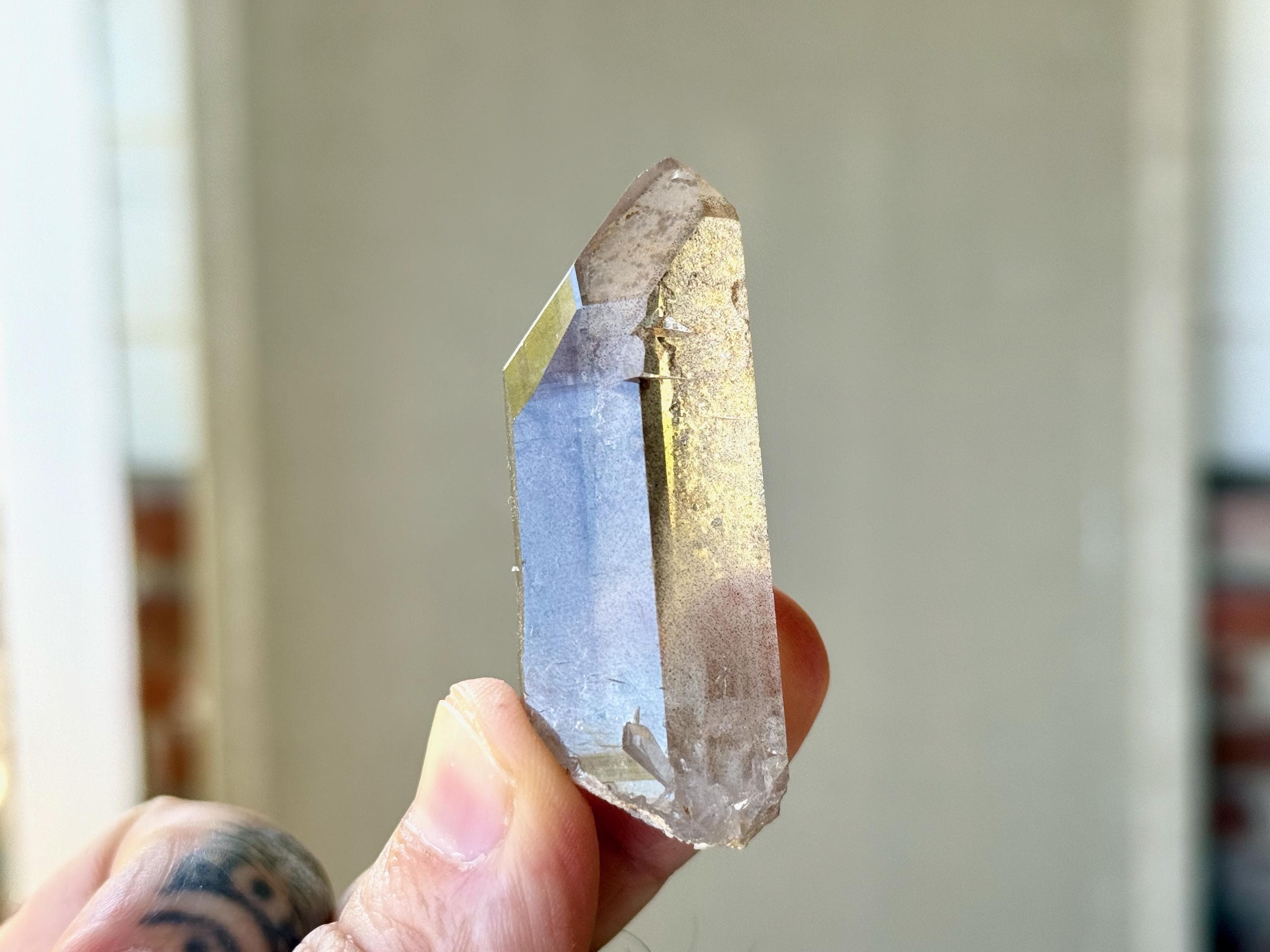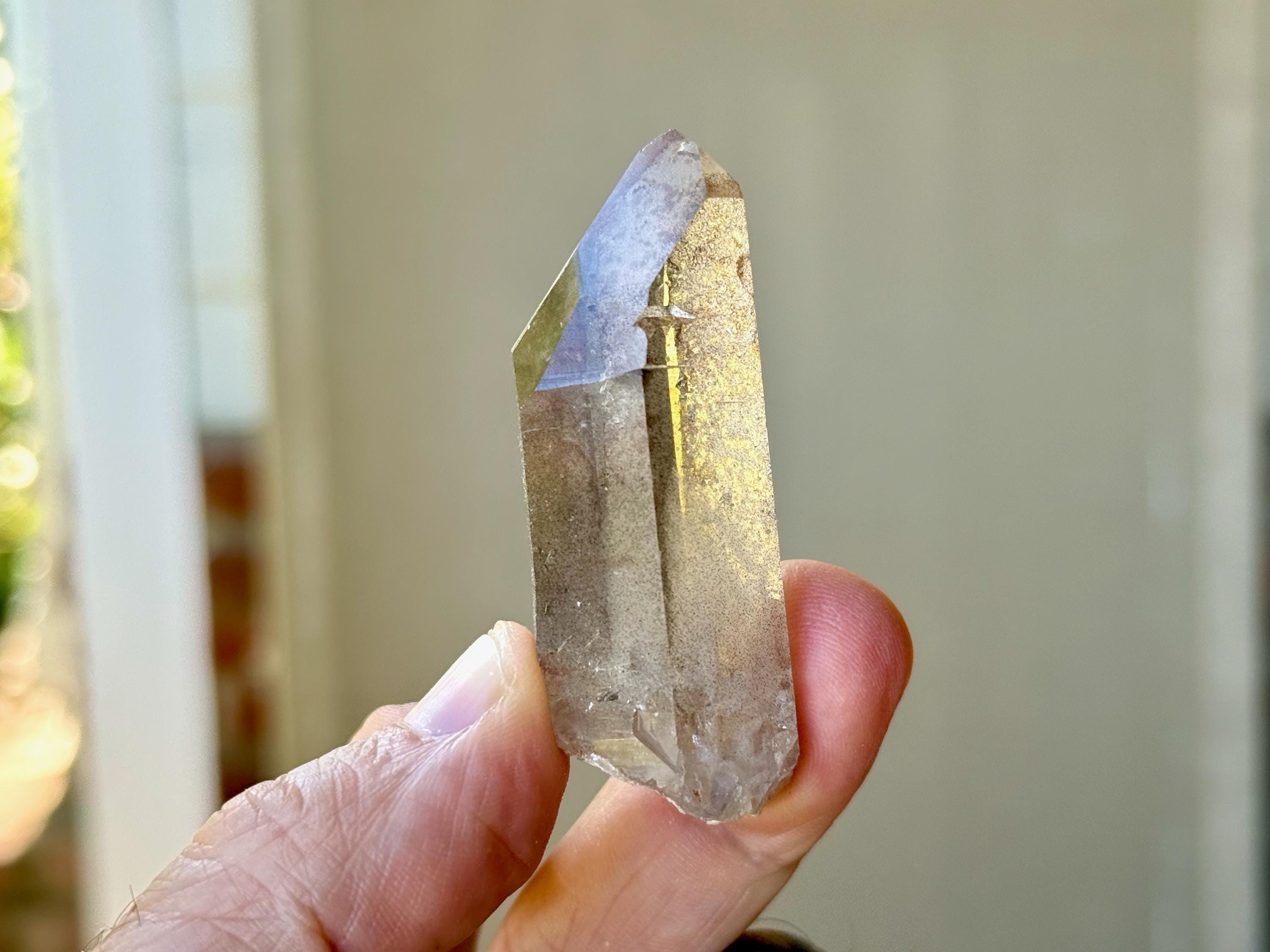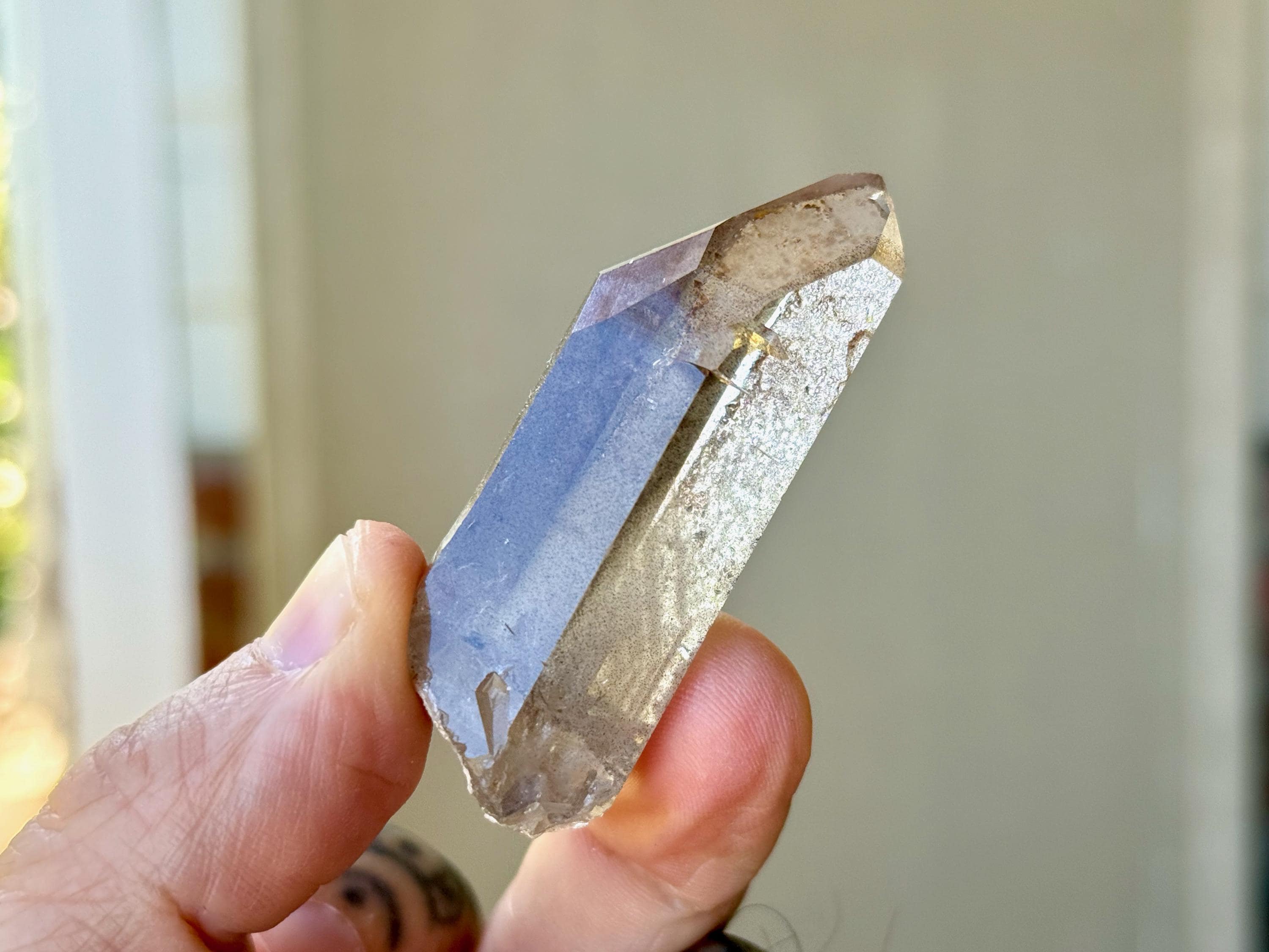 Exceptional luster and water clear clarity to this unique Sirian Starbrary Quartz with a mildly smoky hue. This crystal does not exhibit much in the way of actual Starbrary markings (aside from a minor linear etching on the right side), but it does exhibit the mild curvature in the main facet area that is characteristic of these crystals.