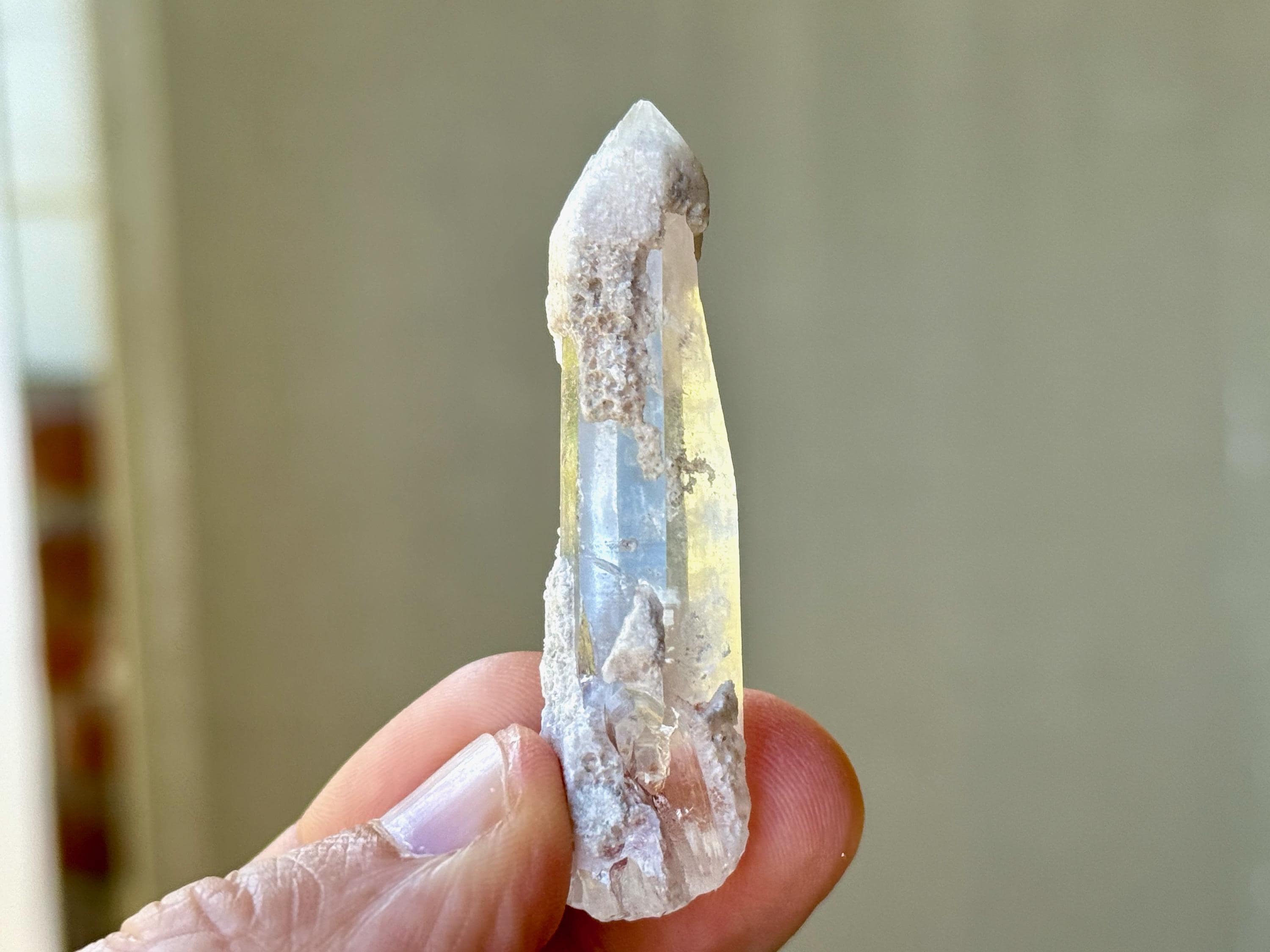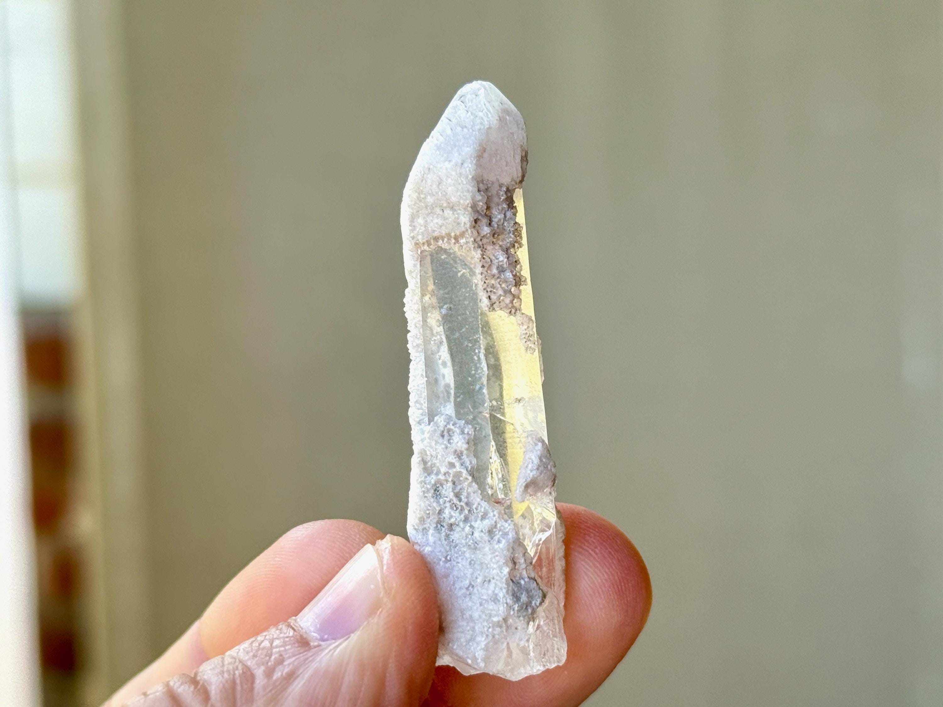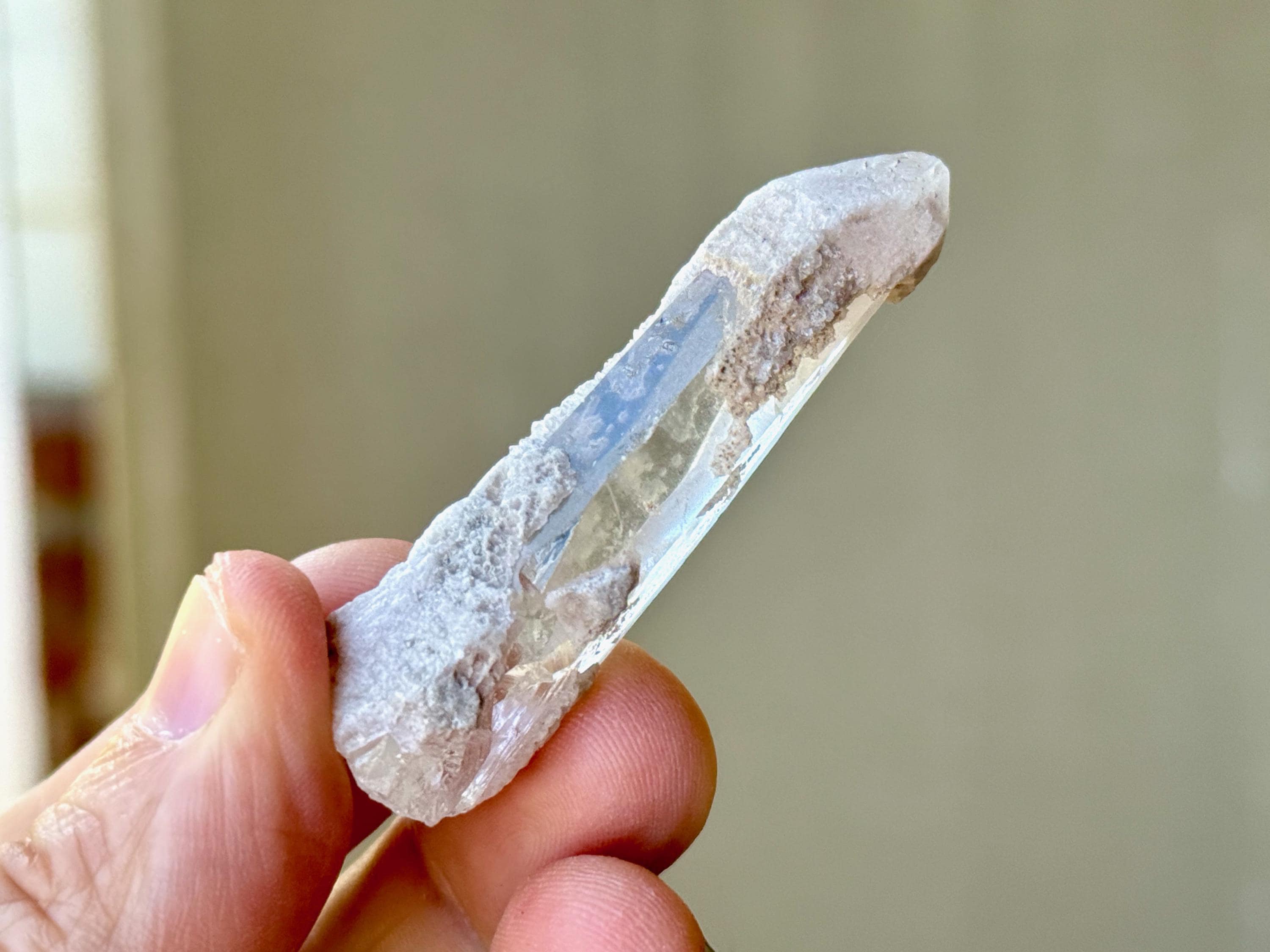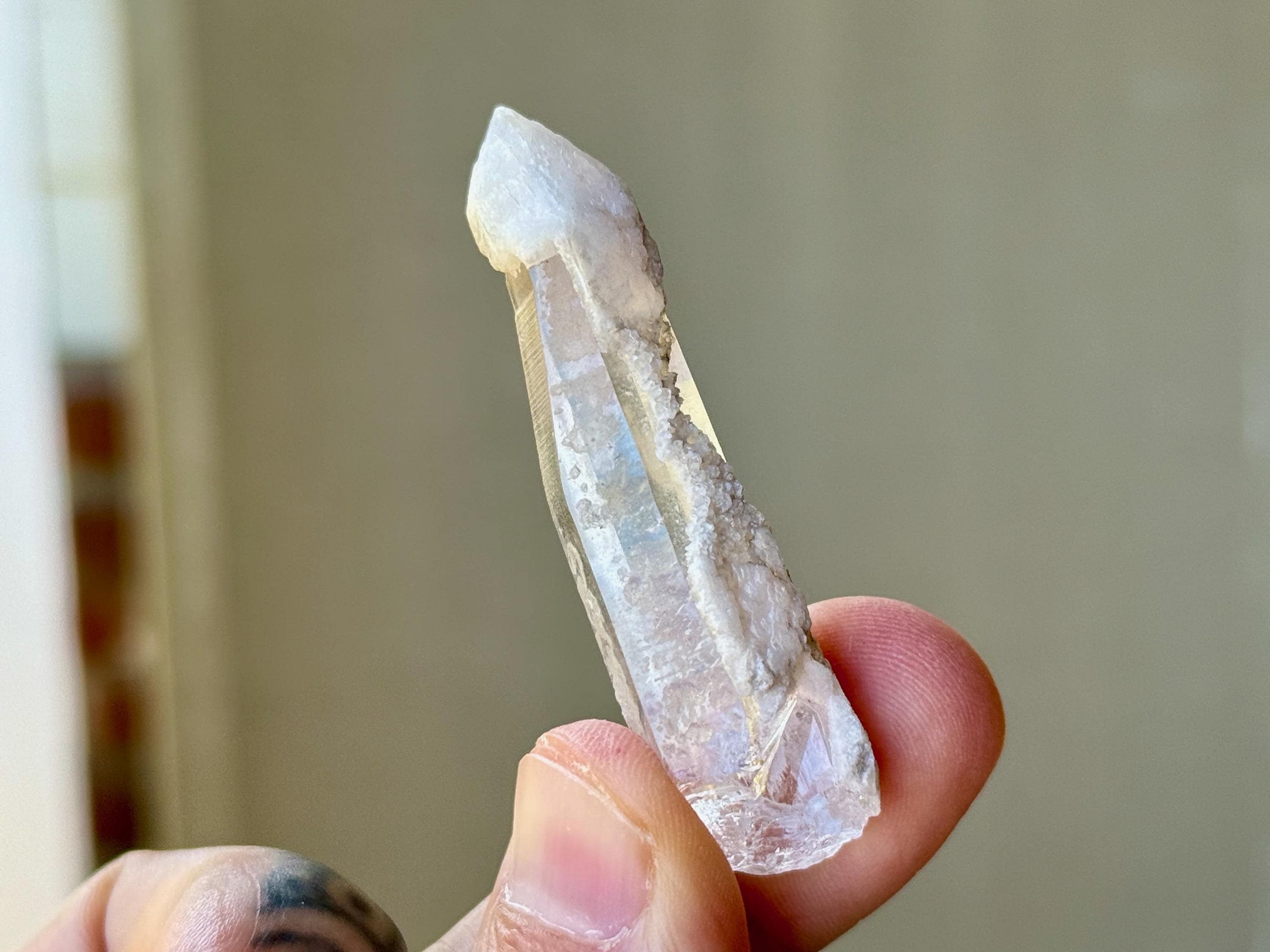 A frosty, snowcapped Lemurian in an elongated formation! This water clear crystal features a snow white inclusion that covers its main facet area, with one vein that extends down the crystal connecting it to the same inclusion near the base. However, much of the crystal itself is exposed and it's wonderfully lustrous!