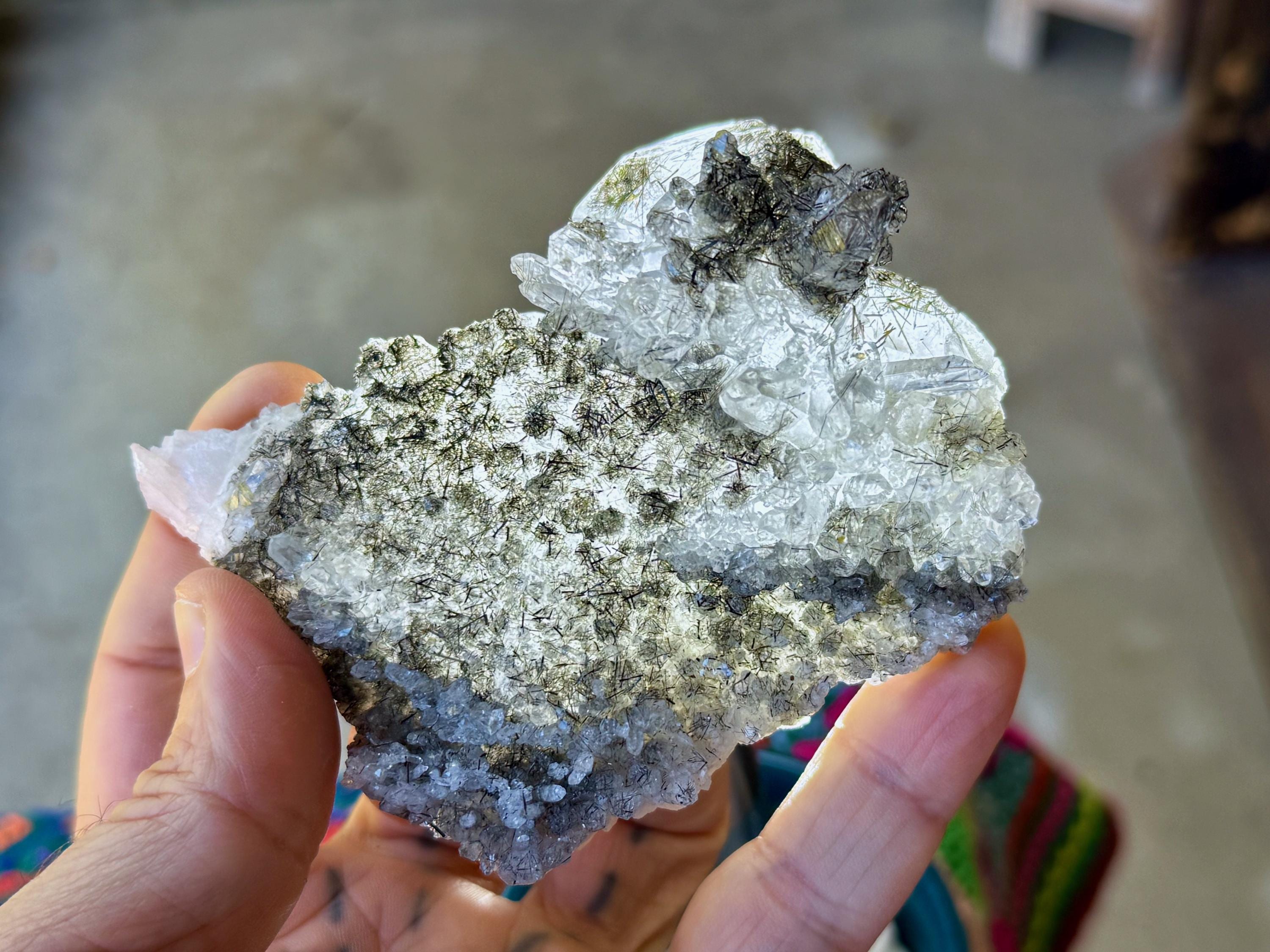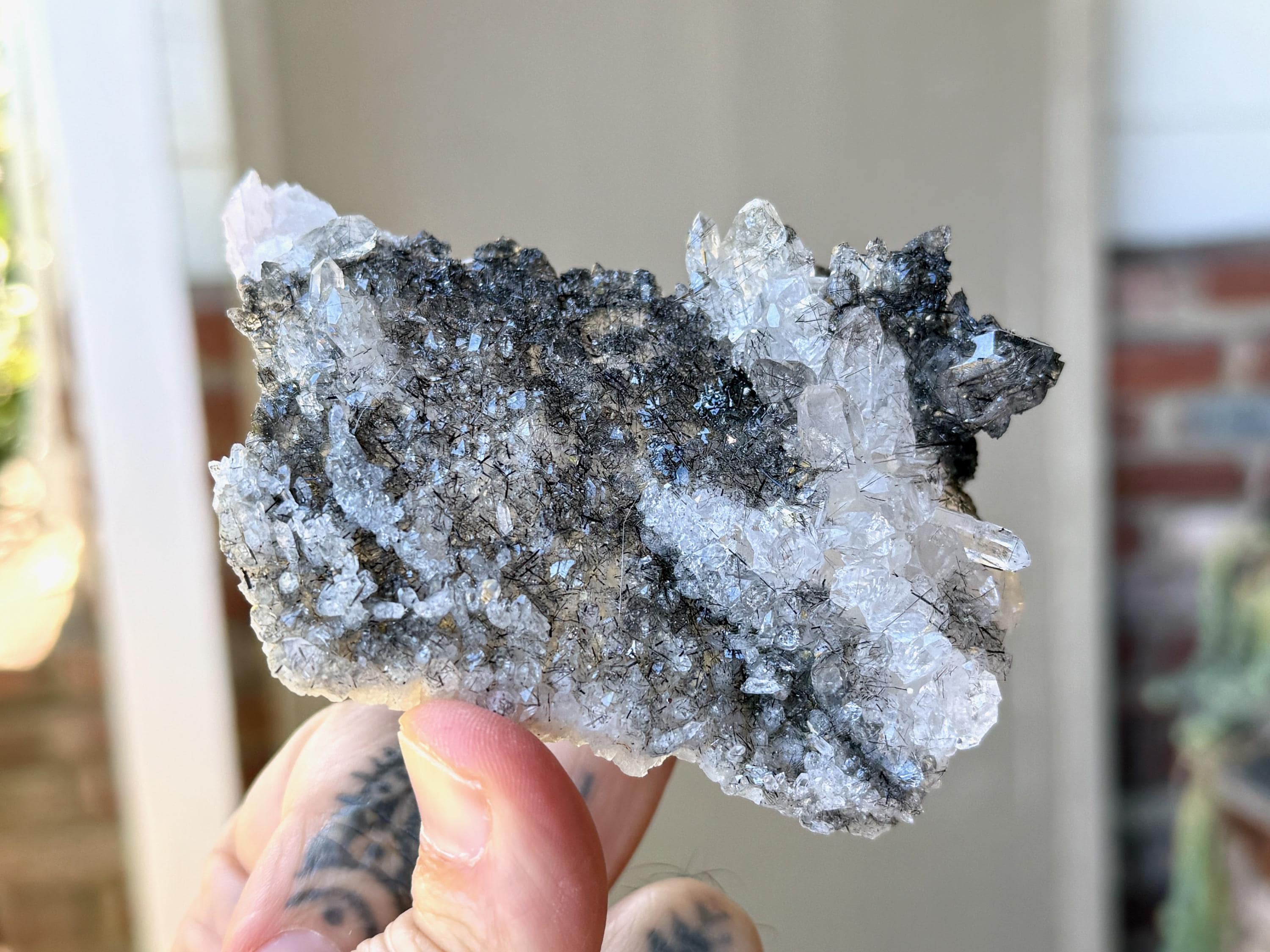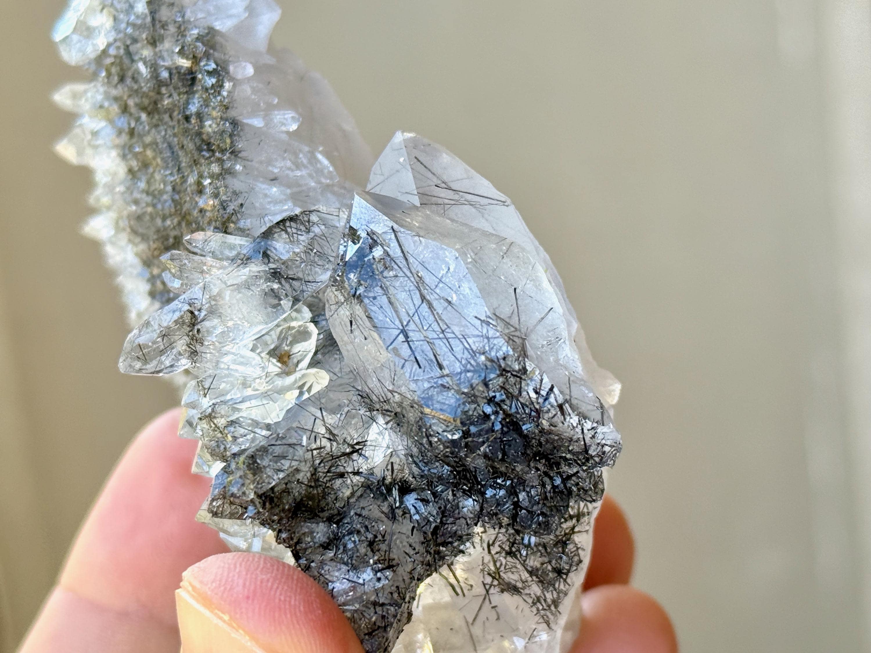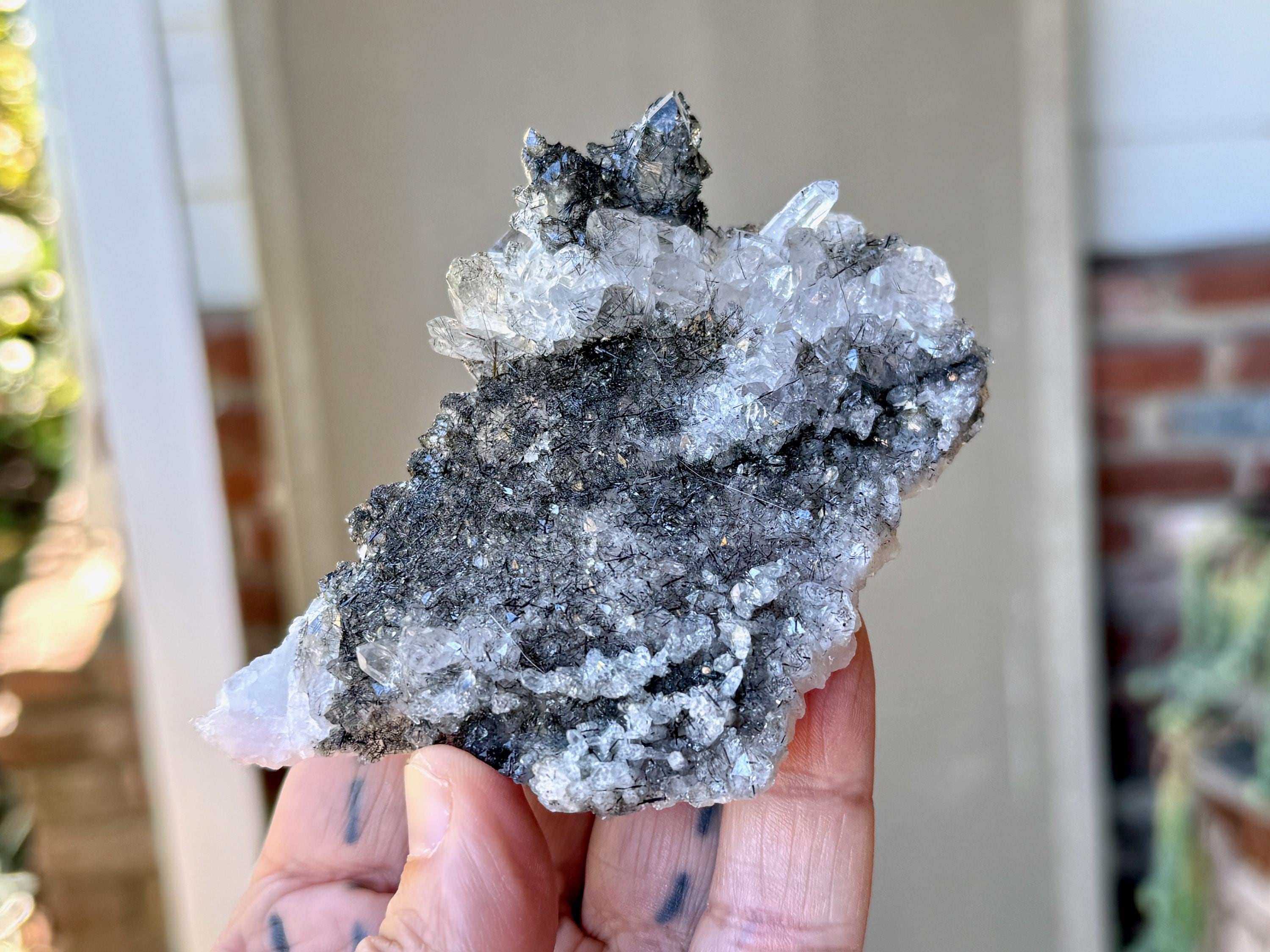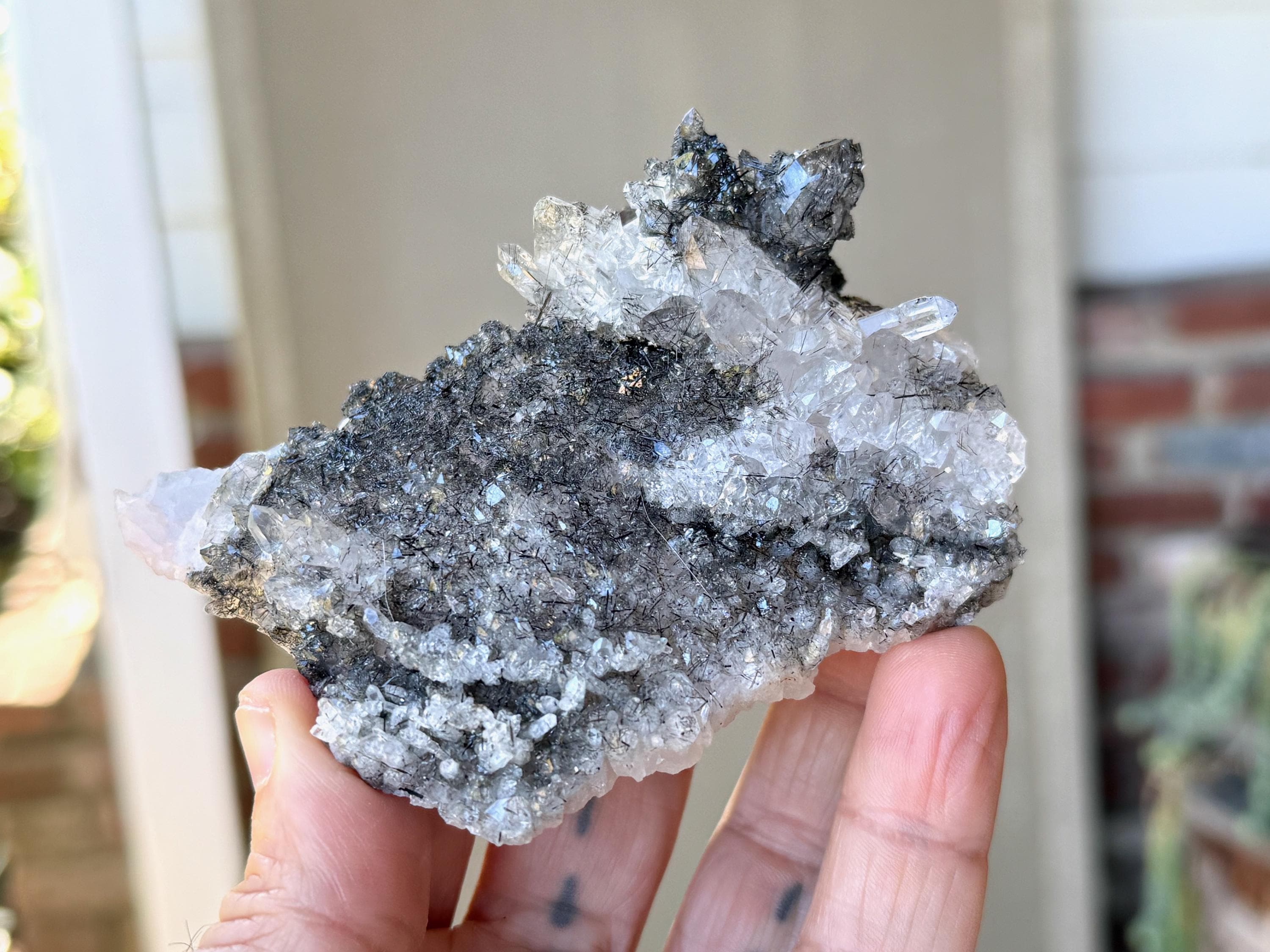 So much elegance and sparkle to this lustrous Quartz crystal cluster with needle-like inclusions of Black Tourmaline throughout. This is a wonderful formation that includes larger Quartz crystals around one edge, as well as smaller crystals covering the plate-like broad side.