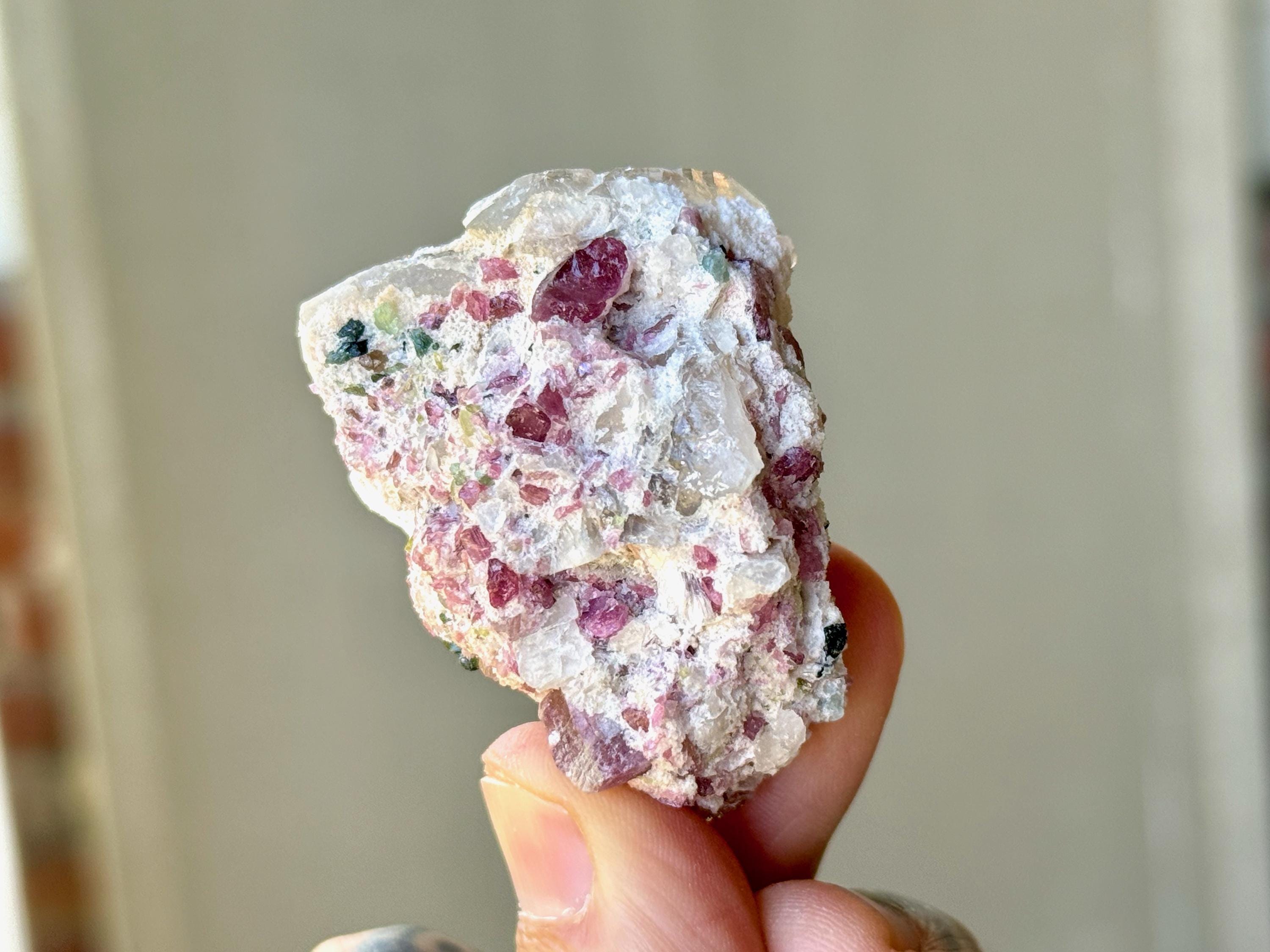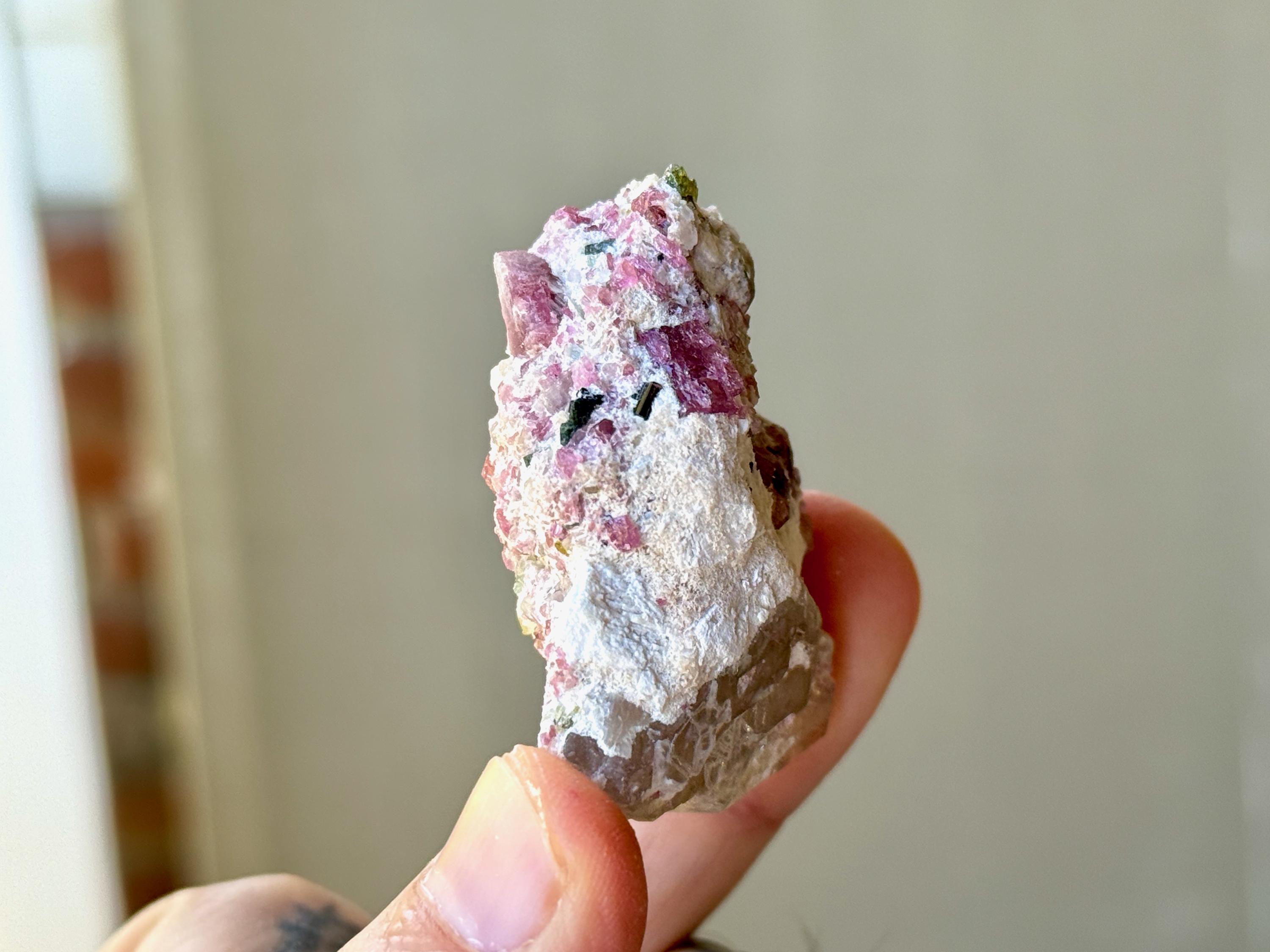A wonderful combination of colors, textures and healing energies in this beautiful Unicorn Stone! This piece features a Quartz crystal attached to a large Feldspar crystal, which is embedded with Pink Tourmaline throughout. We can even see some specks of Green Tourmaline as well. A very unique piece from this collection!
