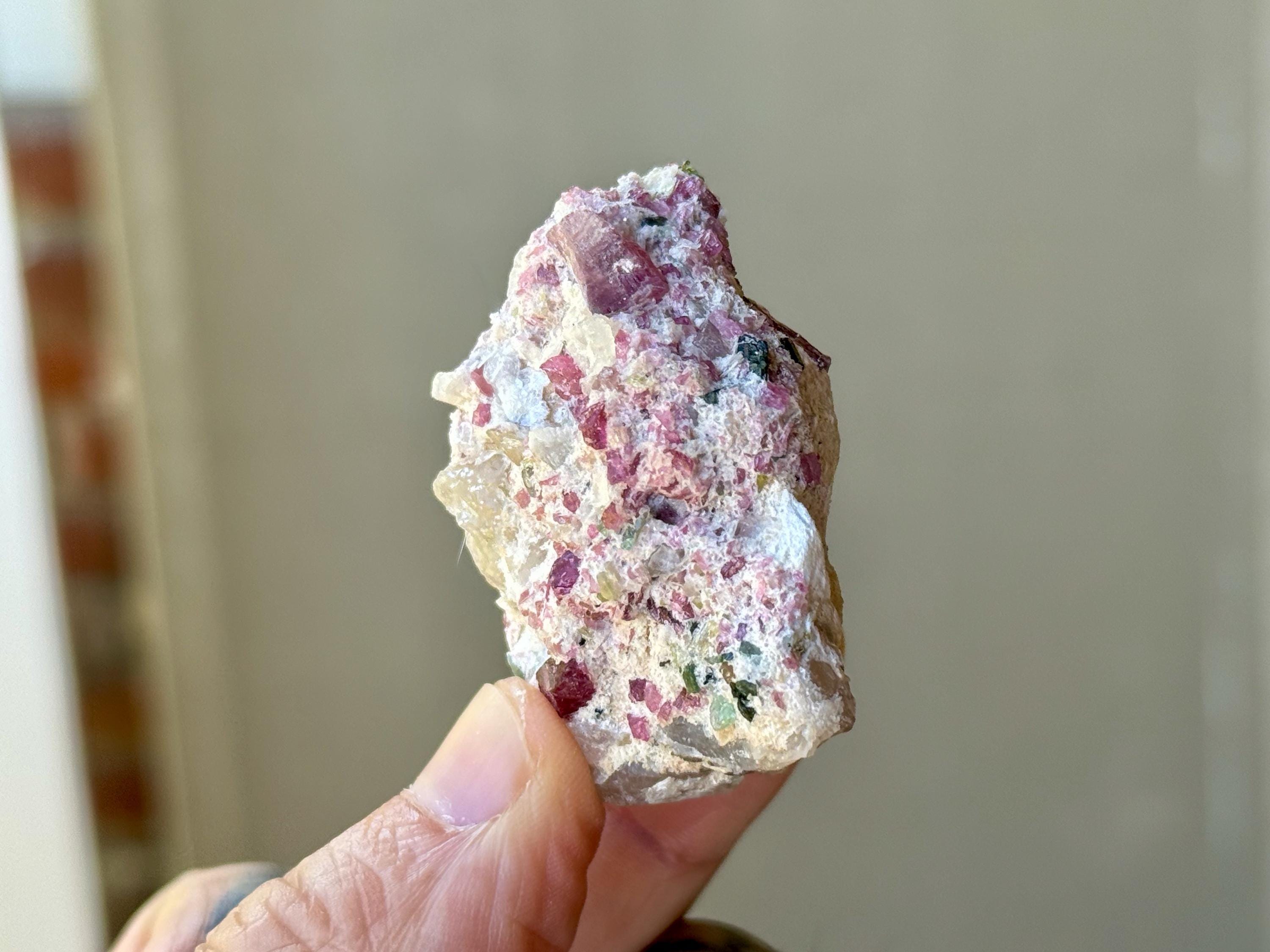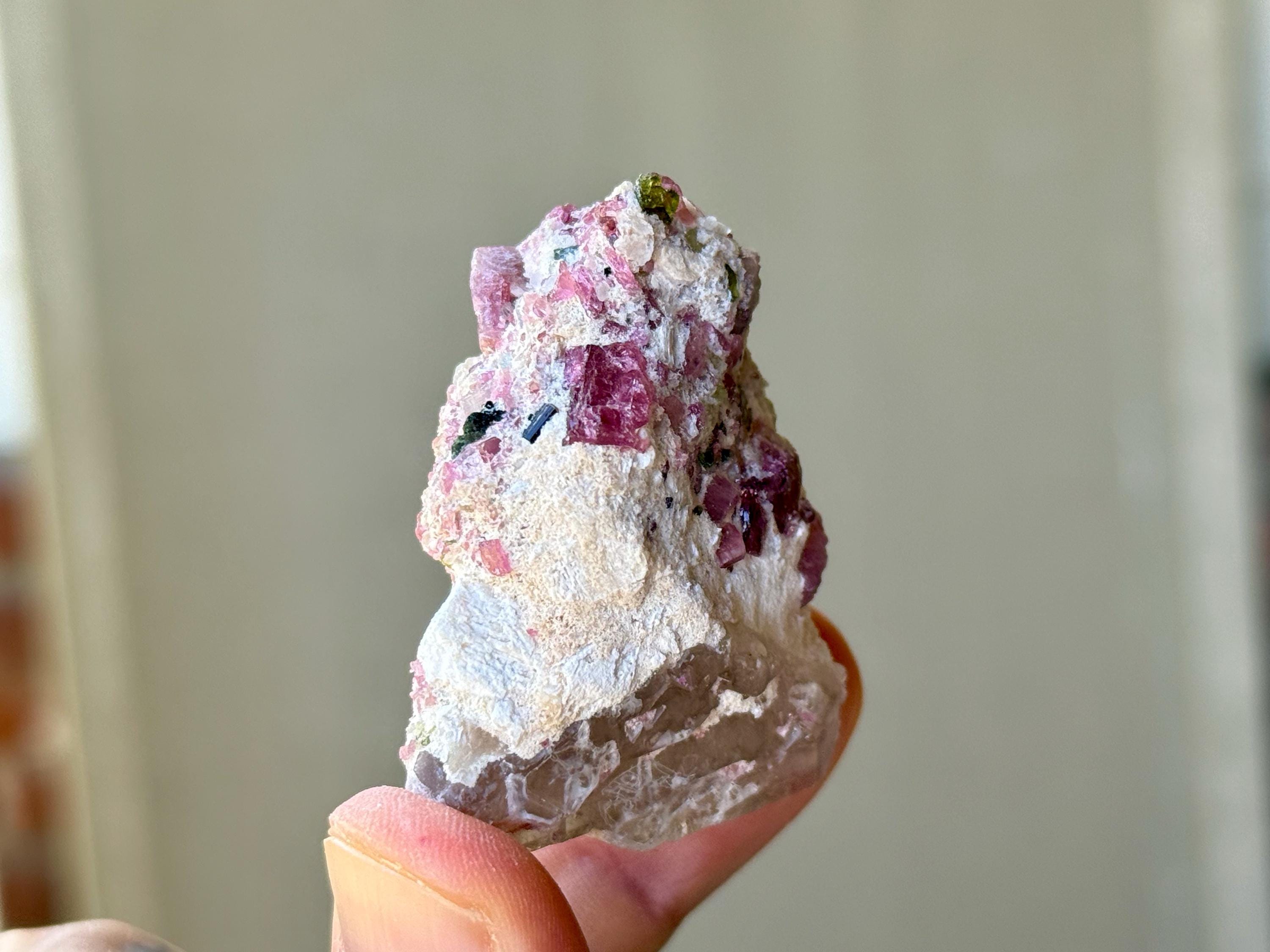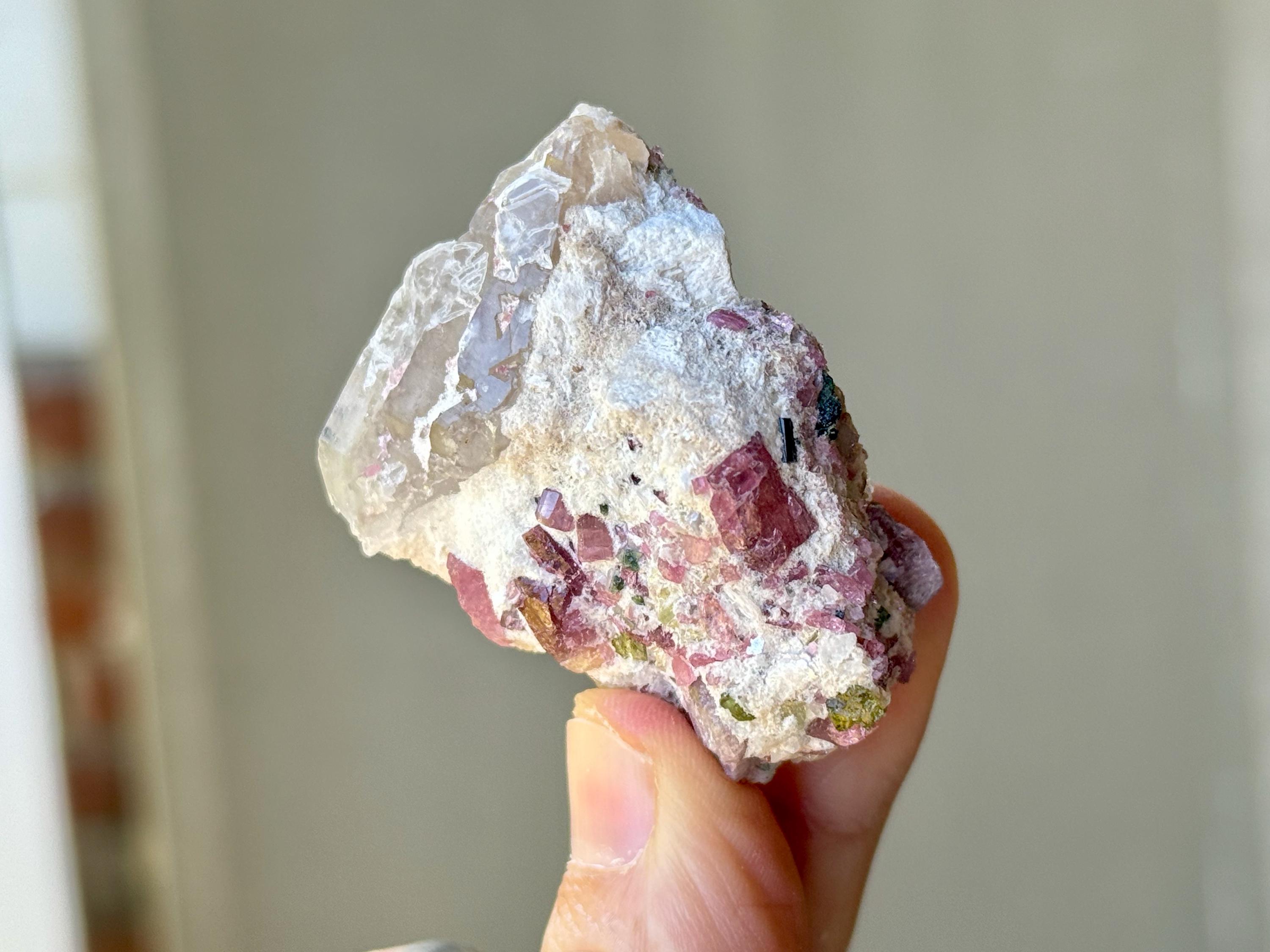 The crystals from this find include unique combinations of Quartz, Citrine, Lepidolite, Cleavelandite, Albite and Feldspar, with vividly colored Tourmalines in lovely hues of green, pink, purple and blue. Crystals with combinations of these minerals are sometimes referred to as "Unicorn Stones."