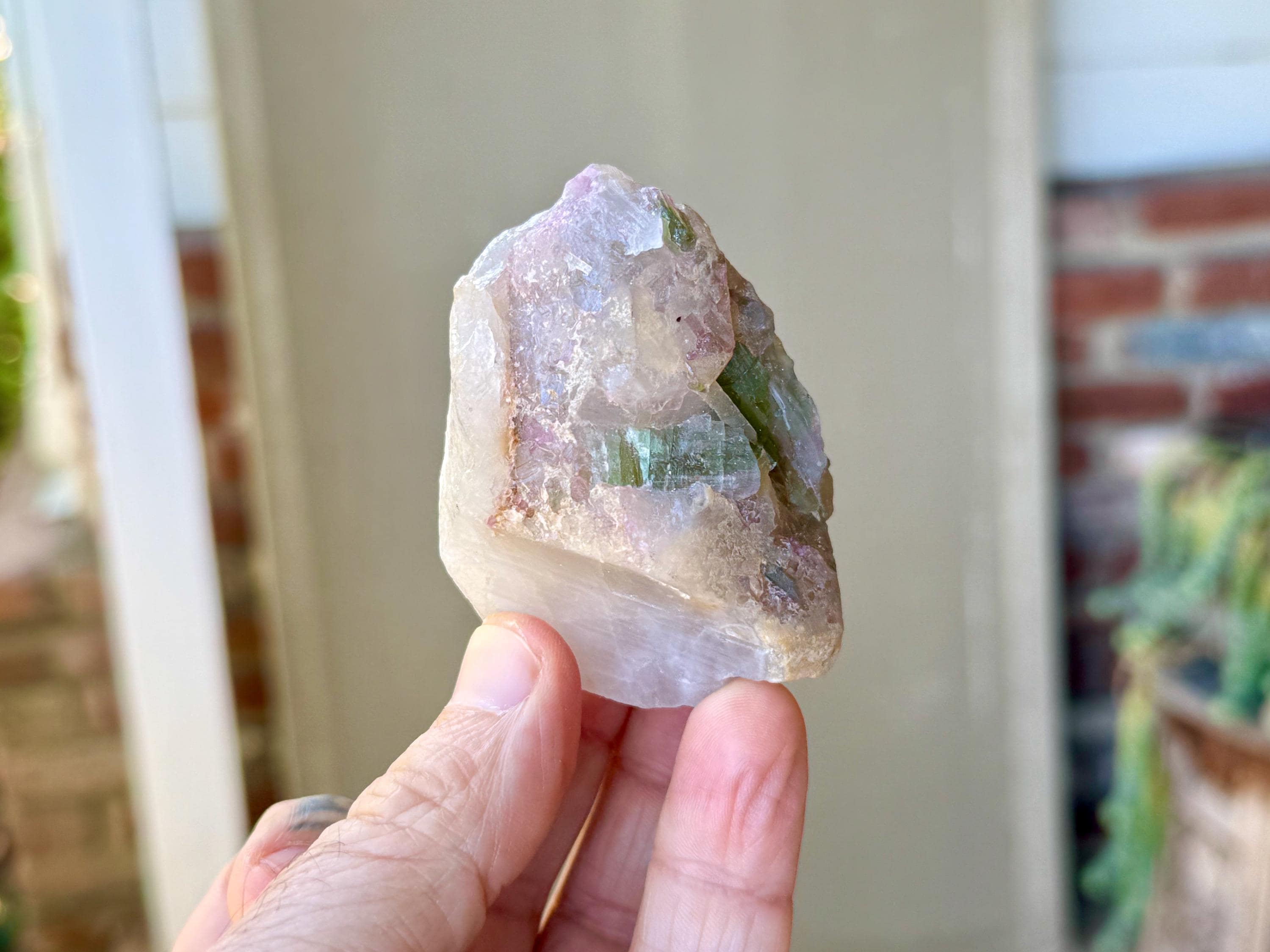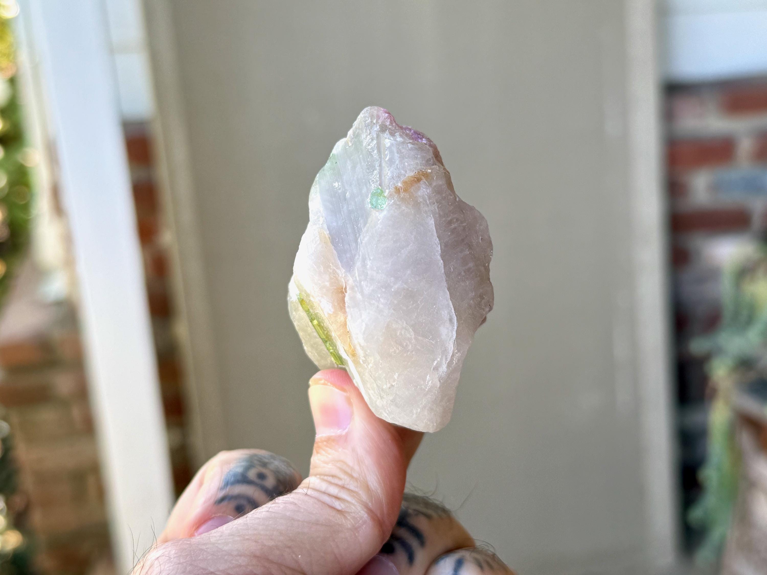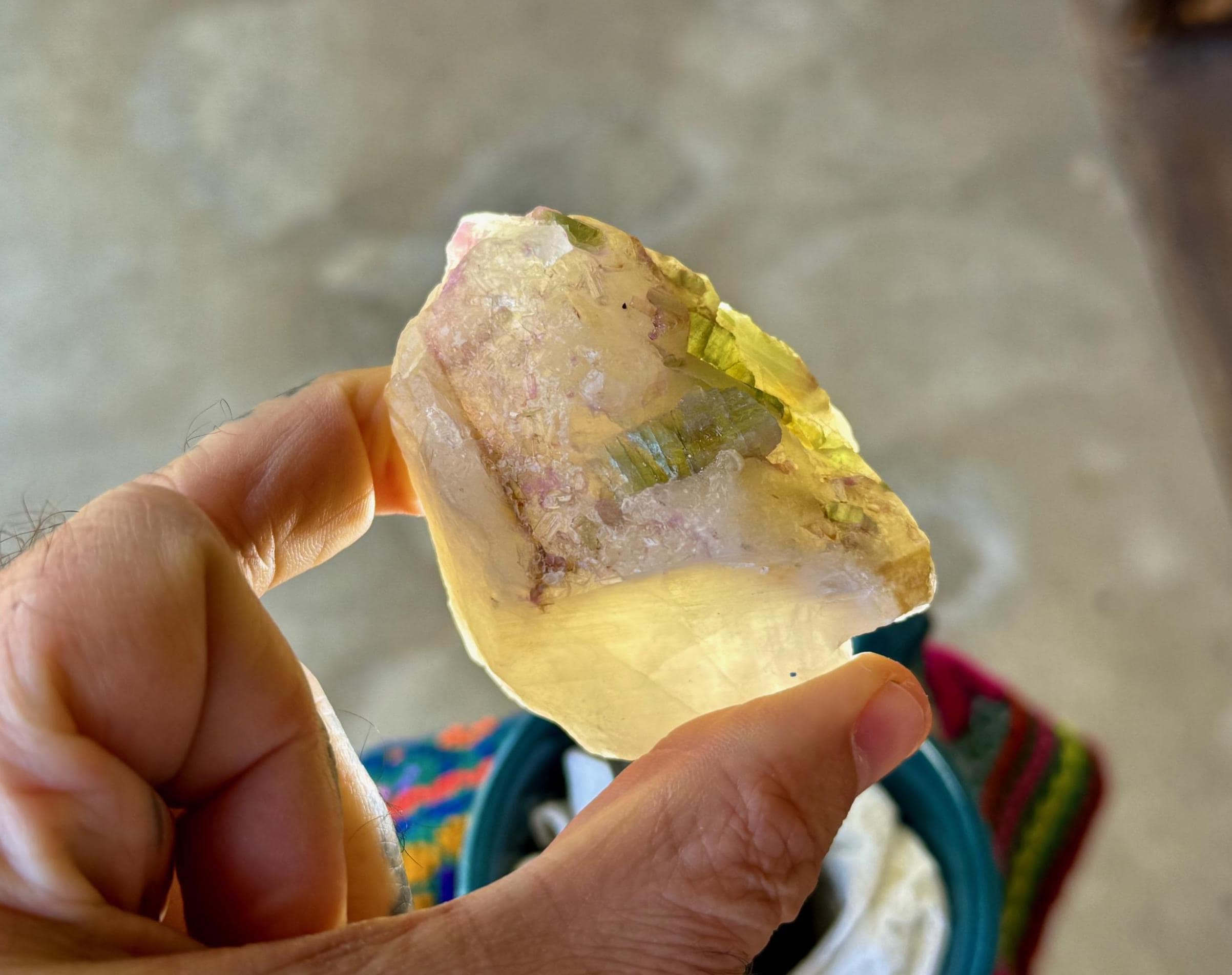 Vibrant inclusions of gemmy, pale Green Tourmaline are embedded throughout the exterior of this chunky Quartz crystal. When backlit, these inclusions glow beautifully with vivid color and translucency (Photos 3-5). We can also see some mild pink color, also from Tourmaline on the exterior.
