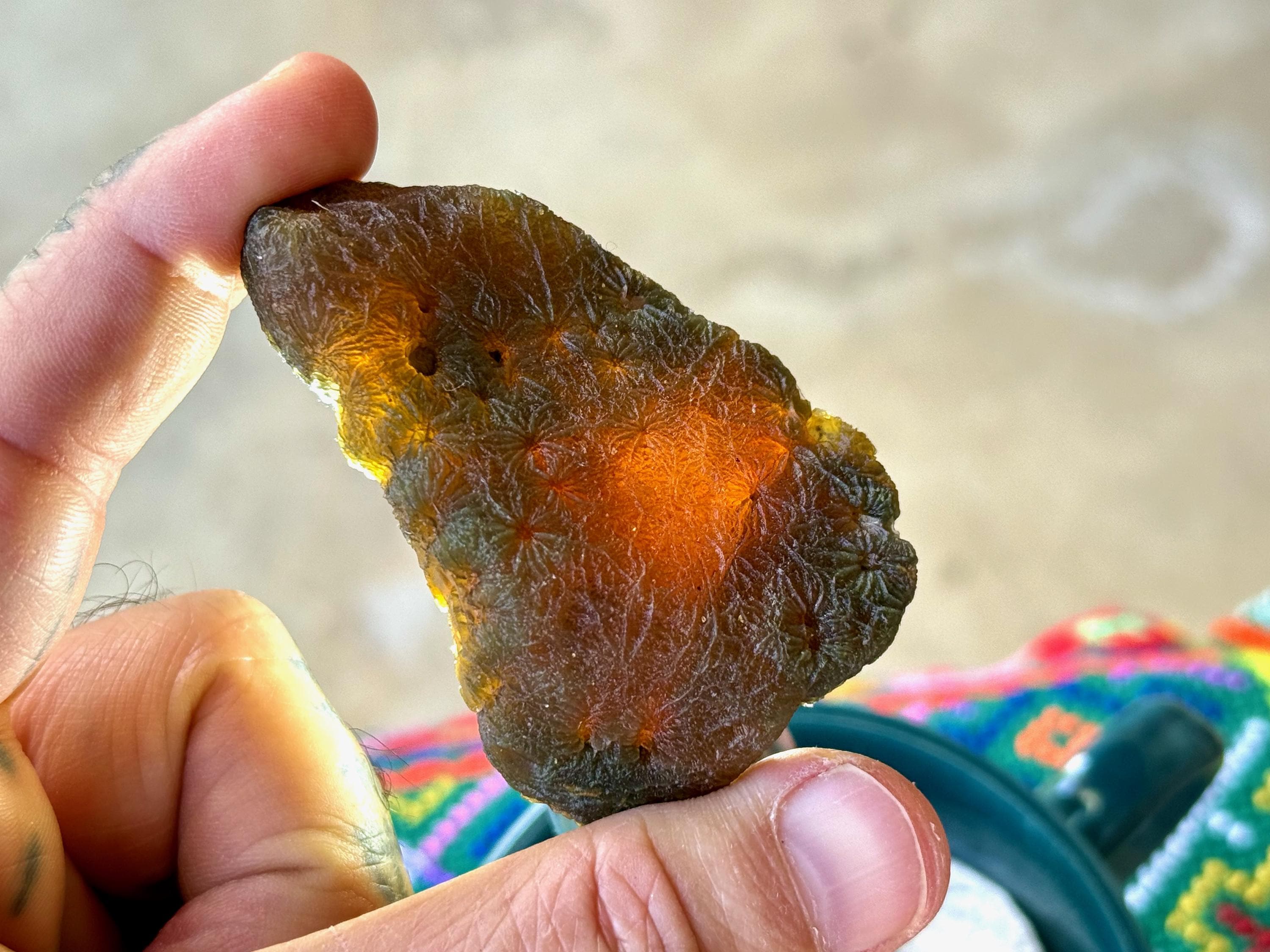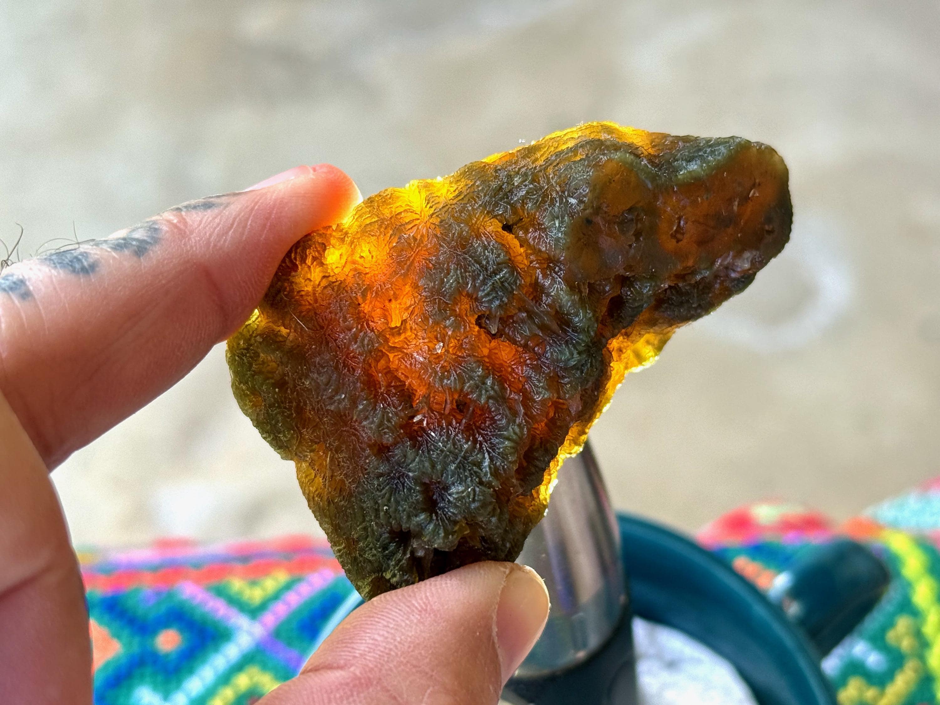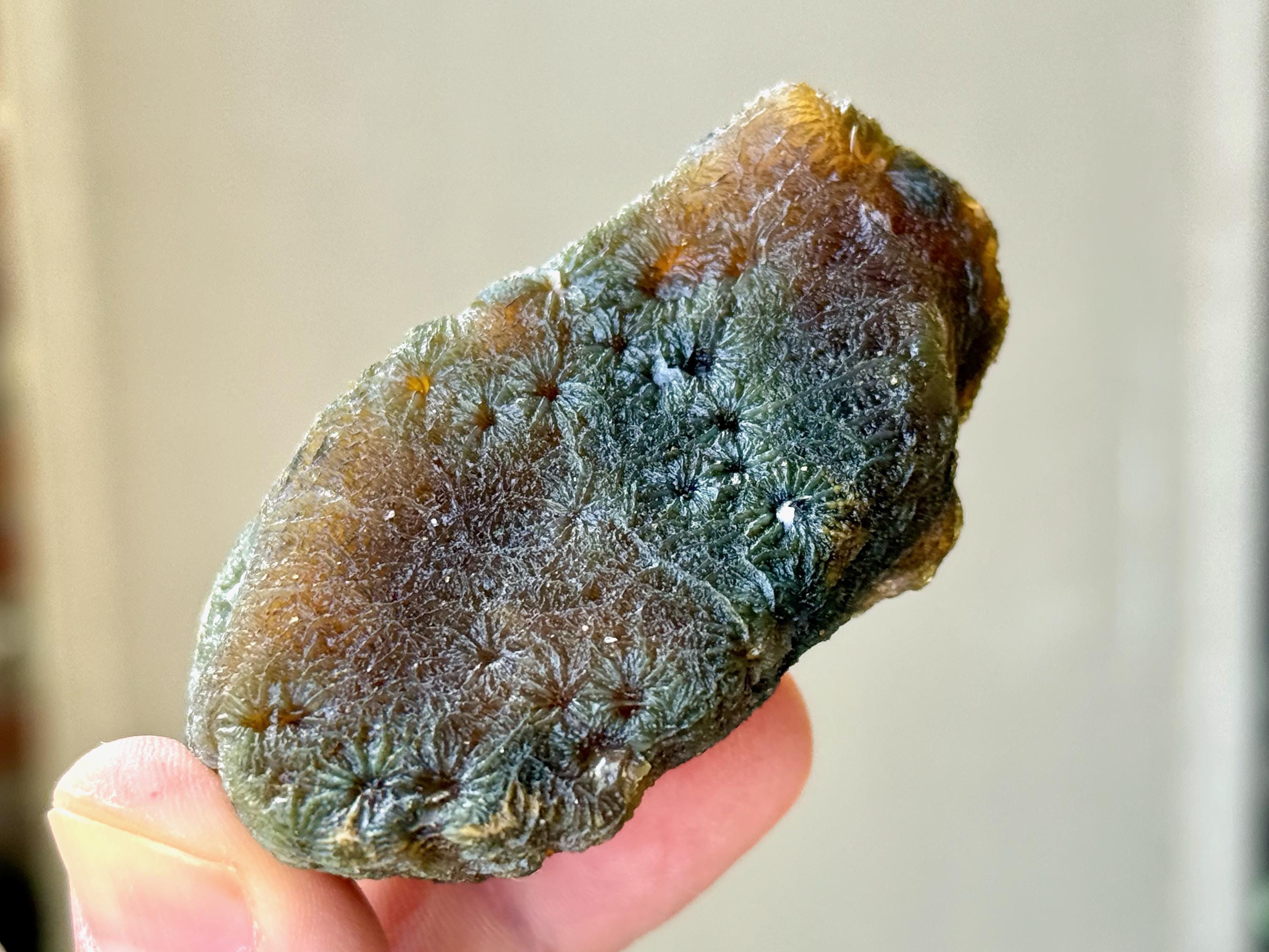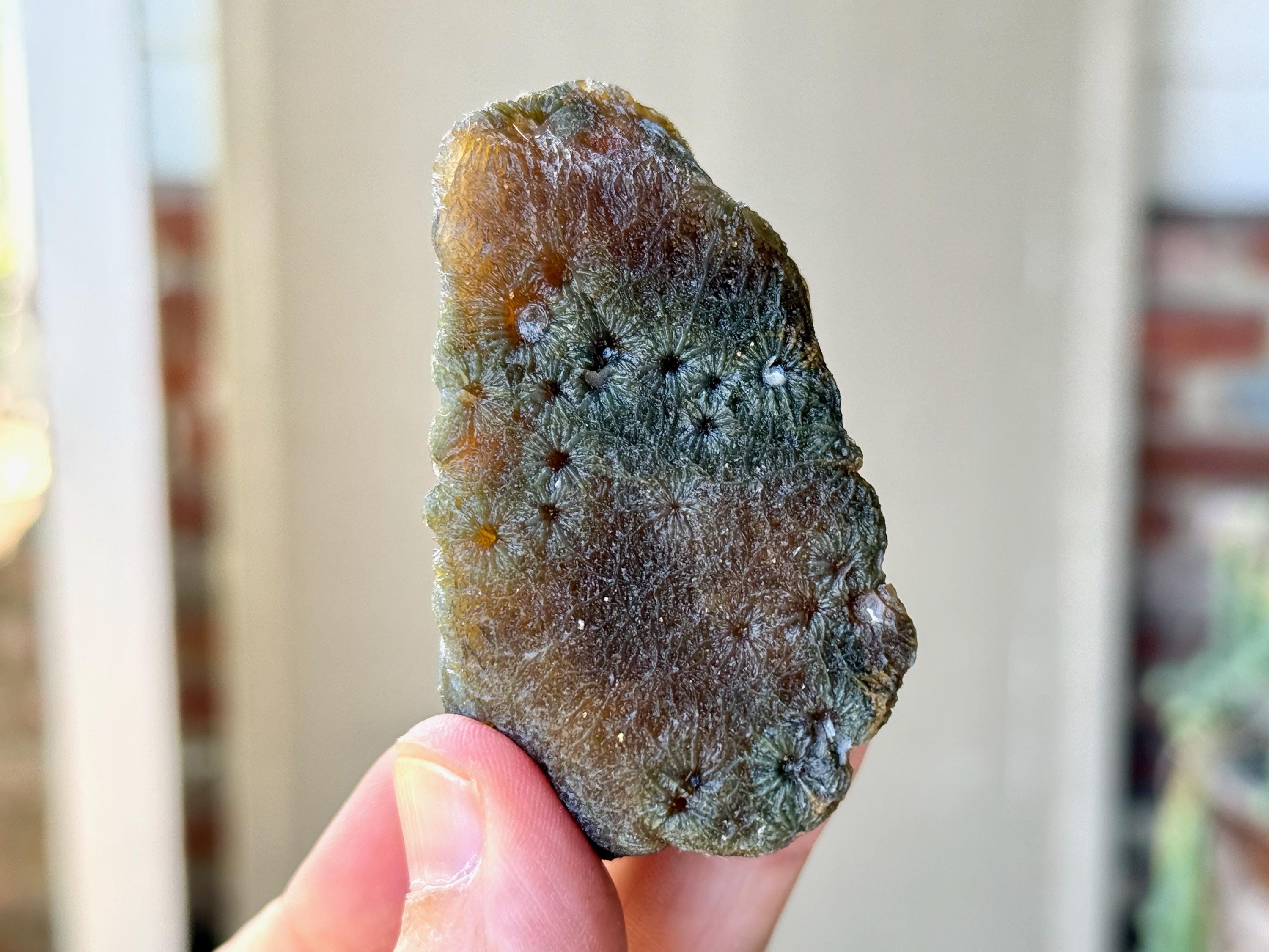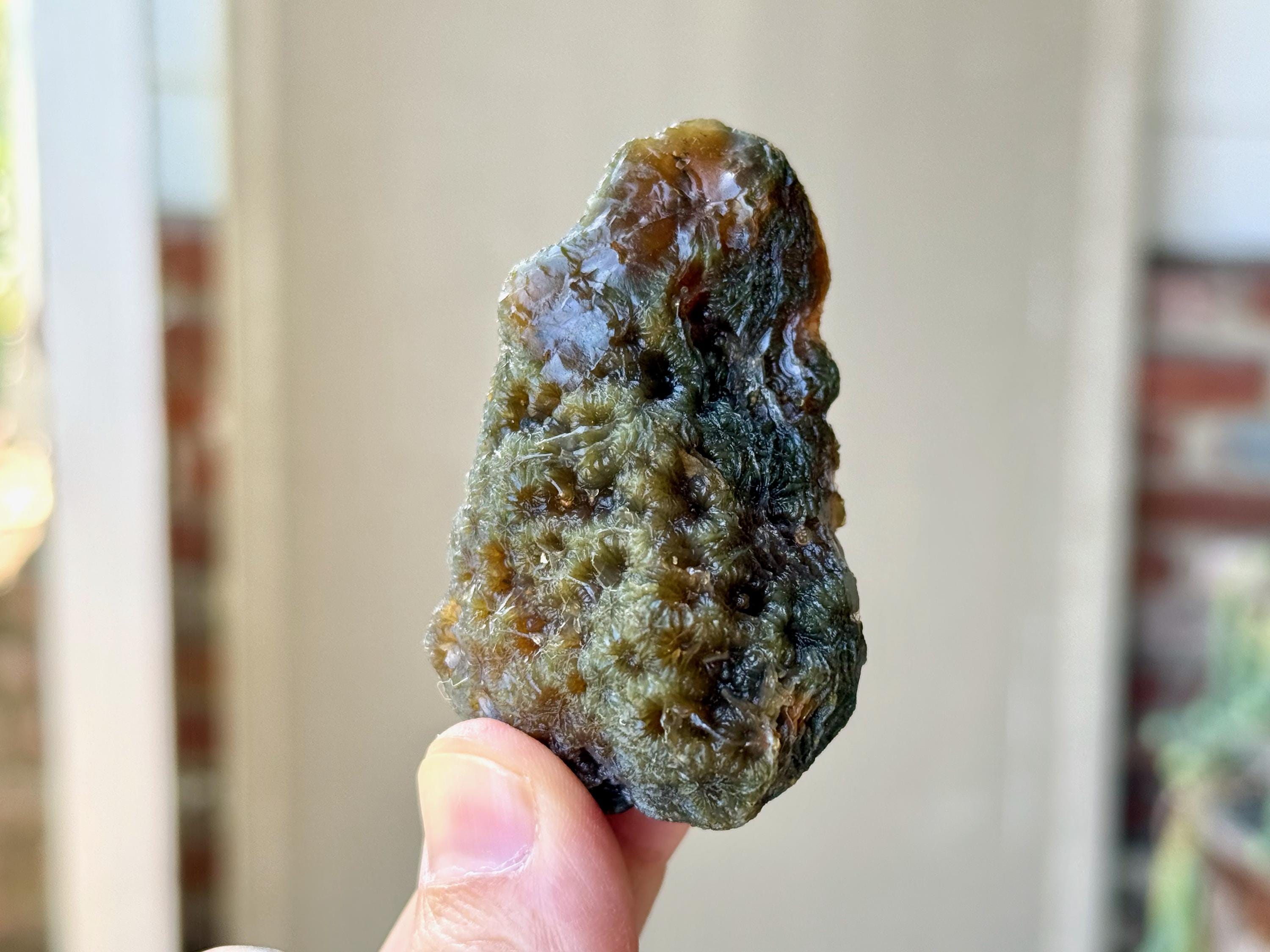In natural light, this Agate displays gorgeous colors of very dark greenish-black and golden brown marbled throughout. When backlit, as in Photos 3-5, we can see how well it passes light.