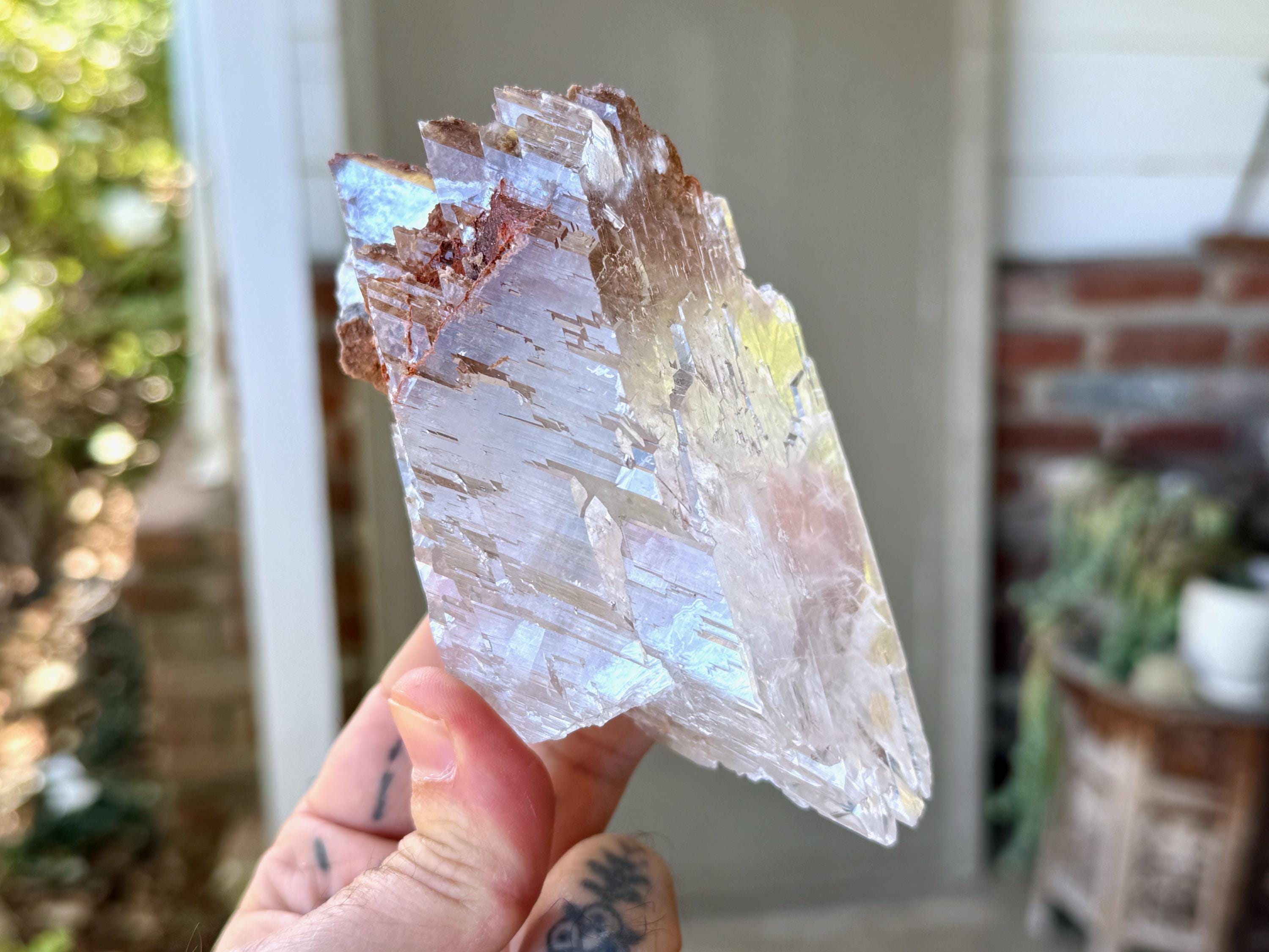 Magnificent luster and superb etched textures to this exquisite Bermejillo Selenite. This crystal features a broad formation with a fiery inclusion of reddish matrix at the top. The textures on the sides are really the star of the show here, and they glisten in the light beautifully (Photo 2).