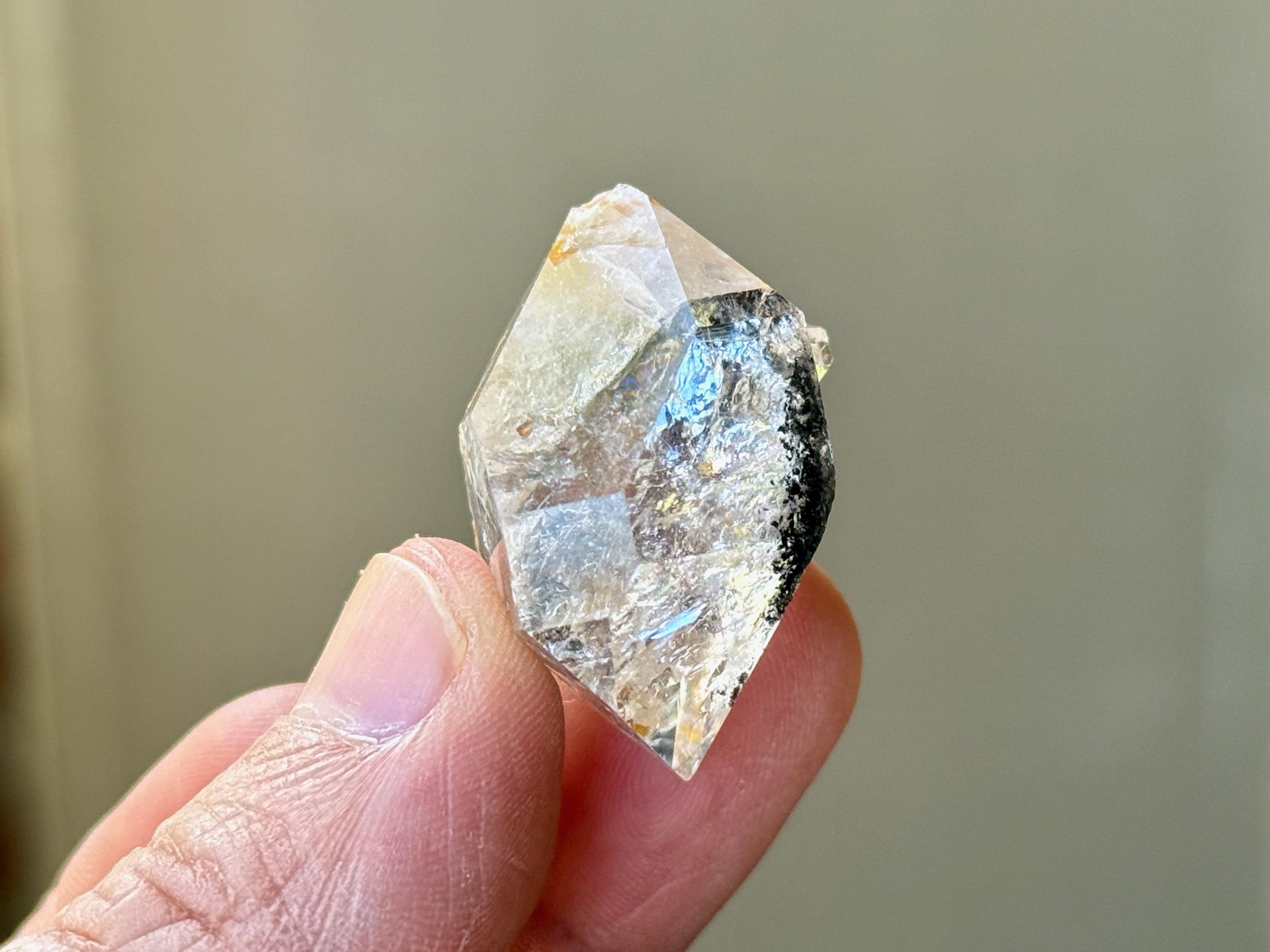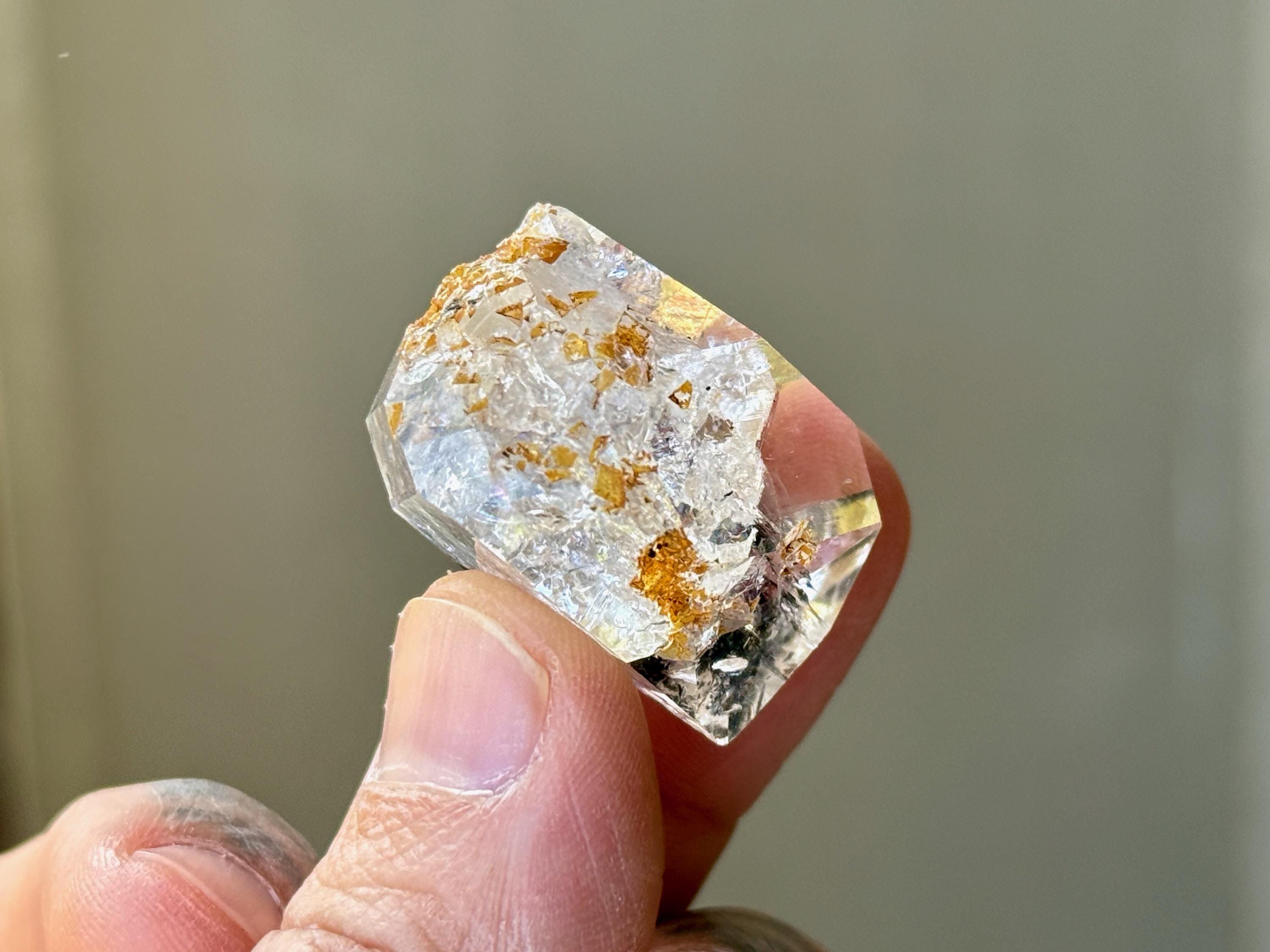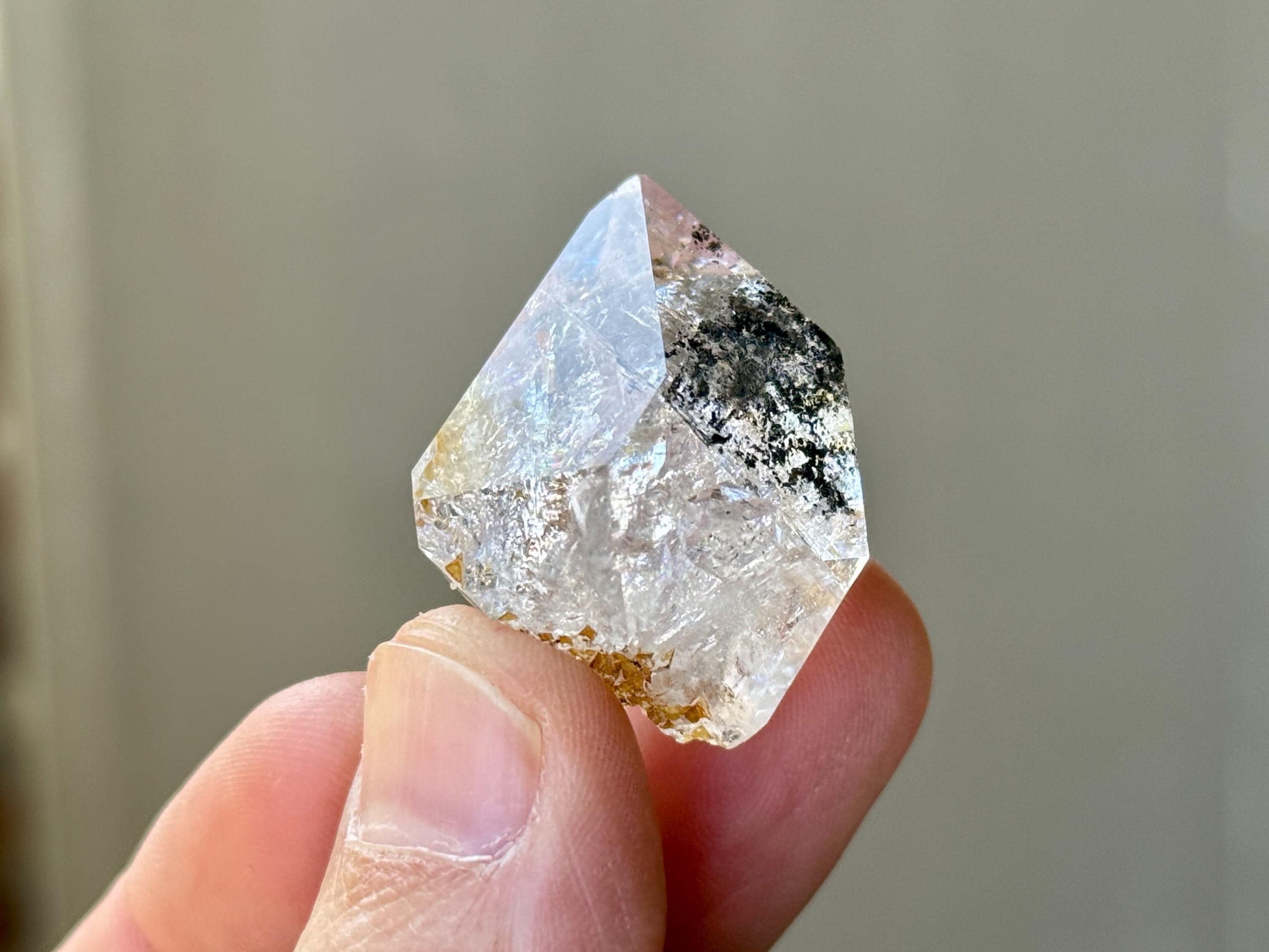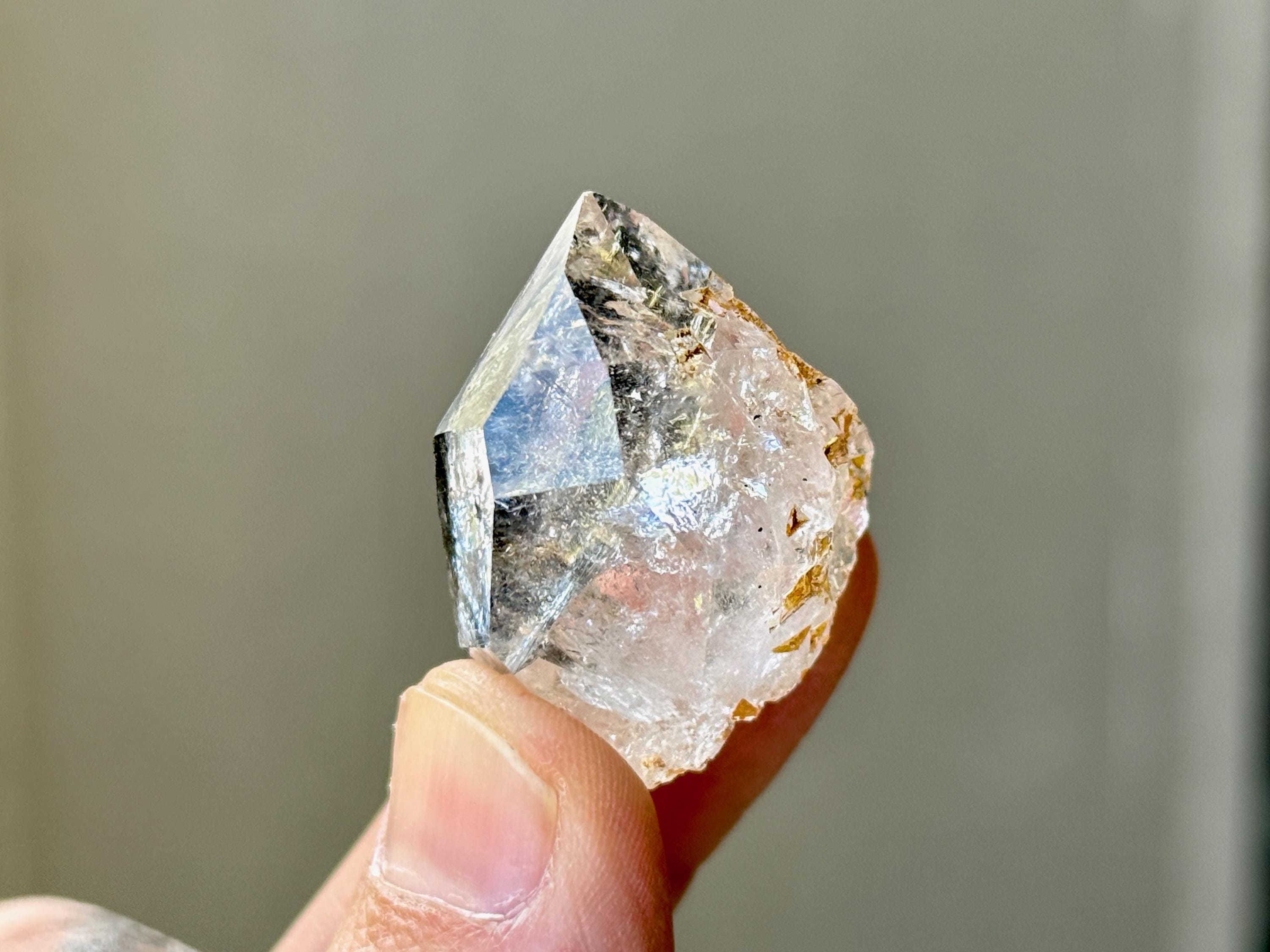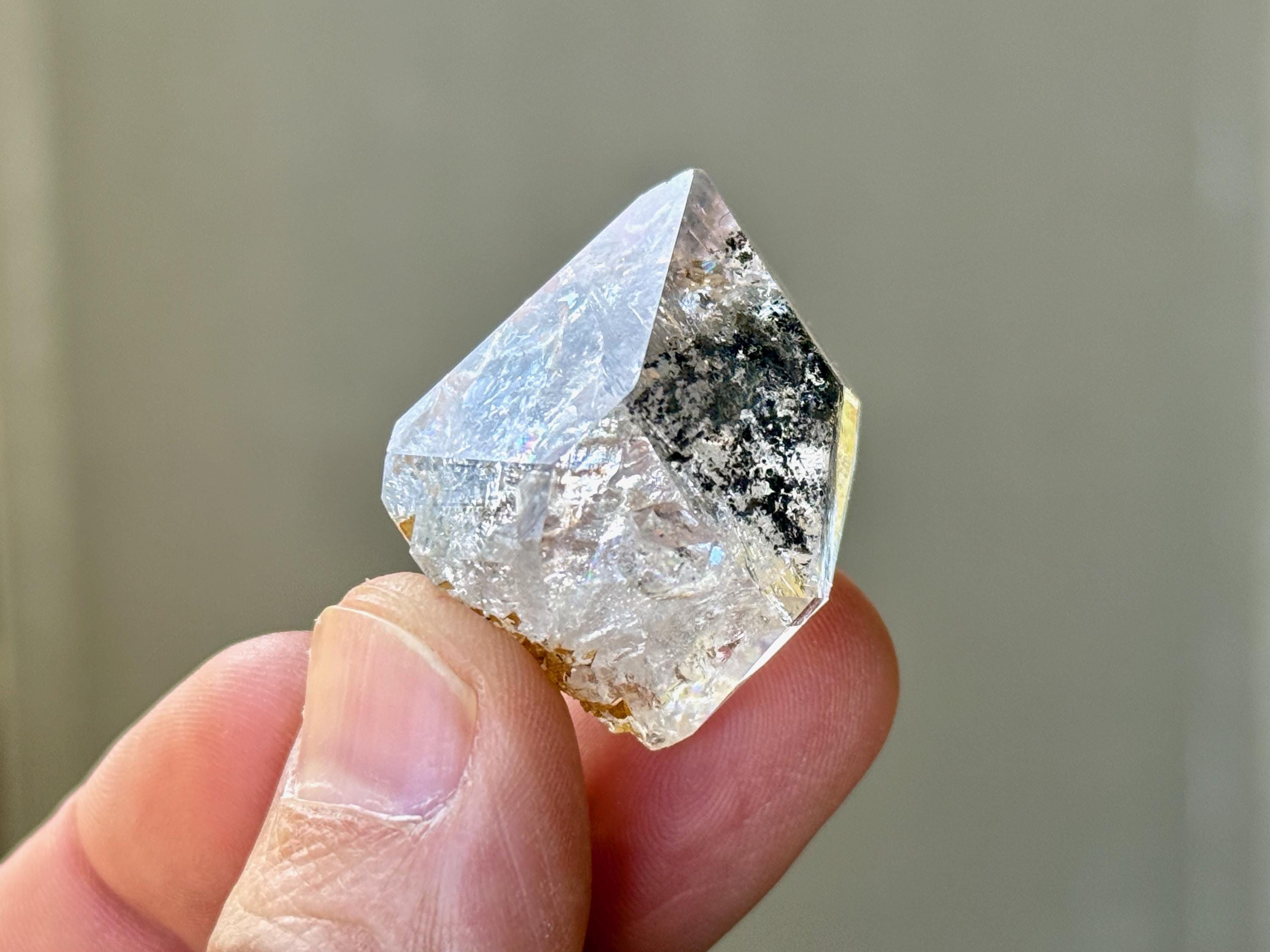 This exquisite Herkimer Diamond possesses water-clear clarity, brilliant luster and a classic "diamond" formation. The clarity allows us to peer inside and enjoy the crystalline formations within, as well as the inclusions of black Anthraxolite and golden Hematite. The black inclusions give this piece a "Yin Yang" effect that is lovely.