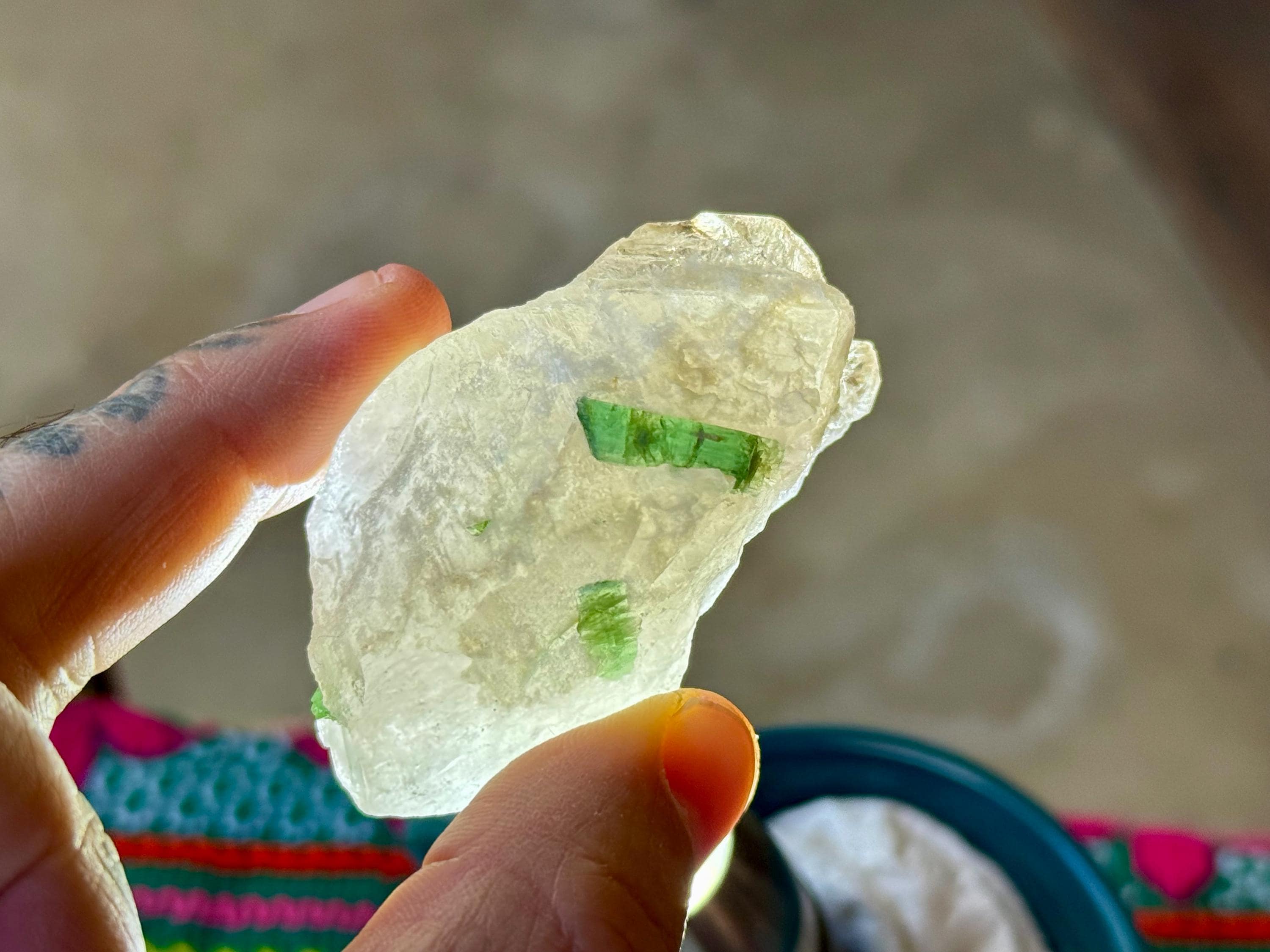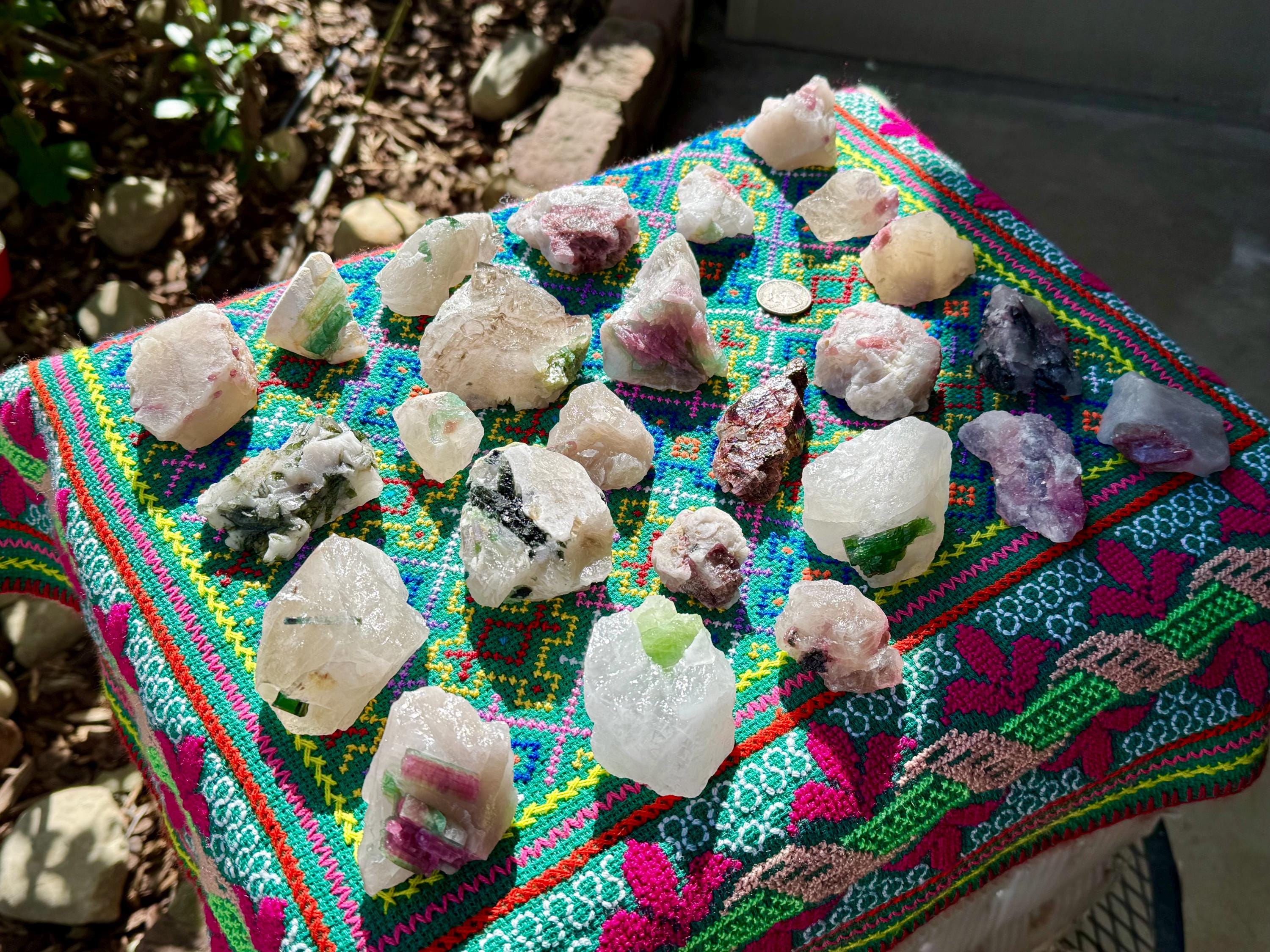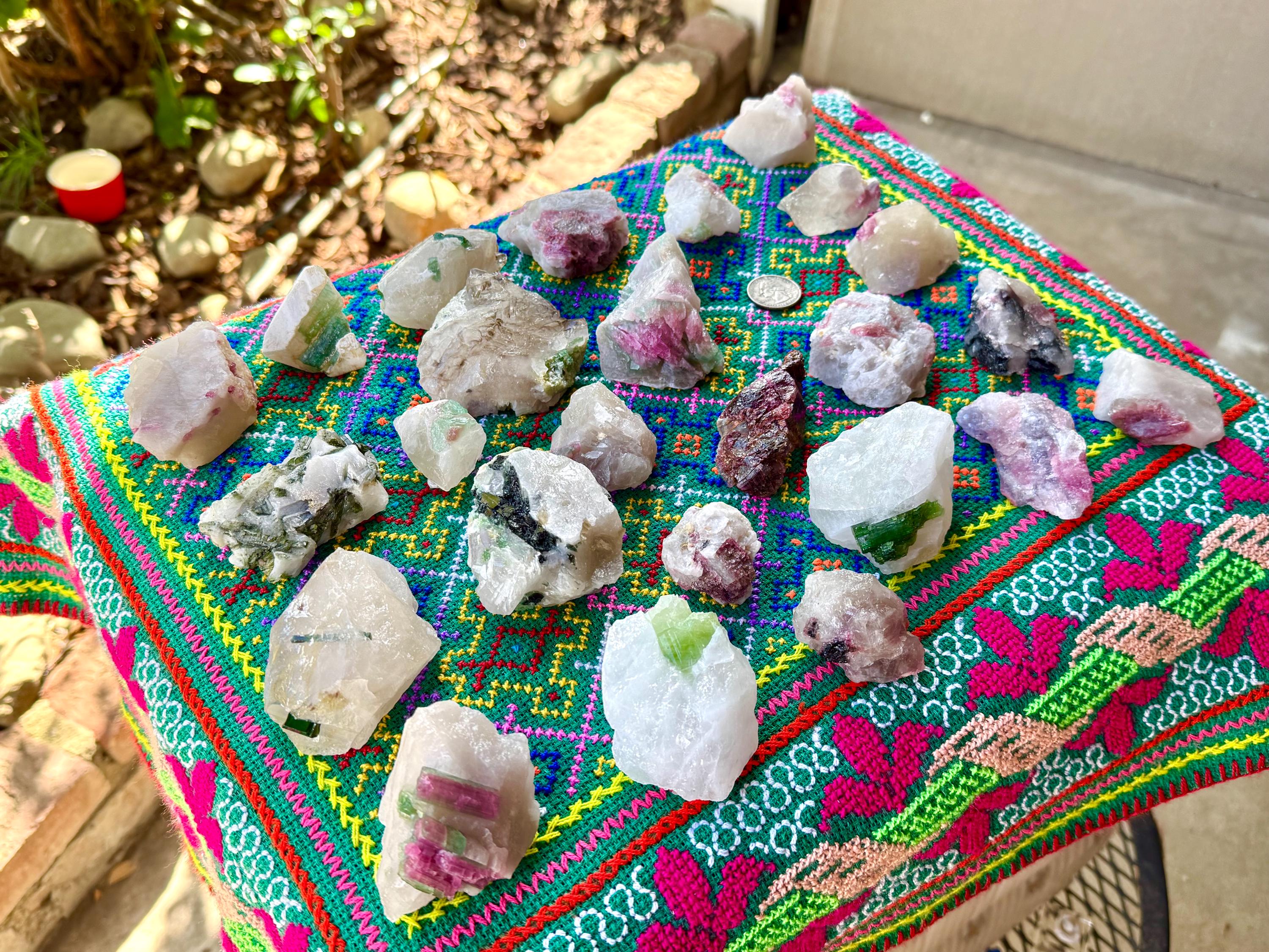 A magnificent lot of mixed Unicorn Stone Quartz crystals with a variety of colorful inclusions. These crystals are rather large in size and most possess the dense and milky kind of Quartz that is characteristic of this region. Each possesses some inclusion of either Green Tourmaline, Pink Tourmaline or Lepidolite.