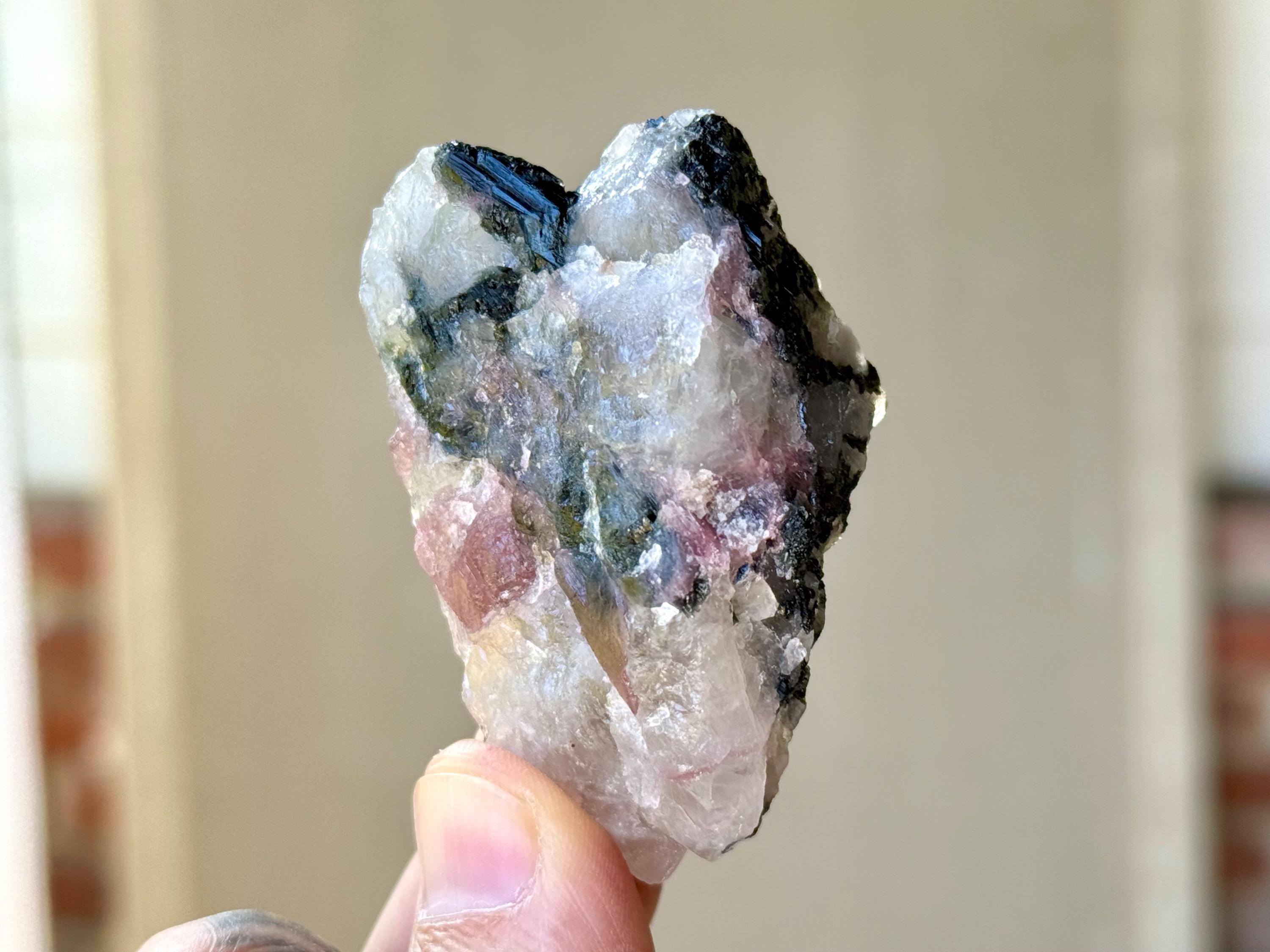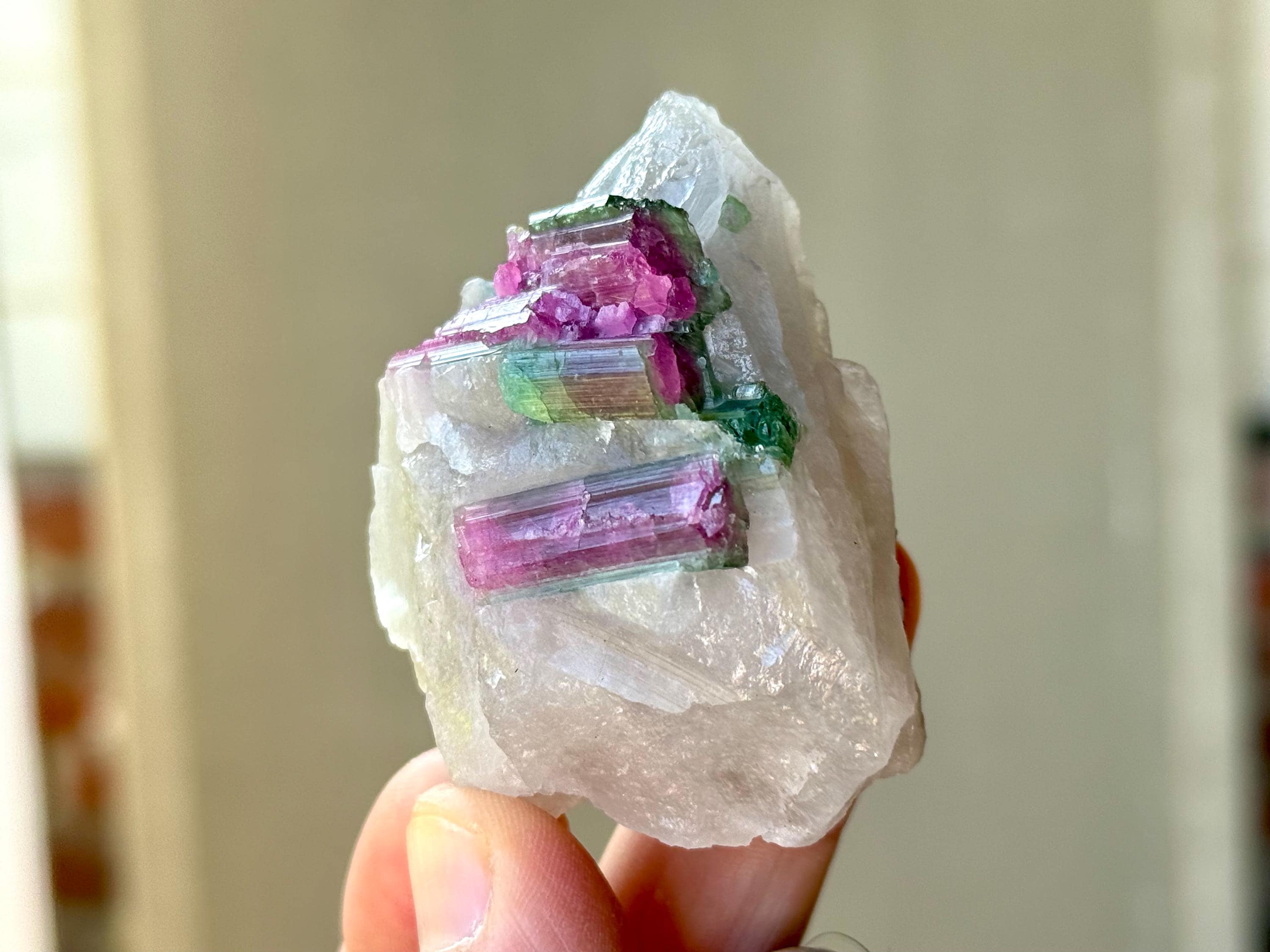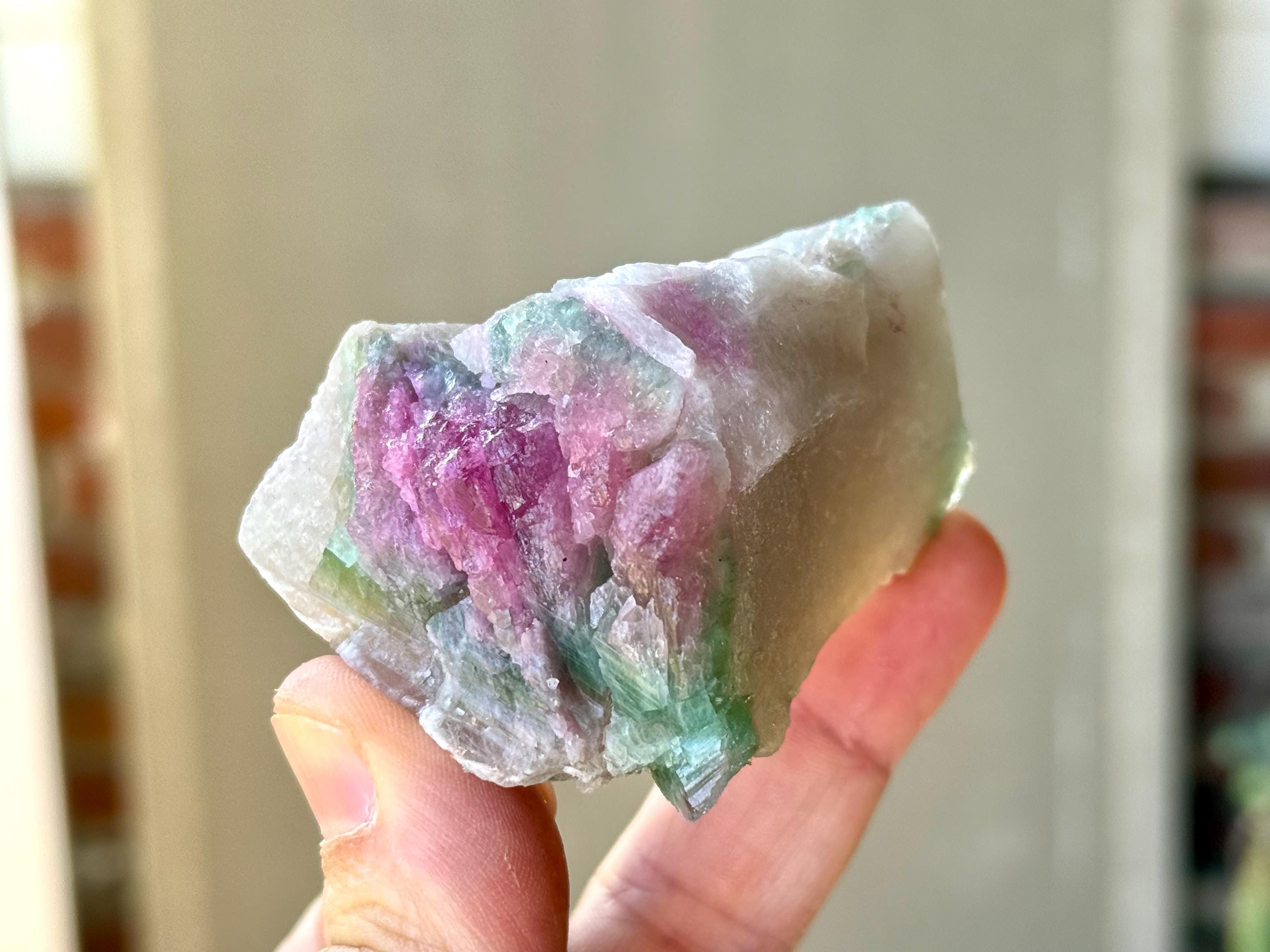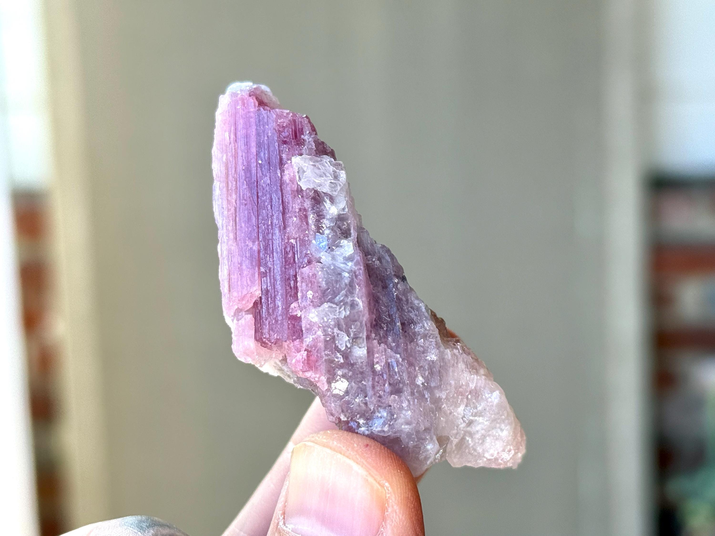 The crystals from this find include unique combinations of Quartz, Lepidolite, Albite, Cleavelandite and Feldspar, with vividly colored Tourmalines in lovely hues of green, pink, purple and blue. Crystals with combinations of these minerals are sometimes referred to as "Unicorn Stones."