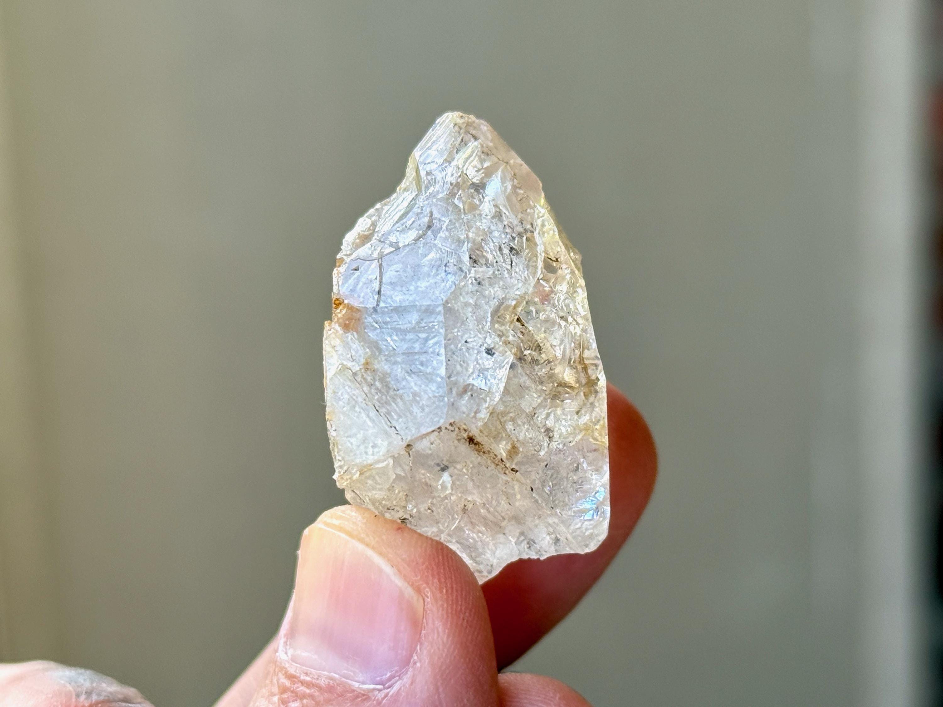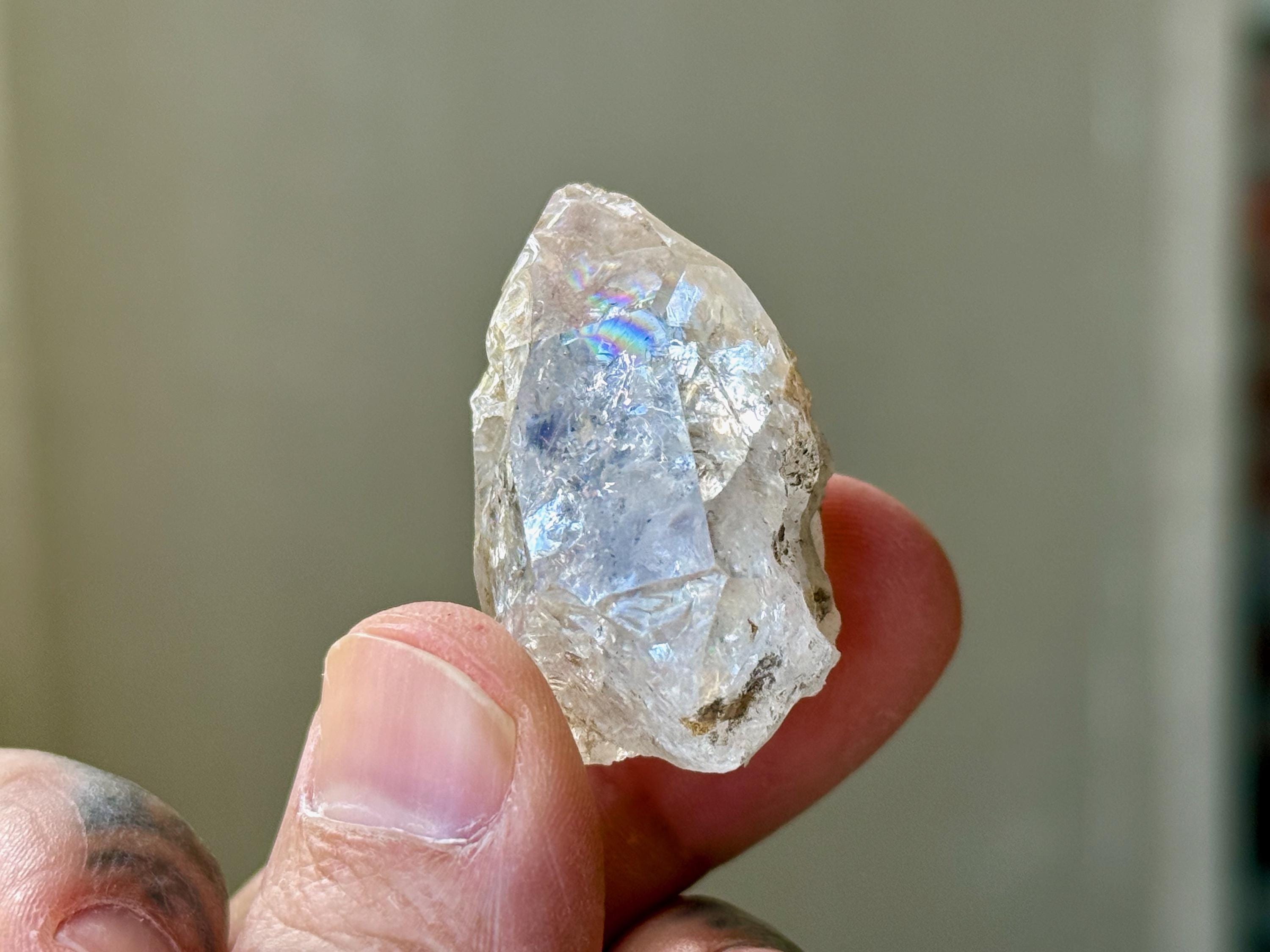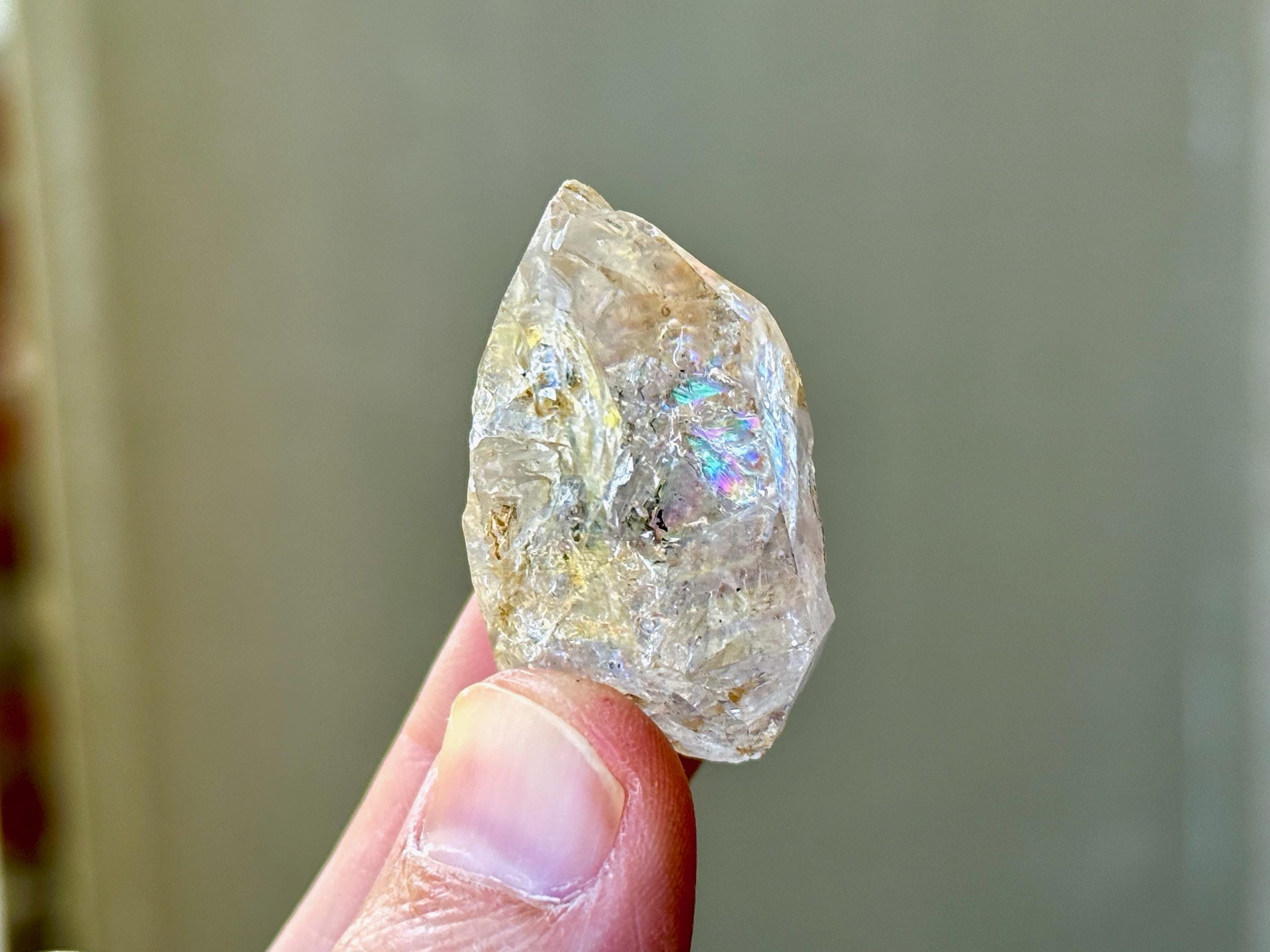 Brilliant, light-bearing luster to this elegant Herkimer Diamond. This crystal just seems to emanate light, and this is partially due to the wonderful array of foil-like, crystalline formations within. We can also see a beautiful rainbow here in Photos 2-3.