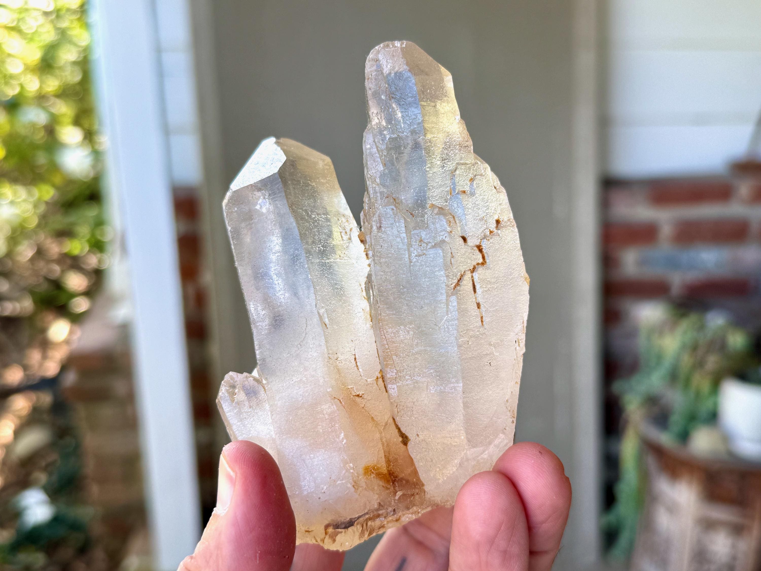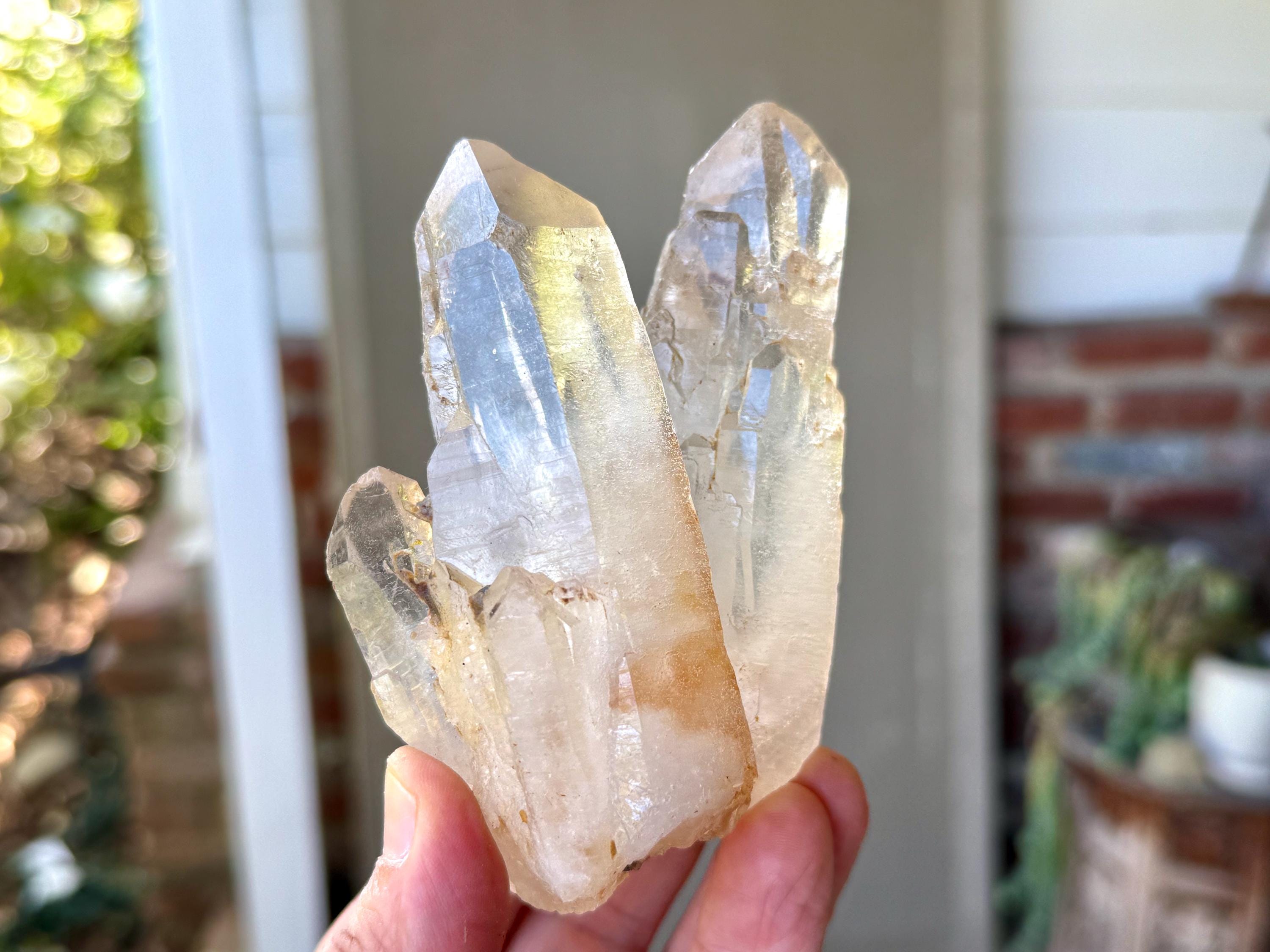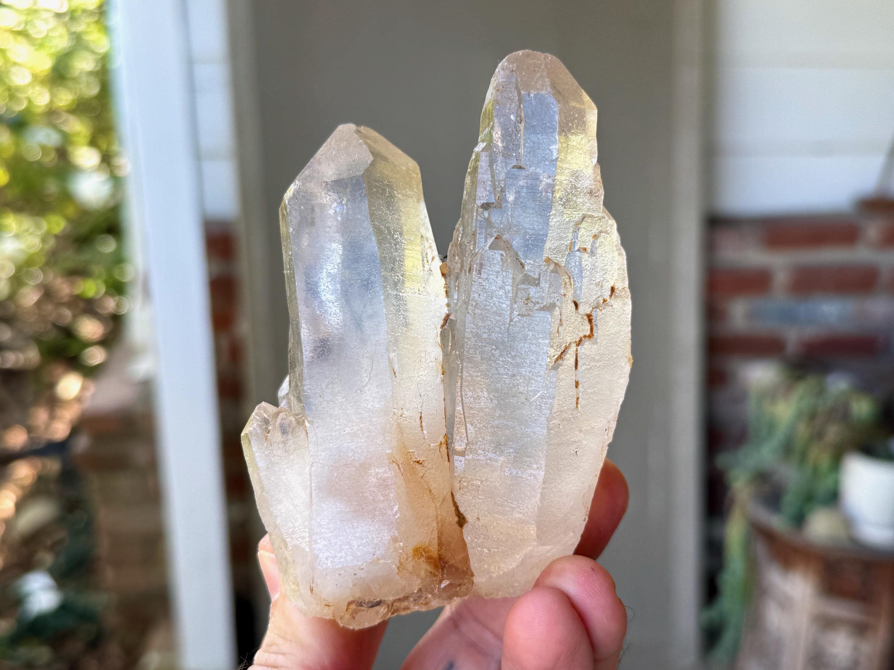 Magnificent clarity and brilliant luster to this superb Cathedral Quartz crystal with beautiful textures and a *very* mild tinge of golden hue. This crystal is a very aesthetic Tantric Twin formation, with two large primary crystals next to one another. This could also be considered a "Twin Flame" formation, as they are in a bit of a "V" formation.