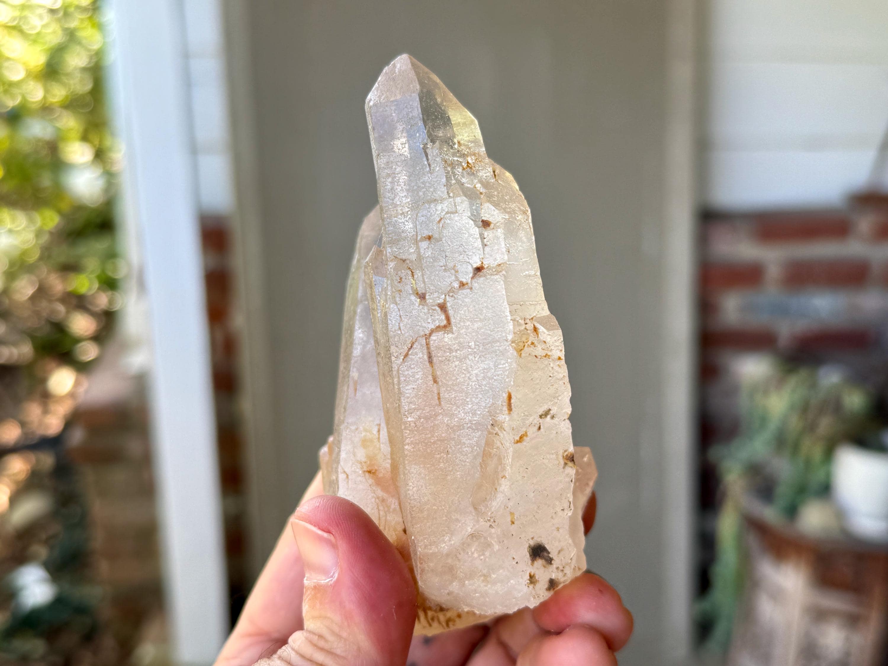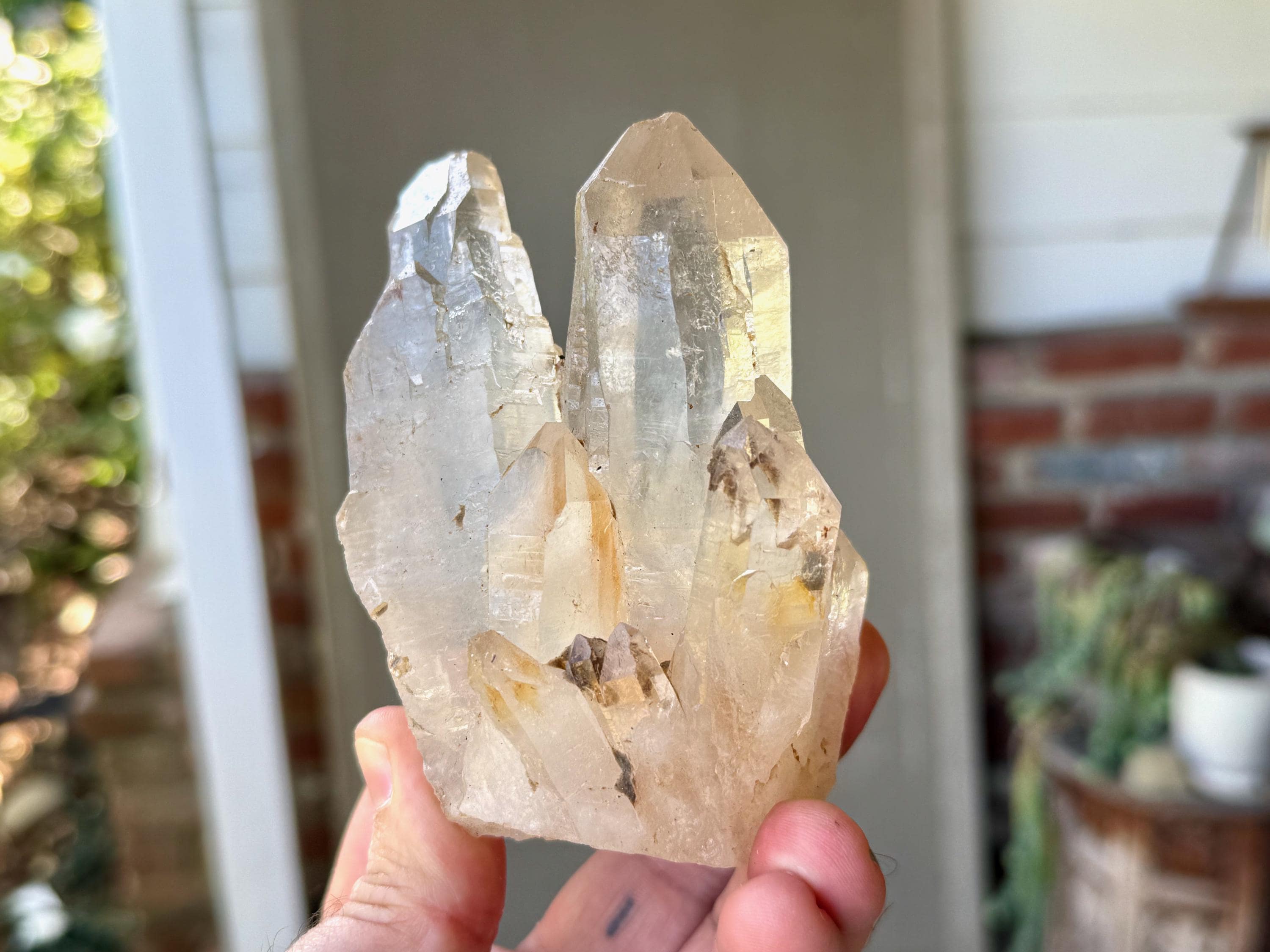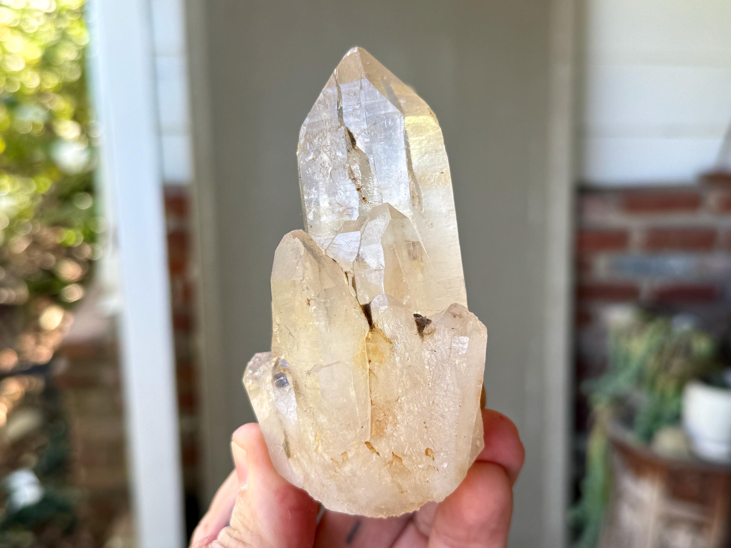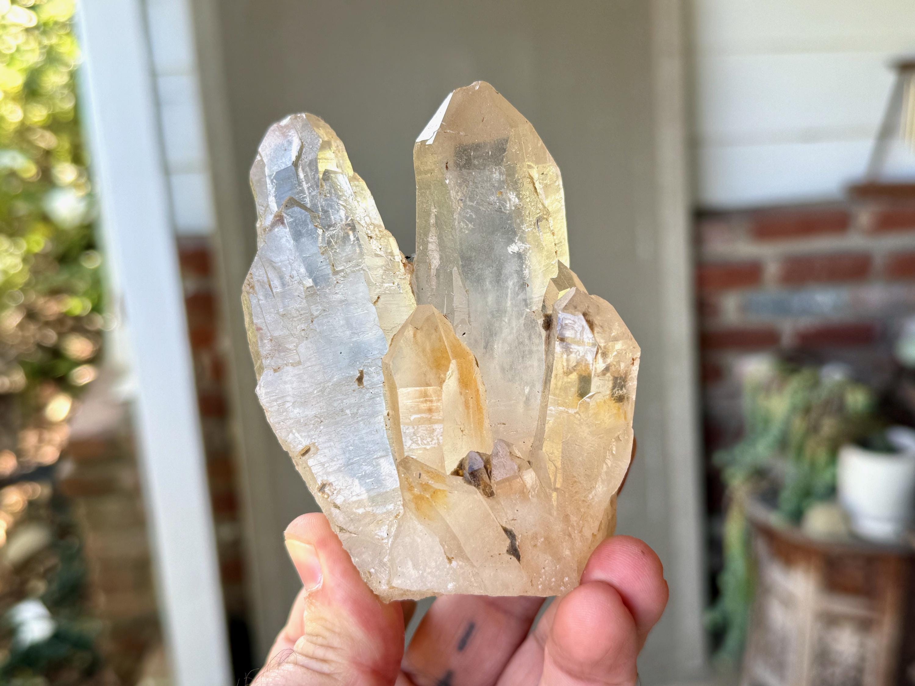 Magnificent clarity and brilliant luster to this superb Cathedral Quartz crystal with beautiful textures and a *very* mild tinge of golden hue. This crystal is a very aesthetic Tantric Twin formation, with two large primary crystals next to one another. This could also be considered a "Twin Flame" formation, as they are in a bit of a "V" formation.