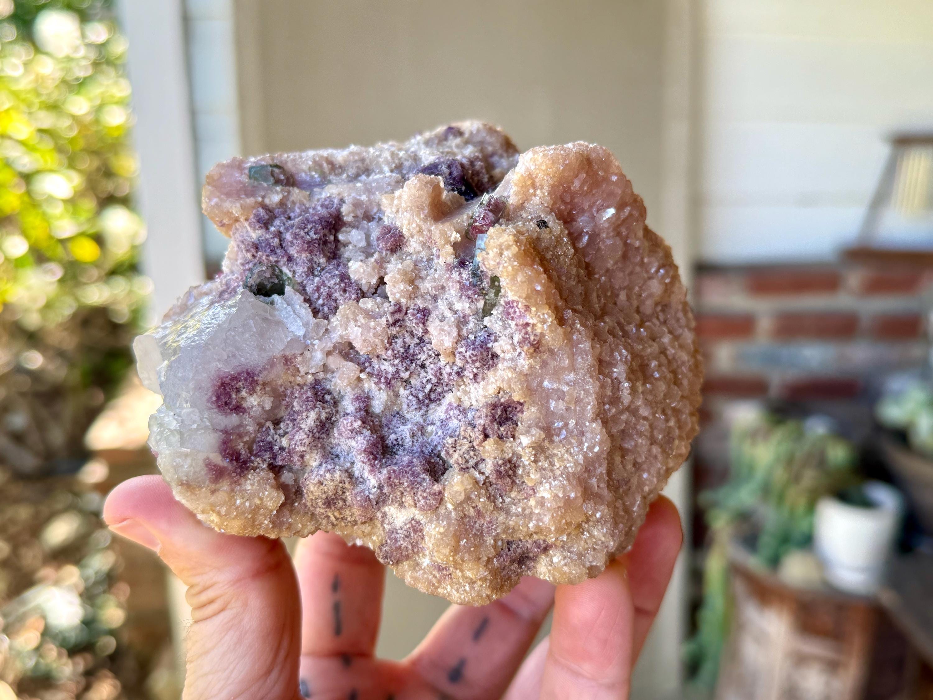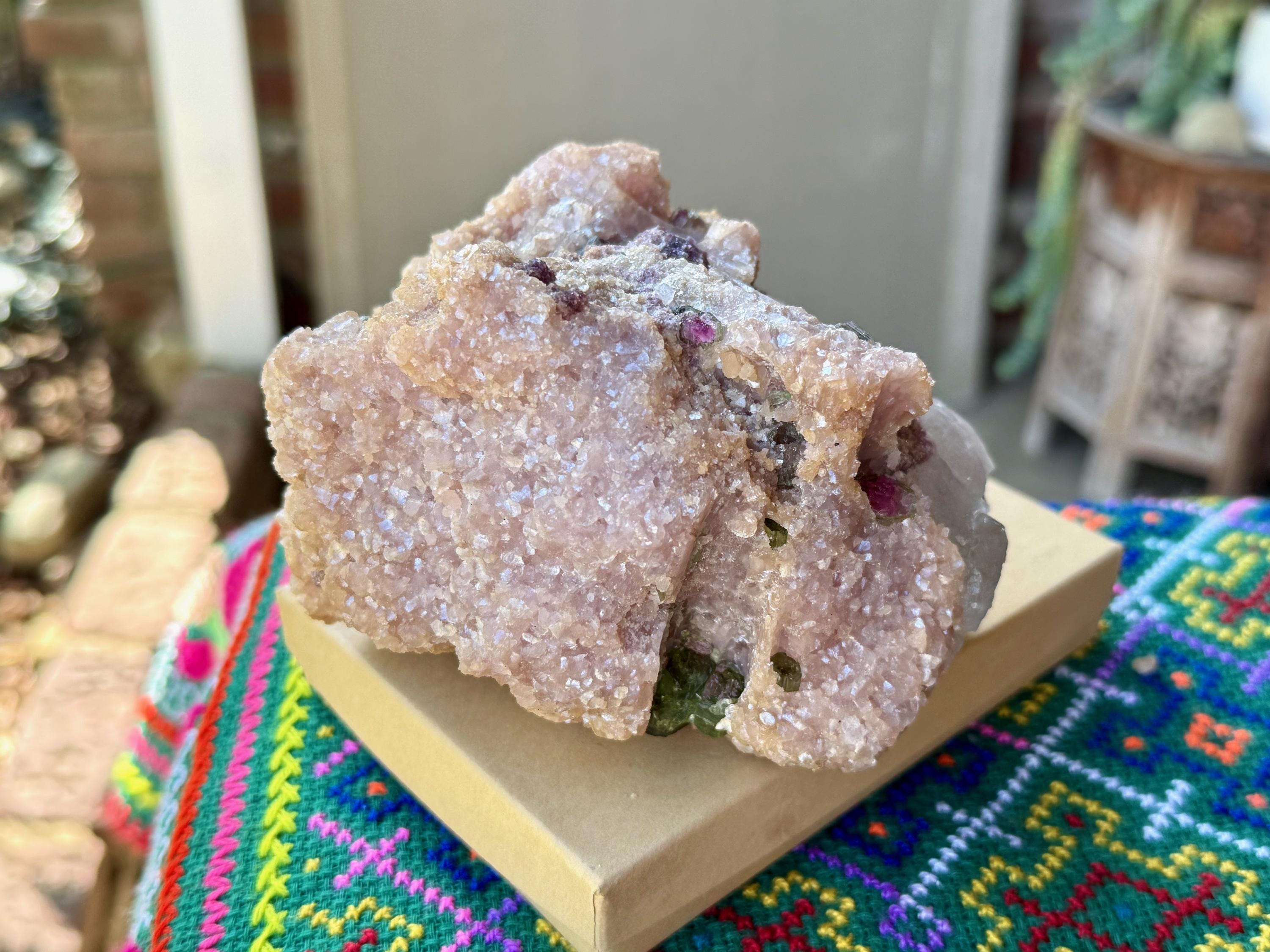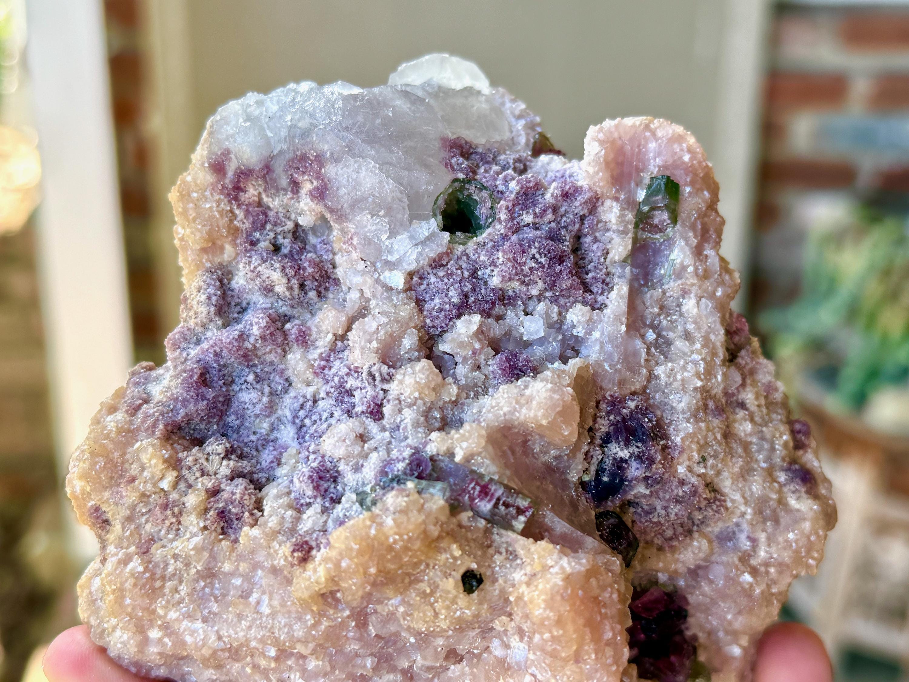A dazzling combination of colors and textures to this exceptional Unicorn Stone! This crystal features a primary matrix of Golden Mica with lots of speckled sparkle to it. Embedded within we can see Quartz, Purple Lepidolite and some very colorful Tourmalines.