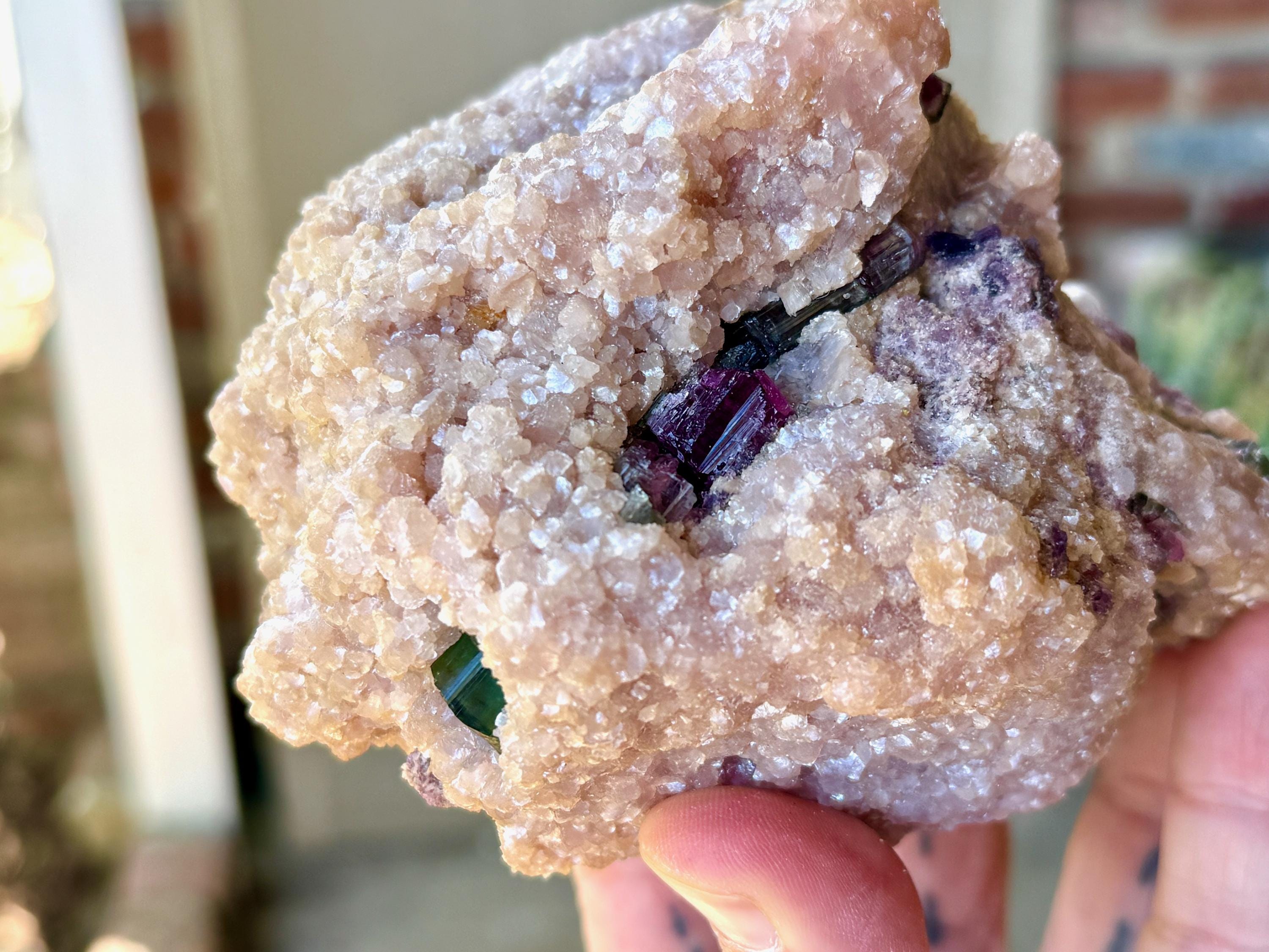This magnificent Unicorn Stone with Bicolor Tourmaline, Lepidolite and Golden Mica comes from a recent find in Coronel Murta, Minas Gerais, Brazil.