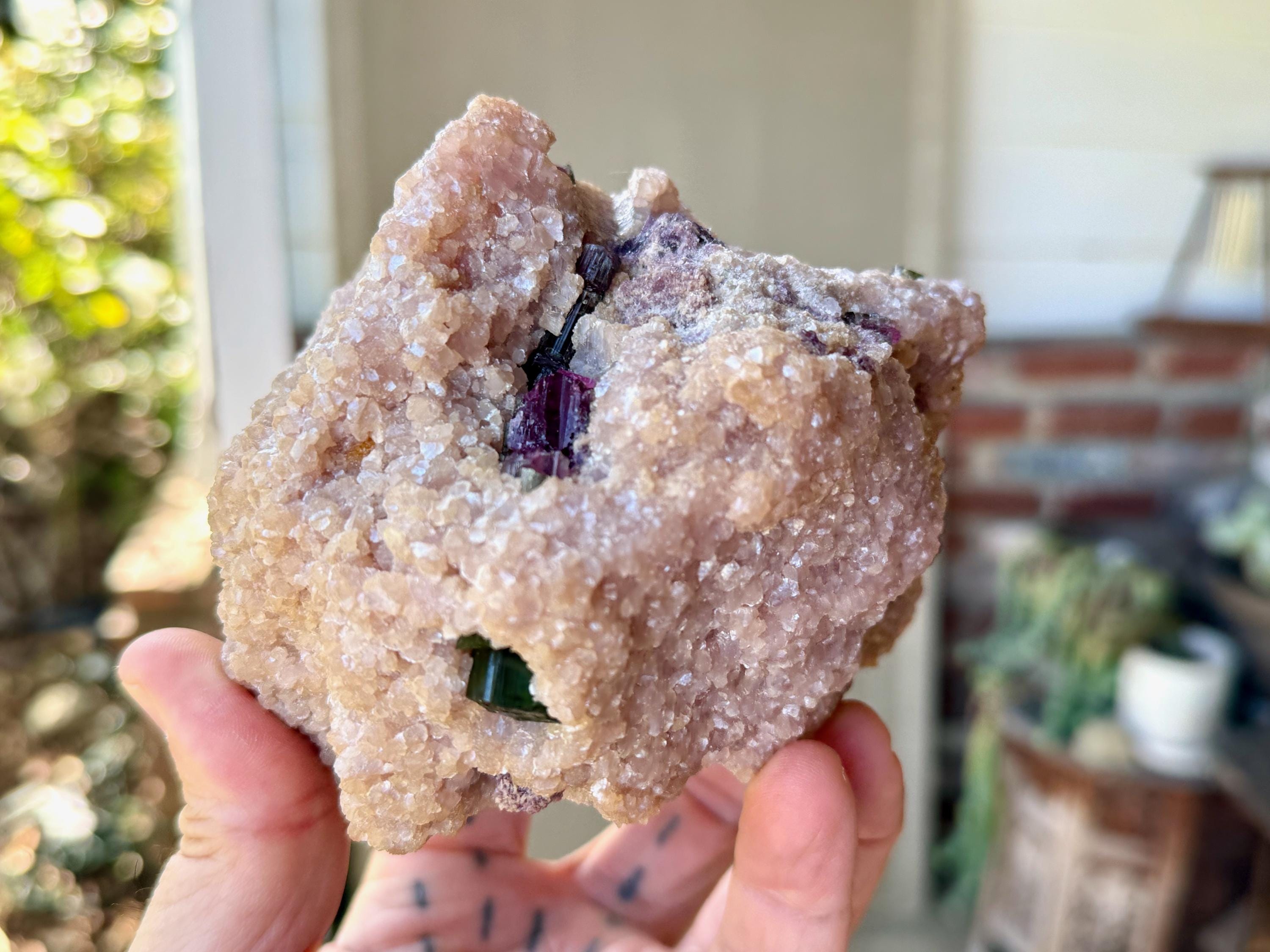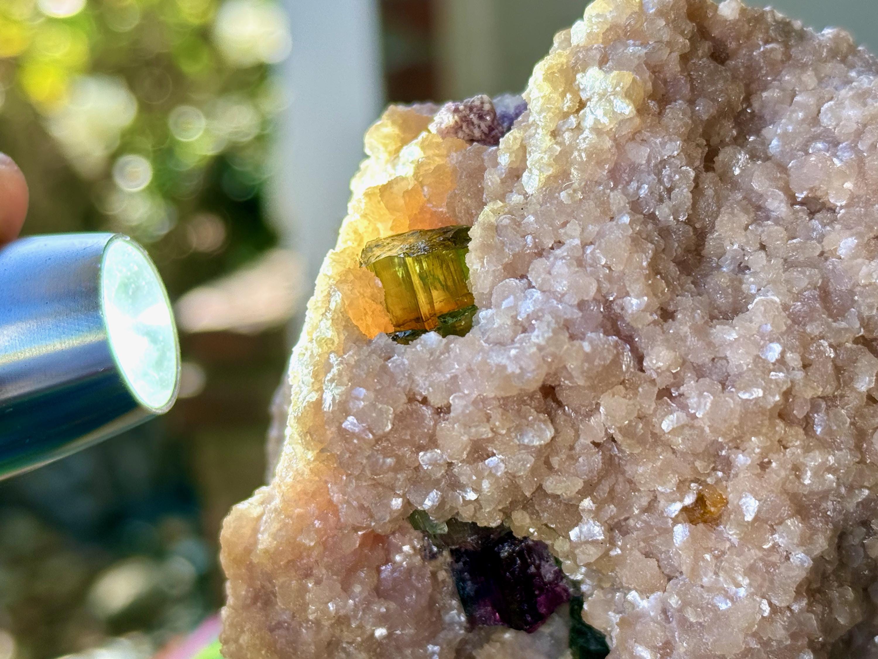 There are several small Tourmaline crystals included here, but one in particular is very large and lustrous. It is bicolor with a juicy pink interior (exposed quite a bit) and a dark green "skin." It's a little hard to backlight due to where it is in the crystal, but a direct light on it will show off its vibrant color (Photos 3-5).