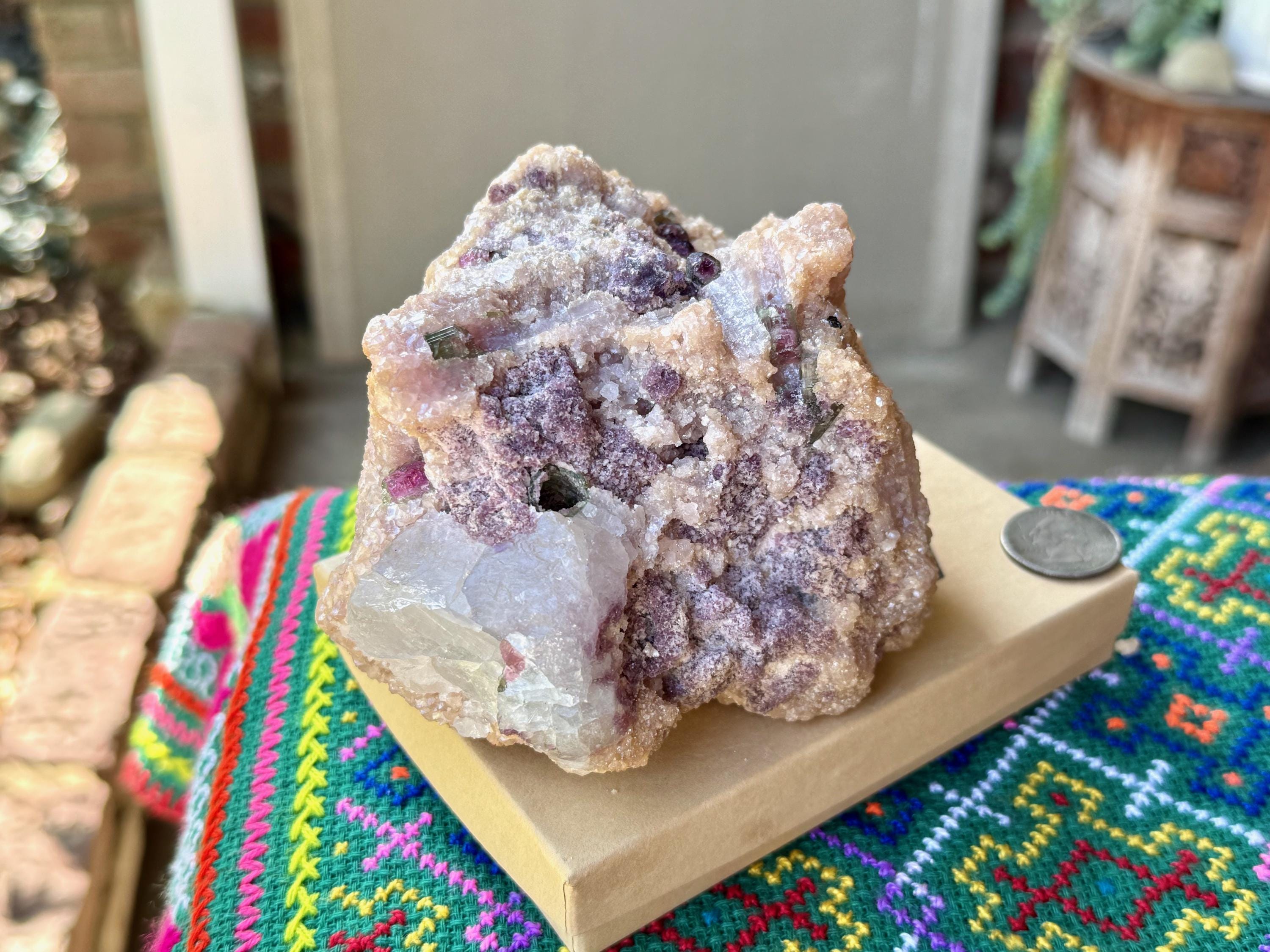 The crystals from this find include unique combinations of Quartz, Lepidolite, Albite, Cleavelandite and Feldspar, with vividly colored Tourmalines in lovely hues of green, pink, purple and blue. This combination of minerals is sometimes known as "Unicorn Stone."