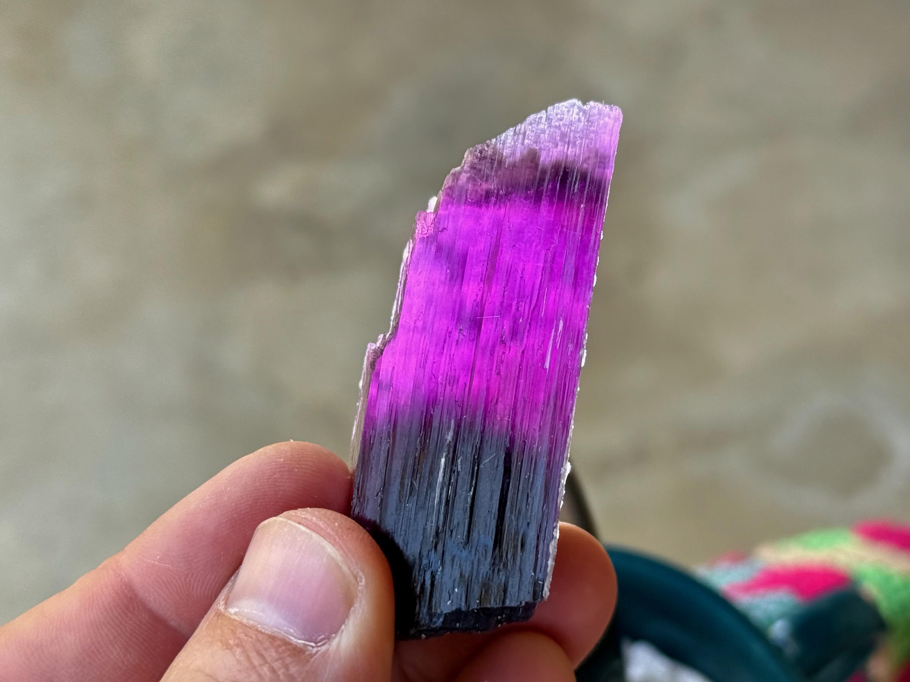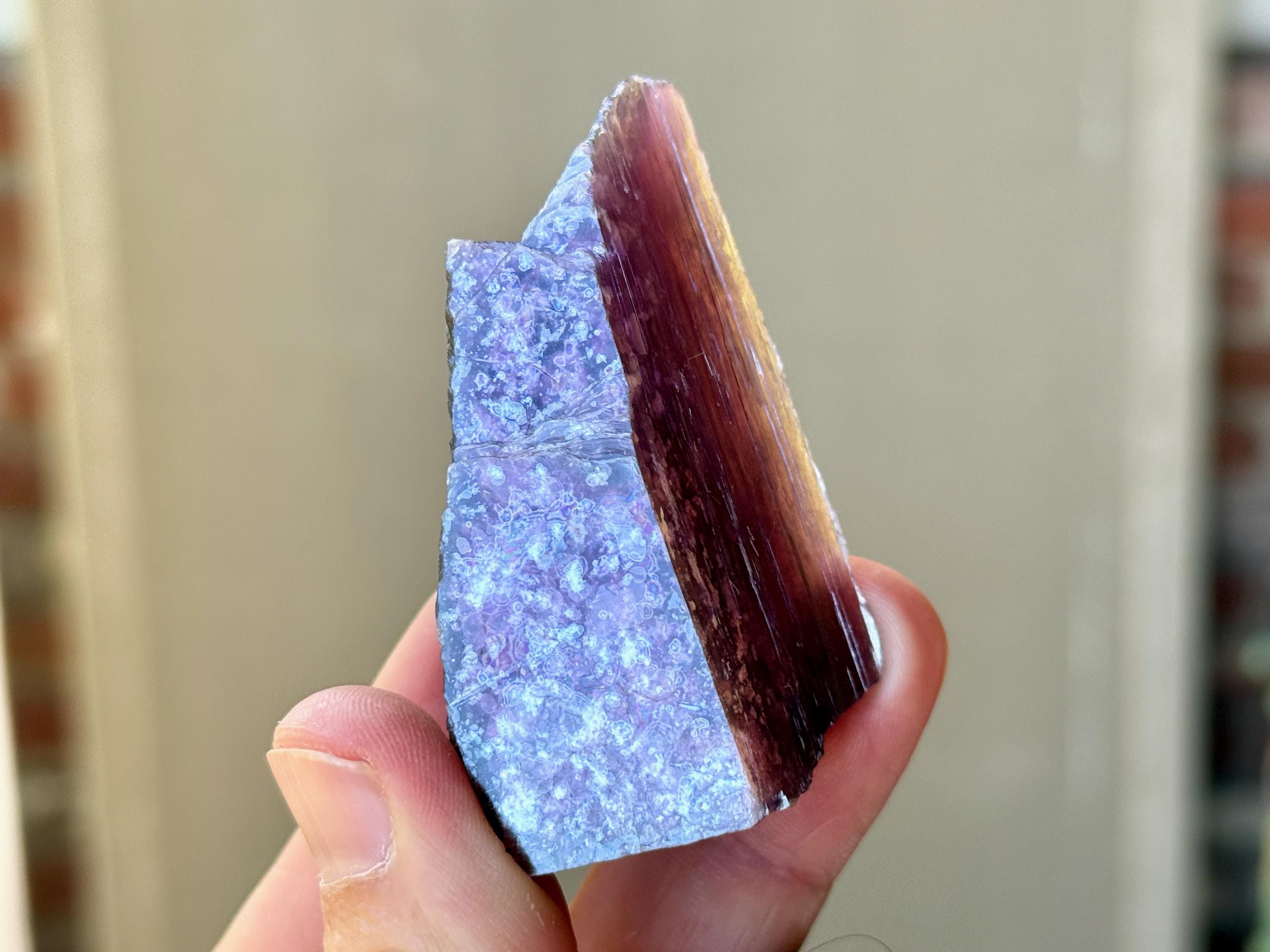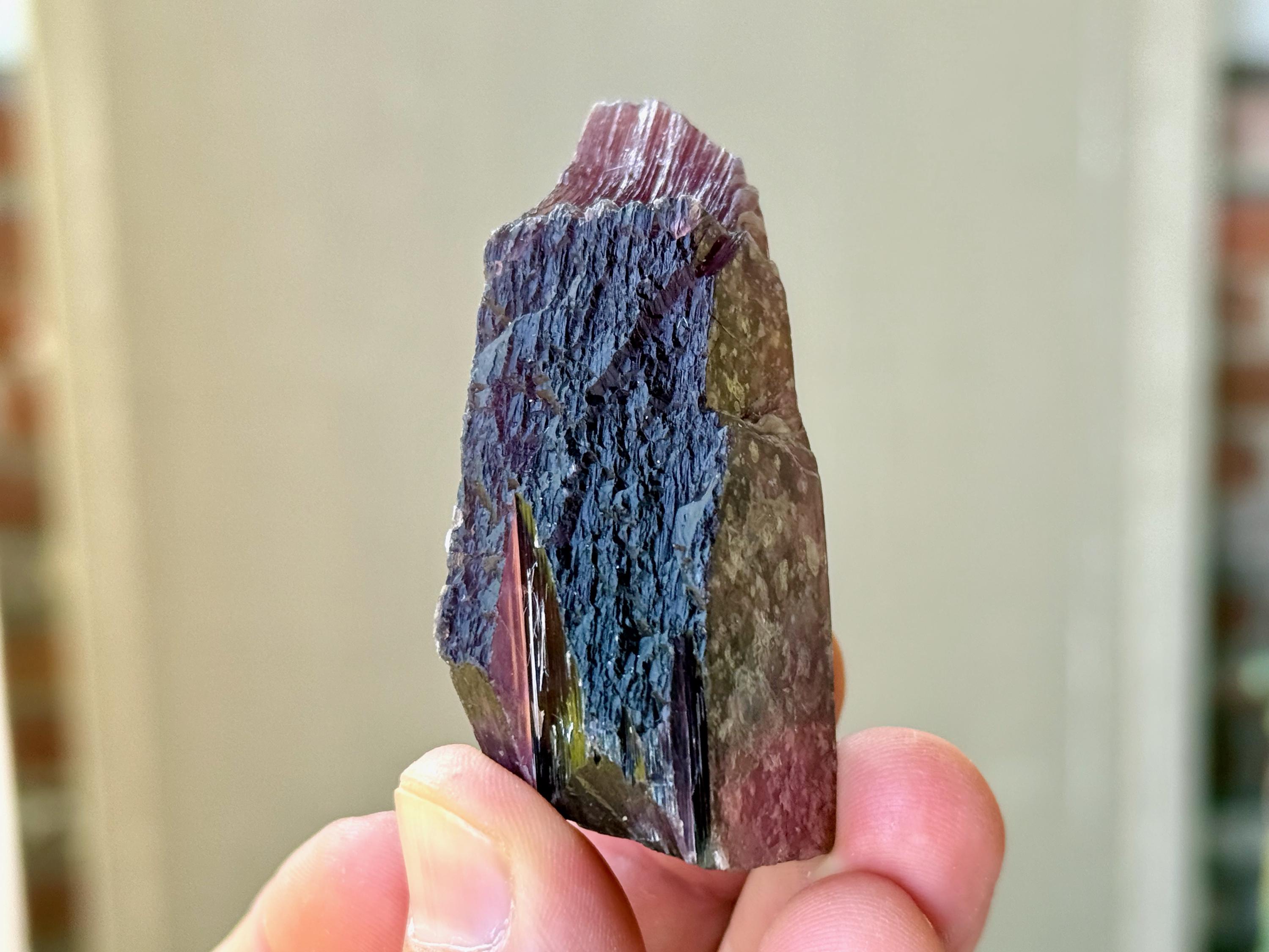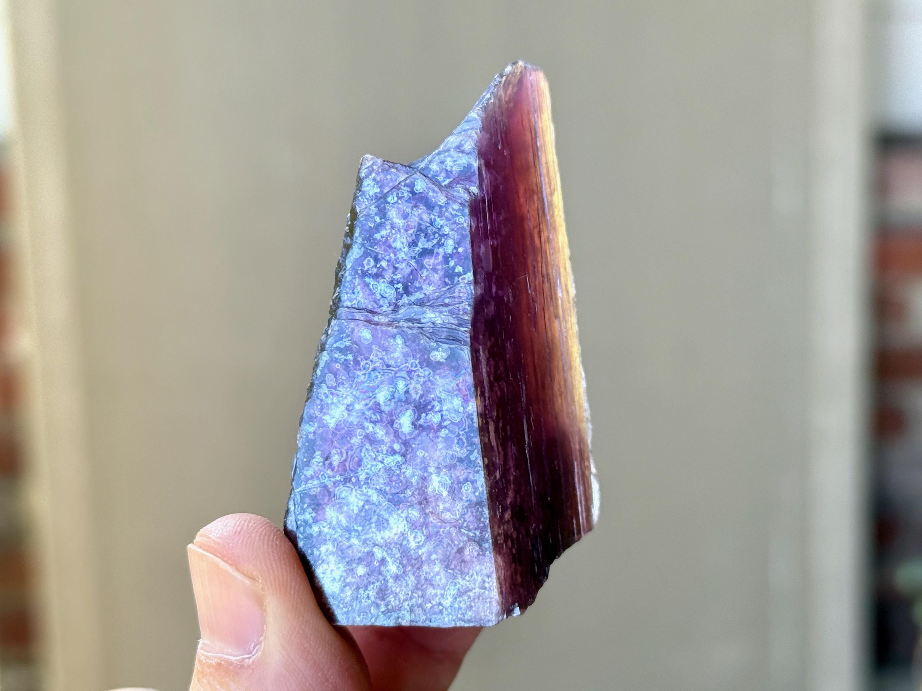 In natural light, this piece displays a metallic dark purple color. But when backlit, this crystal lights up so brilliantly, it's truly magnificent (Photos 1, 3-4, 7-8)!