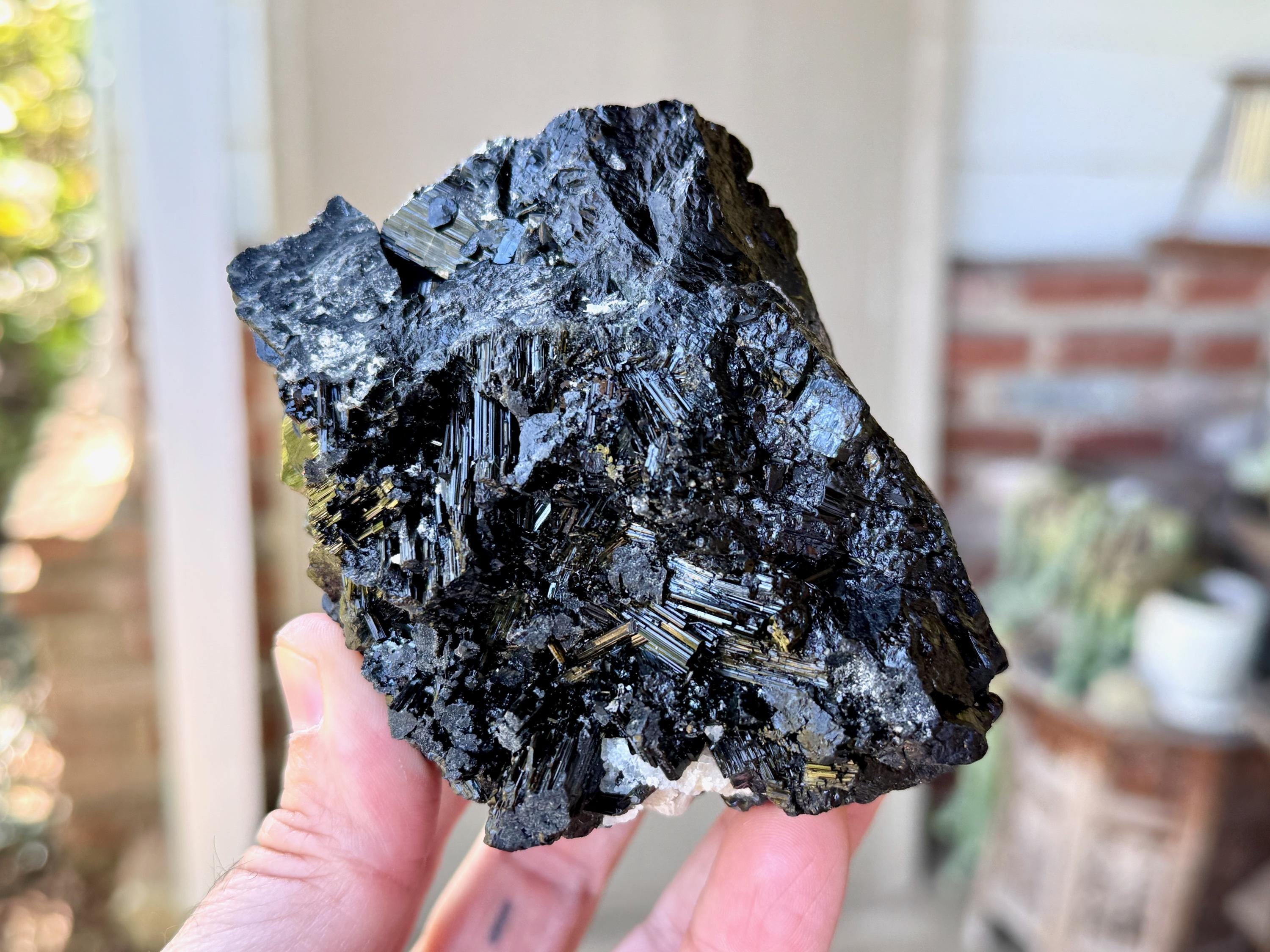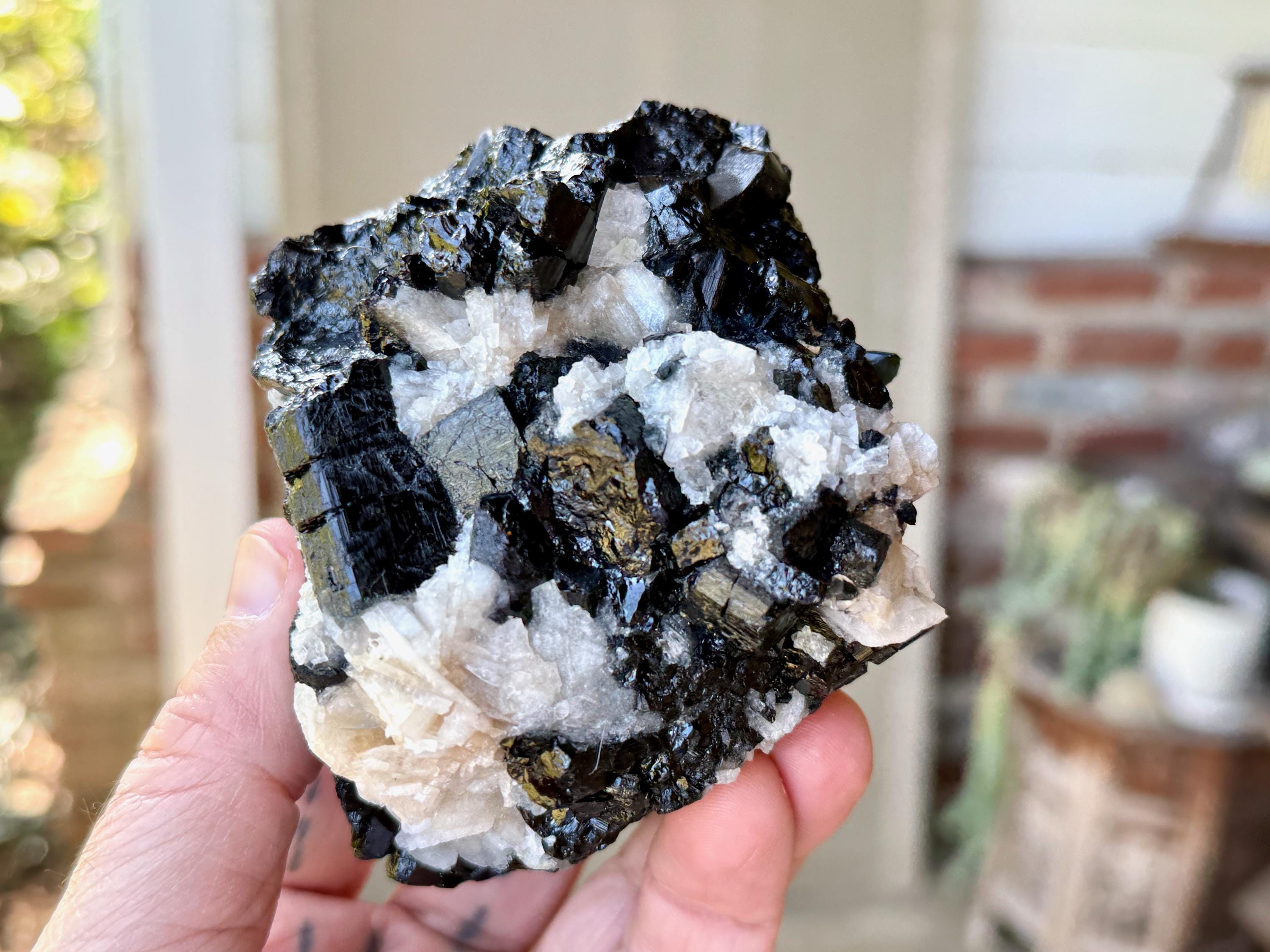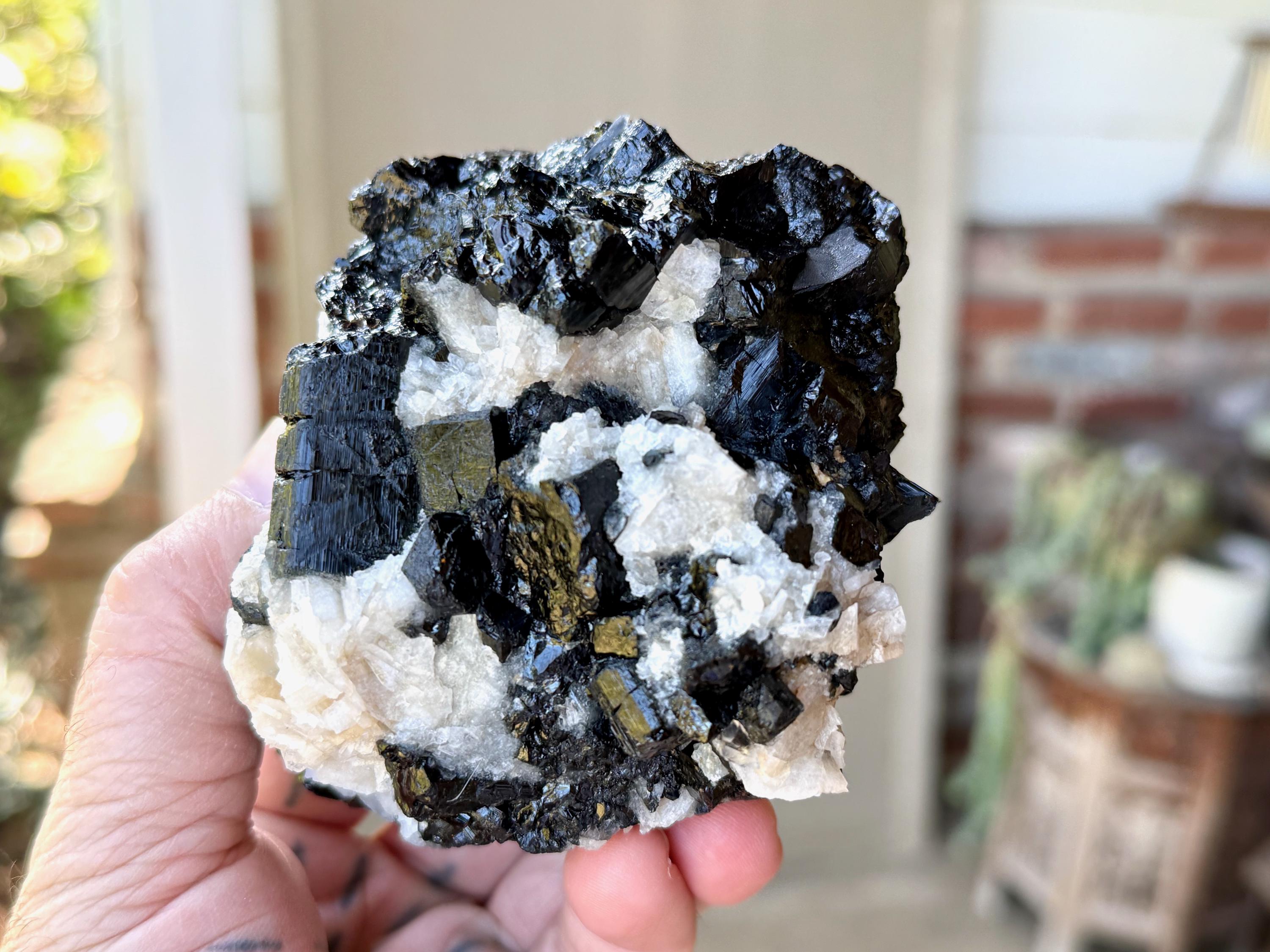 Marbled between the Black Tourmaline are inclusions of white Cleavelandite, giving this piece a wonderful contrast, and also another energetic facet (Cleavelandite is the best crystal for change and times of transition).