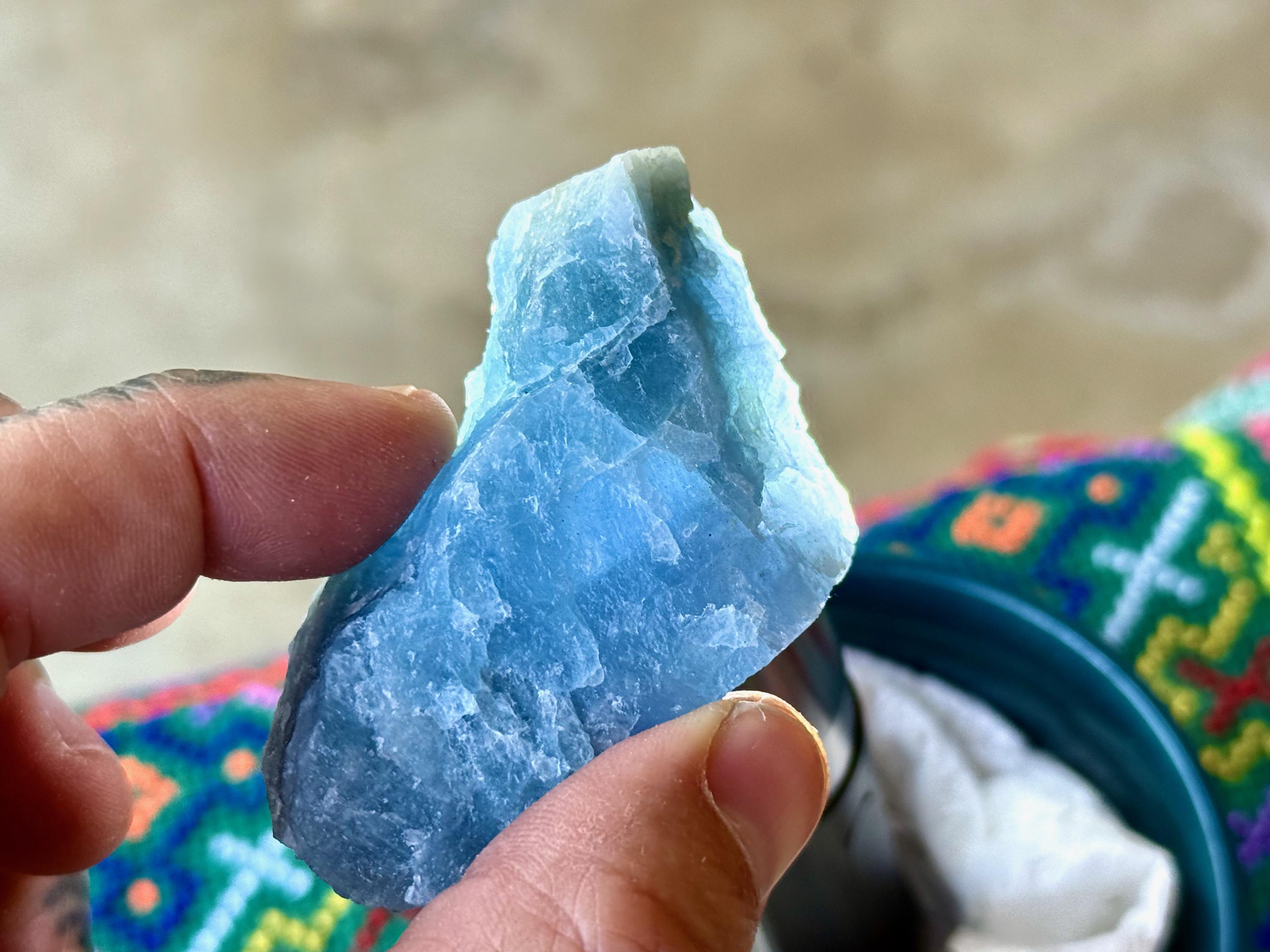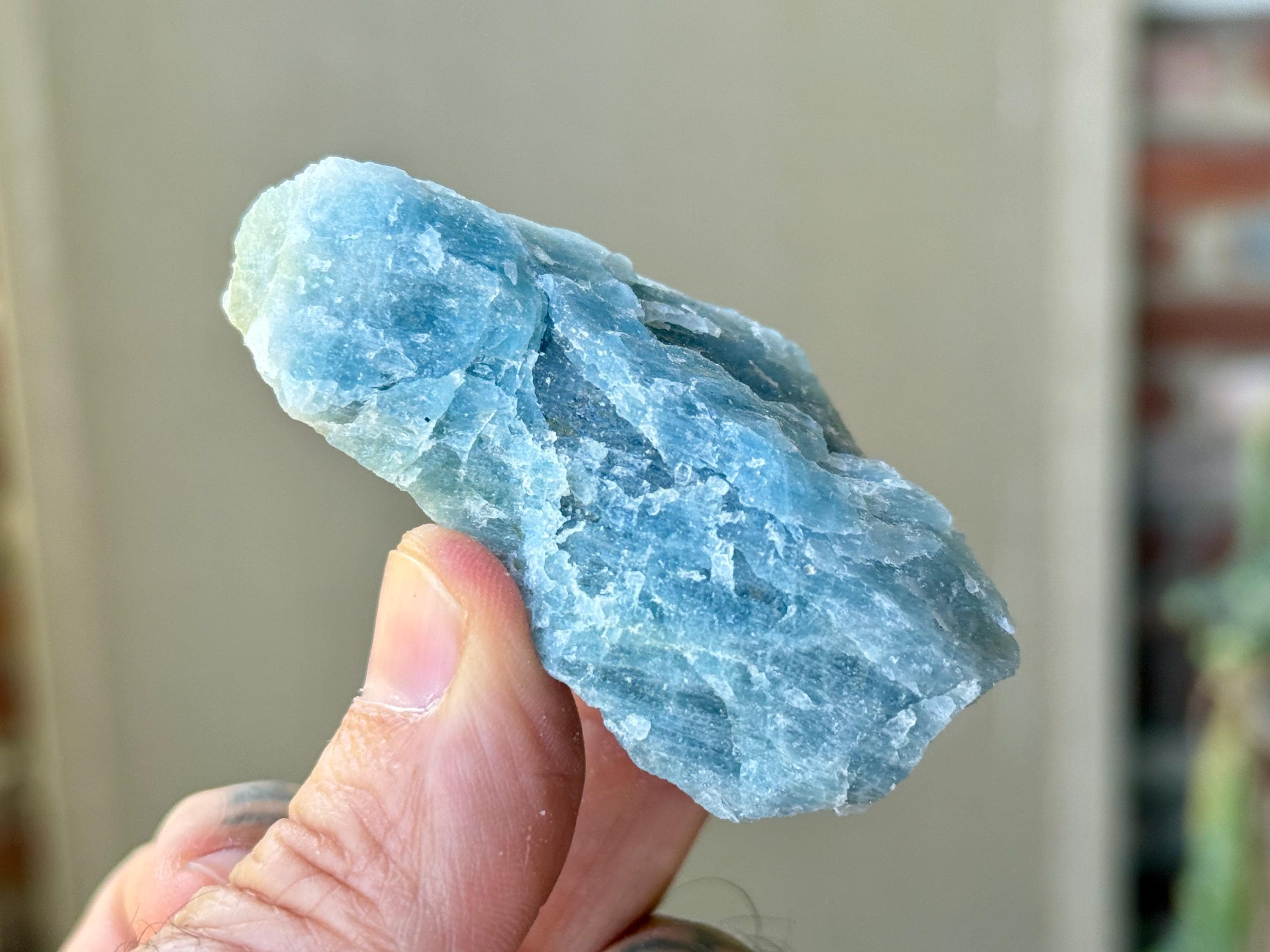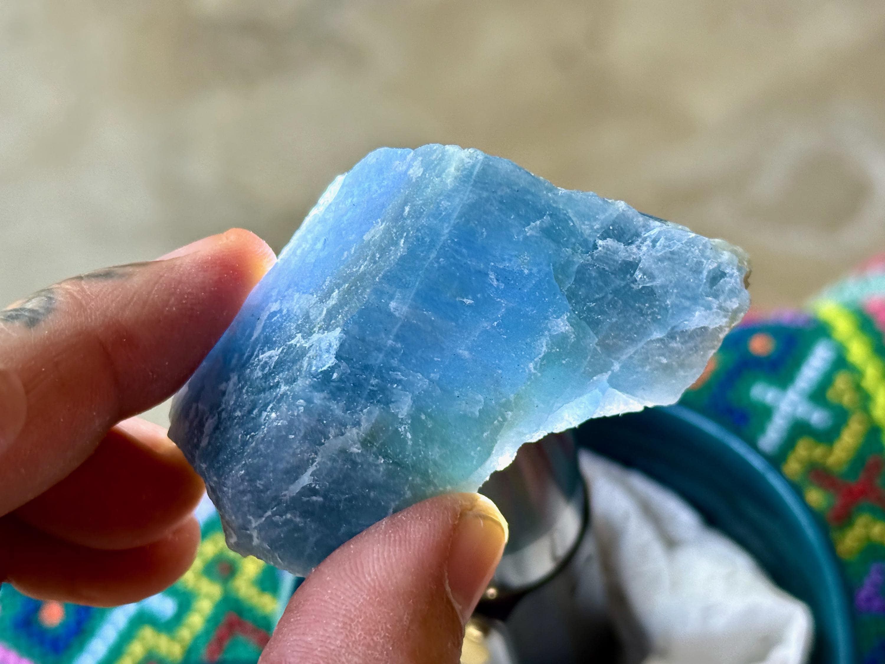 Aquamarine is the blue mineral in the Beryl family and is a powerful crystal for aiding in self-expression and emotional cleansing.