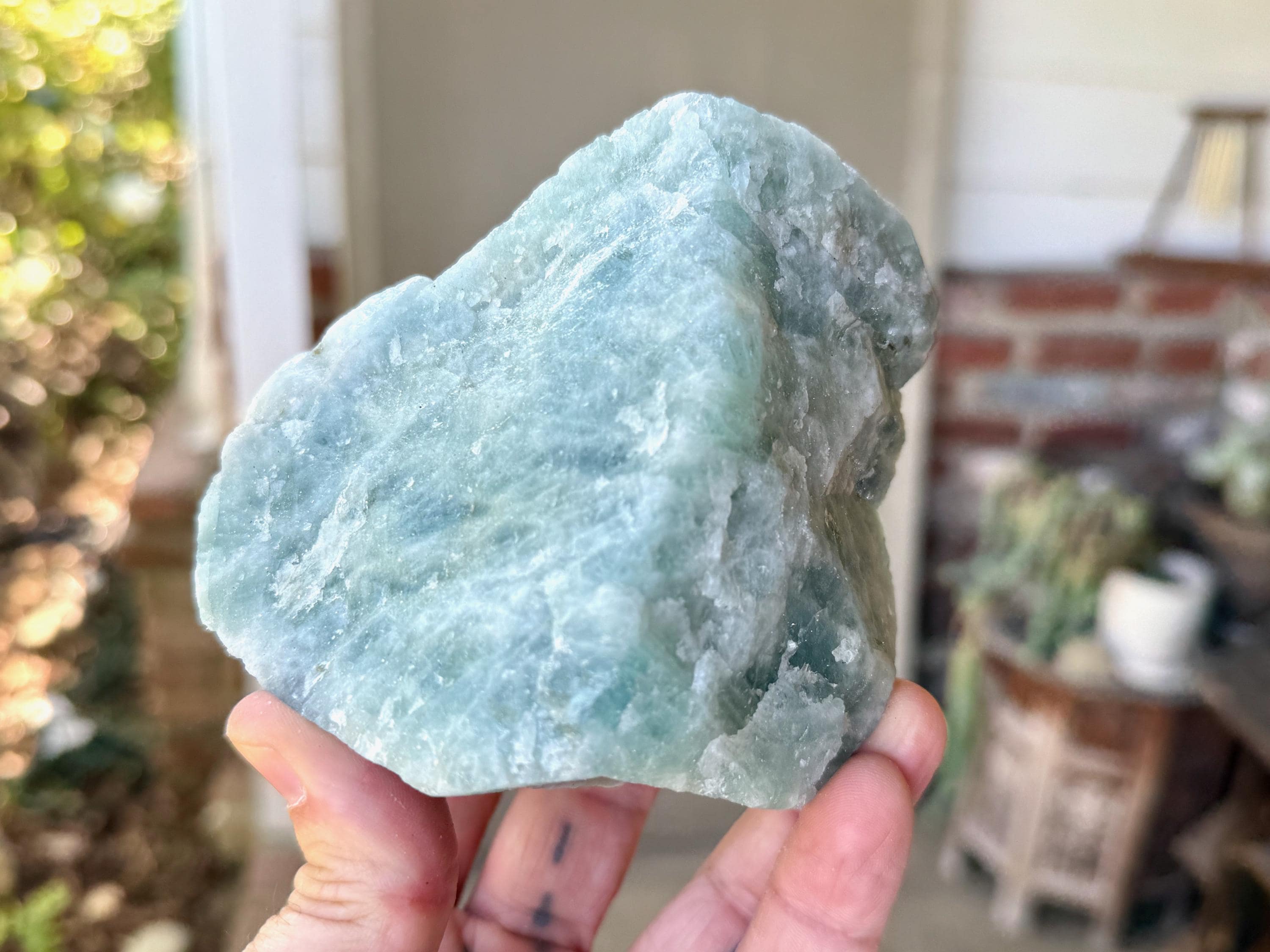 Oceanic, pale greenish-blue hue to this large and beautiful Aquamarine! This crystal features a broad and short natural formation with beautiful marbling on the exterior.