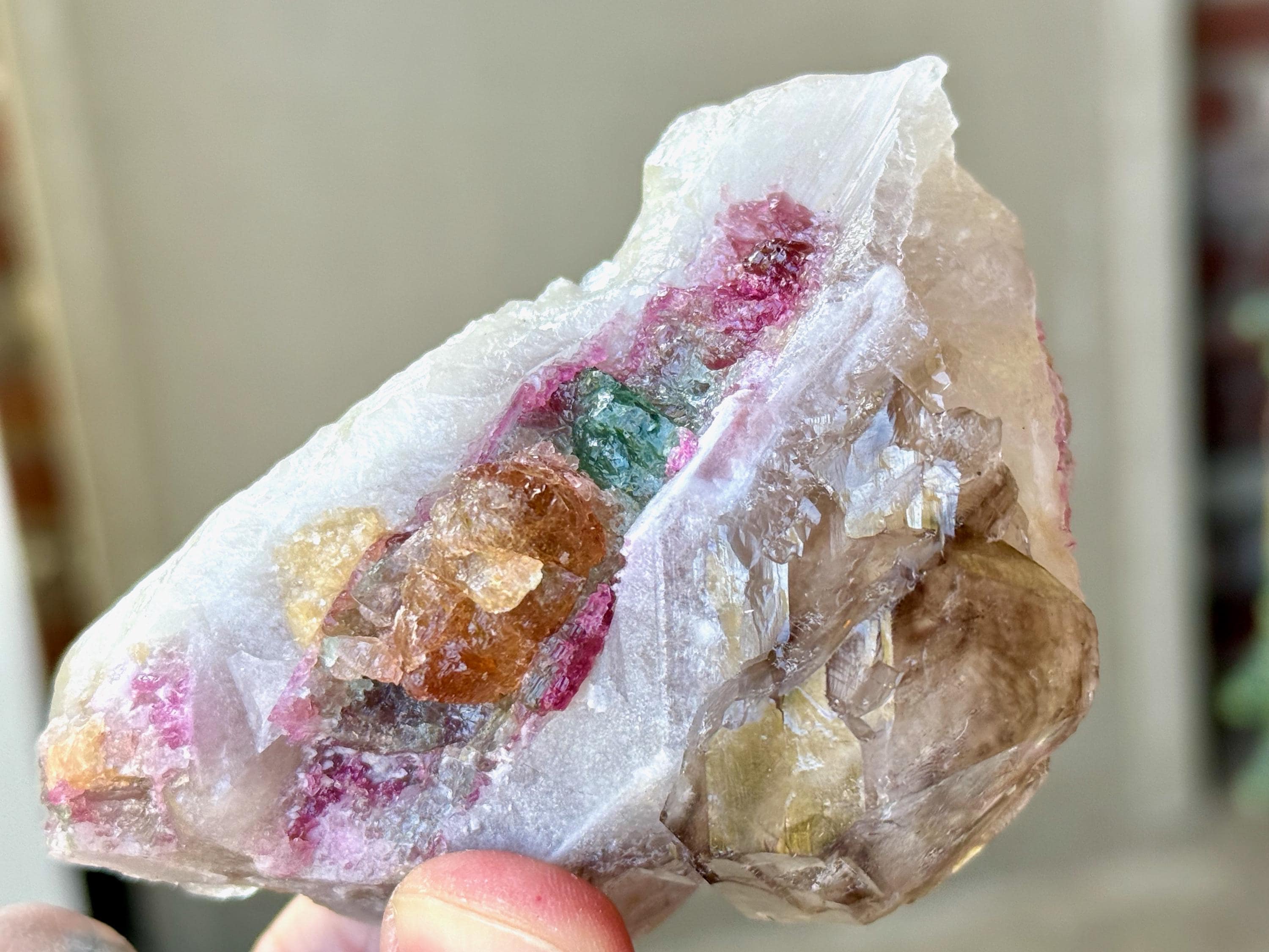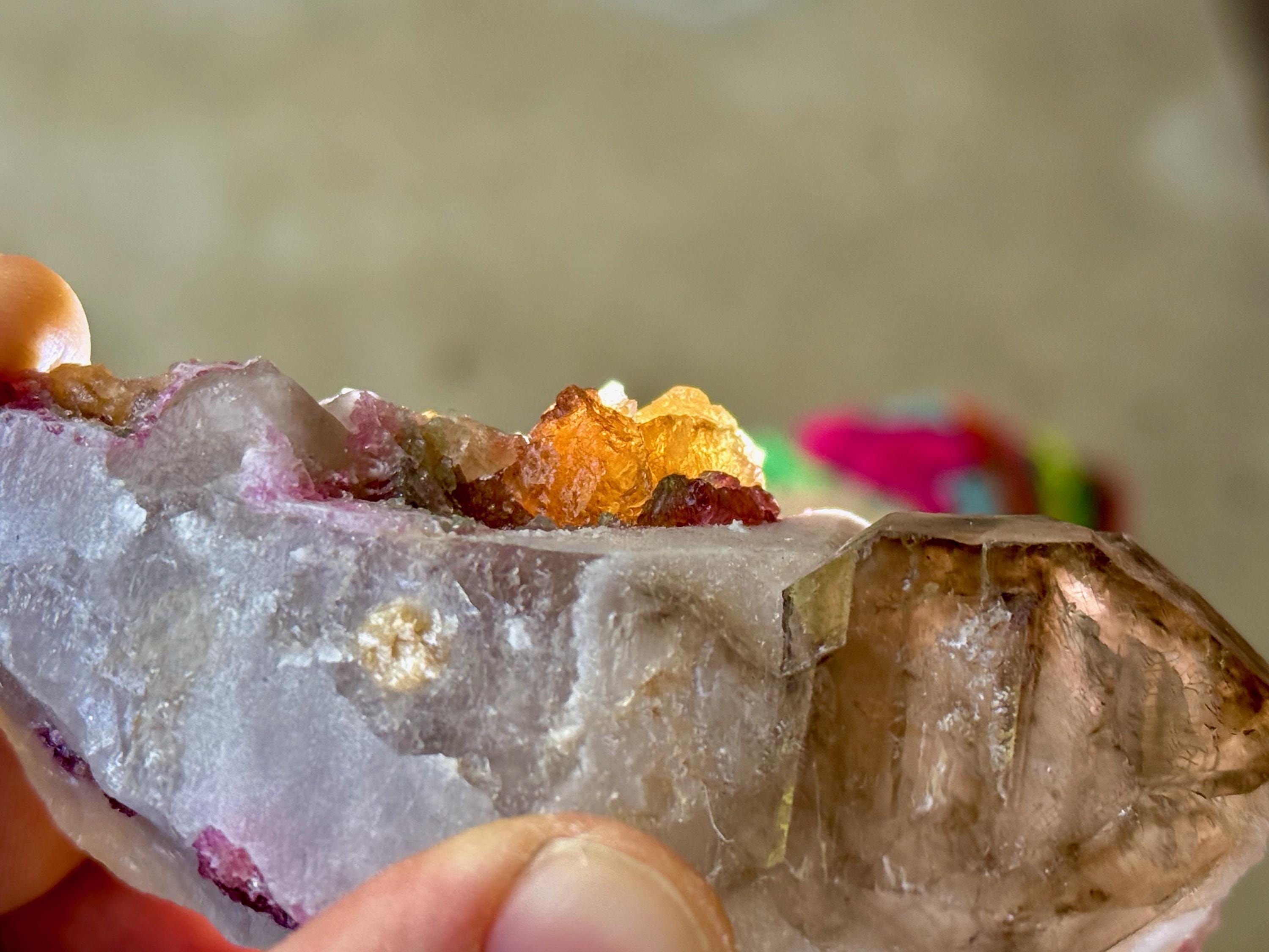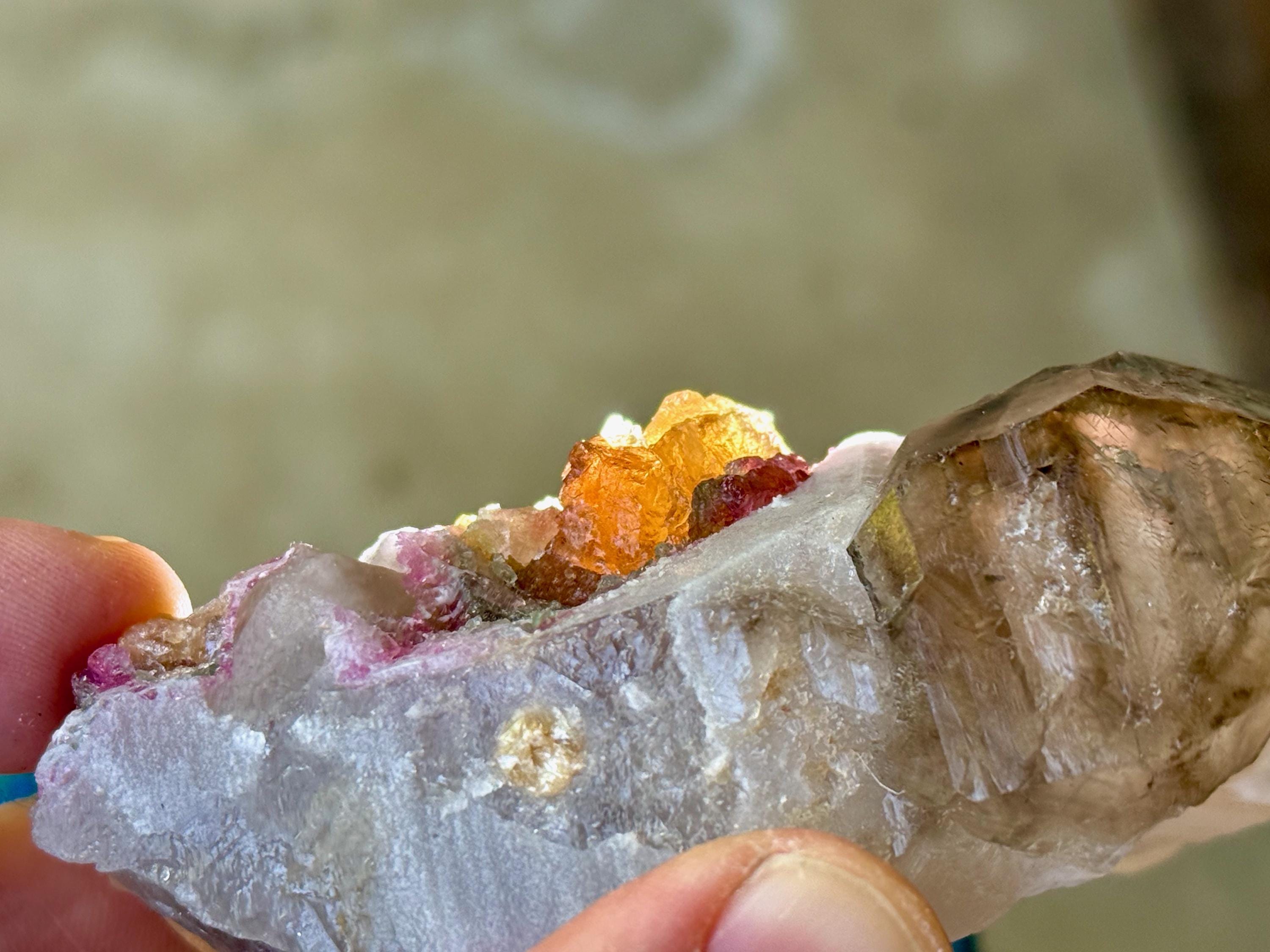 The matrix for this crystal is a dense Quartz, atop which has grown a more lustrous Smoky Quartz point. Embedded in the side is a juicy, vibrant inclusion of multicolor Tourmaline. In this inclusion we see pink and green Tourmaline, and right in the center we see .... orange?! This is a very unusual color for Tourmaline, and it is possible that its color comes from Iron inclusion. But nevertheless, this is a color seen very rarely! When backlit, the colors light up brilliantly (Photos 3-5).