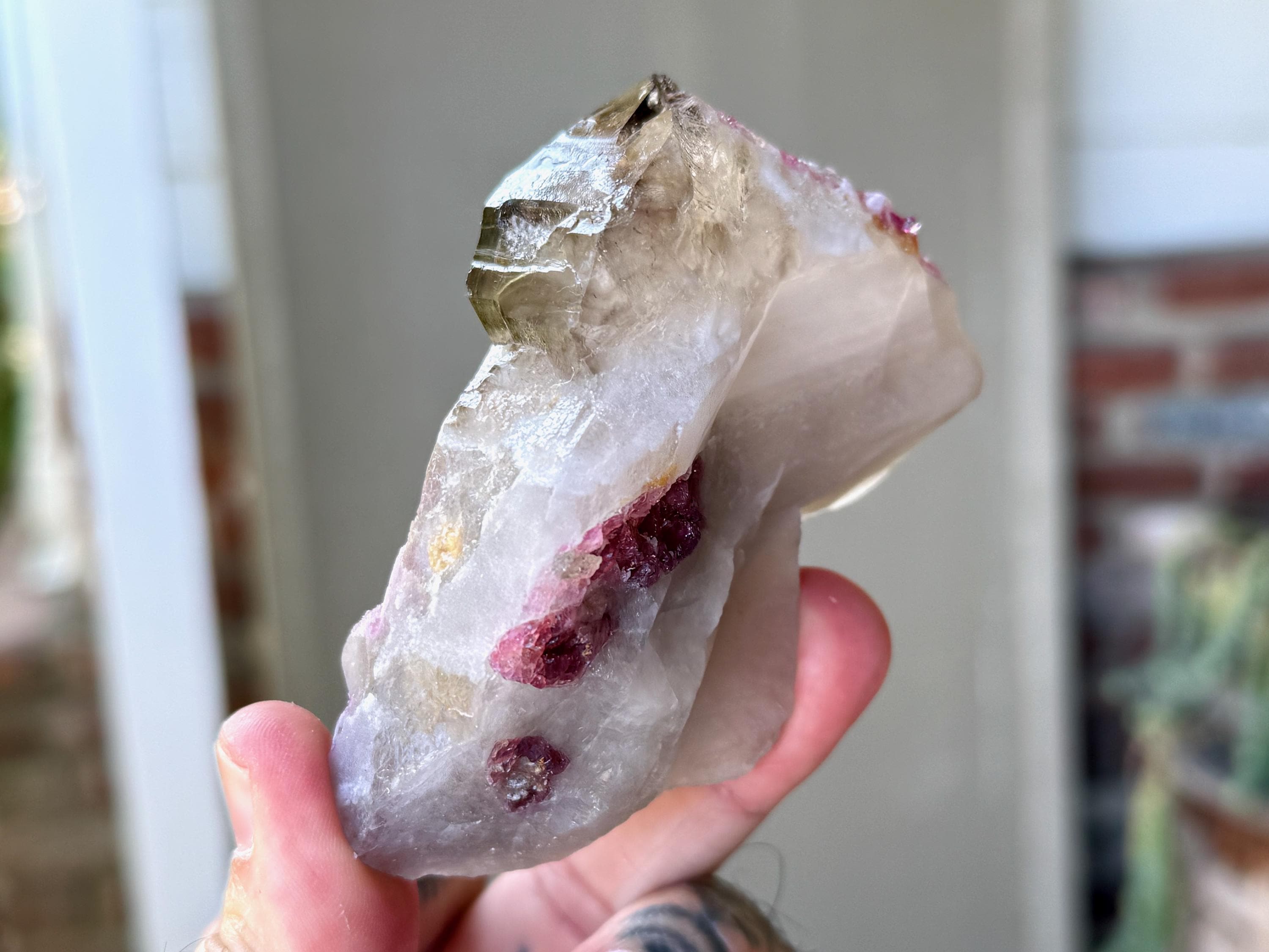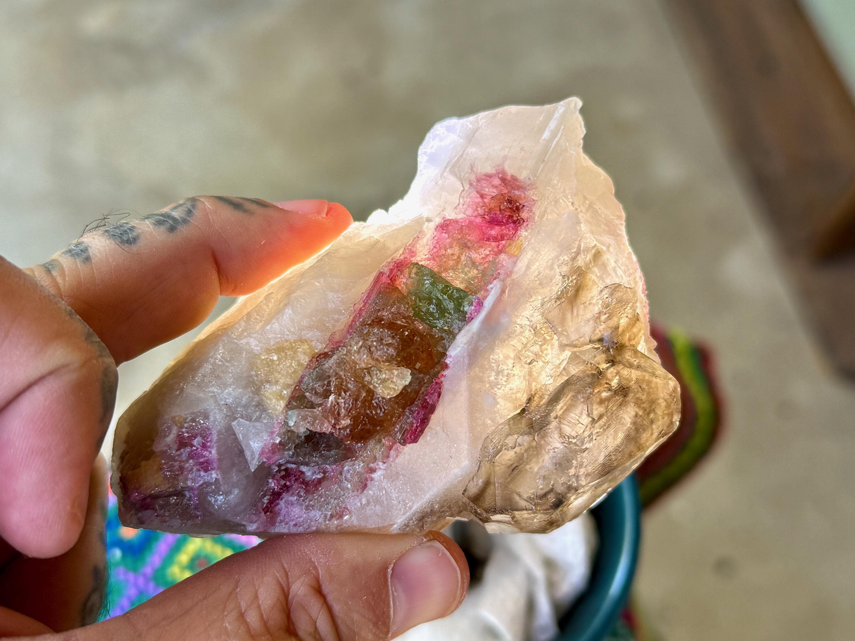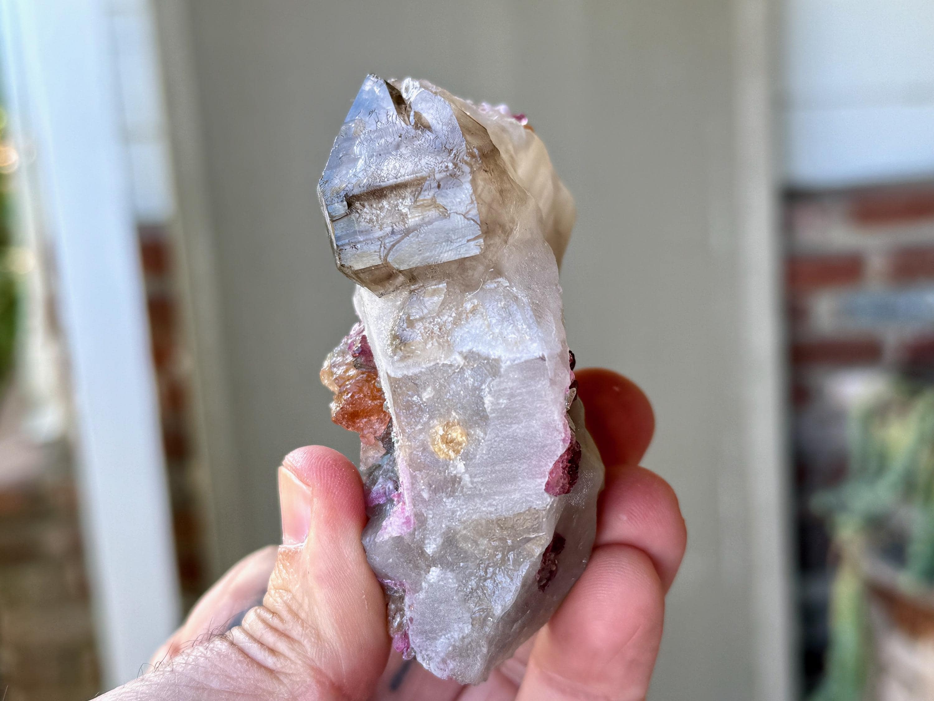 The matrix for this crystal is a dense Quartz, atop which has grown a more lustrous Smoky Quartz point. Embedded in the side is a juicy, vibrant inclusion of multicolor Tourmaline. In this inclusion we see pink and green Tourmaline, and right in the center we see .... orange?! This is a very unusual color for Tourmaline, and it is possible that its color comes from Iron inclusion. But nevertheless, this is a color seen very rarely! When backlit, the colors light up brilliantly (Photos 3-5).