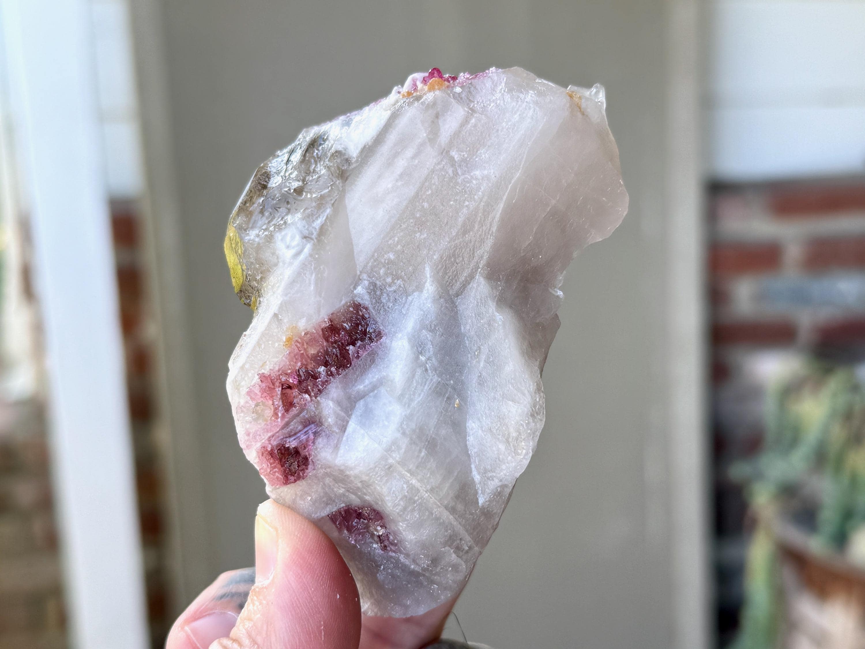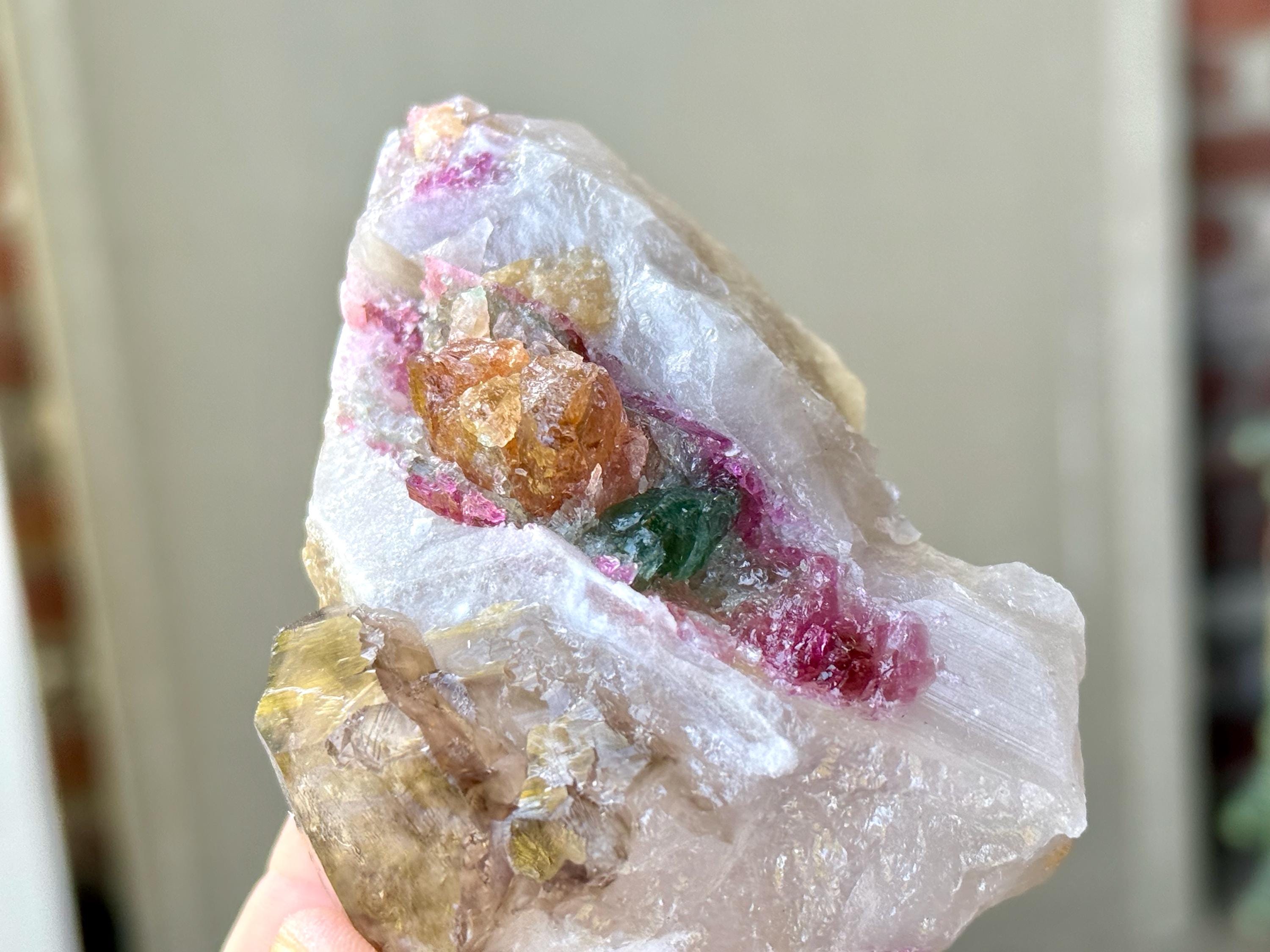 The crystals from this find include unique combinations of Quartz, Citrine, Lepidolite, Albite, Cleavelandite and Feldspar, with vividly colored Tourmalines in lovely hues of green, pink, purple and blue. Crystals with combinations of these minerals are sometimes referred to as "Unicorn Stones."