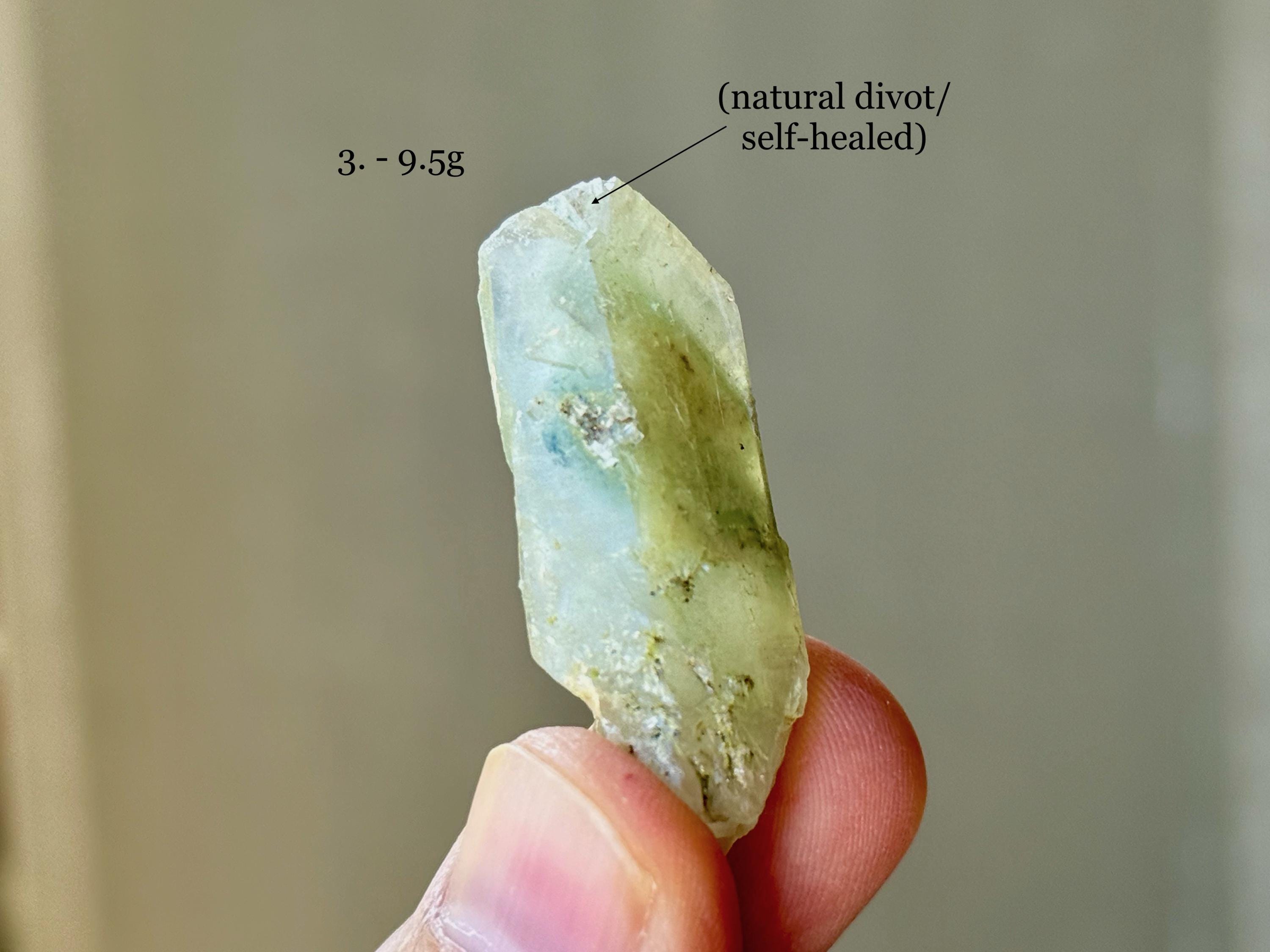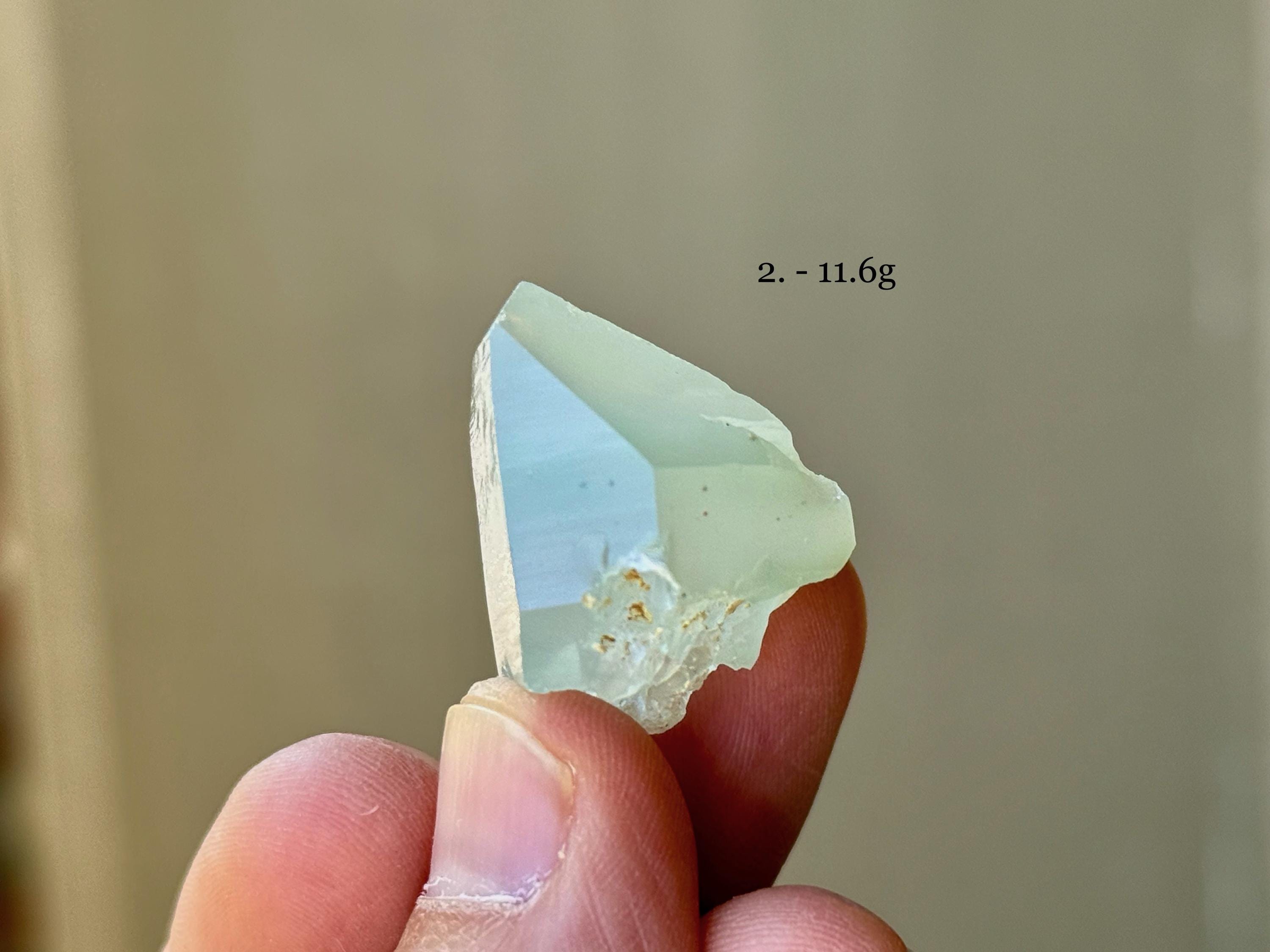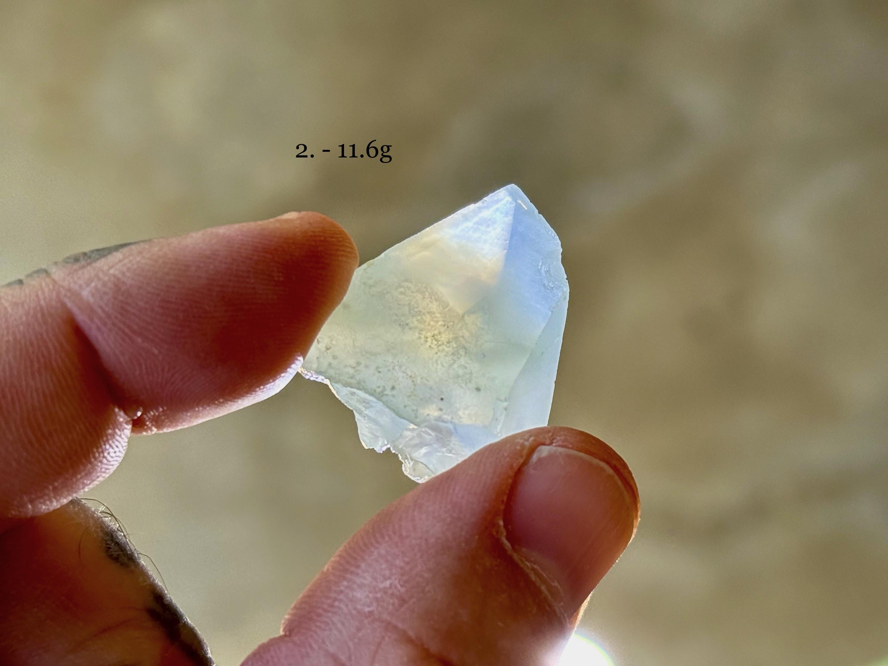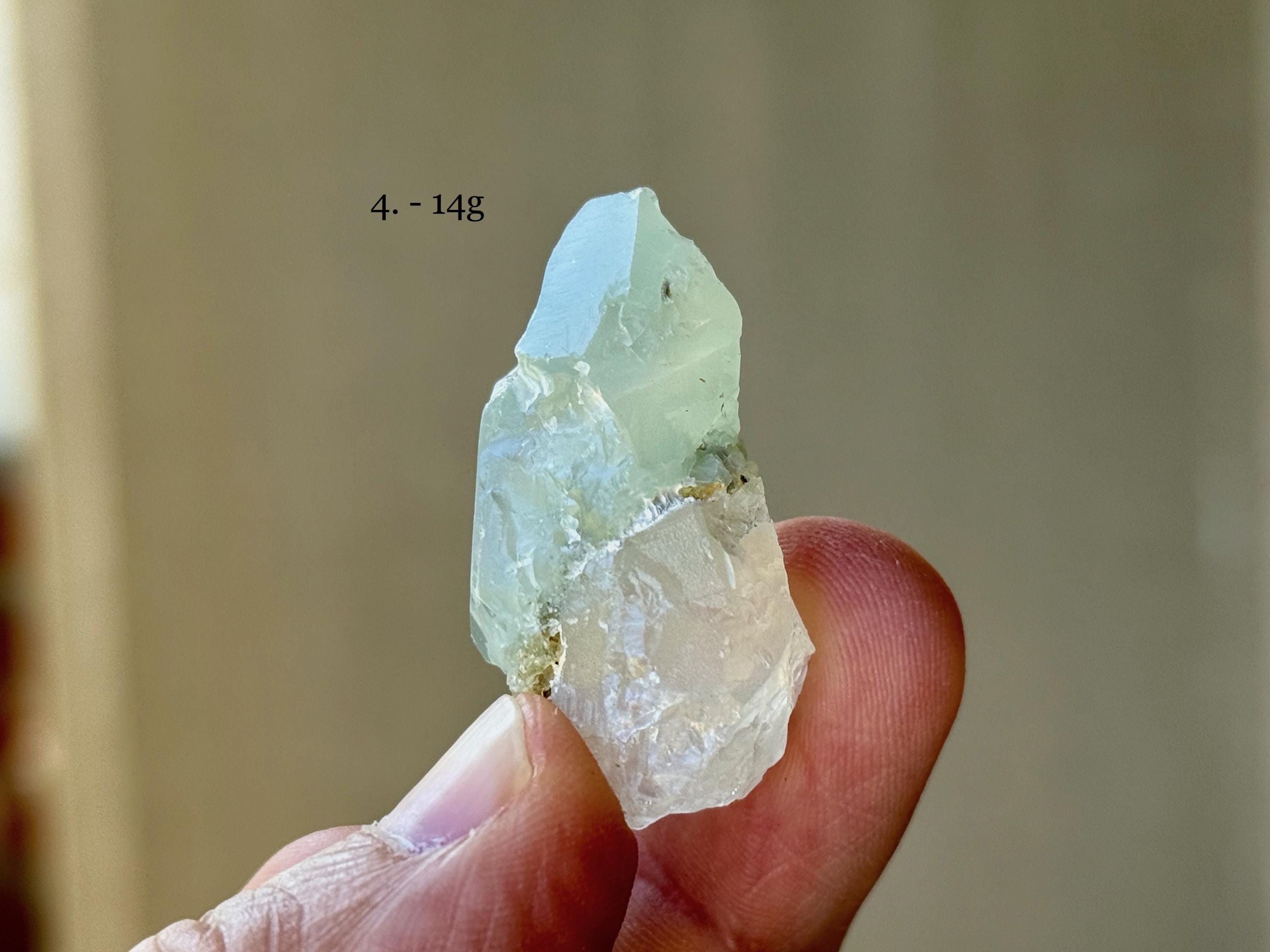 Each of these crystals possesses a mild green hue, with mild "girasol" haze and waxy, lustrous complexion. We've included photos of each crystal in both natural light and with backlighting.