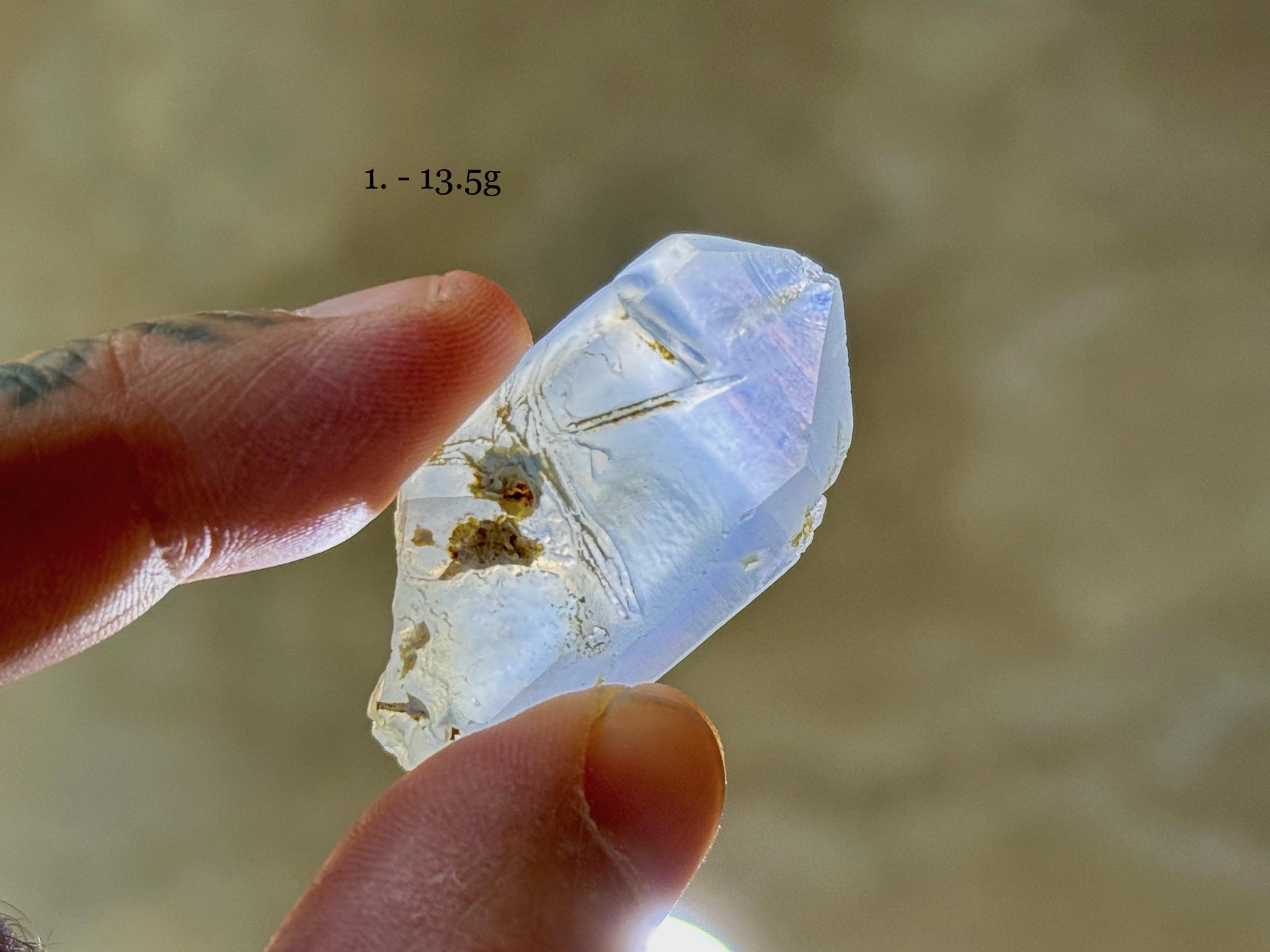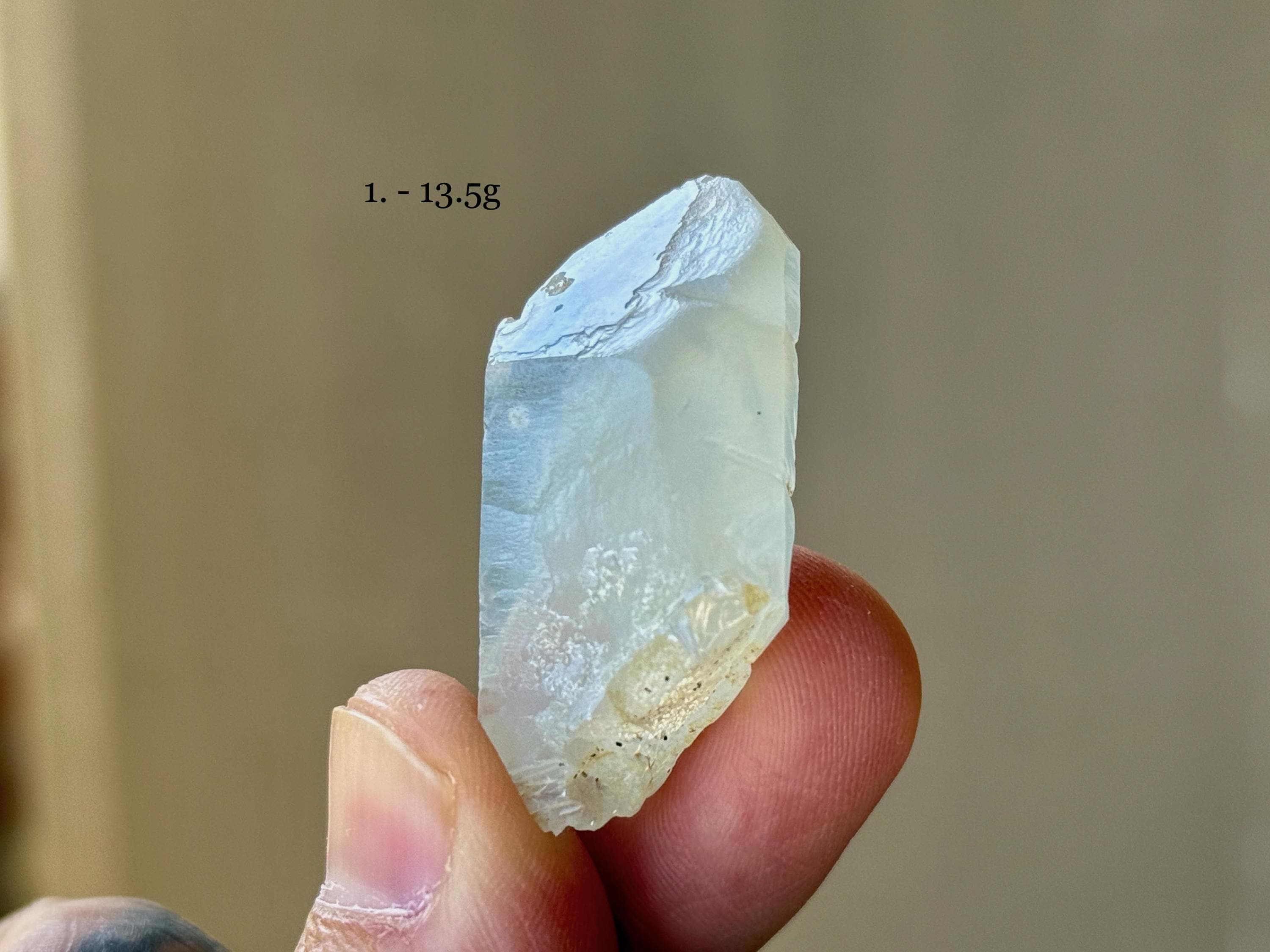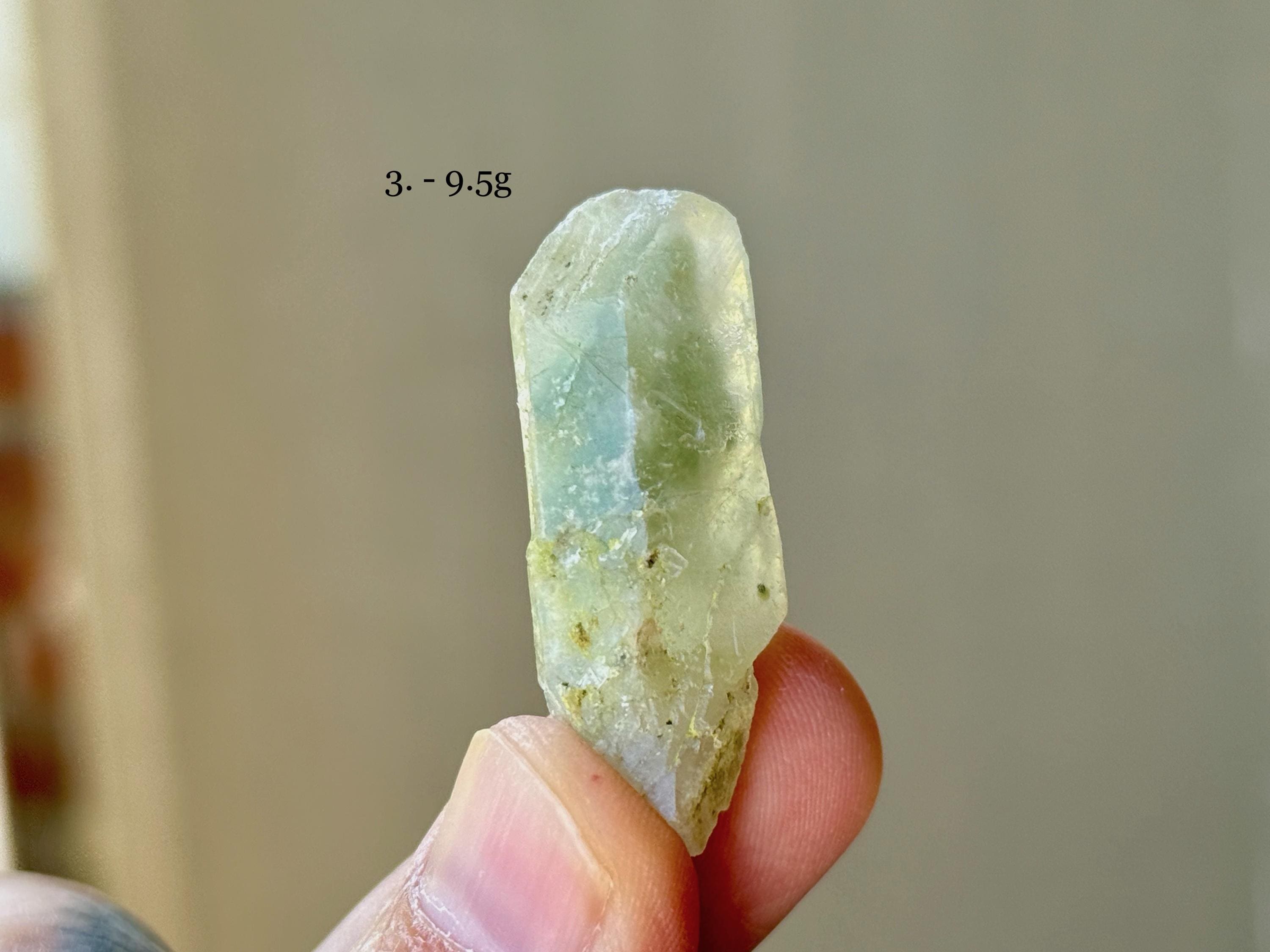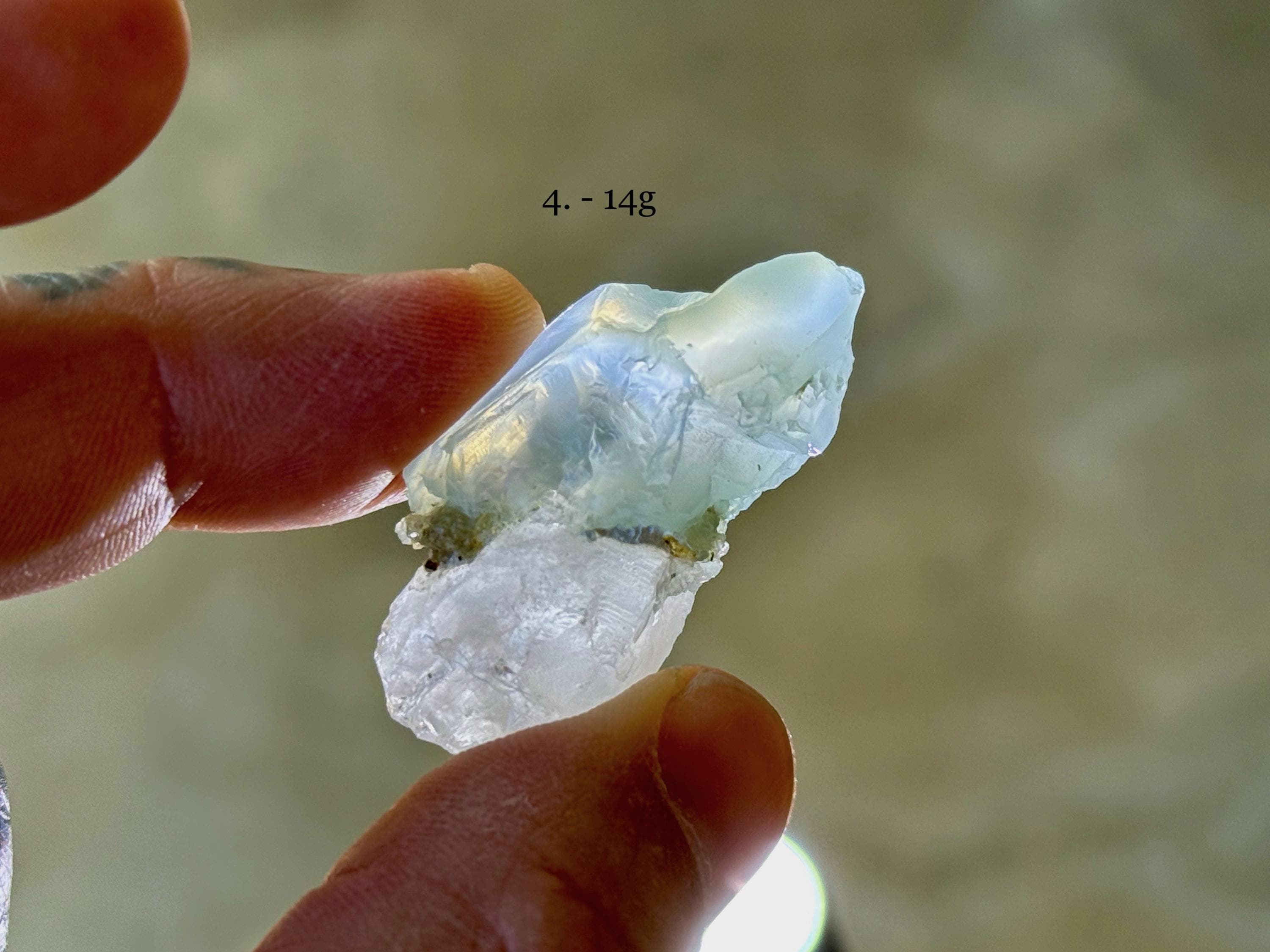 Each of these crystals possesses a mild green hue, with mild "girasol" haze and waxy, lustrous complexion. We've included photos of each crystal in both natural light and with backlighting.