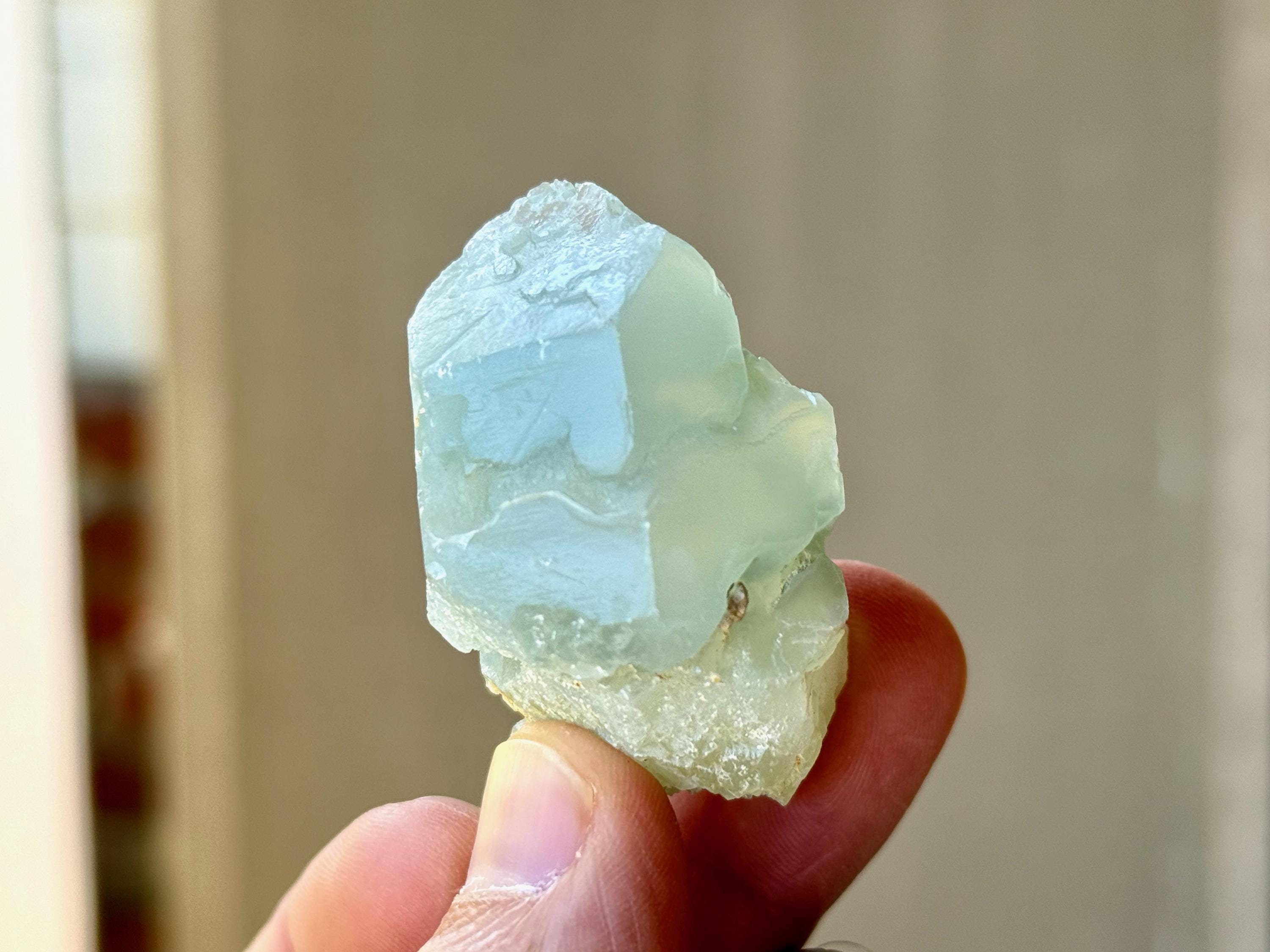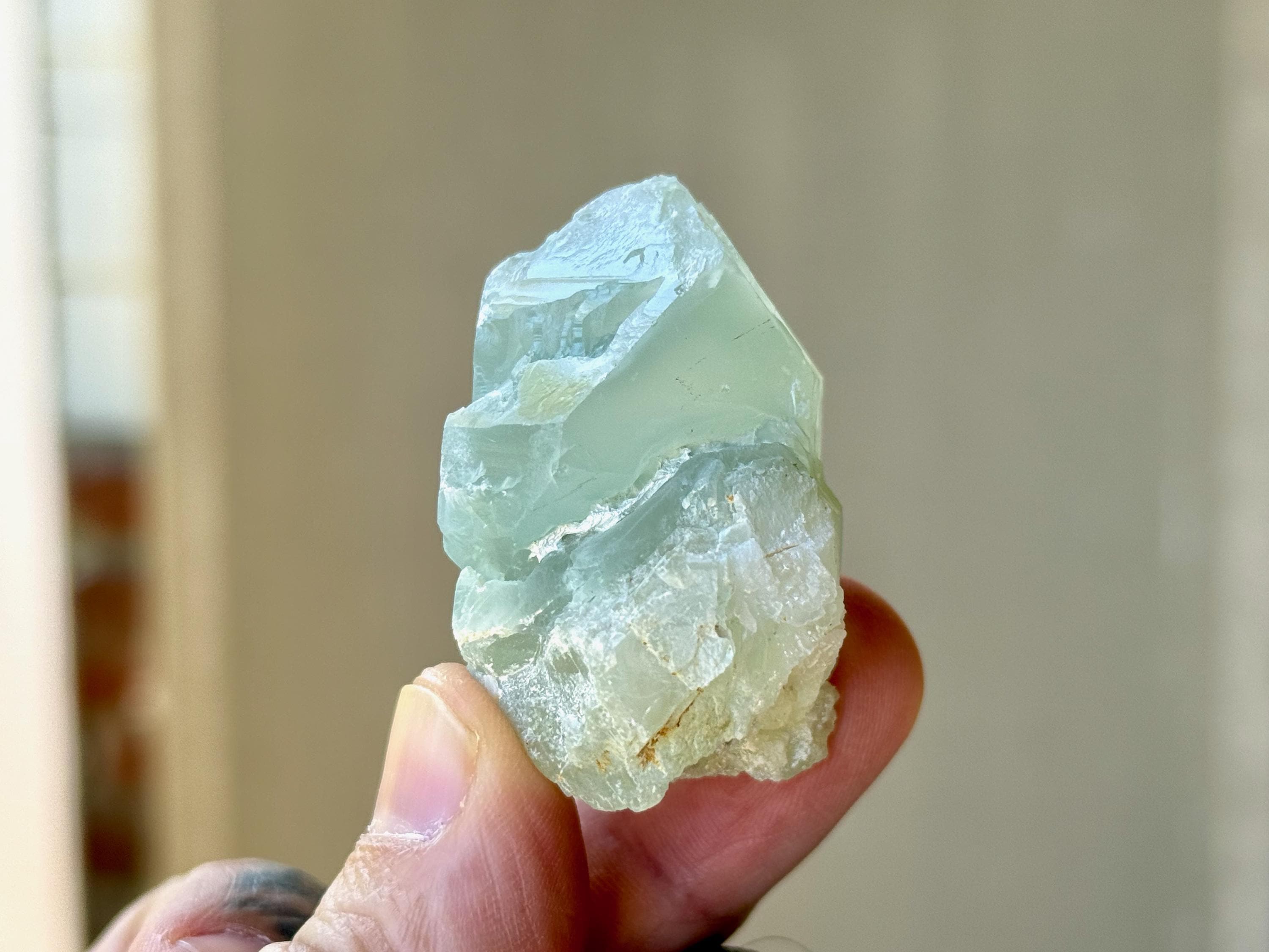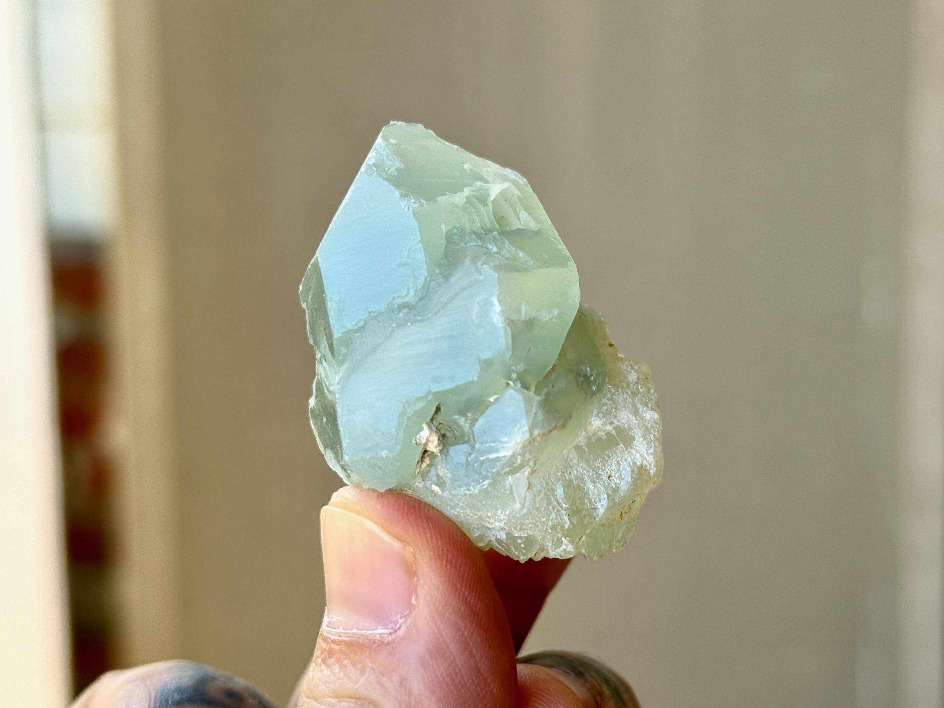 This is a glorious point formation with a ghostly green color, as well as brilliant luster and a waxy complexion. It has a very ethereal quality to it, with lots of girasol haze inside. When backlit, as in Photos 3-4, we can see how nice it lights up.