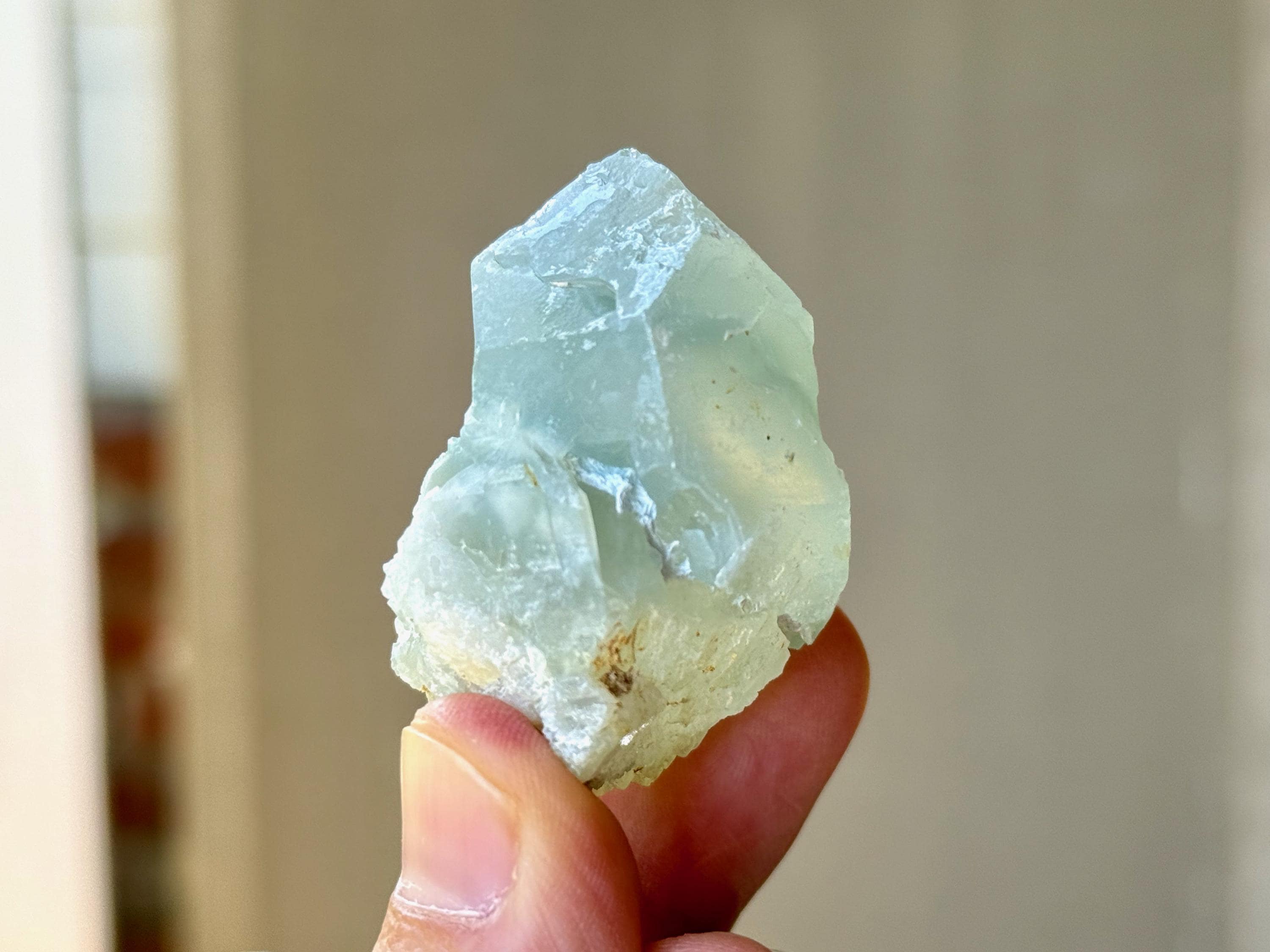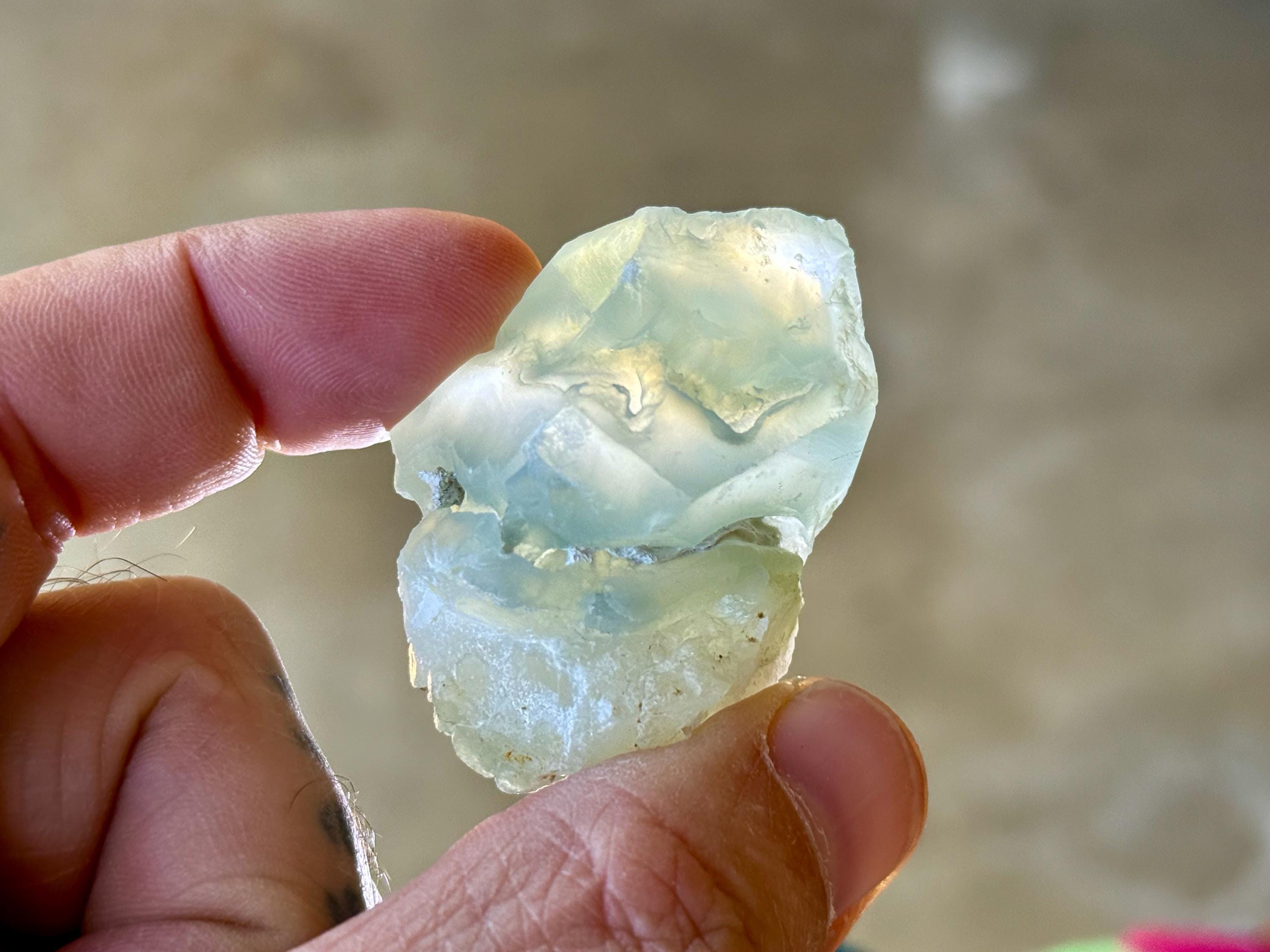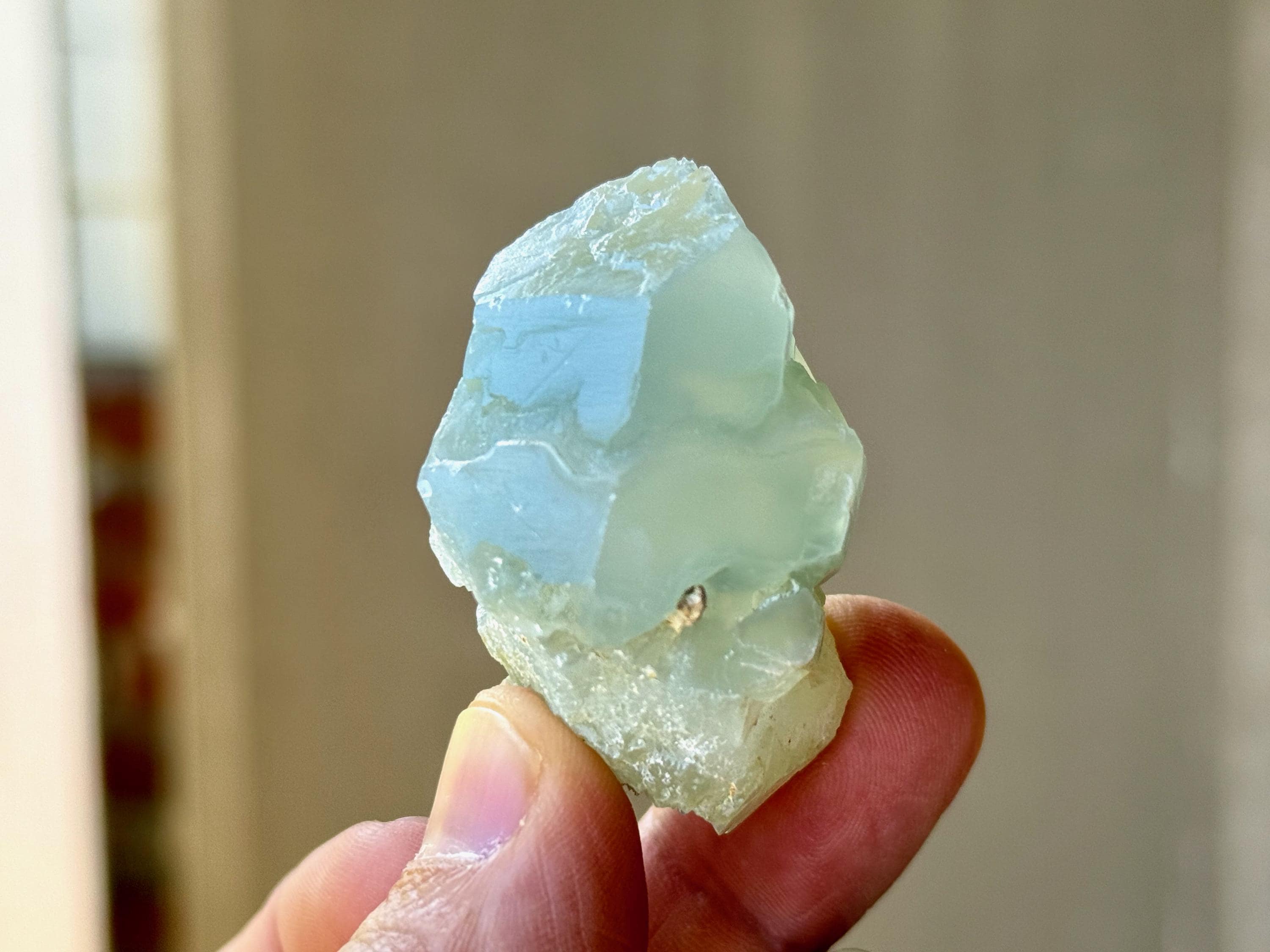 This is a glorious point formation with a ghostly green color, as well as brilliant luster and a waxy complexion. It has a very ethereal quality to it, with lots of girasol haze inside. When backlit, as in Photos 3-4, we can see how nice it lights up.