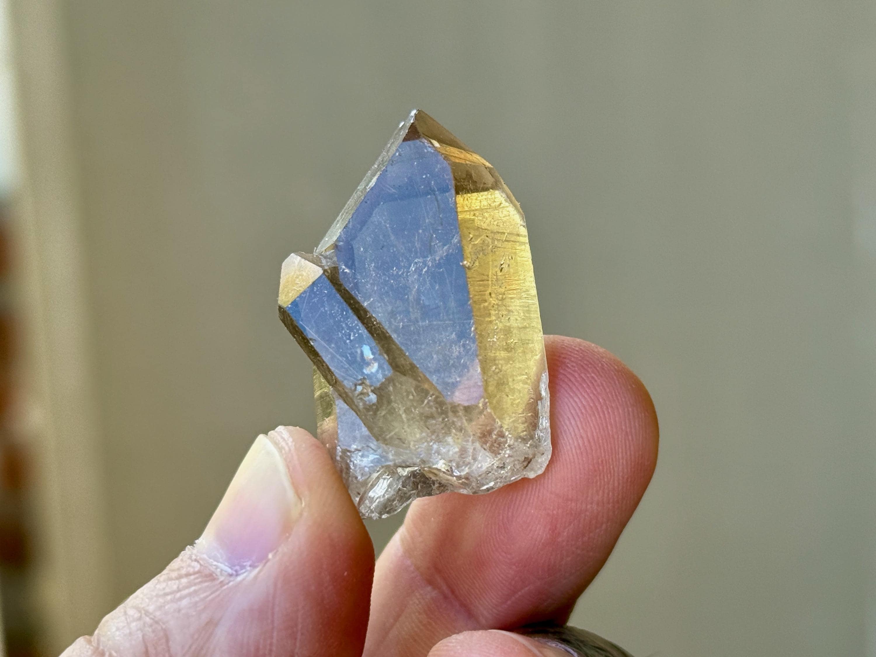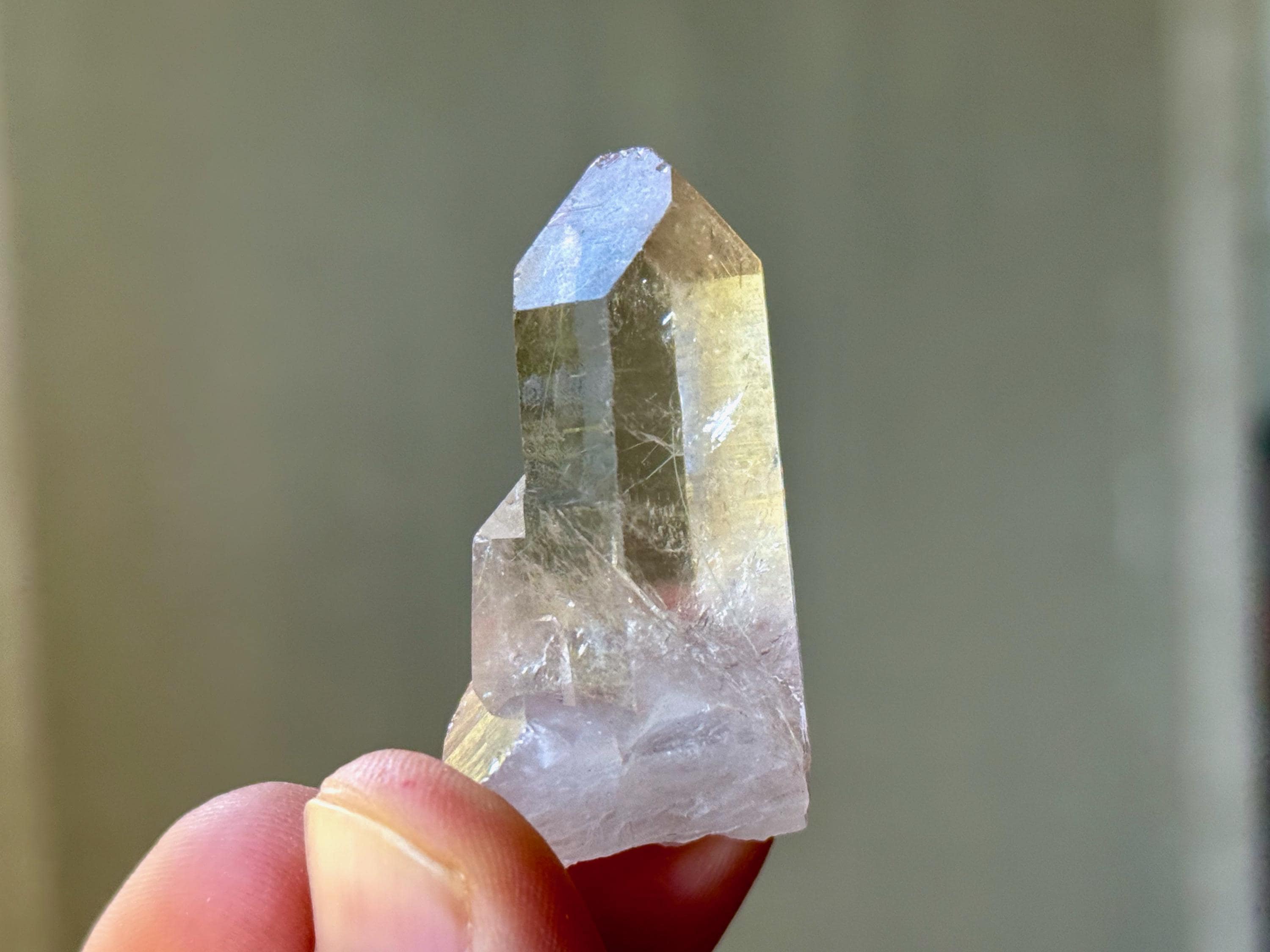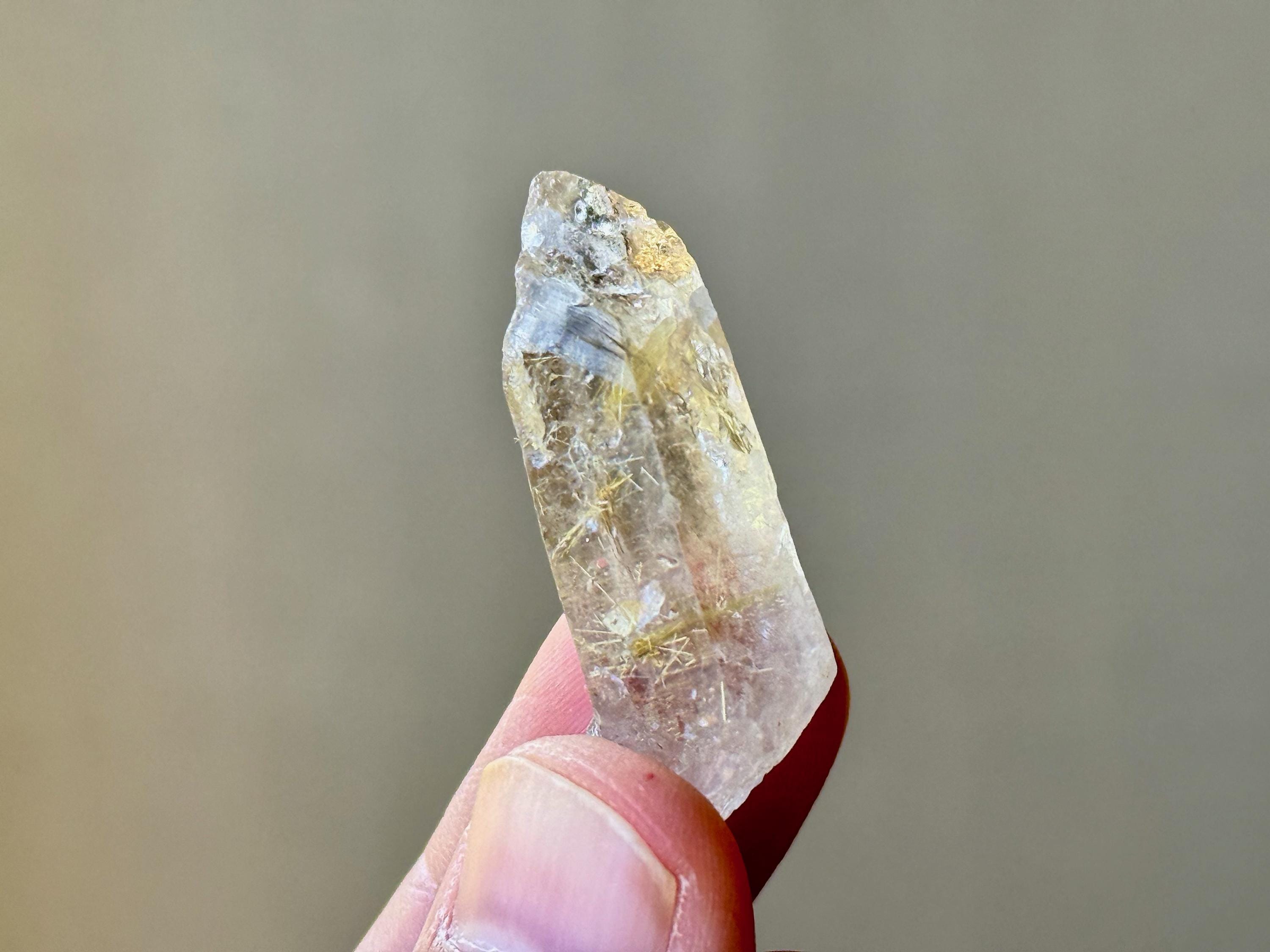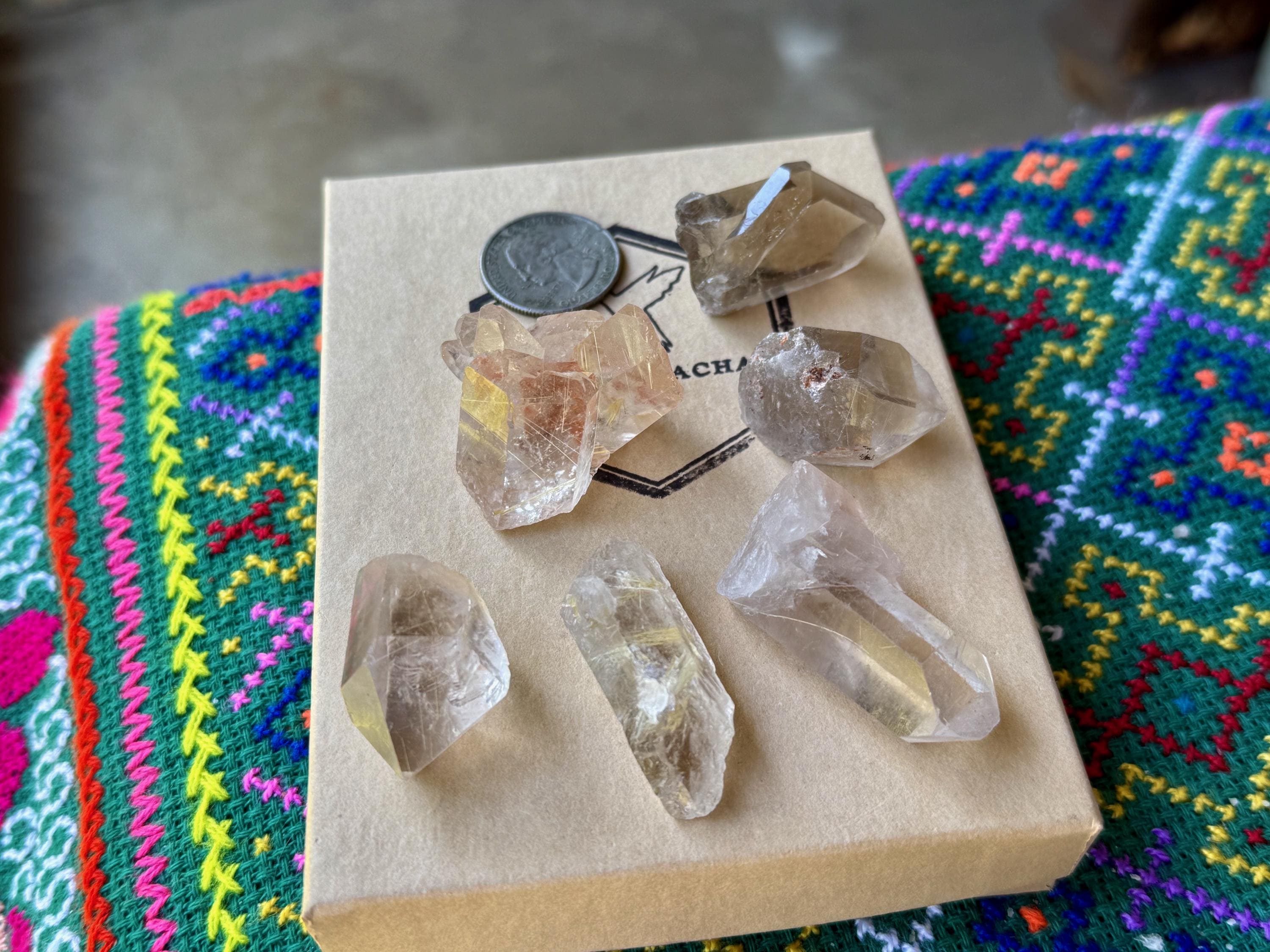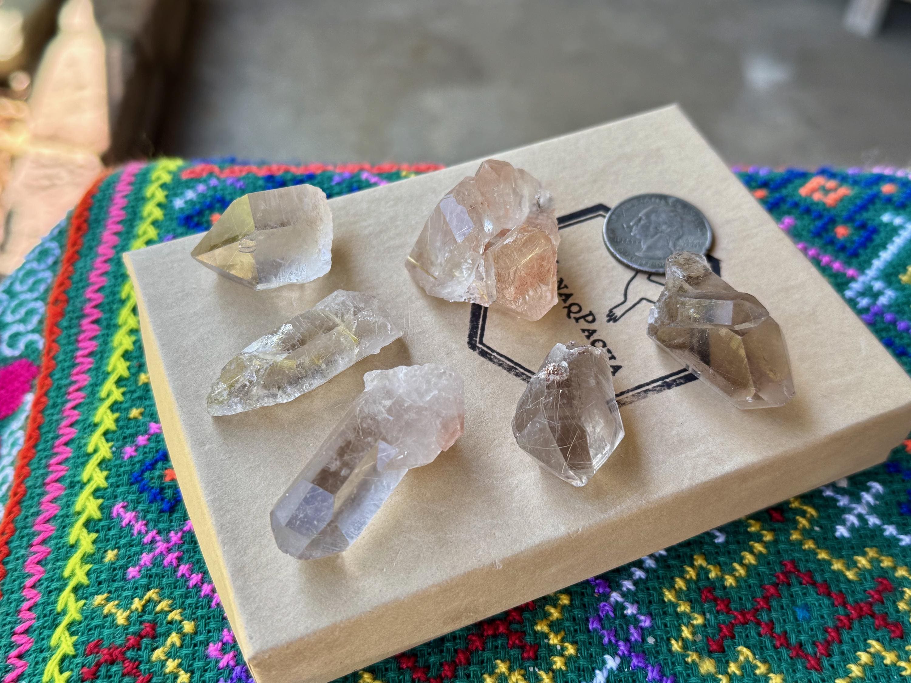 Wonderful clarity and brilliant luster to these Quartz crystals with inclusions of Golden Rutile within. These crystals possess various hues of smokiness and clarity, and each possesses some Golden Rutile, from mild to more ample. In the natural sunlight, these inclusions become much more visible with lots of sparkle.