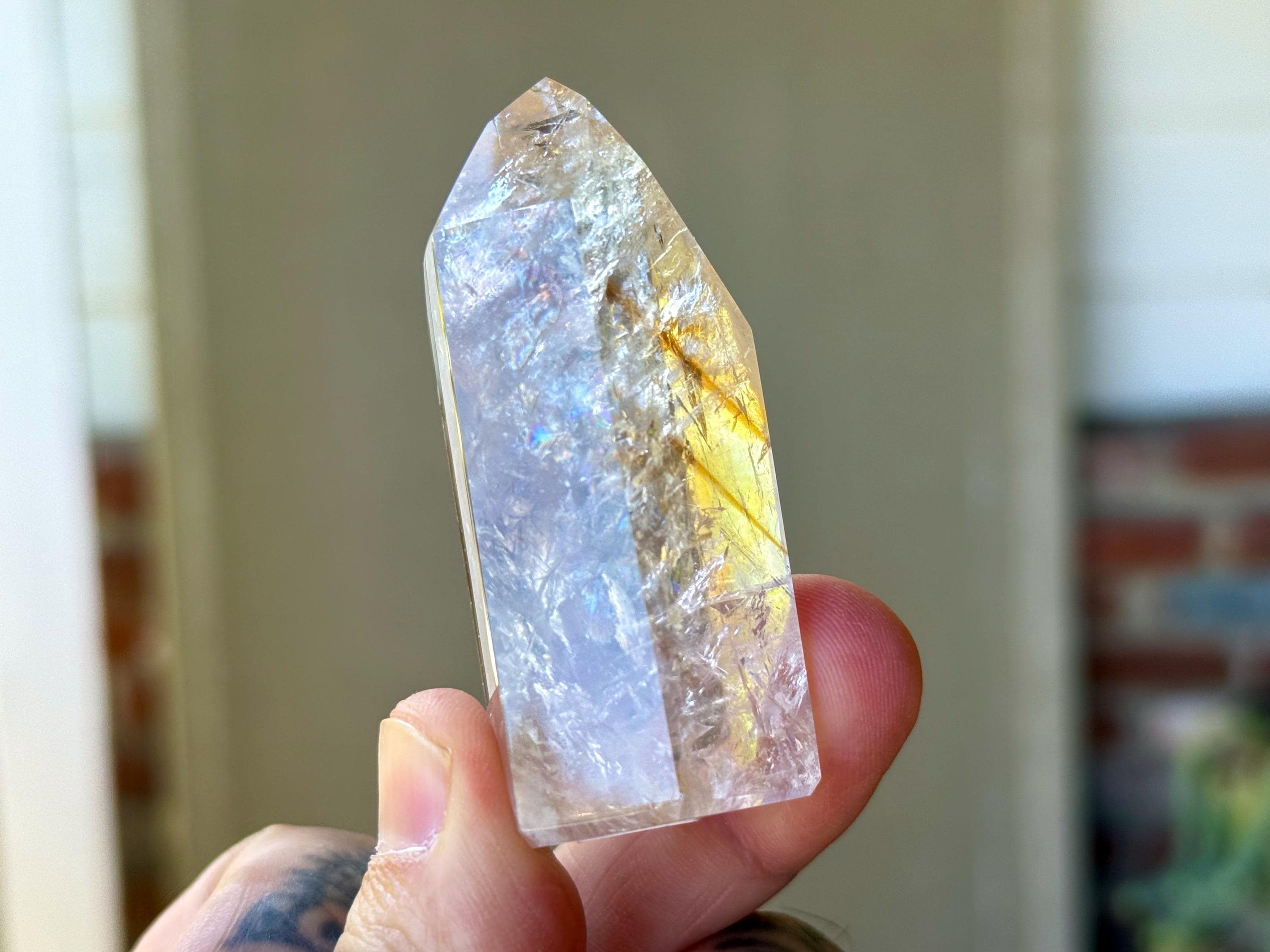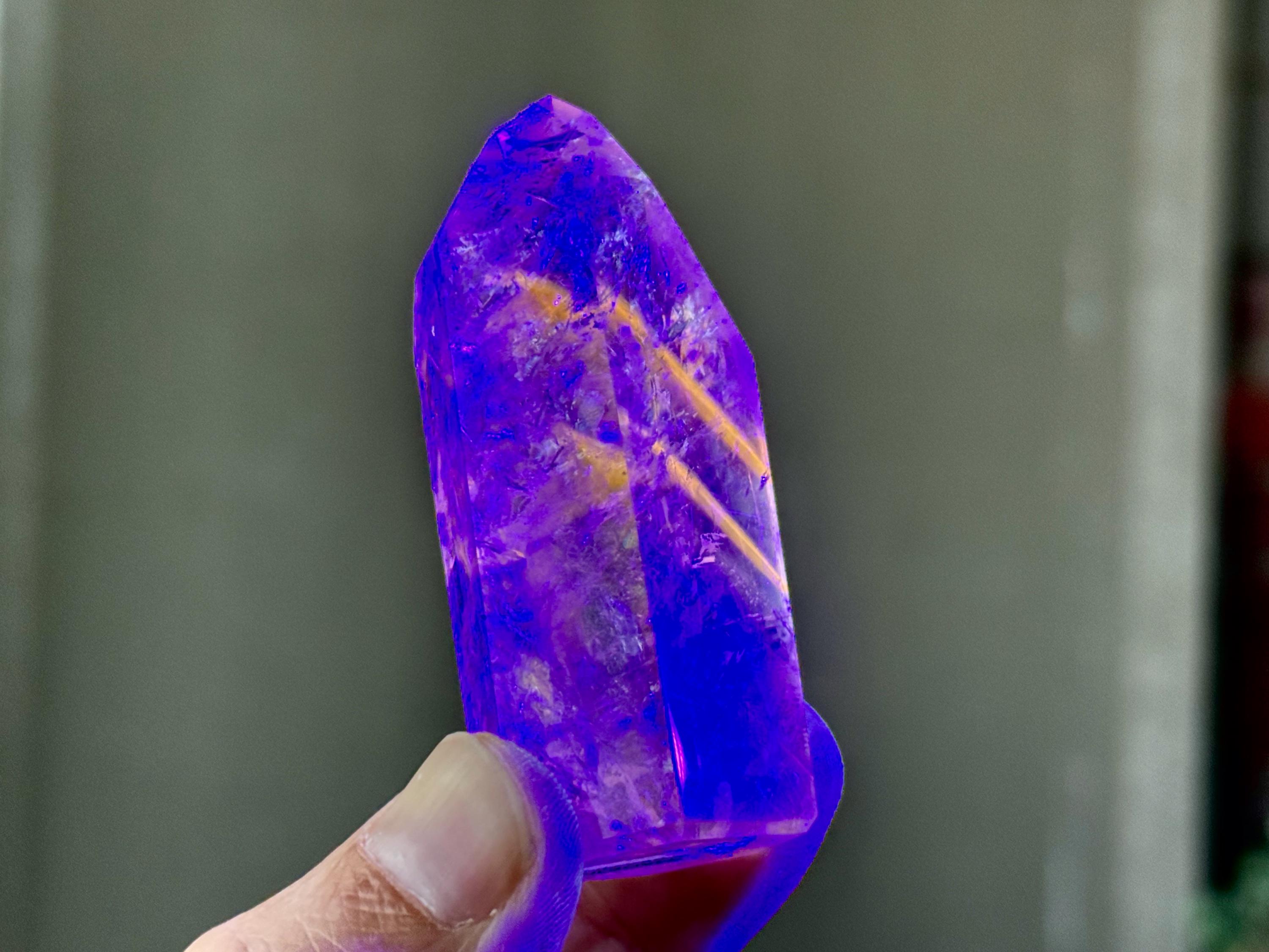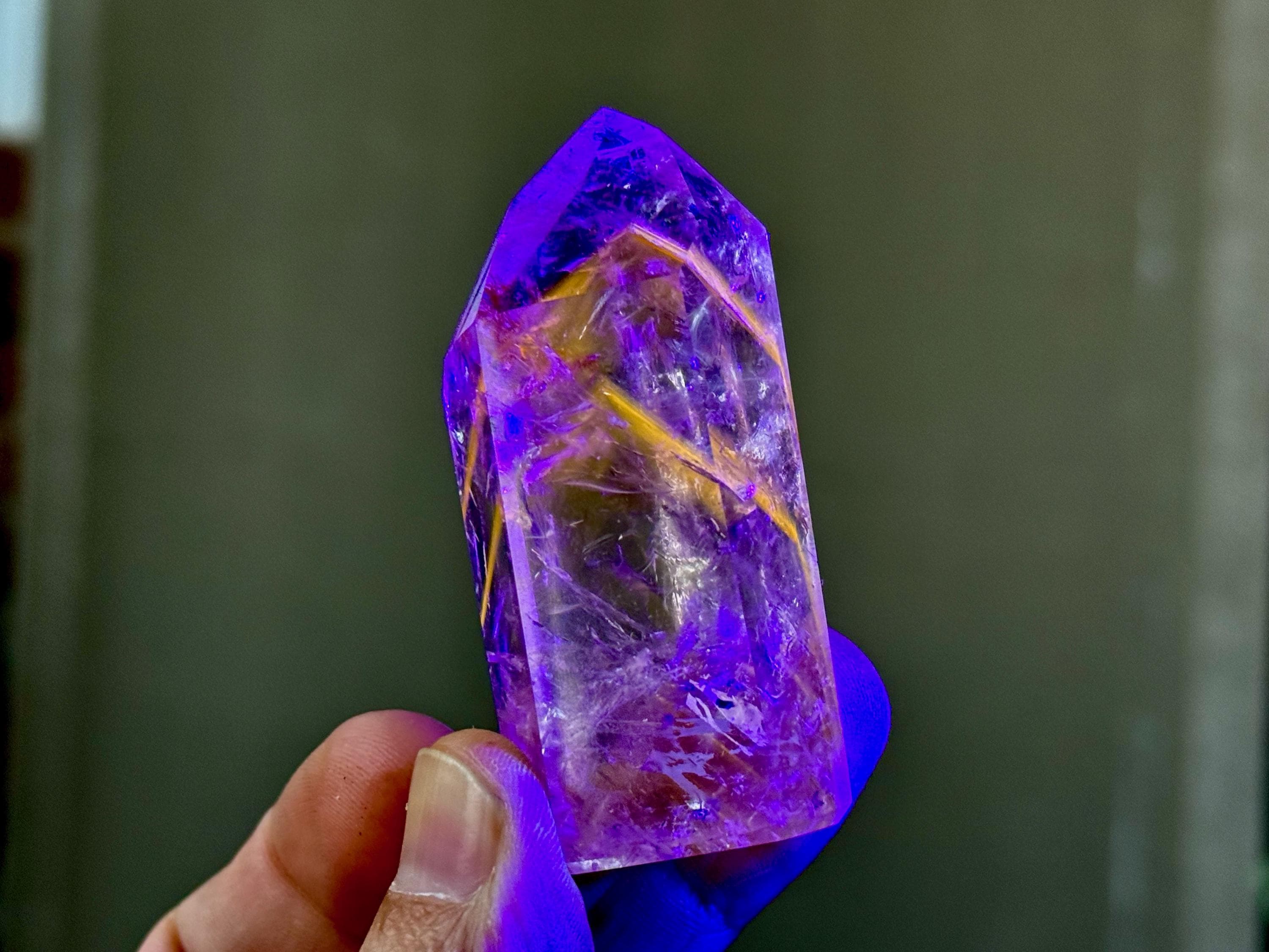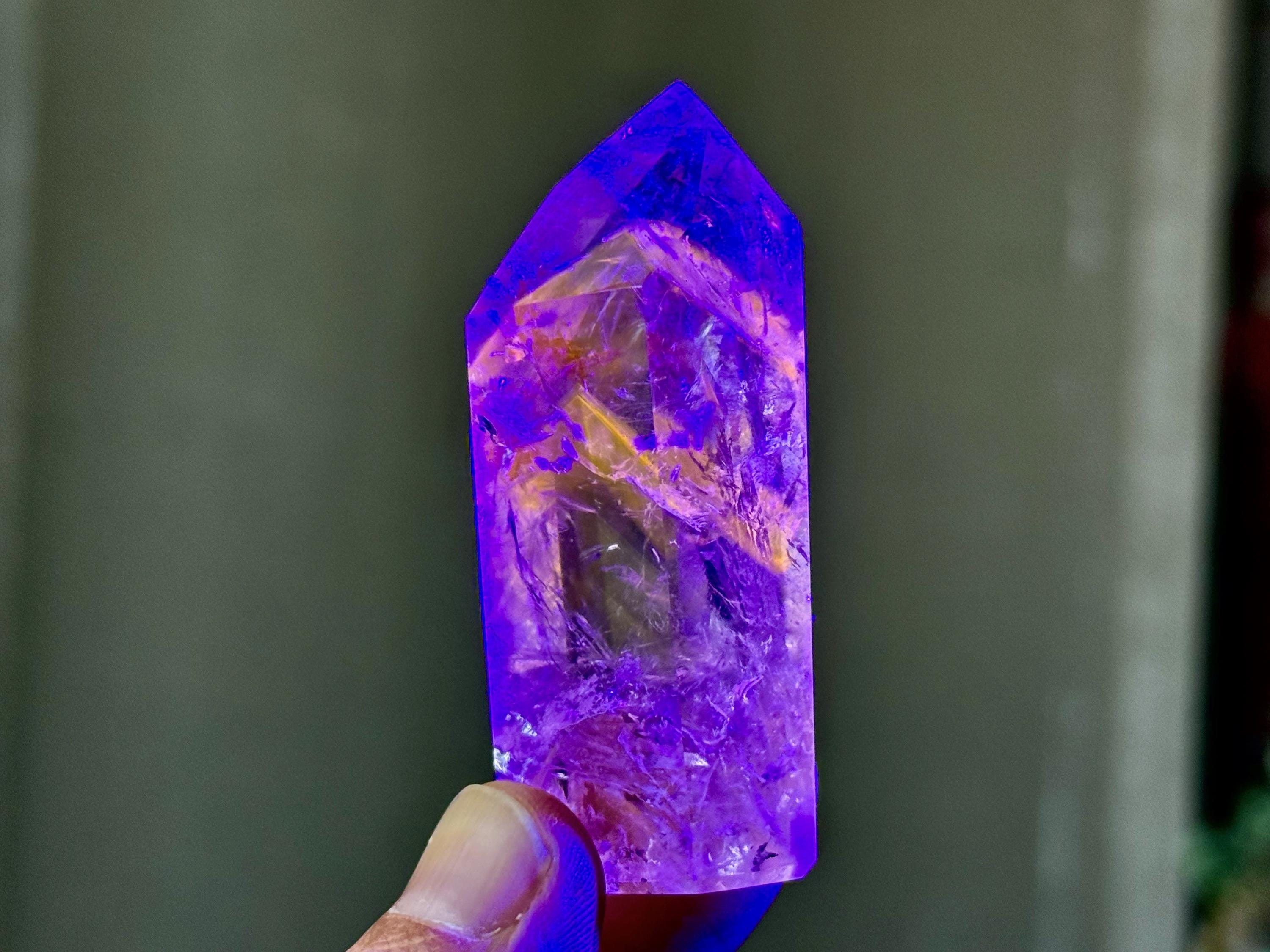 **Please note, the inclusions in this crystal are all natural/untreated, but the exterior is polished and the base is cut to allow for self-standing. A UV light is necessary to see the phantoms glow, and they can be found affordably at Amazon or any other online outlet. Also, please note that the dark purple hues in the UV-lit photos are a result of the UV light itself and not the color of the crystal. The natural color is shown in the natural-light photos included in this listing.