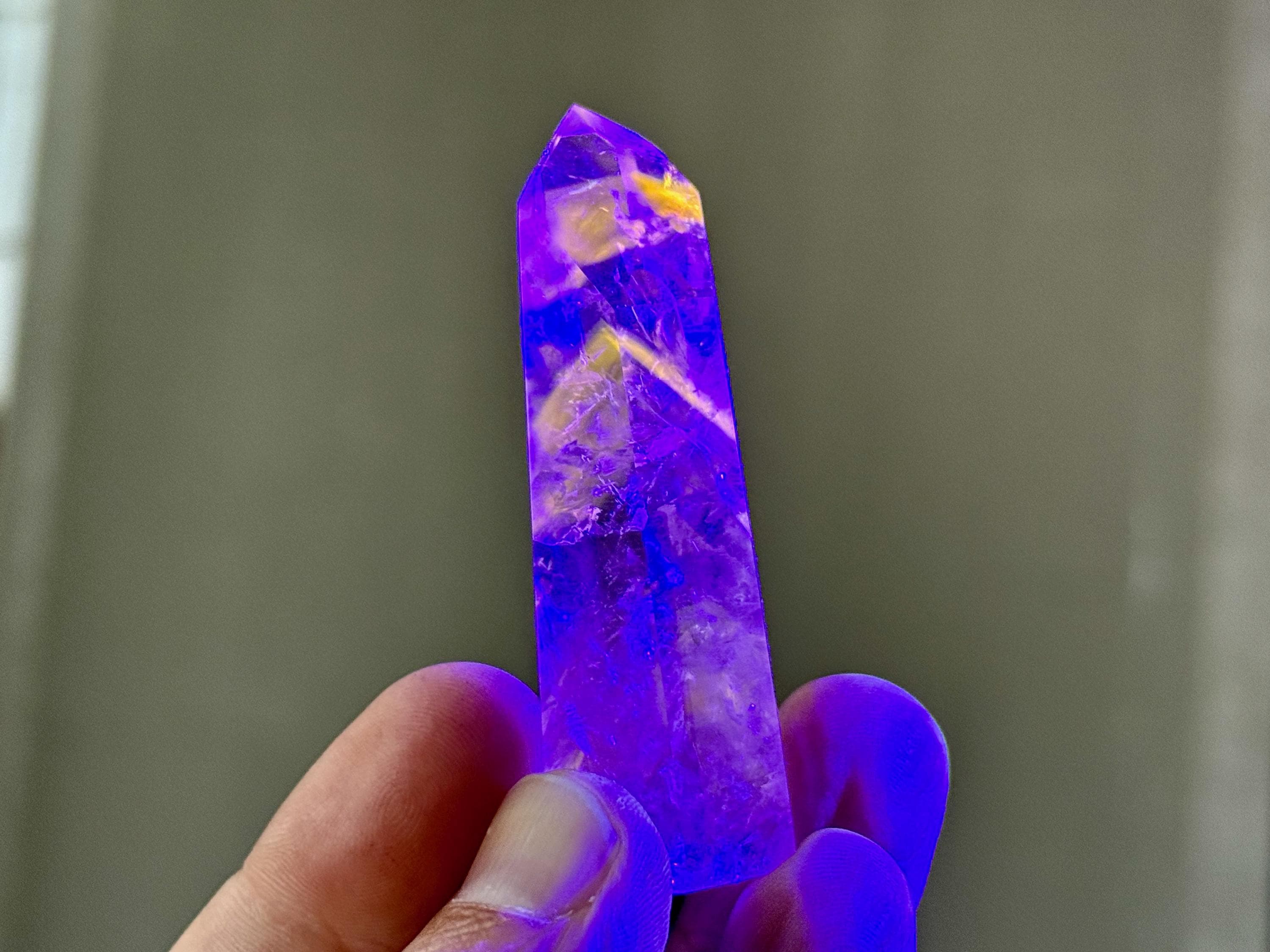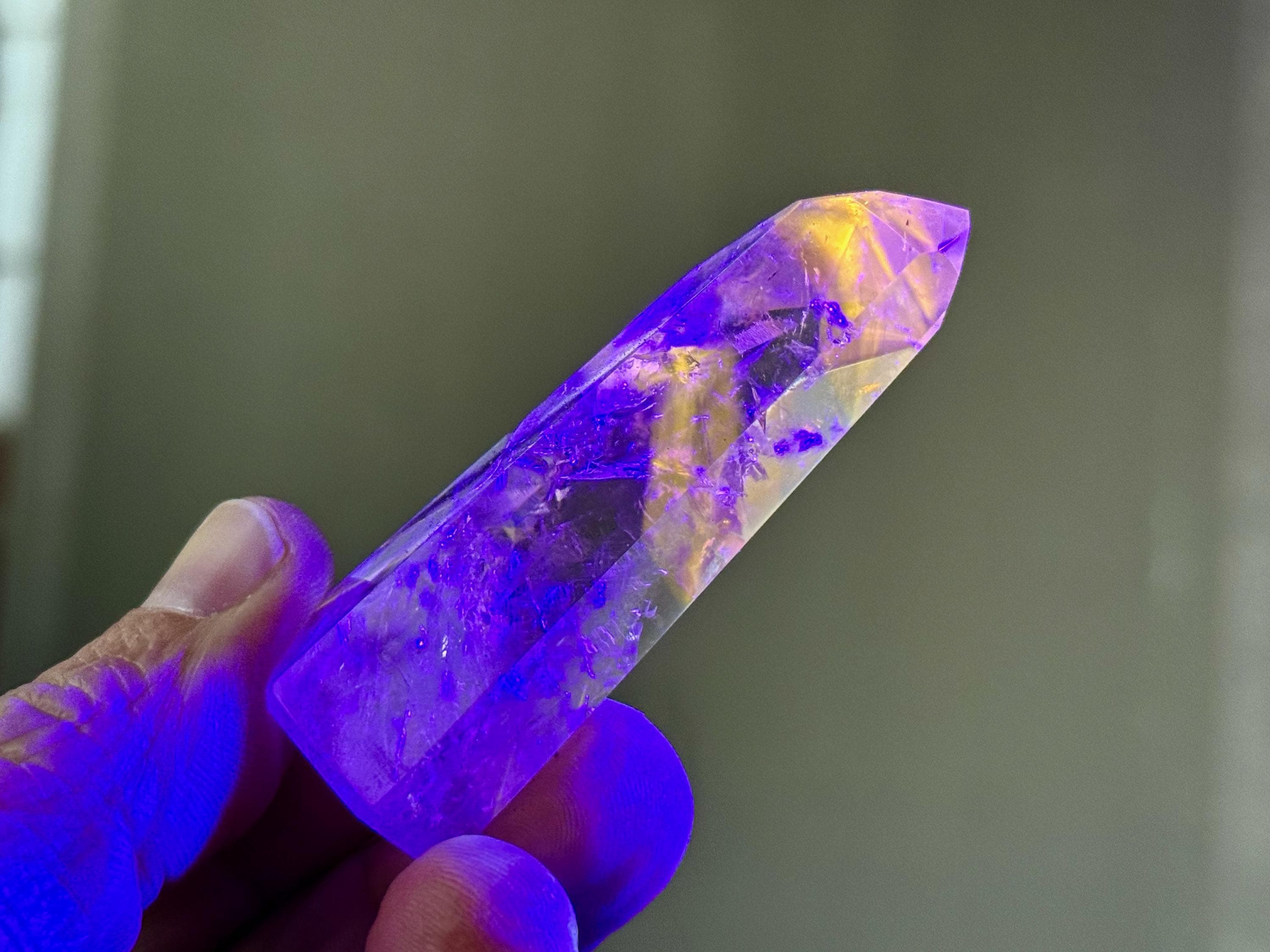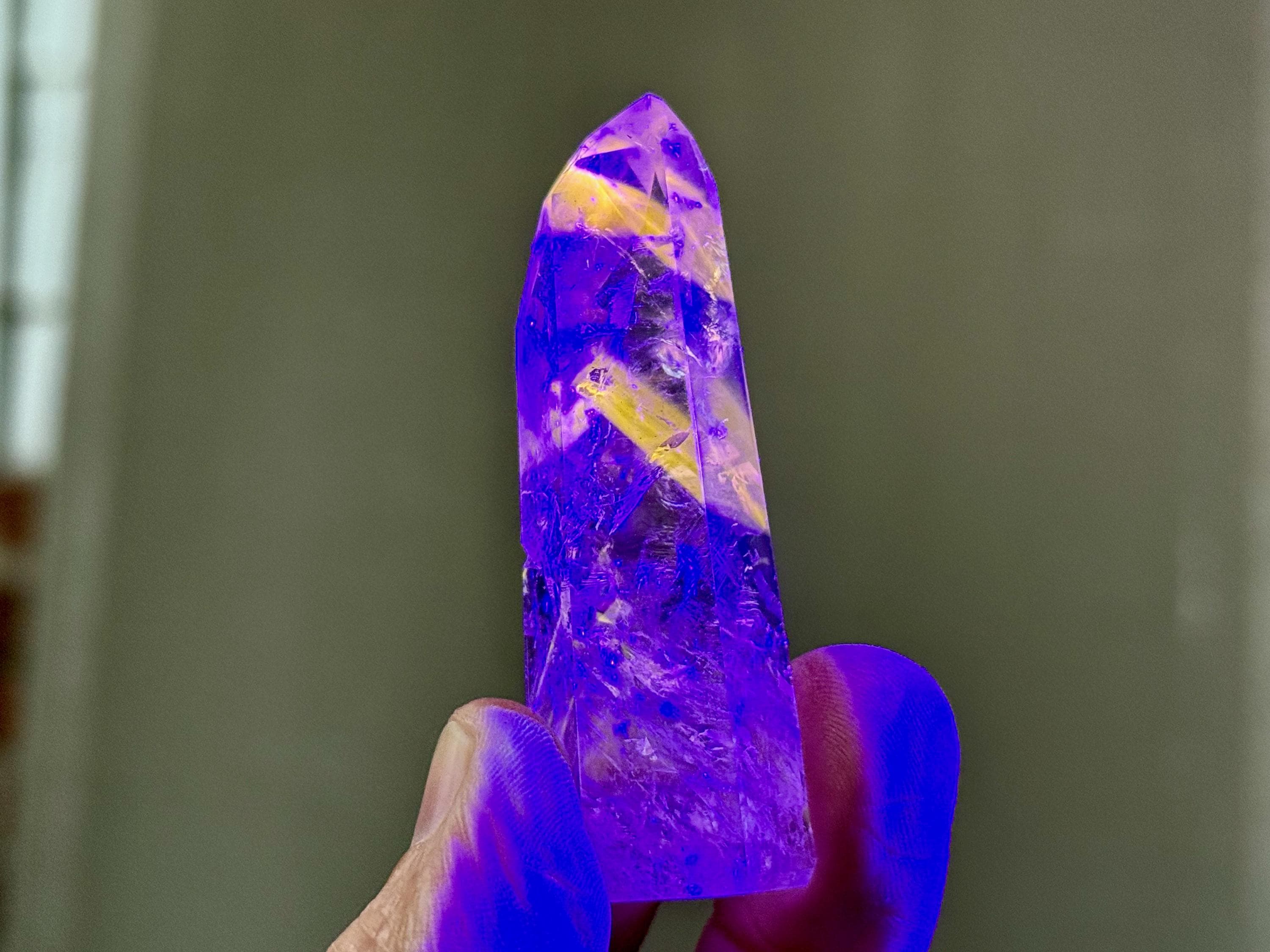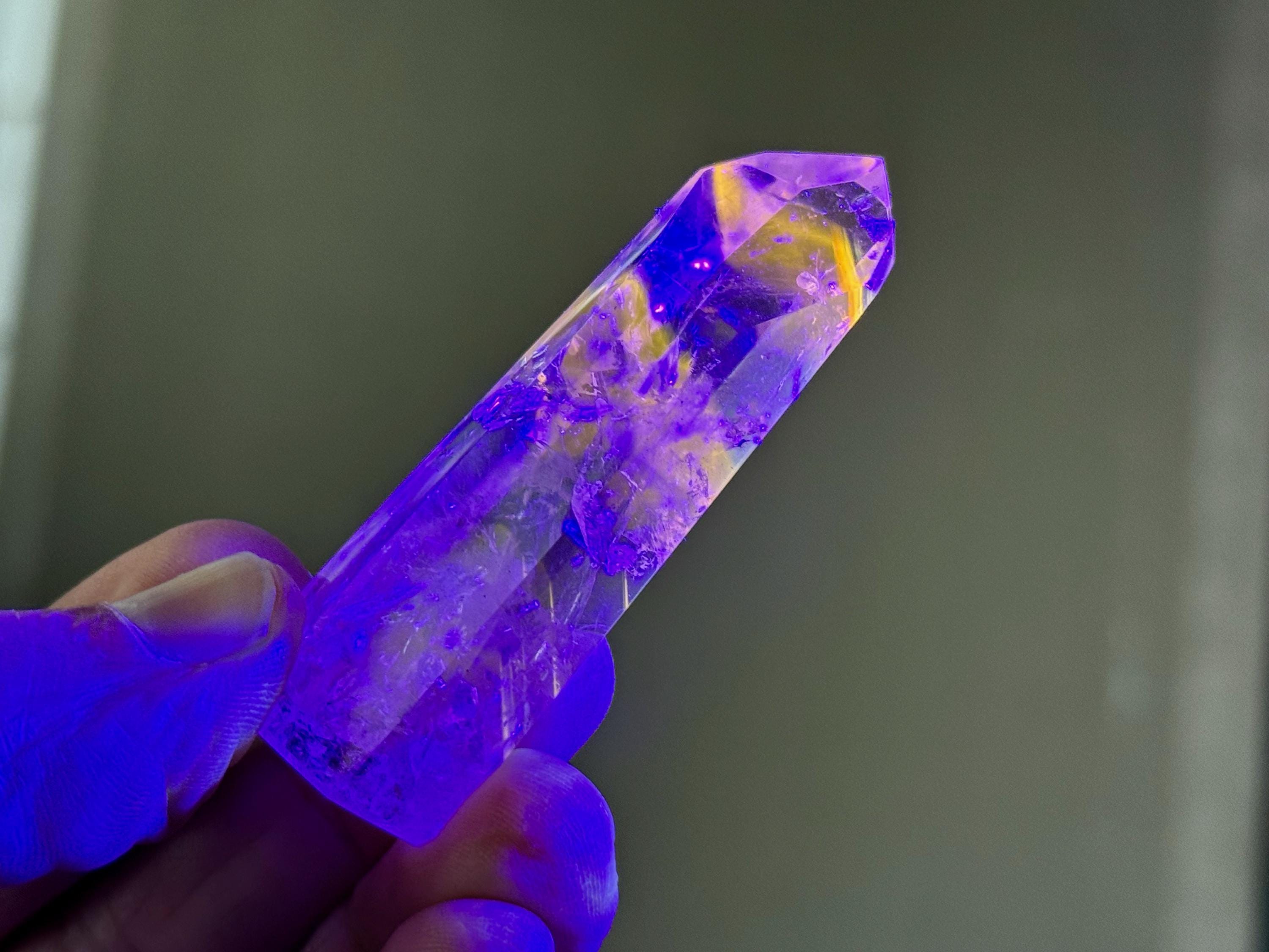 **Please note, the inclusions in this crystal are all natural/untreated, but the exterior is polished and the base is cut to allow for self-standing. A UV light is necessary to see the phantoms glow, and they can be found affordably at Amazon or any other online outlet. Also, please note that the dark purple hues in the UV-lit photos are a result of the UV light itself and not the color of the crystal. The natural color is shown in the natural-light photos included in this listing.