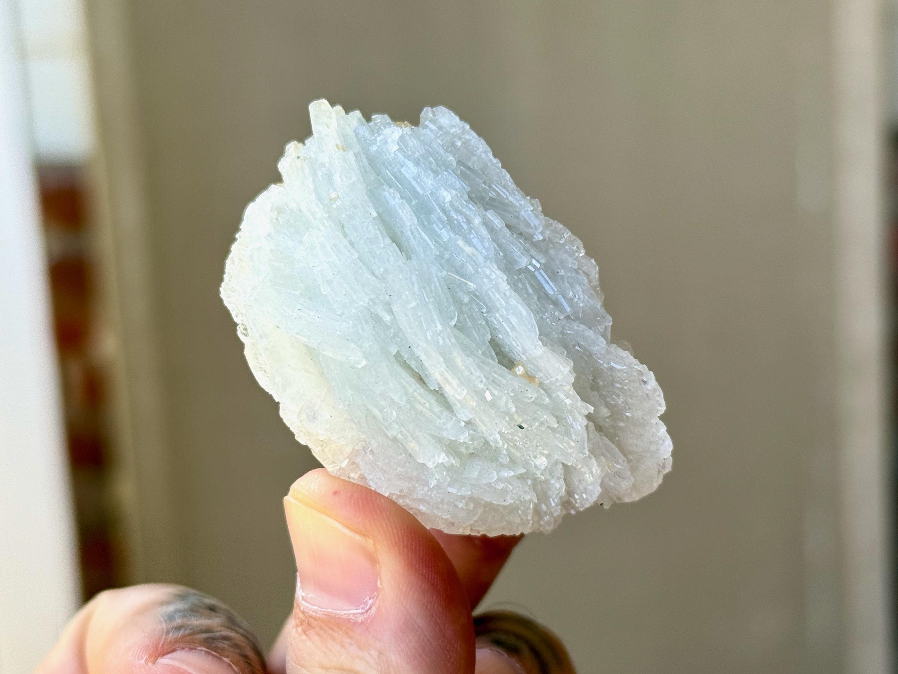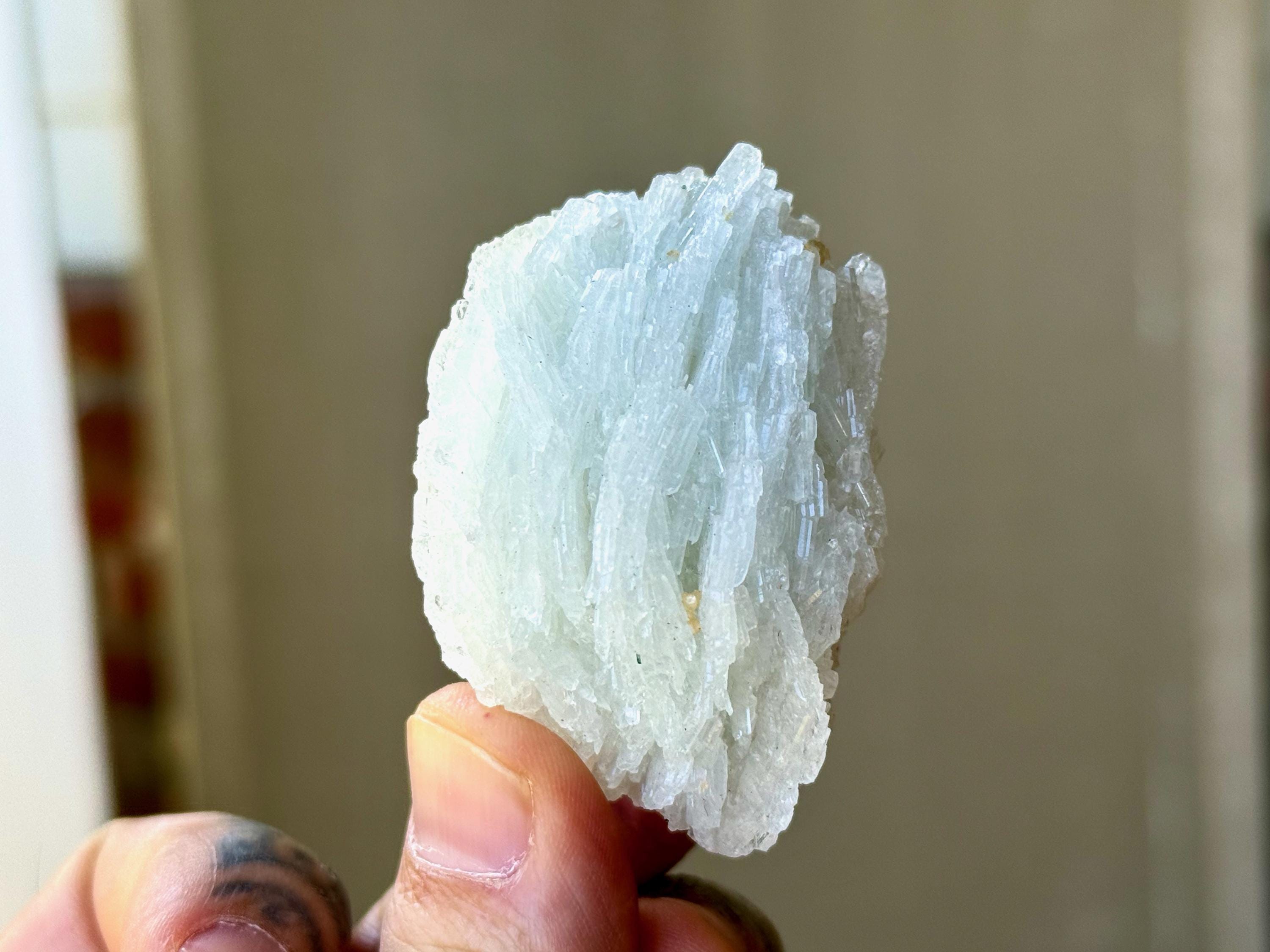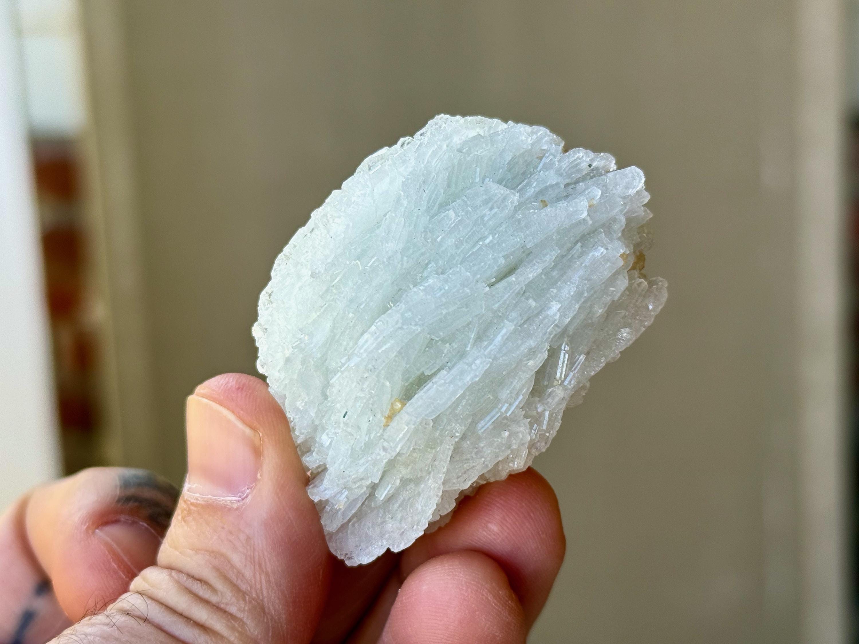 This icy Cleavelandite crystal comes from a recent (2025) find in Coronel Murta, Minas Gerais, Brazil. Cleavelandite assists in focus when a profound change and/or circumstances are present, helping to embrace the change and move safely through it.