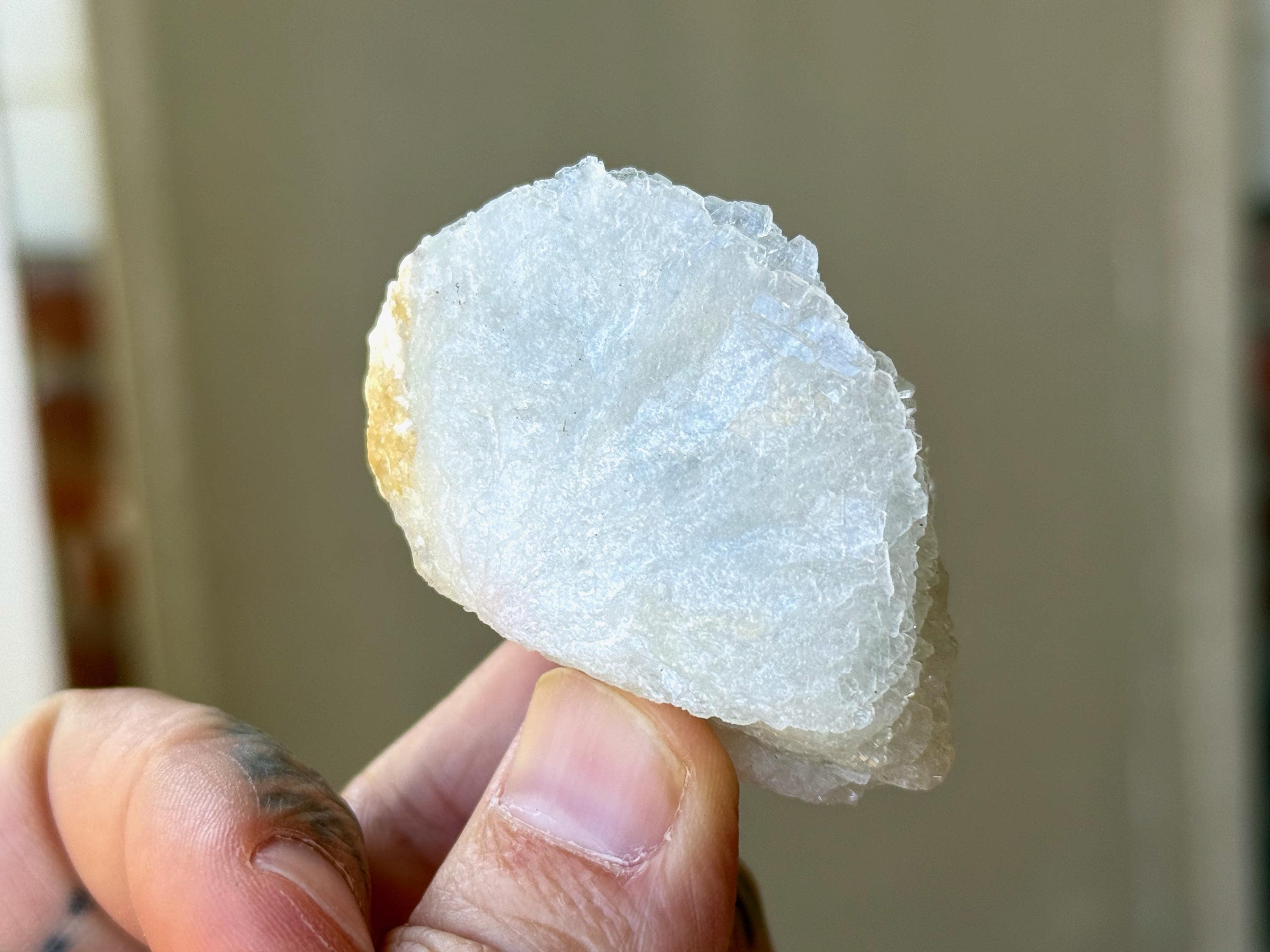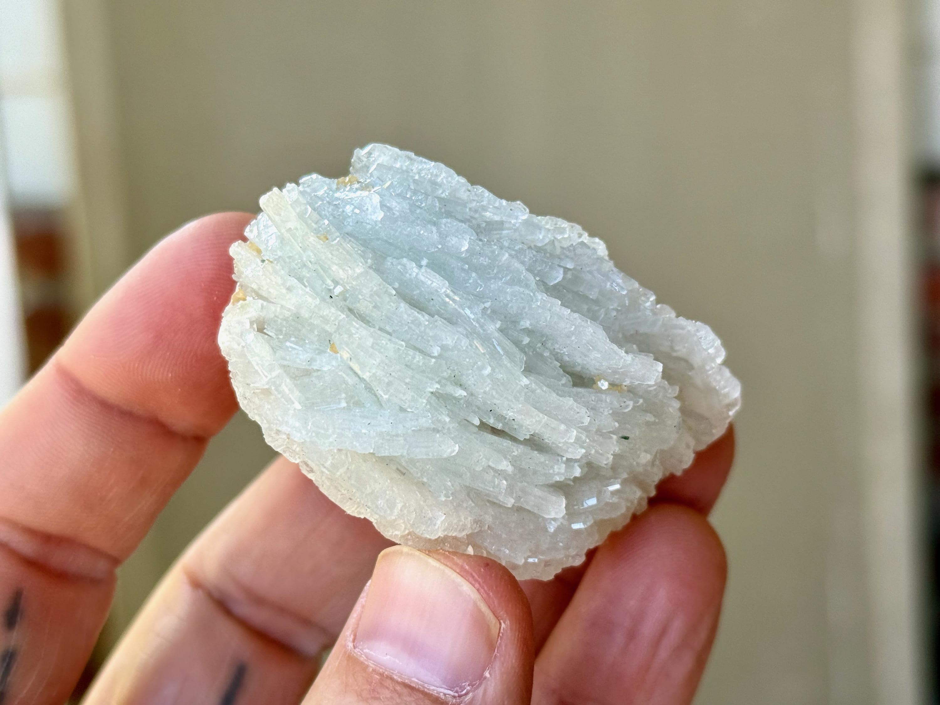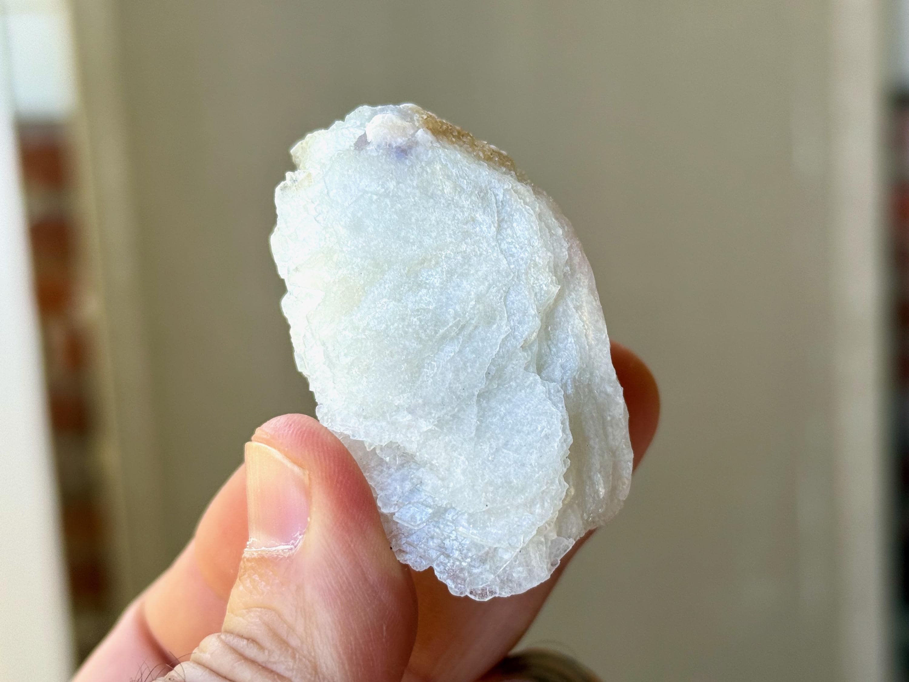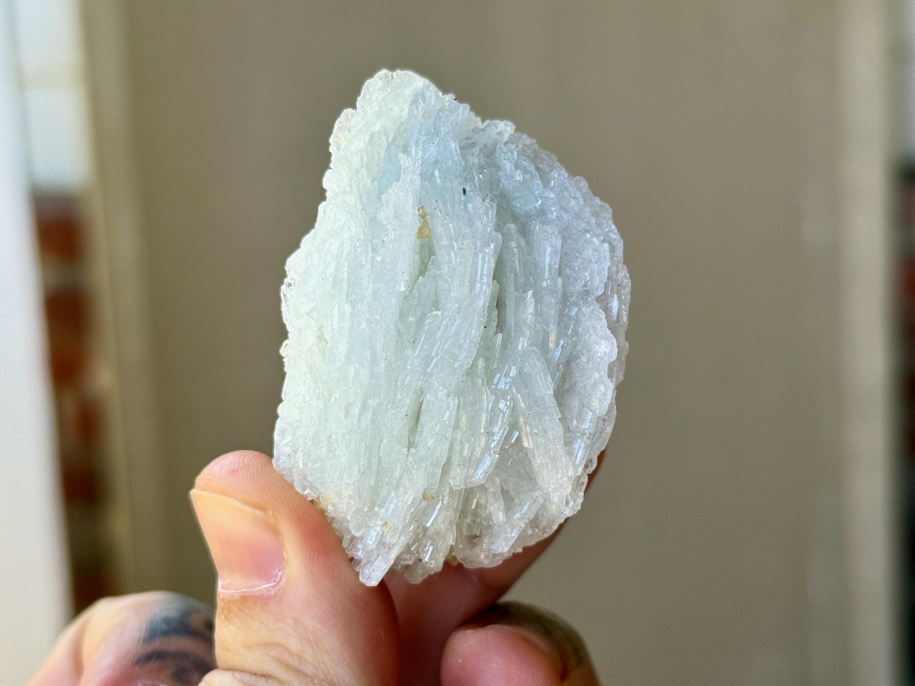 This icy Cleavelandite crystal comes from a recent (2025) find in Coronel Murta, Minas Gerais, Brazil. Cleavelandite assists in focus when a profound change and/or circumstances are present, helping to embrace the change and move safely through it.