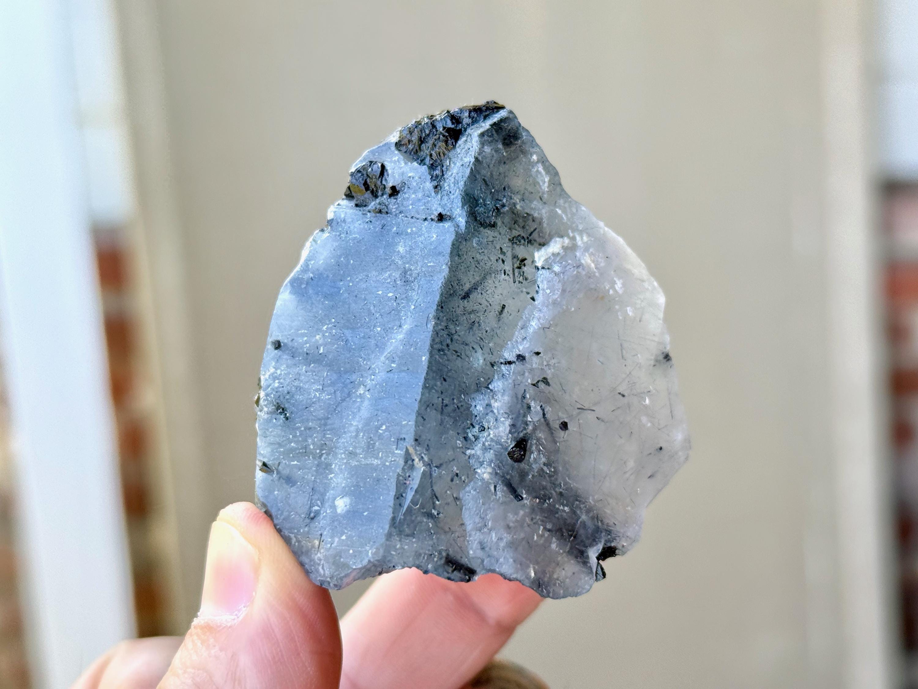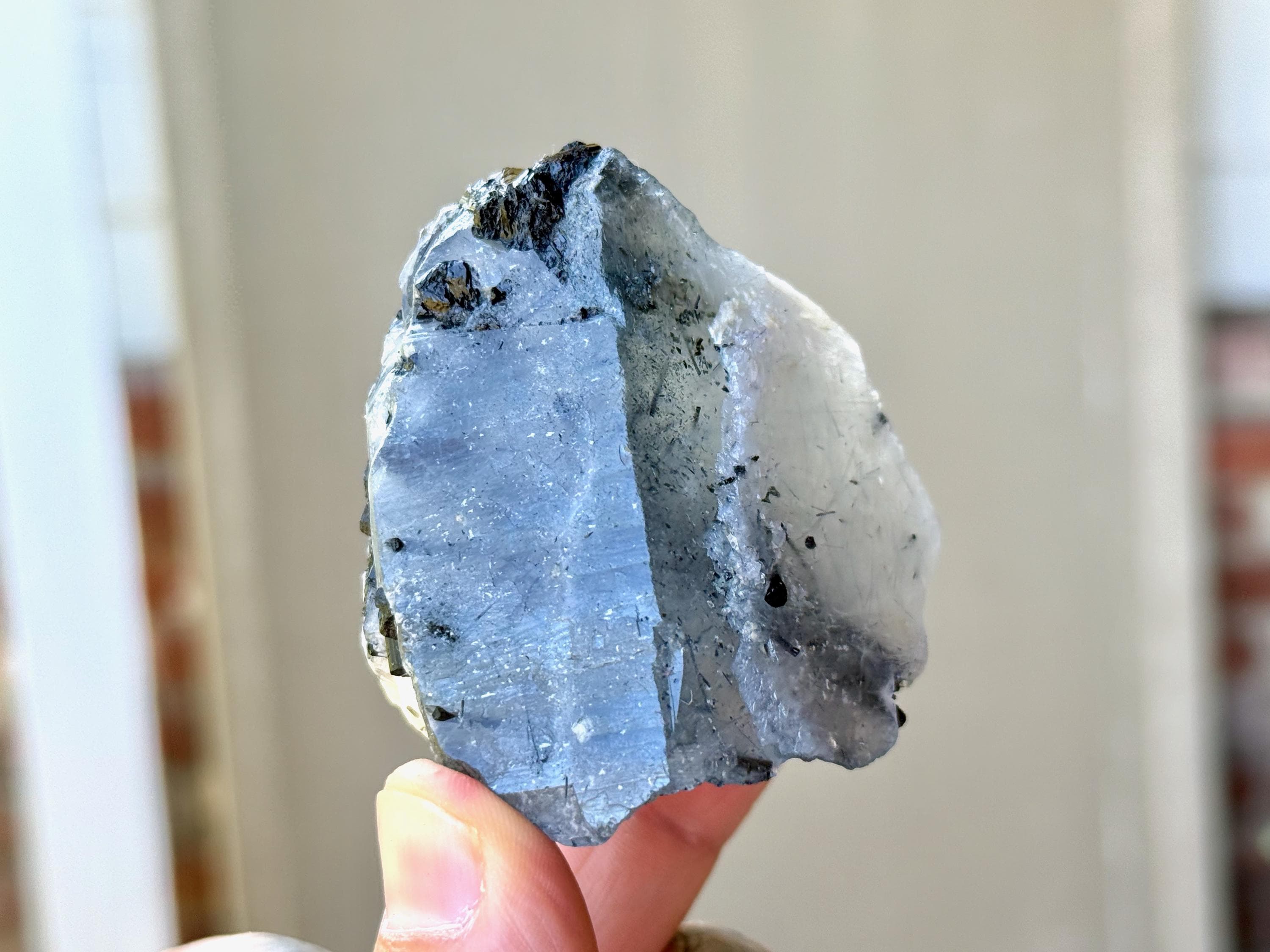 A little glacier of a crystal filled with dark Blue Tourmaline. This chunky crystal features a broad front side and loads of dark Blue Tourmaline within. When backlit, as in Photos 3-4, we can see it passes light nicely.