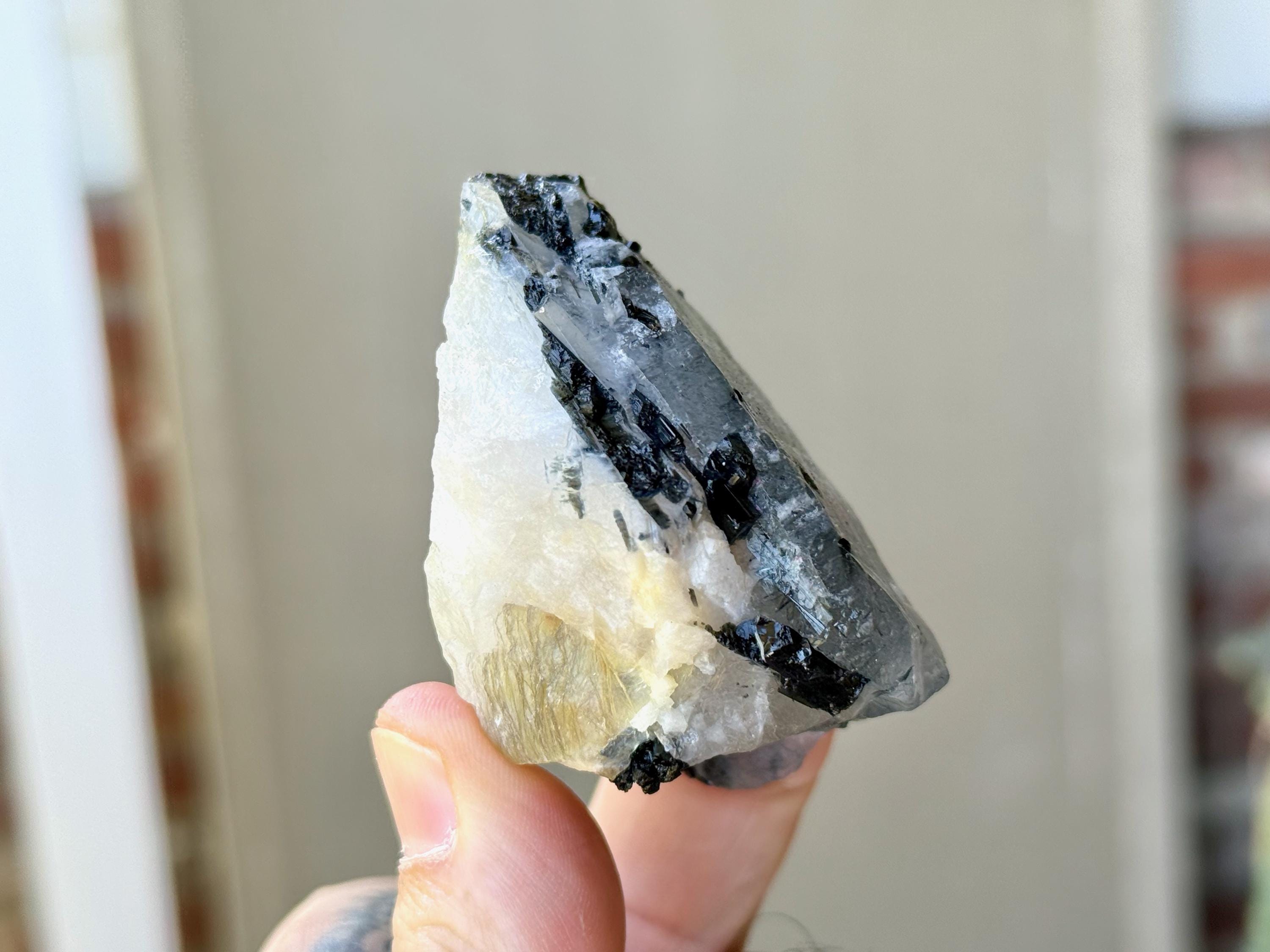 On the bottom in the back there's a small Golden Mica inclusion. The backside is largely a self-healed contact area. This crystal is not traditionally terminated, but it is intact all around. A nice icy crystal with lots of Tourmaline.