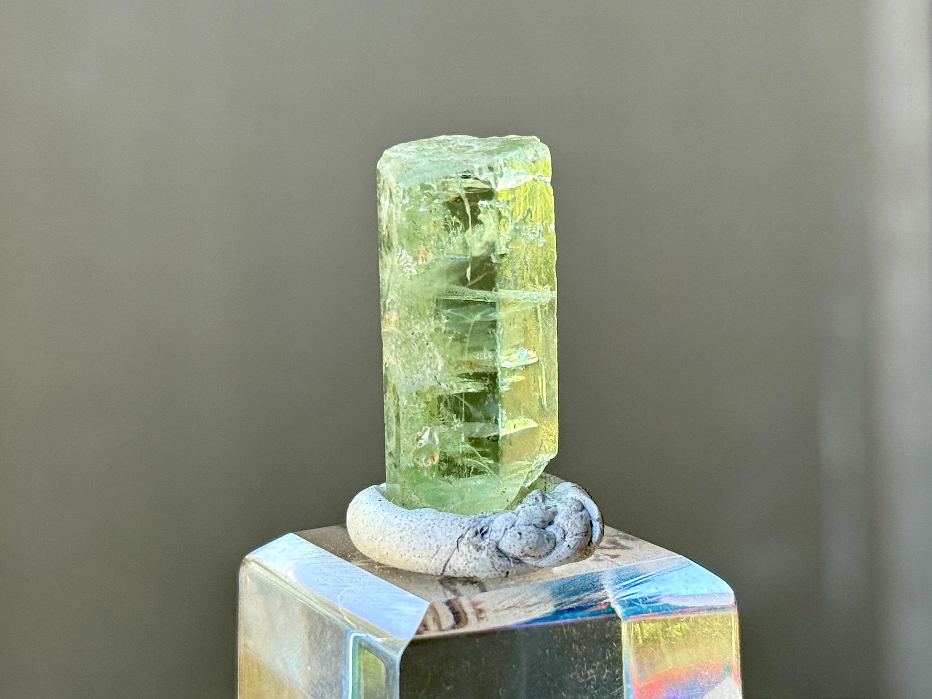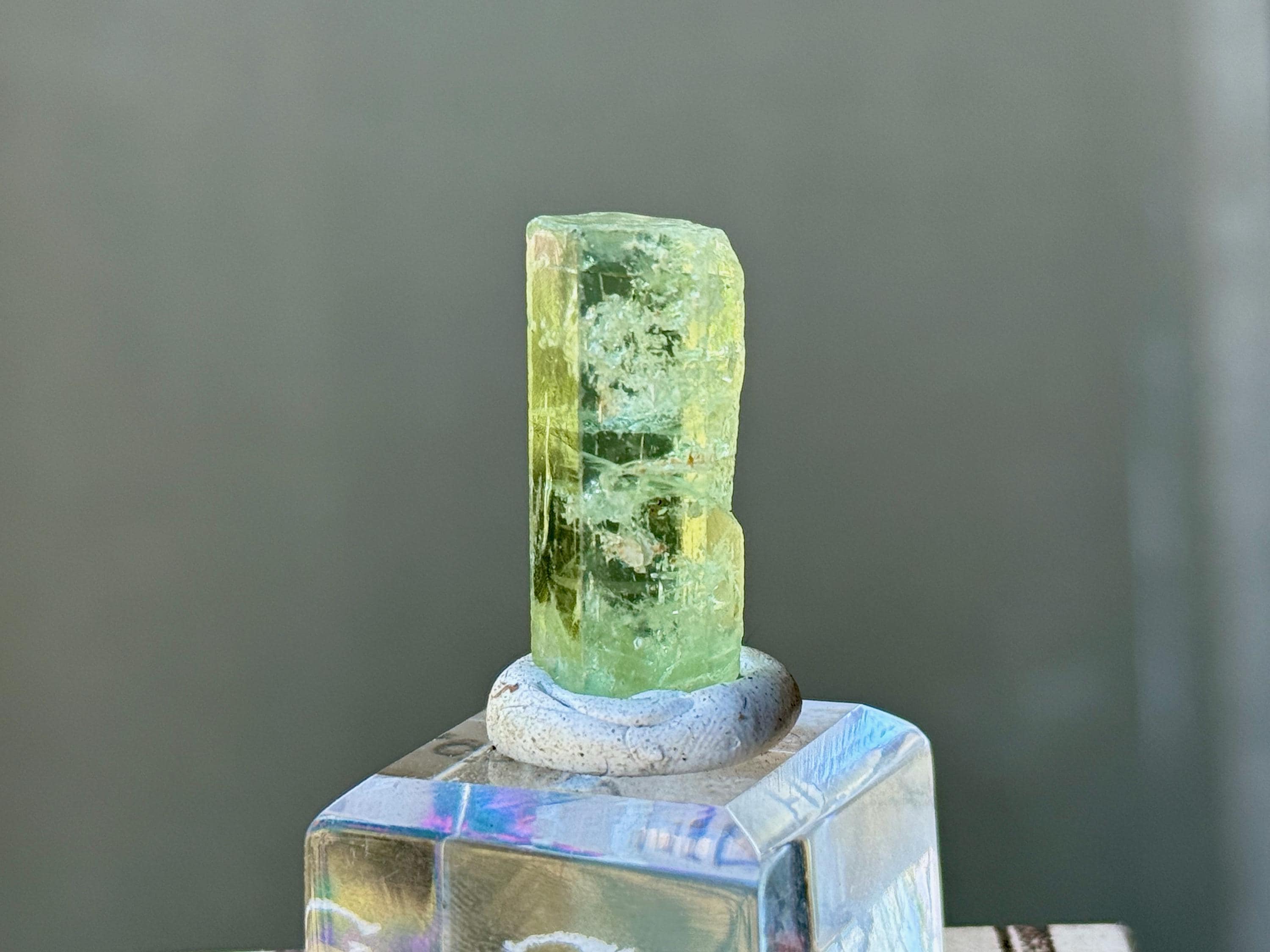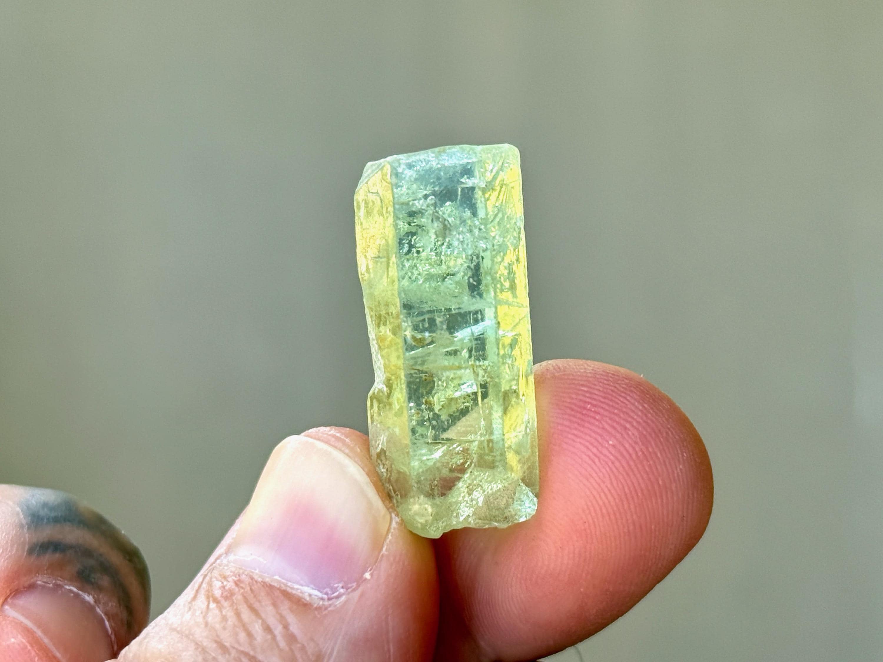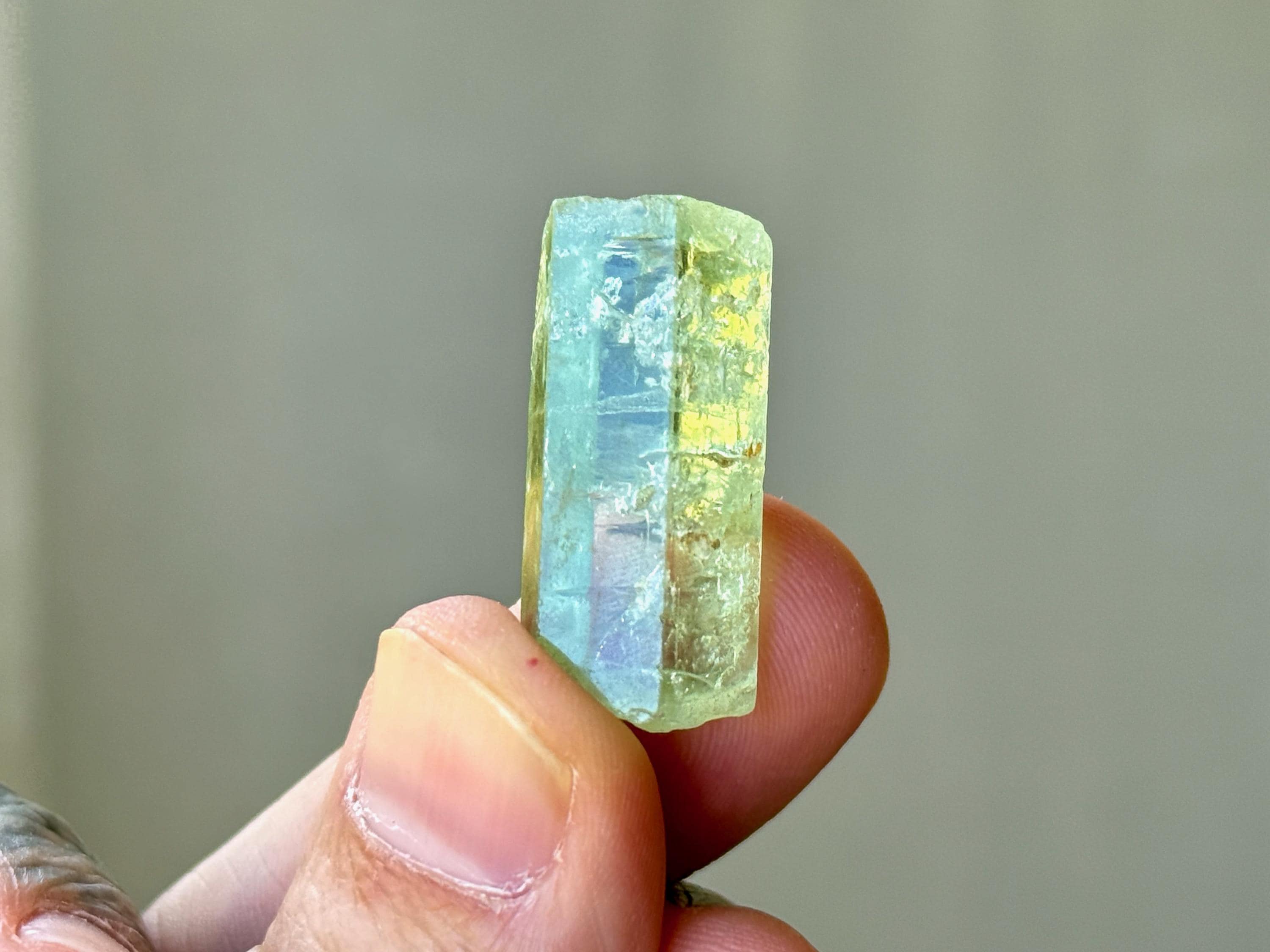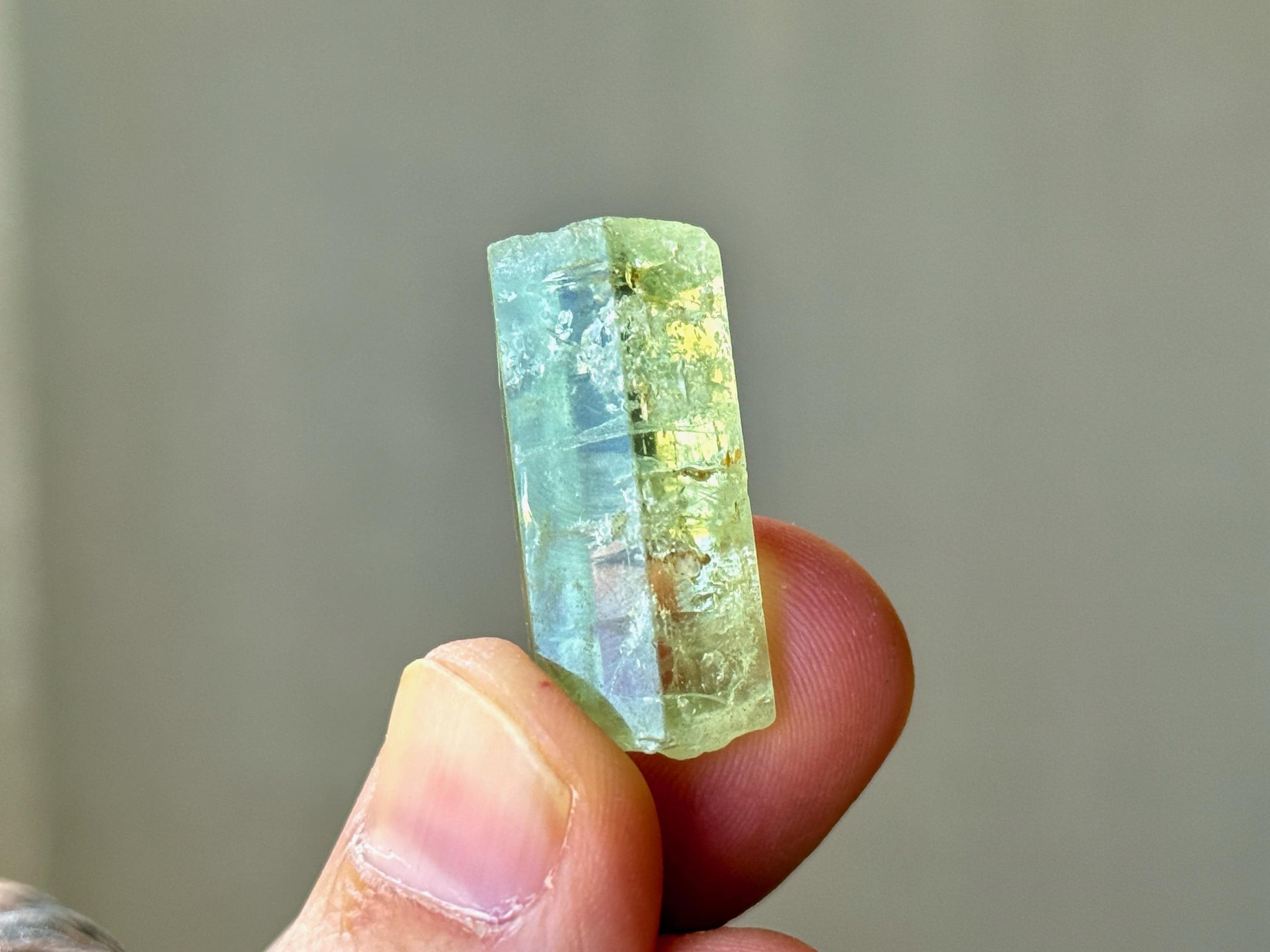 Water clear clarity and a beautiful blue-green-golden hue to this magnificent Aquador crystal. This crystal possesses a naturally hexagonal formation and superb luster.