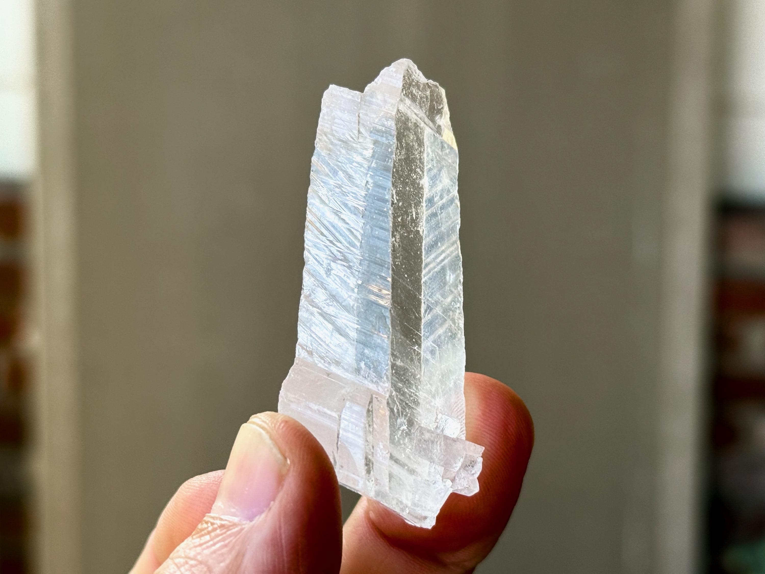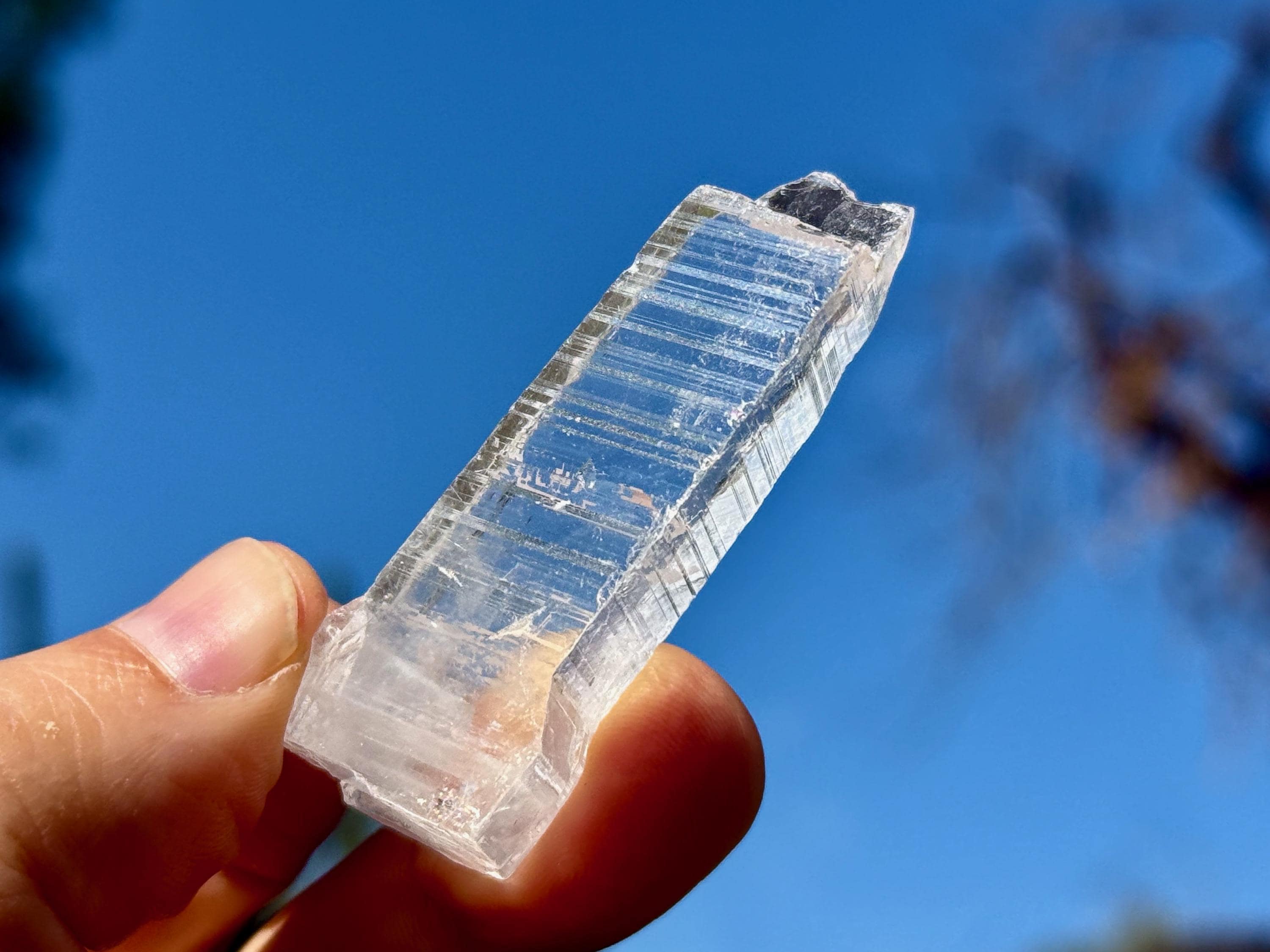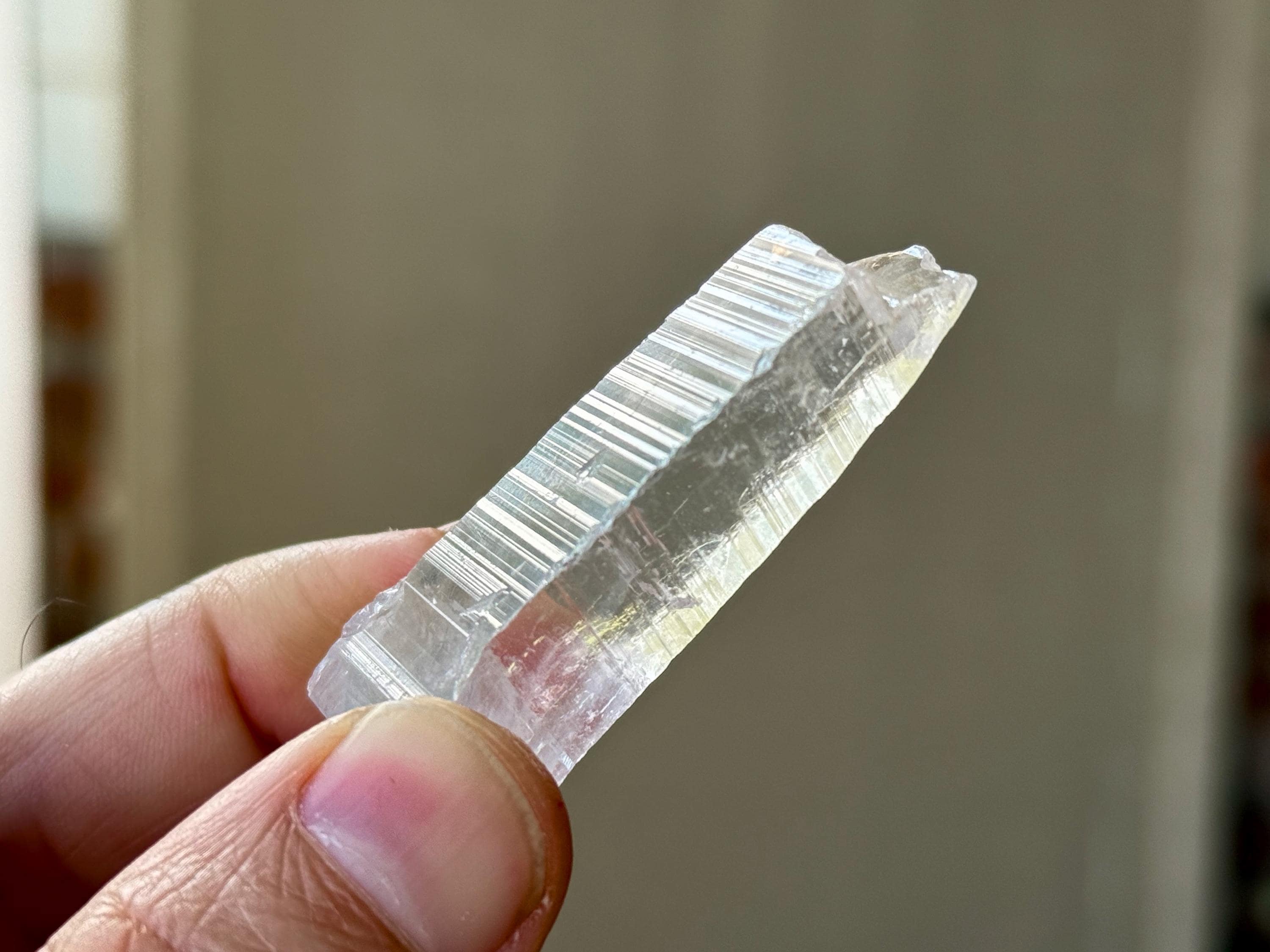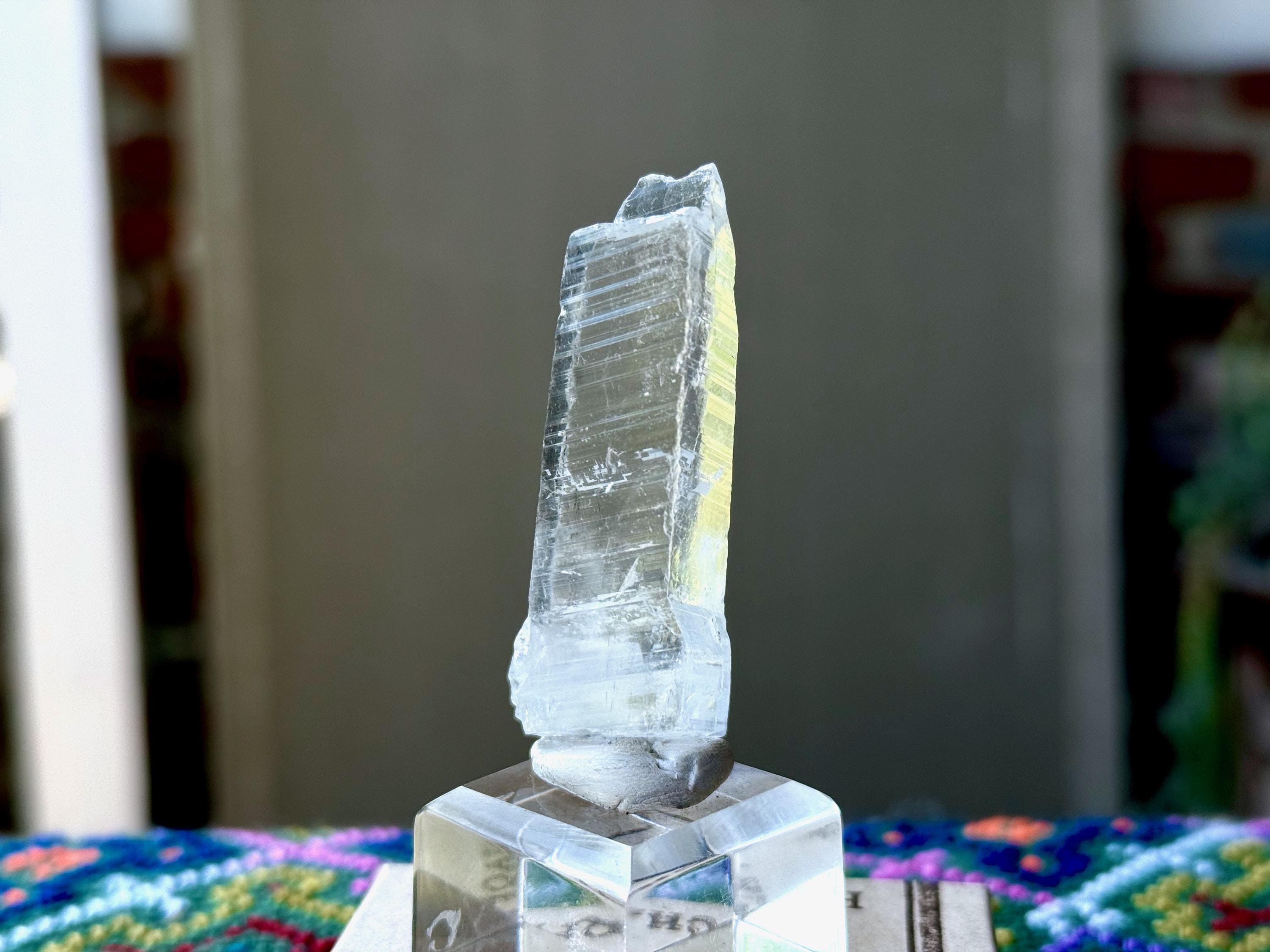 This crystal possesses water-clear clarity and brilliant luster with a glassy complexion and an aesthetic broad and elongated formation. On the exterior you'll find deeply defined diagonal striations on each of its front/right side.