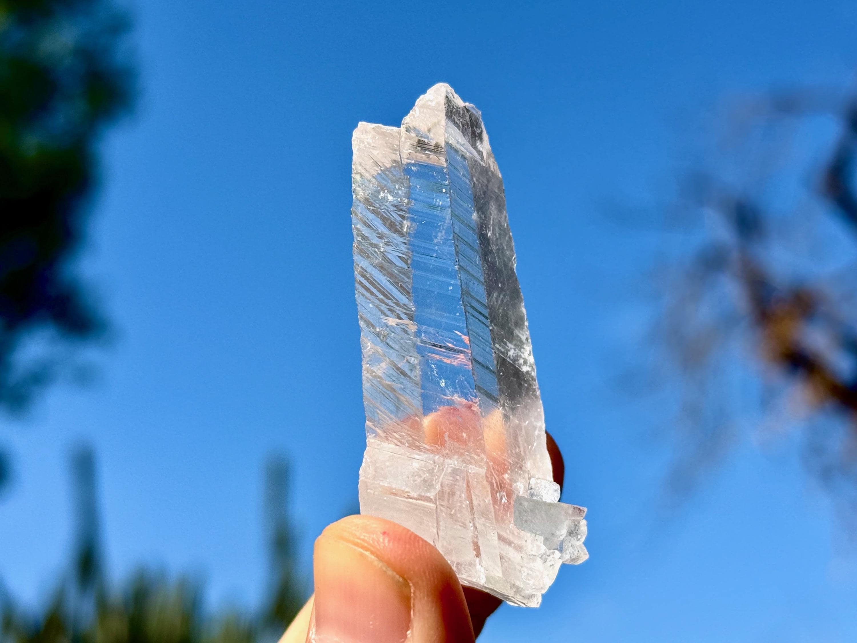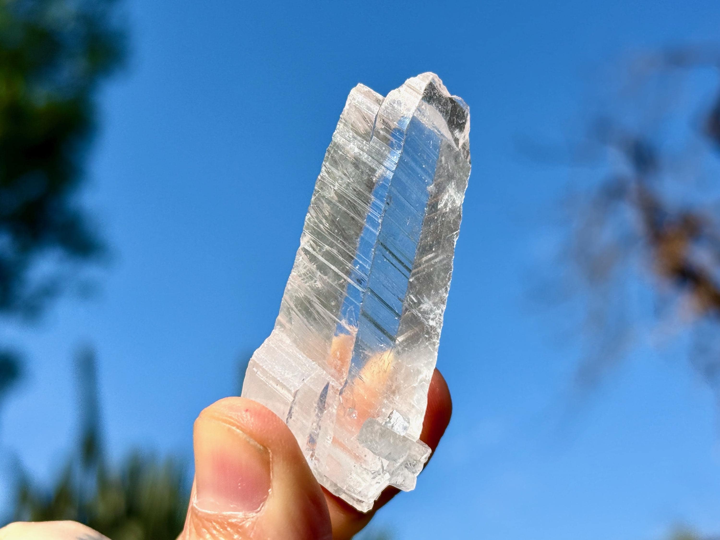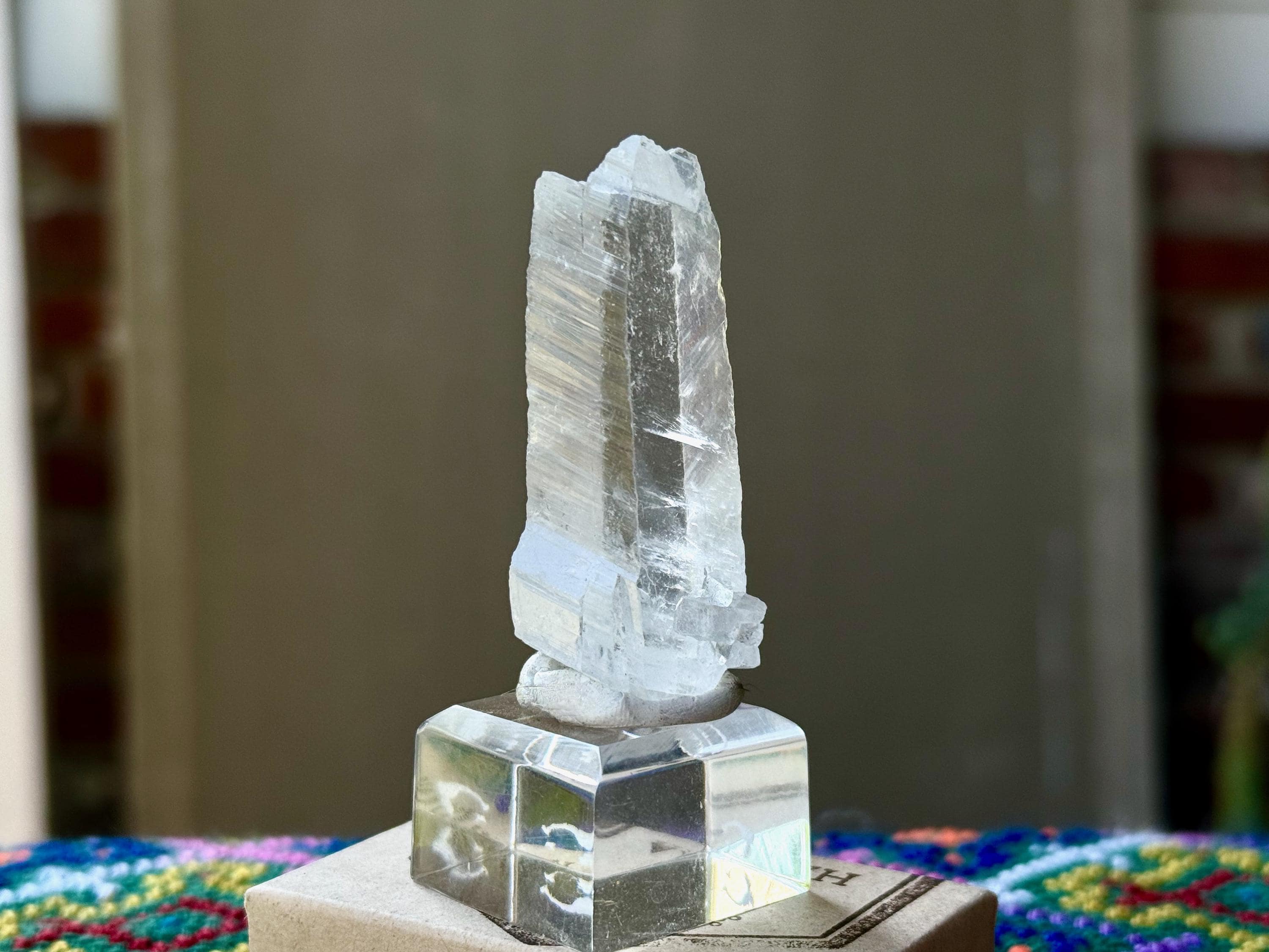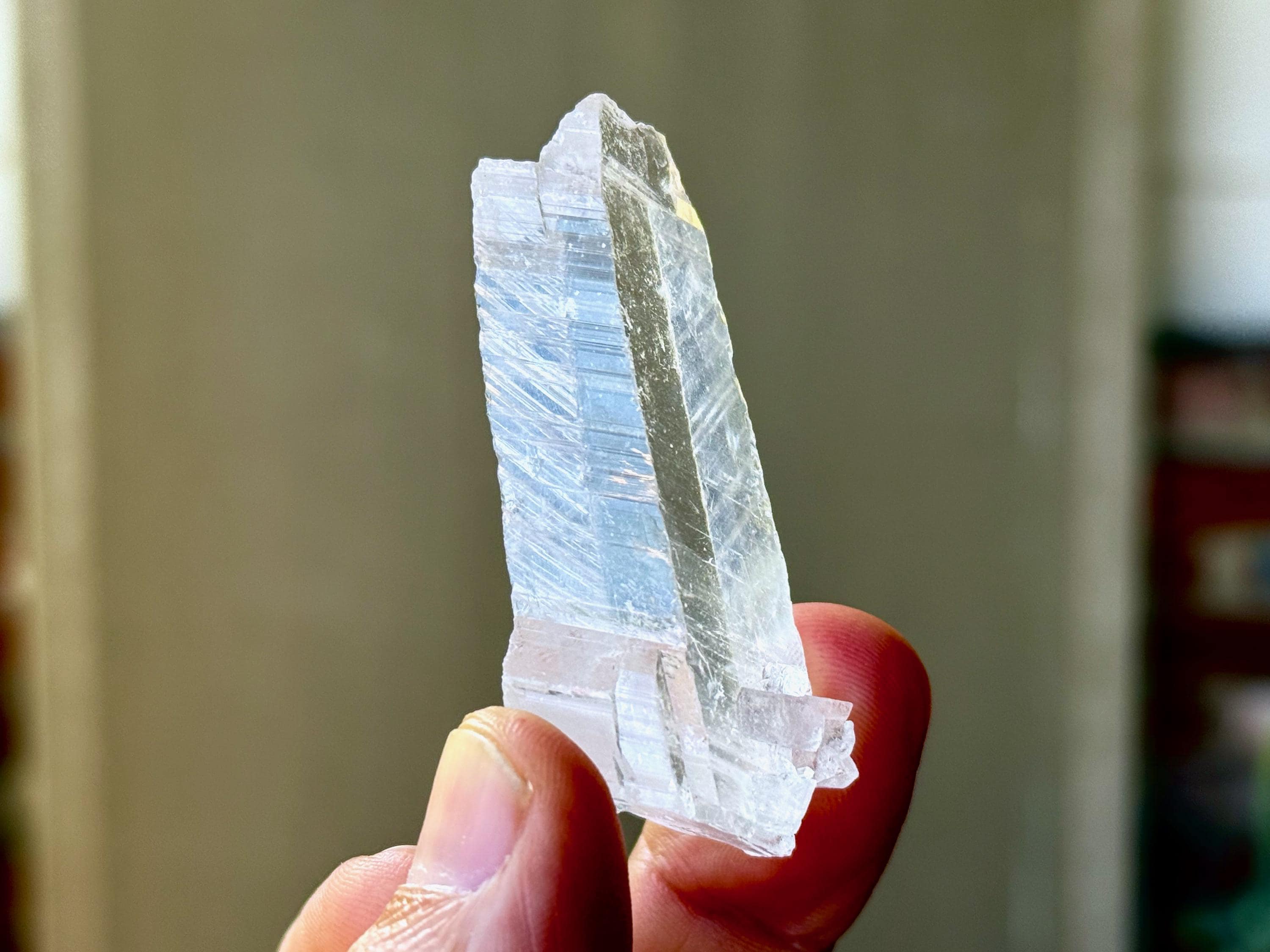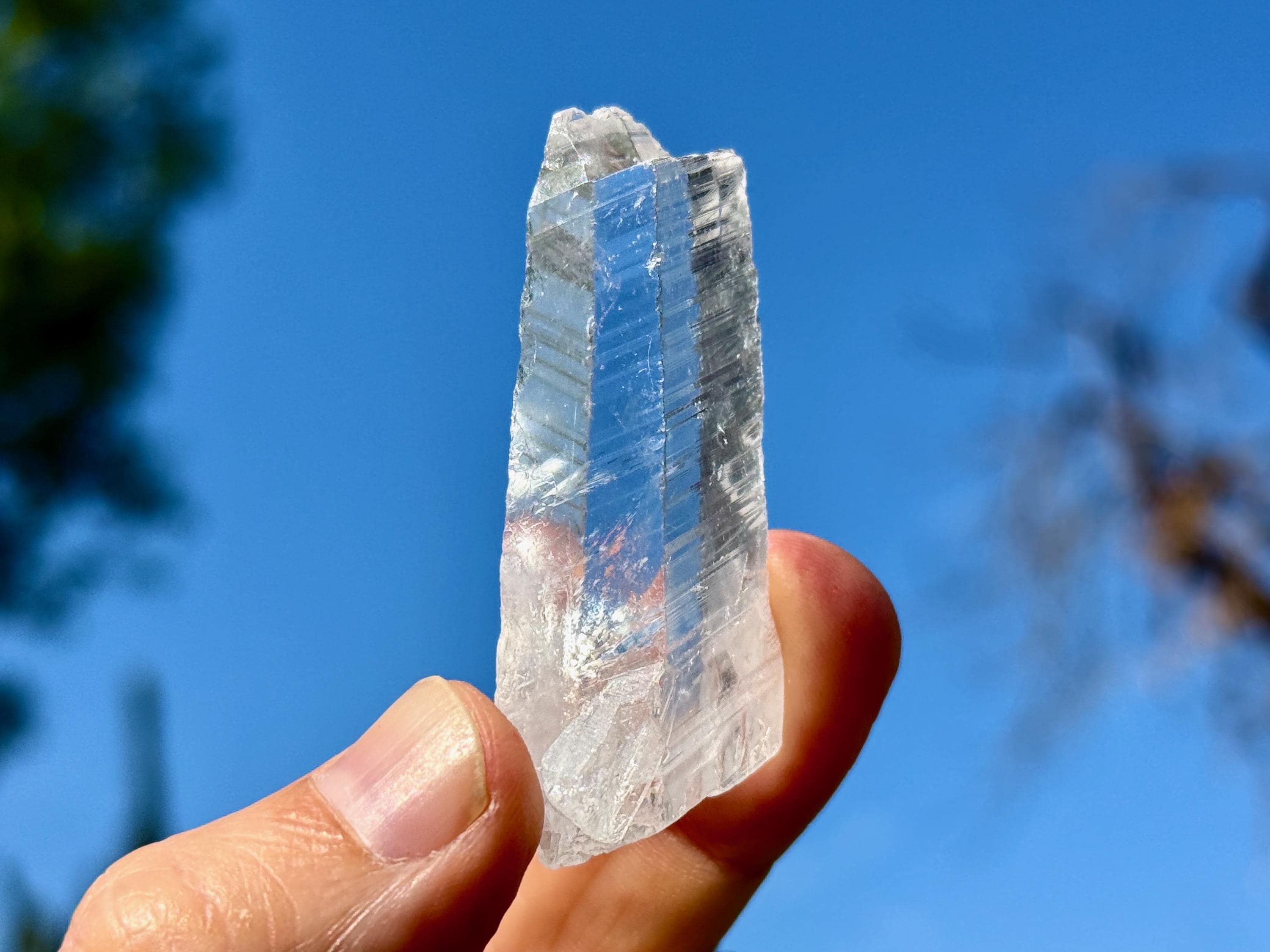 This crystal possesses water-clear clarity and brilliant luster with a glassy complexion and an aesthetic broad and elongated formation. On the exterior you'll find deeply defined diagonal striations on each of its front/right side.