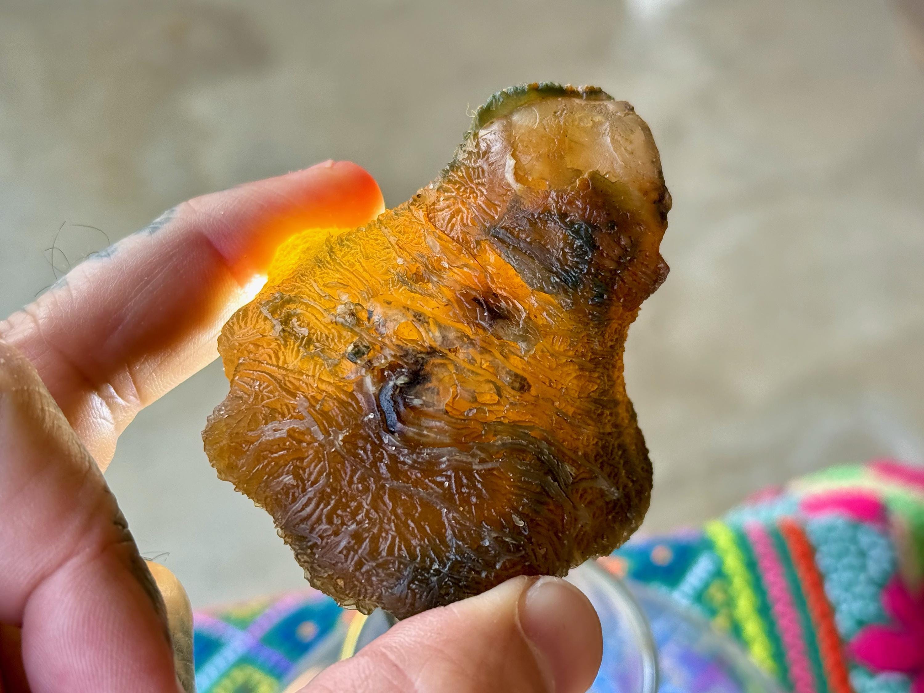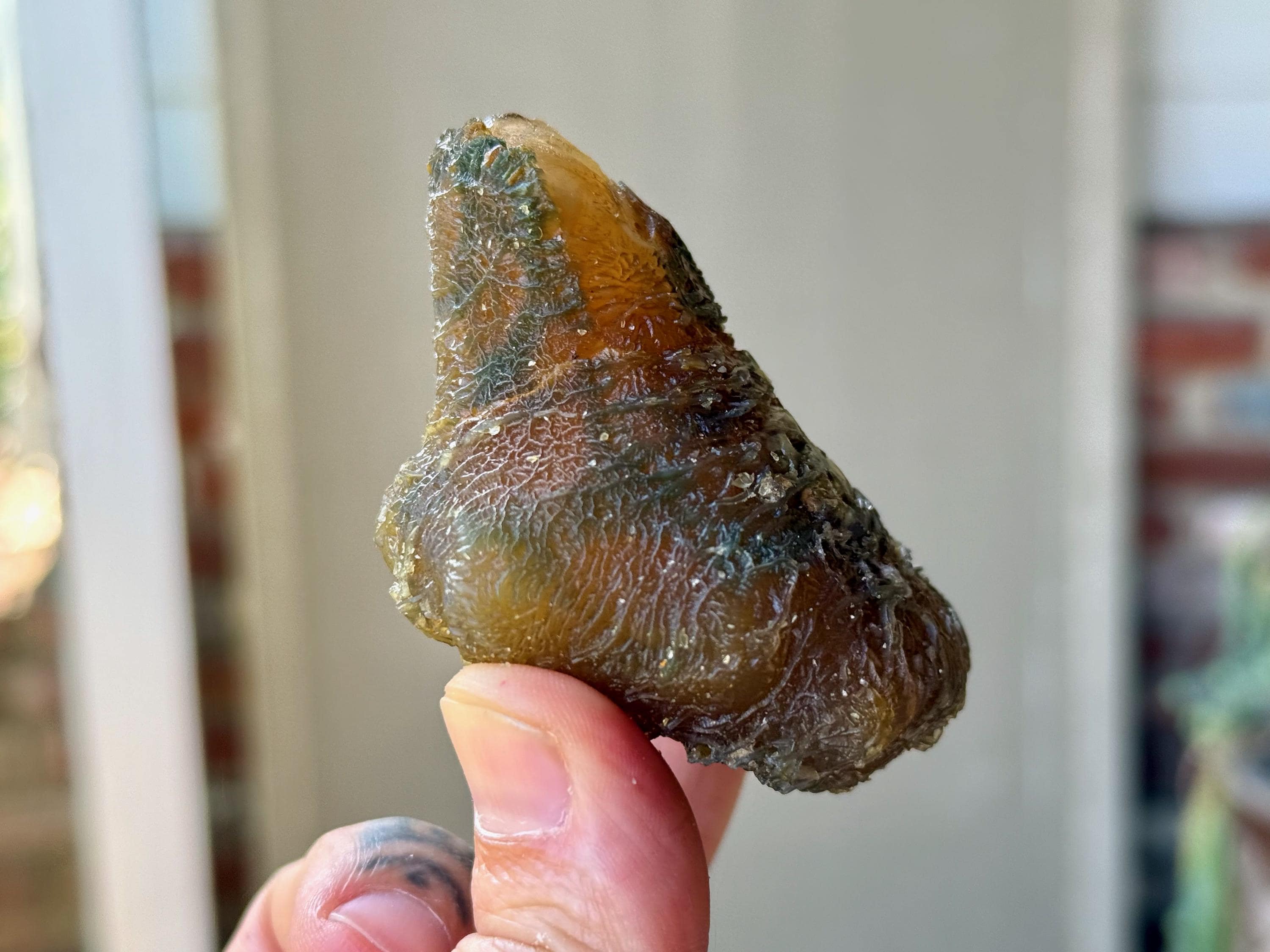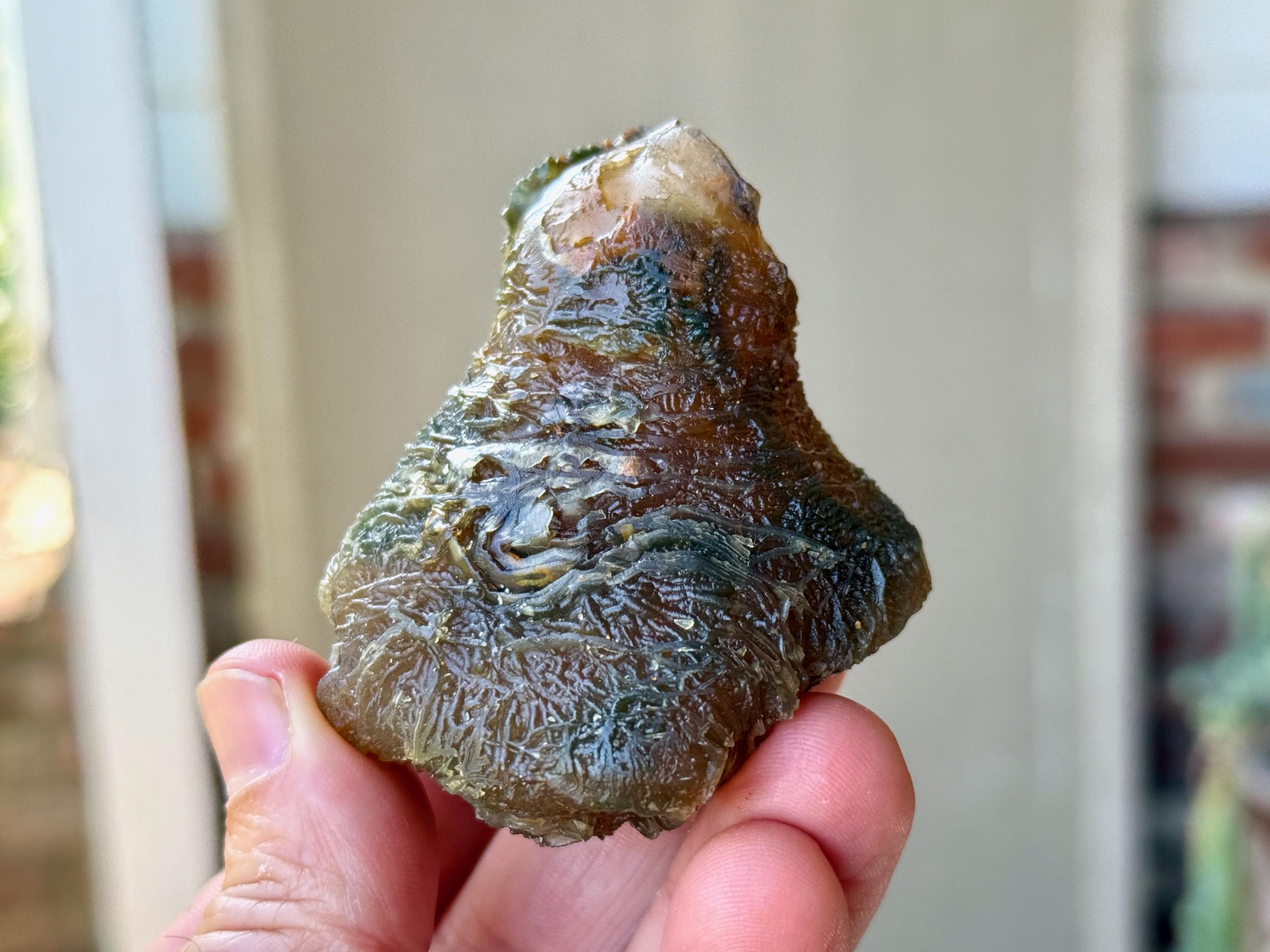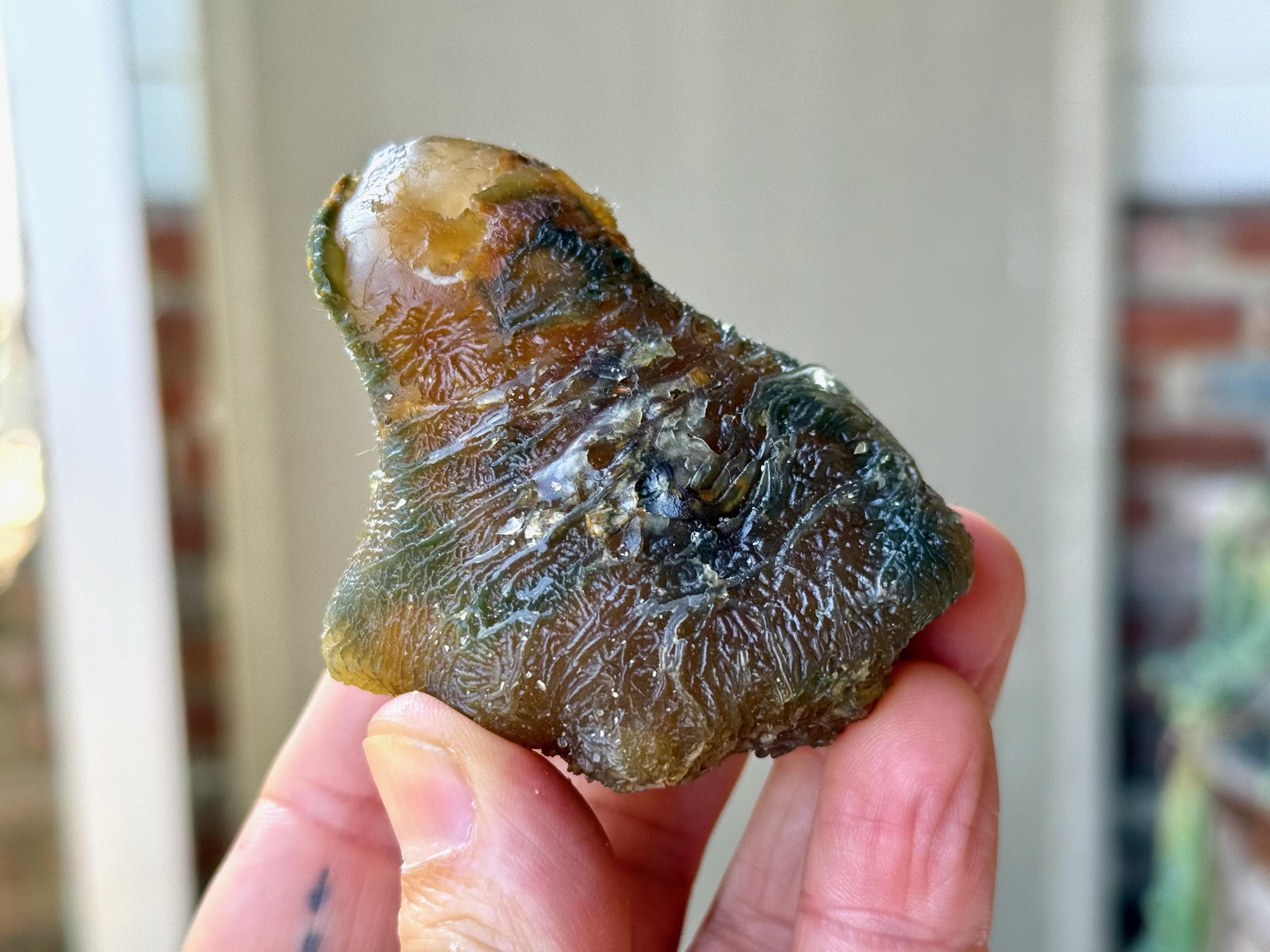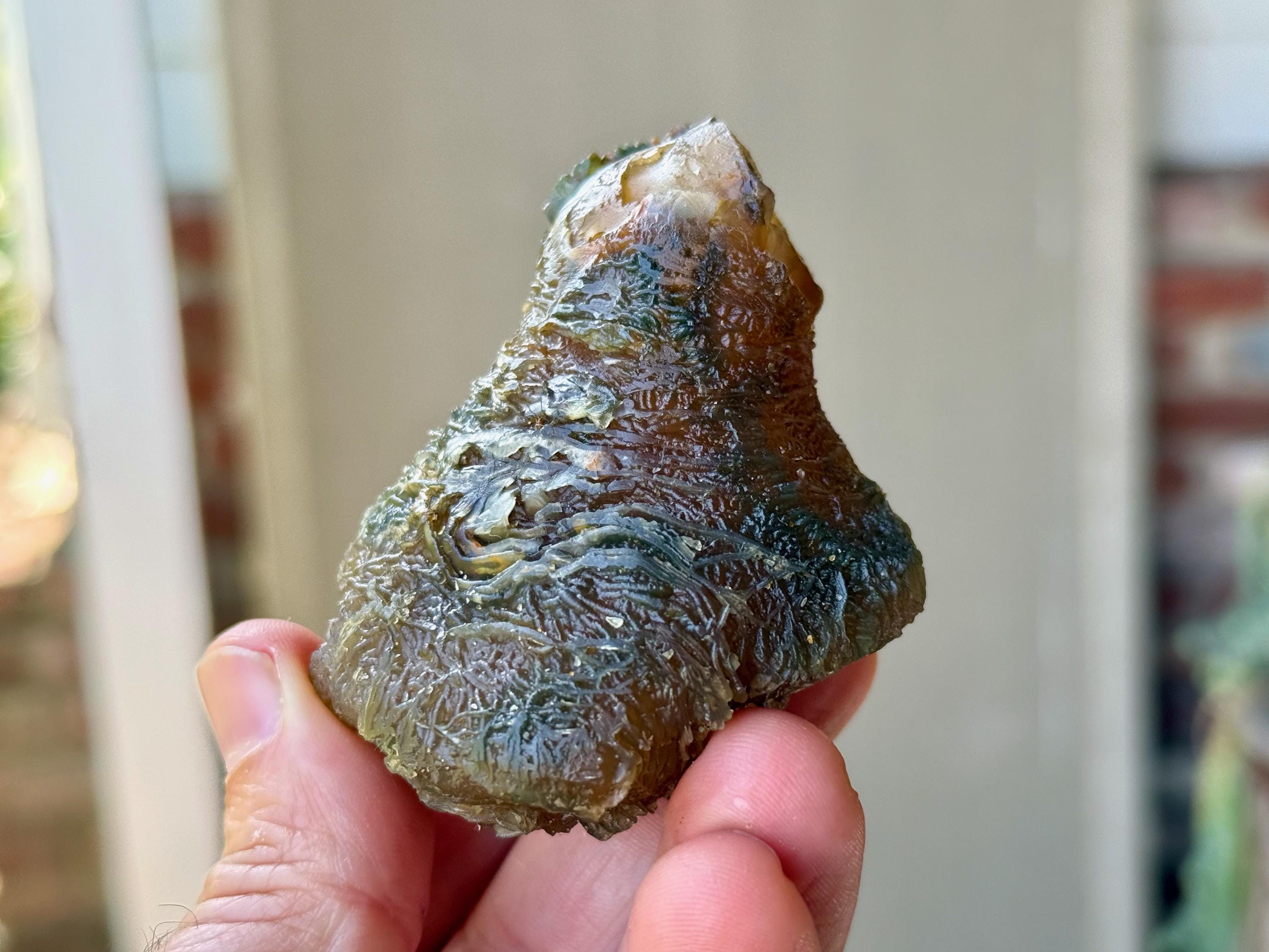 In natural light, this Agate displays a rich, dark greenish-golden brown color. When backlit, as in Photos 3-6, we can see that it lights up brilliantly when backlit.