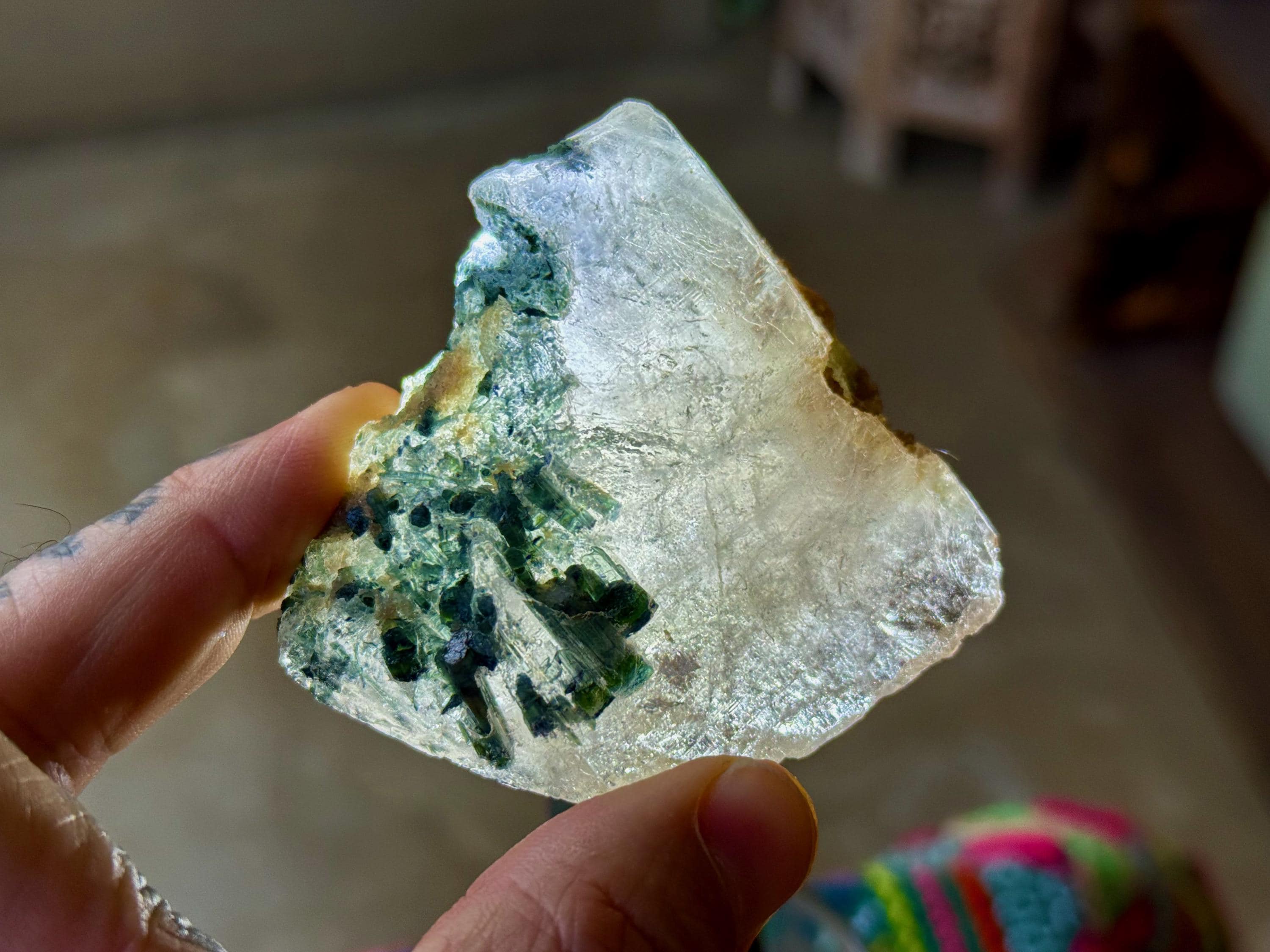 Green Tourmaline purifies and strengthens, allowing one to energetically carry greater amounts of Life Force (Prana Energy). As more energy is carried within the physical body, higher degrees of consciousness can be maintained. It is a wonderful protection stone, deal for sealing holes in the aura that leave one vulnerable to negativity.