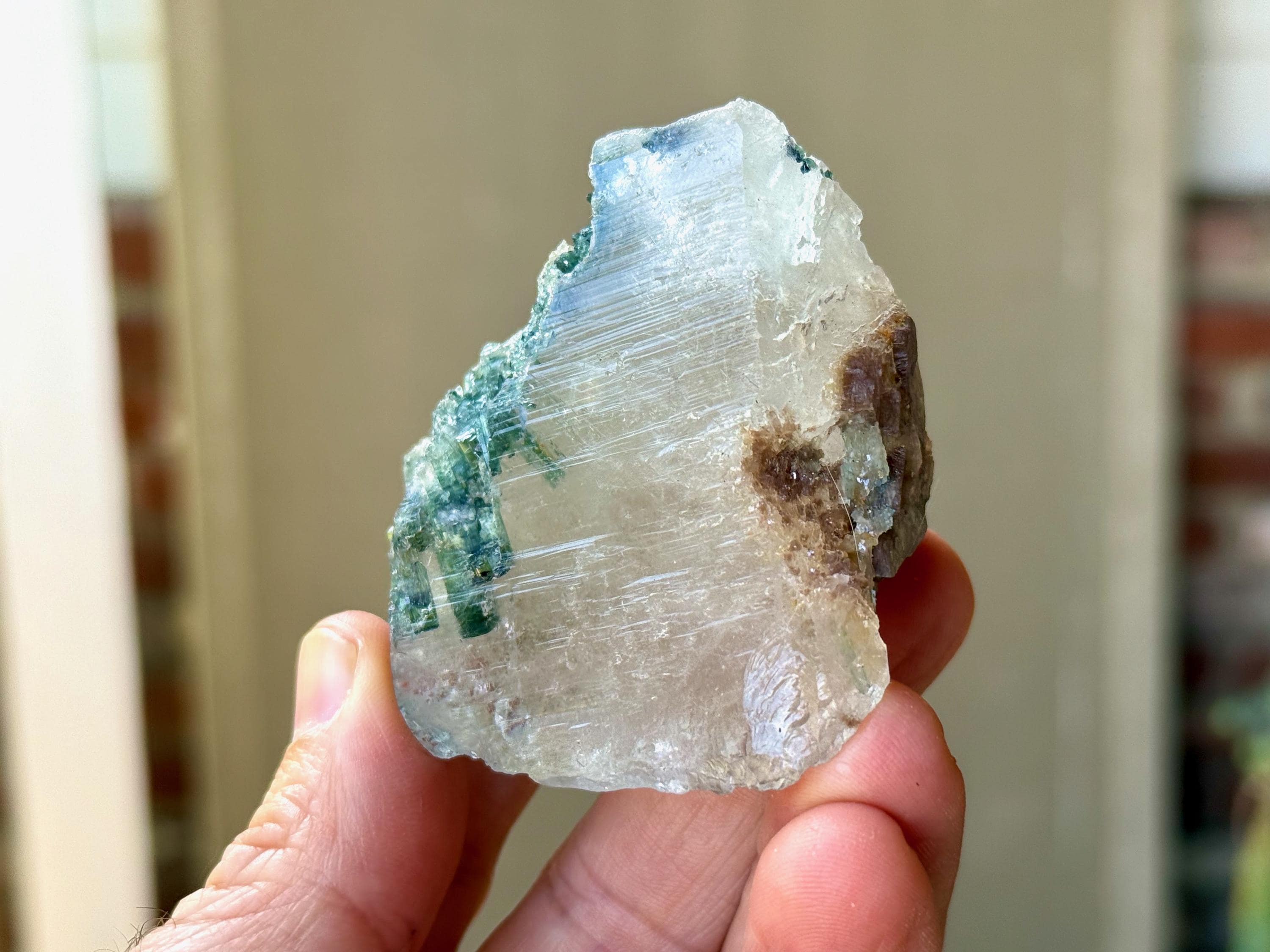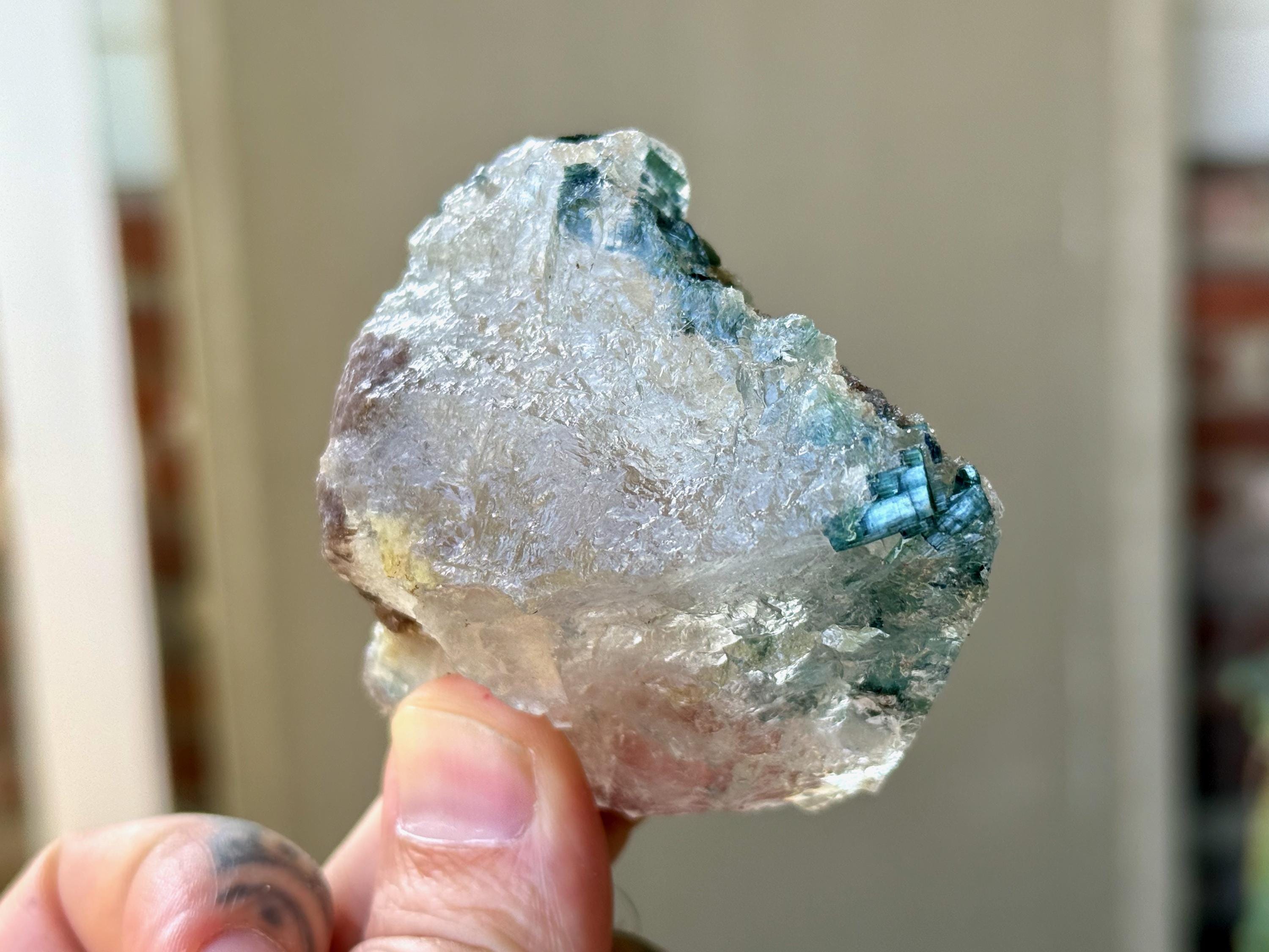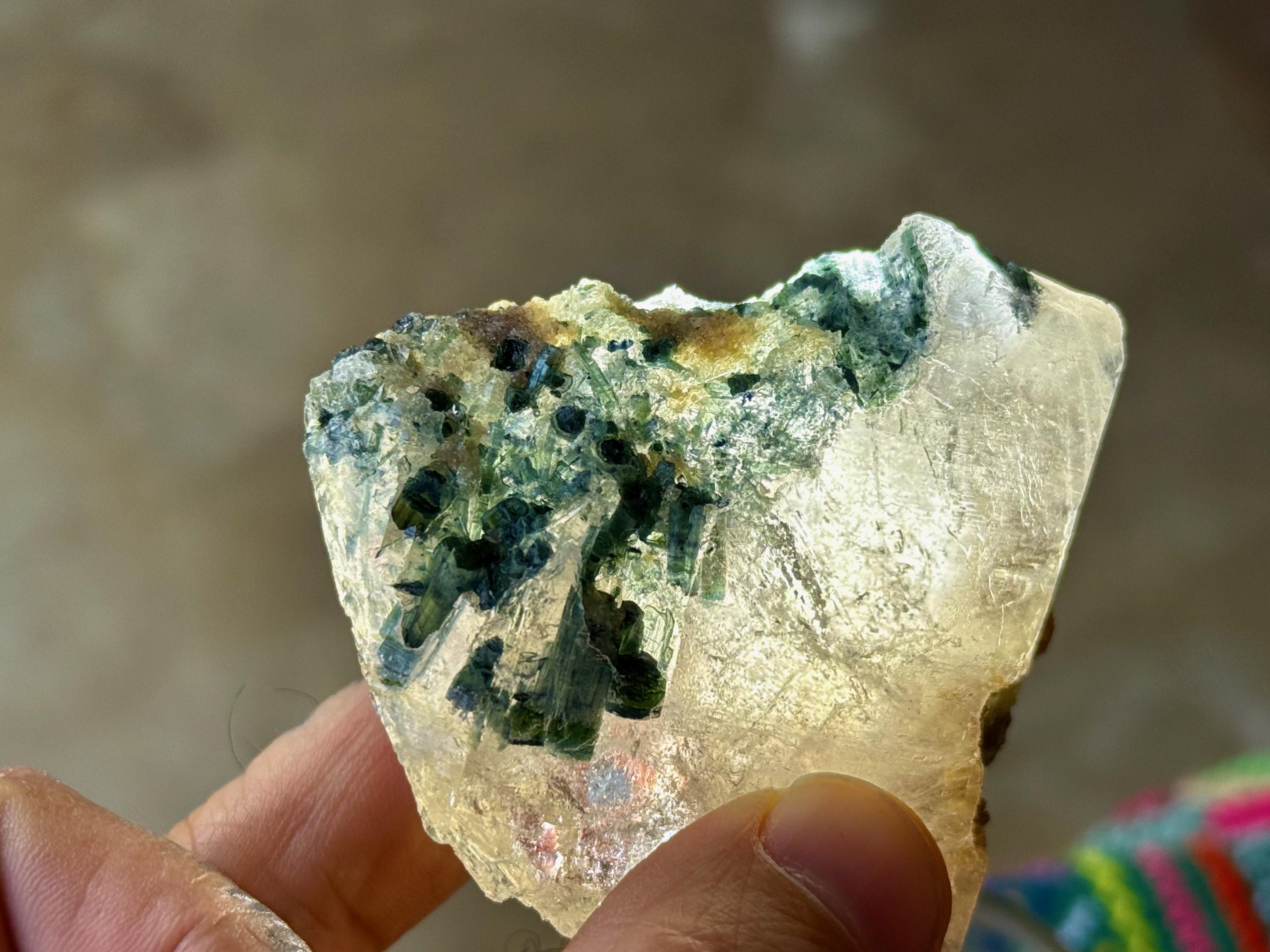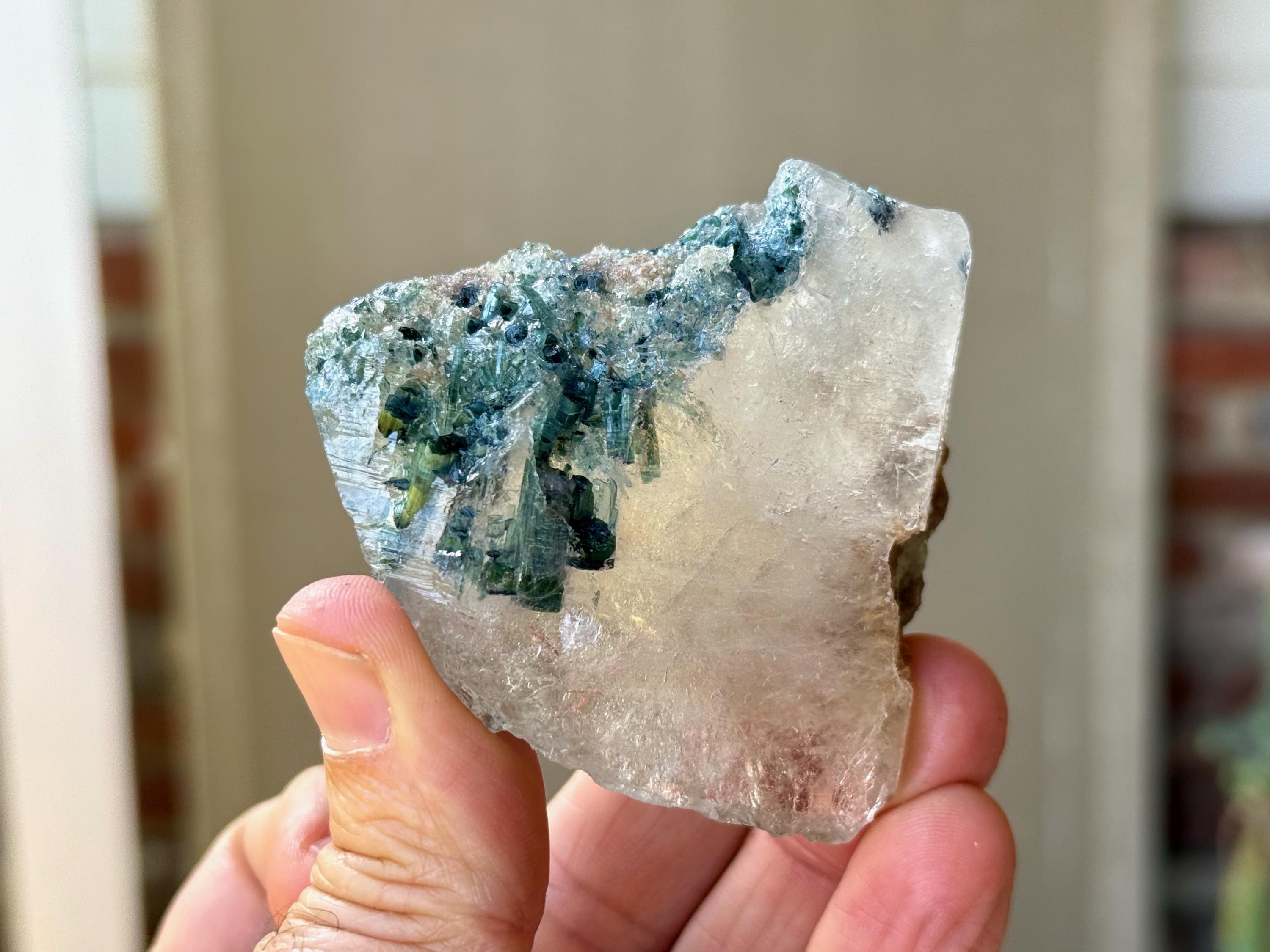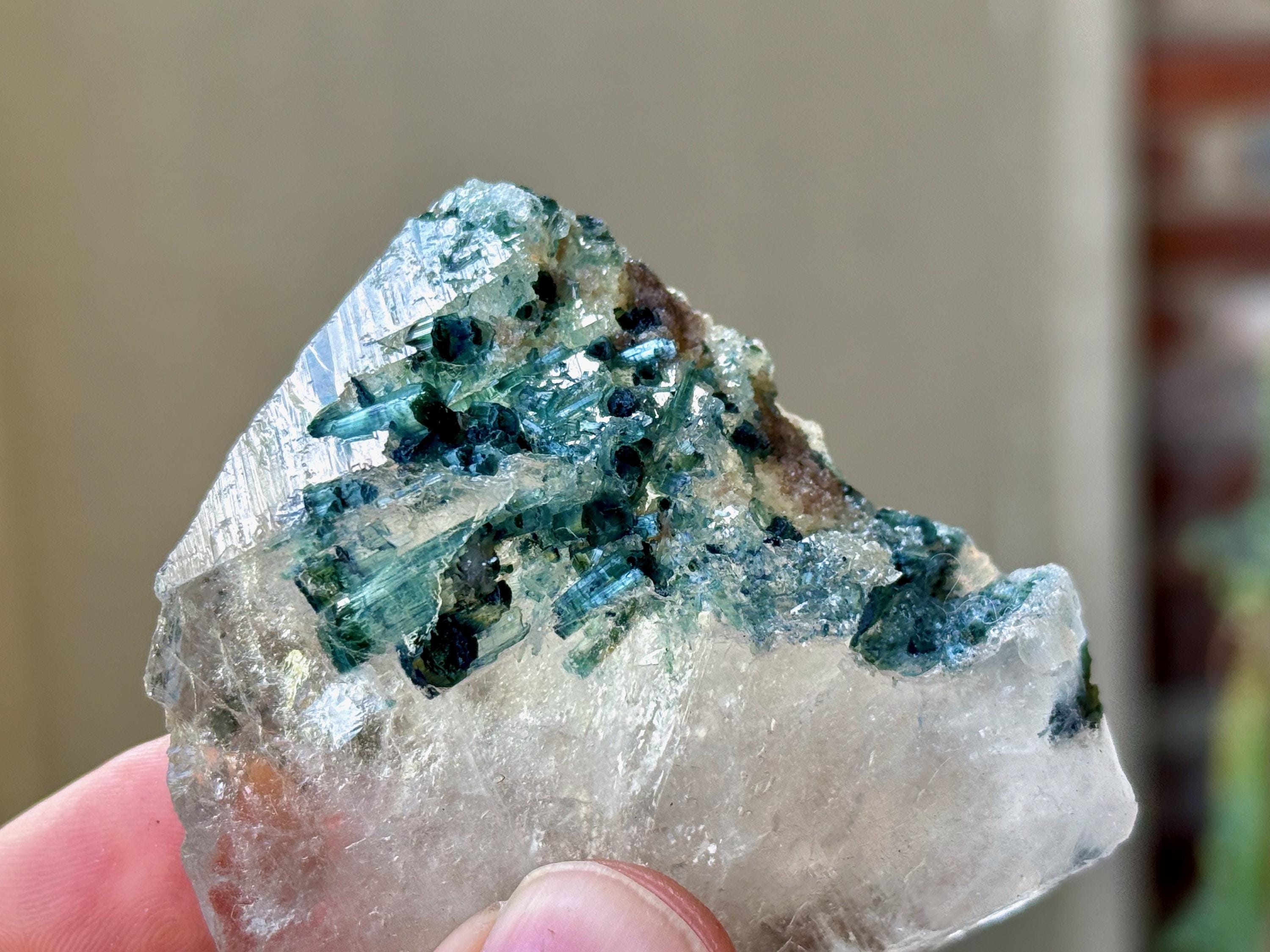 Brilliant luster to this broad Quartz crystal with a vibrant inclusion of Blue-Green Tourmaline embedded all throughout the top portion. This is a wonderful and unique color, and when backlit, we can see just how translucent and gemmy these inclusions are (Photos 4-6).